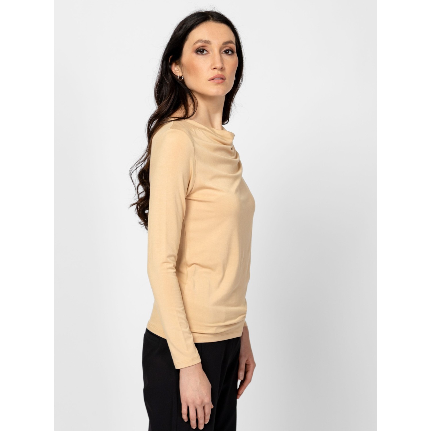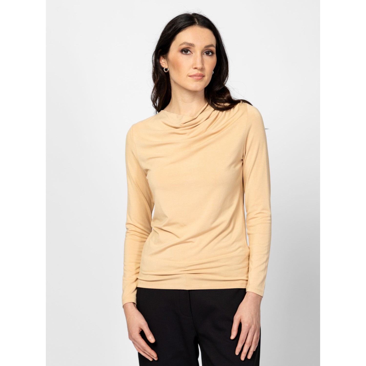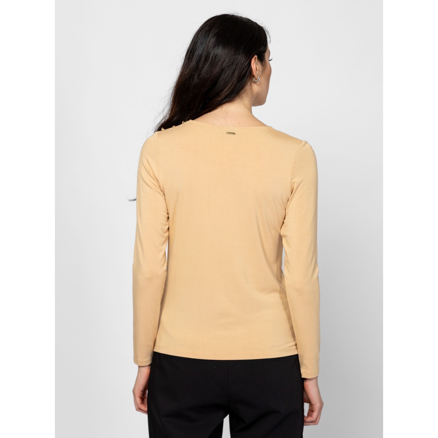 Női hosszú ujjú póló, testhezálló fazonnal, dekoratív nyakmegoldással, díszgombos, ráncolt vállal, viszkóz keverék anyagból, kis fém márkajelzéssel a hátán. Anyaga: 85% viszkóz, 8% elasztán, 7% nylon, jersey. A modell 175 cm magas és S-es méretet visel.
