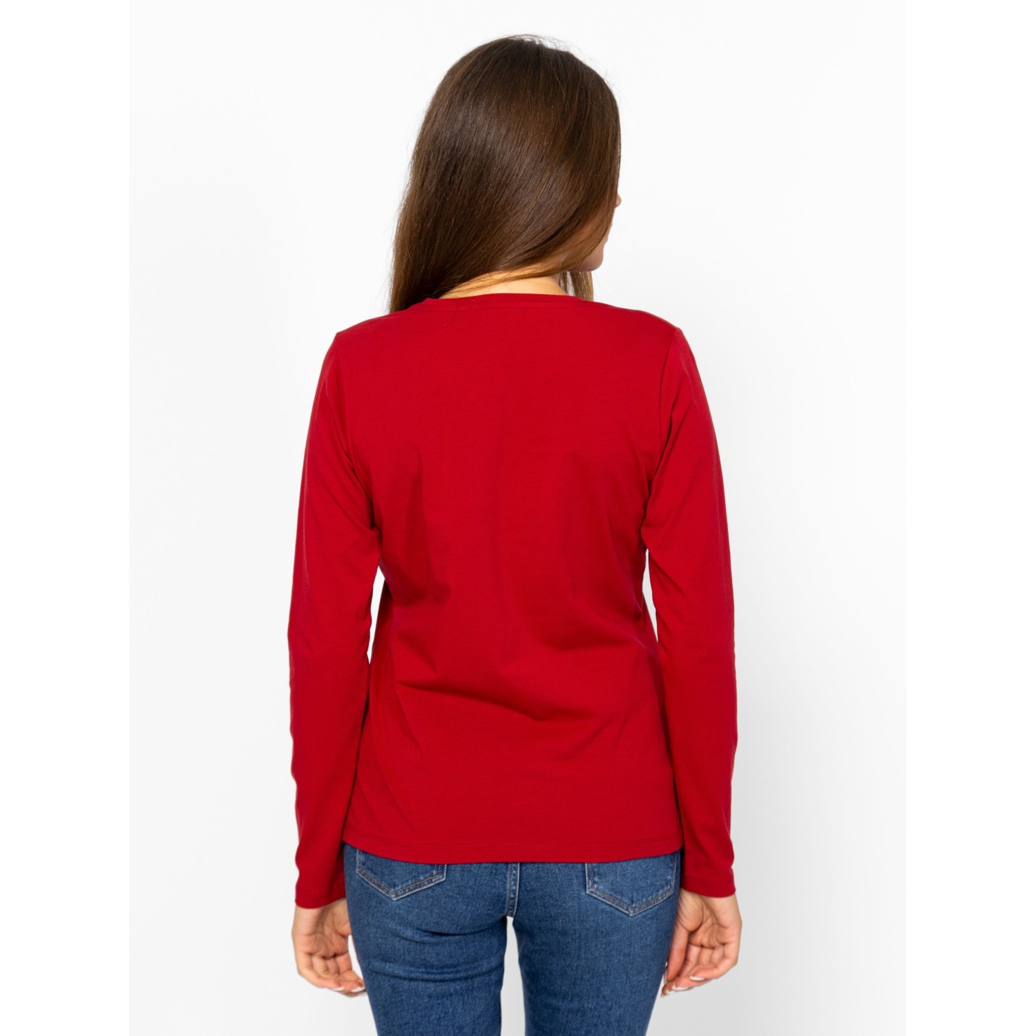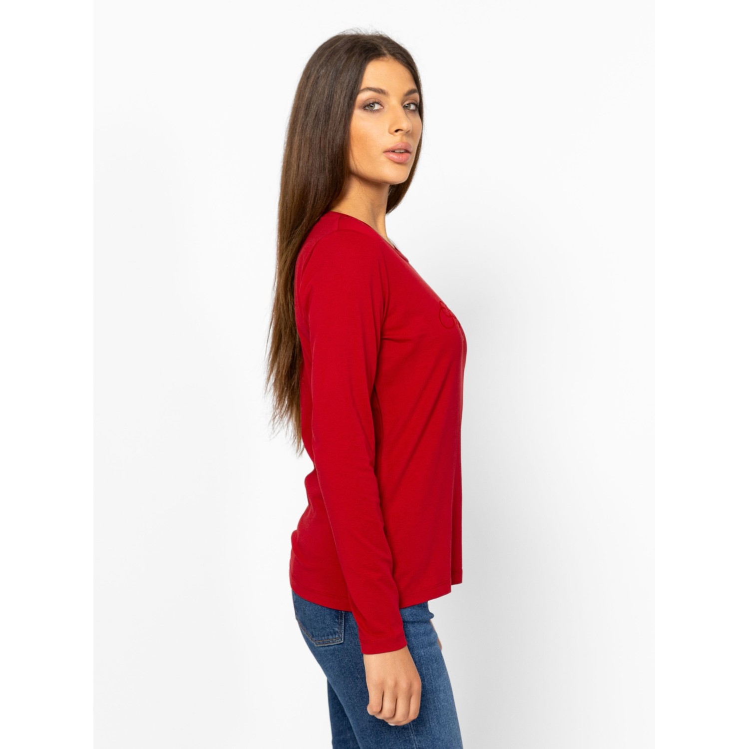 Női hosszú ujjú póló, enyhén karcsúsított szabással, kerek nyakkal, elasztánnal kevert pamut anyagból, elején tone-in-tone nyomott és bársonyos márkajelzéssel, oldalában szövött címkével. Anyaga: 95% pamut és 5% elasztán single jersey. A modell 175 cm magas és S-es méretet visel.