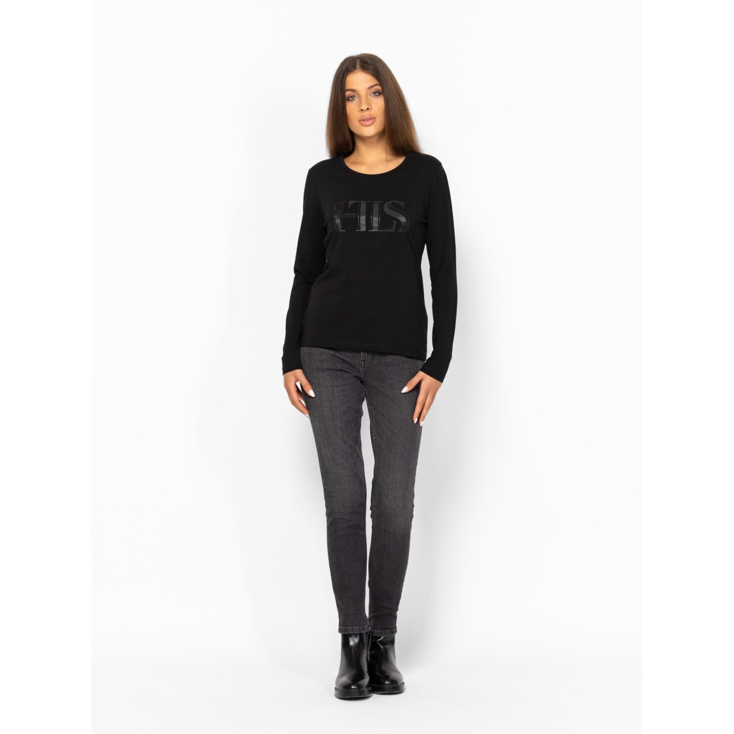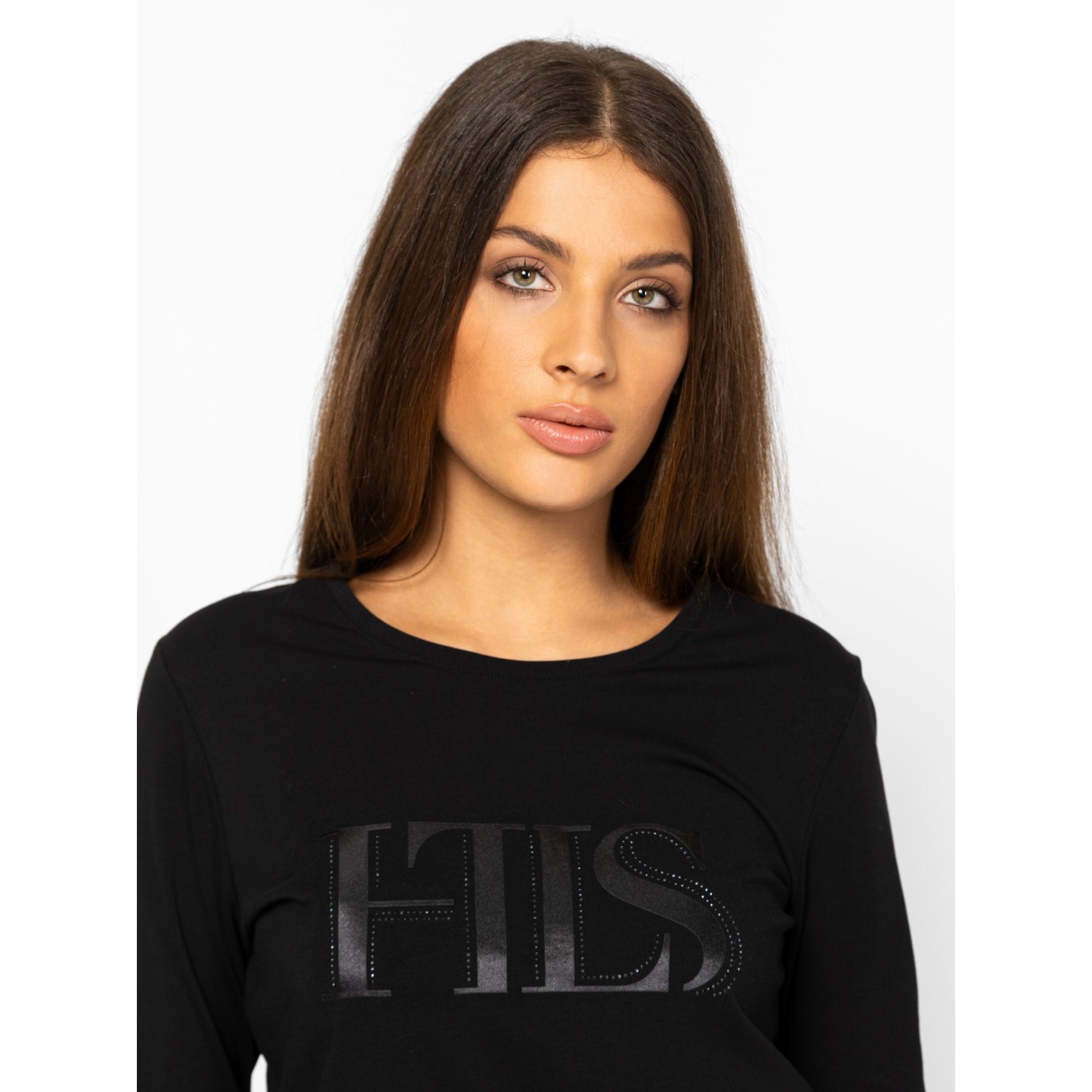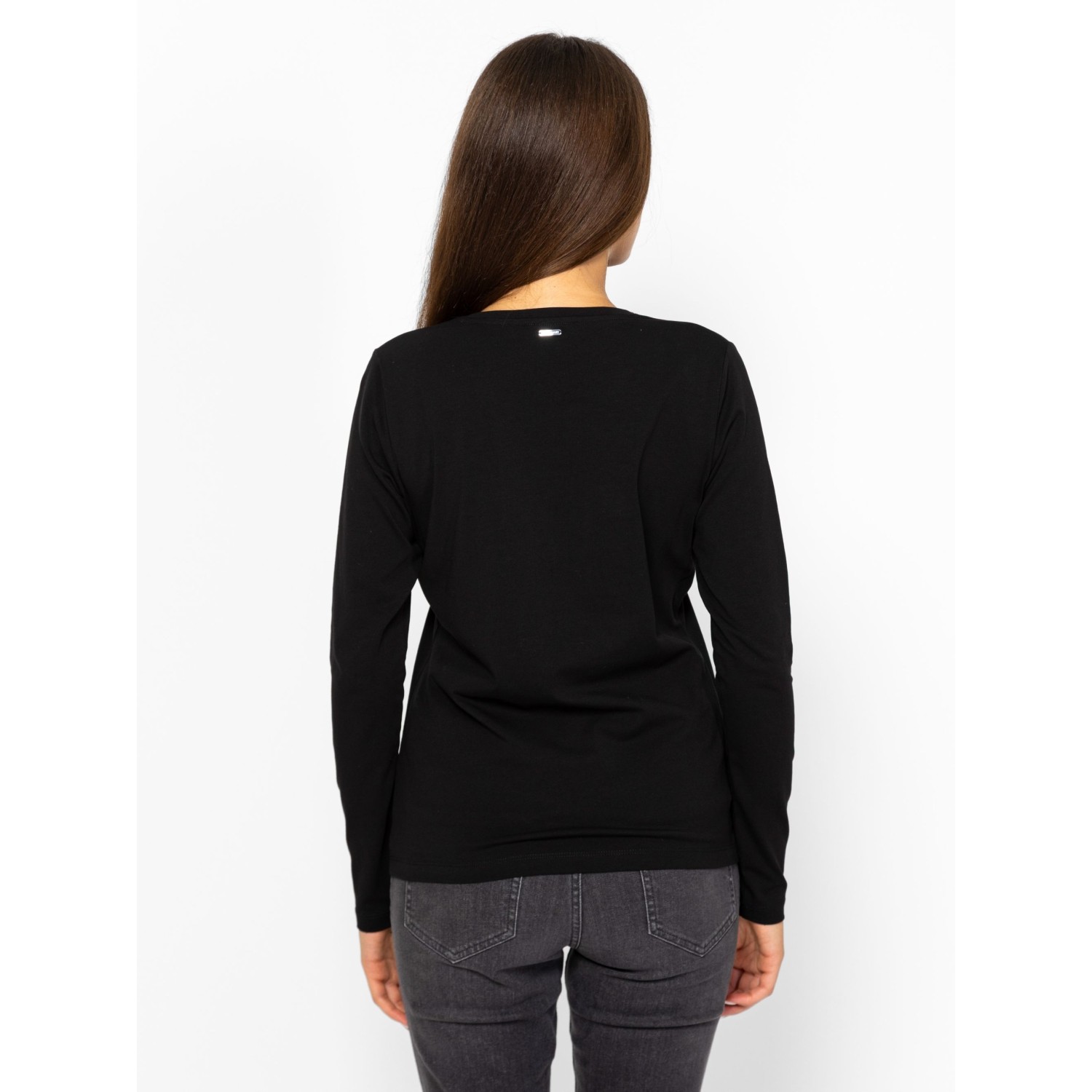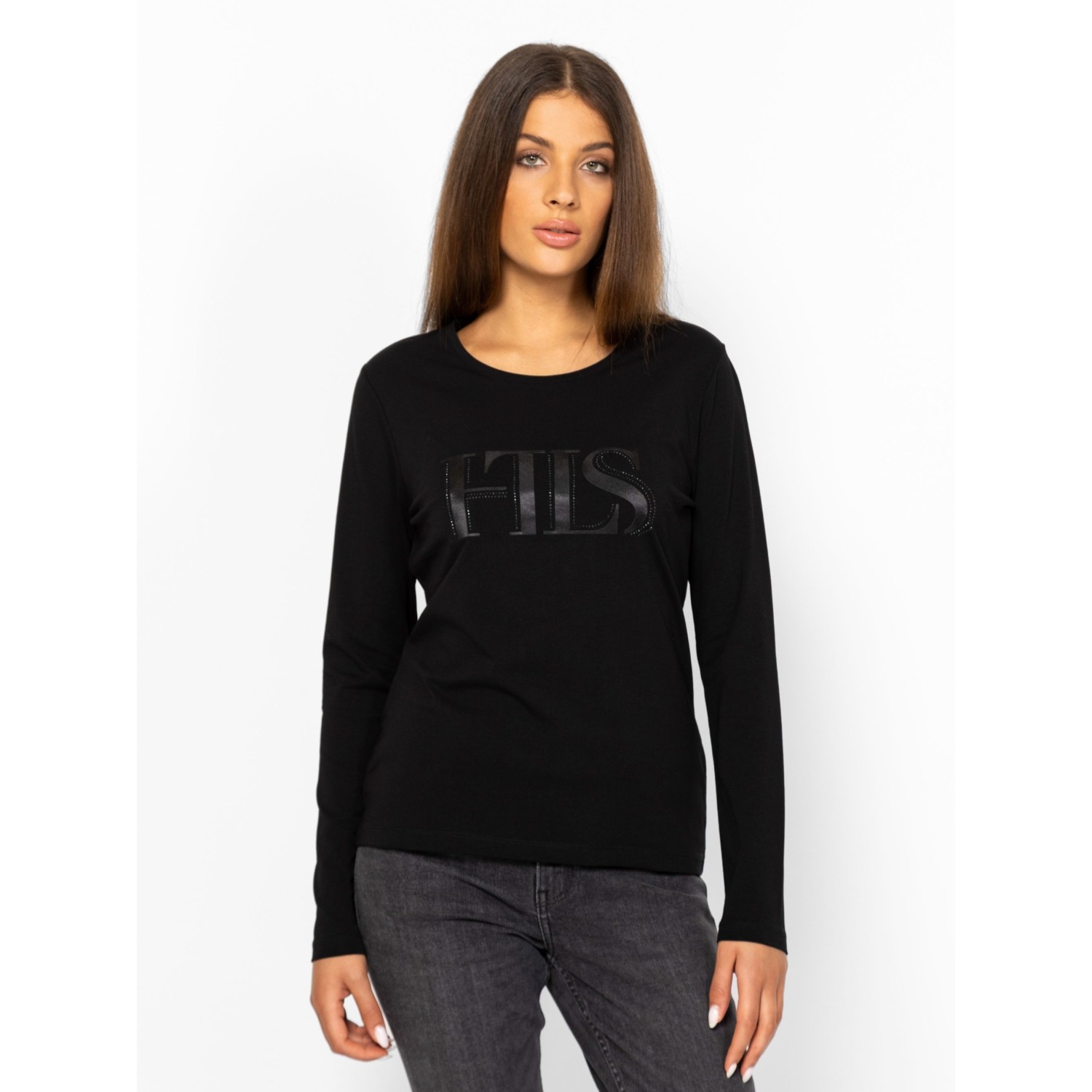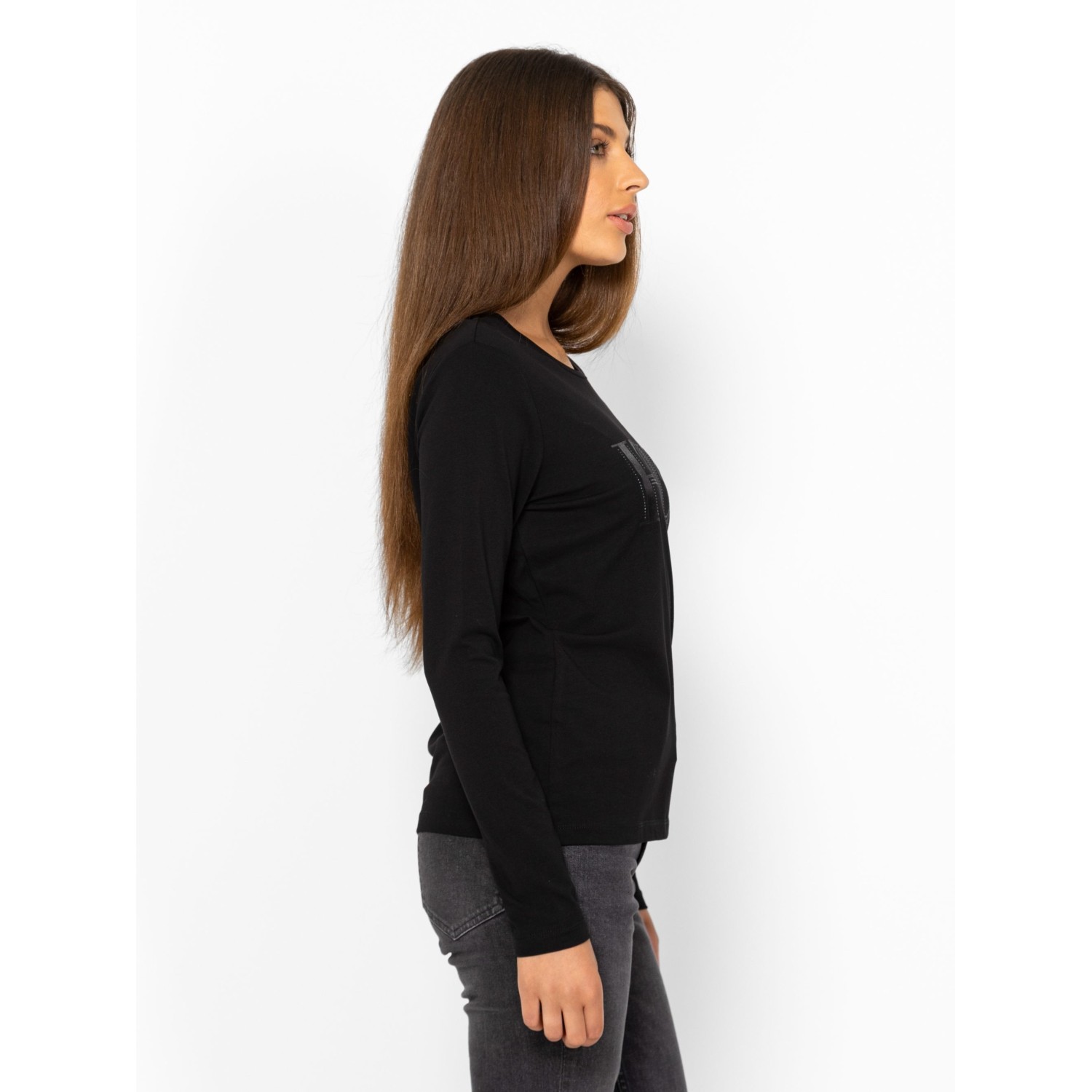 Női hosszú ujjú póló, enyhén karcsúsított szabással, kerek nyakkal, elasztánnal kevert pamut anyagból, elején tone-in-tone nyomott és kövekből kirakott márkajelzéssel, hátán kis fém márkajelzéssel. Anyaga: 95% pamut és 5% elasztán single jersey. A modell 175 cm magas és S-es méretet visel.
