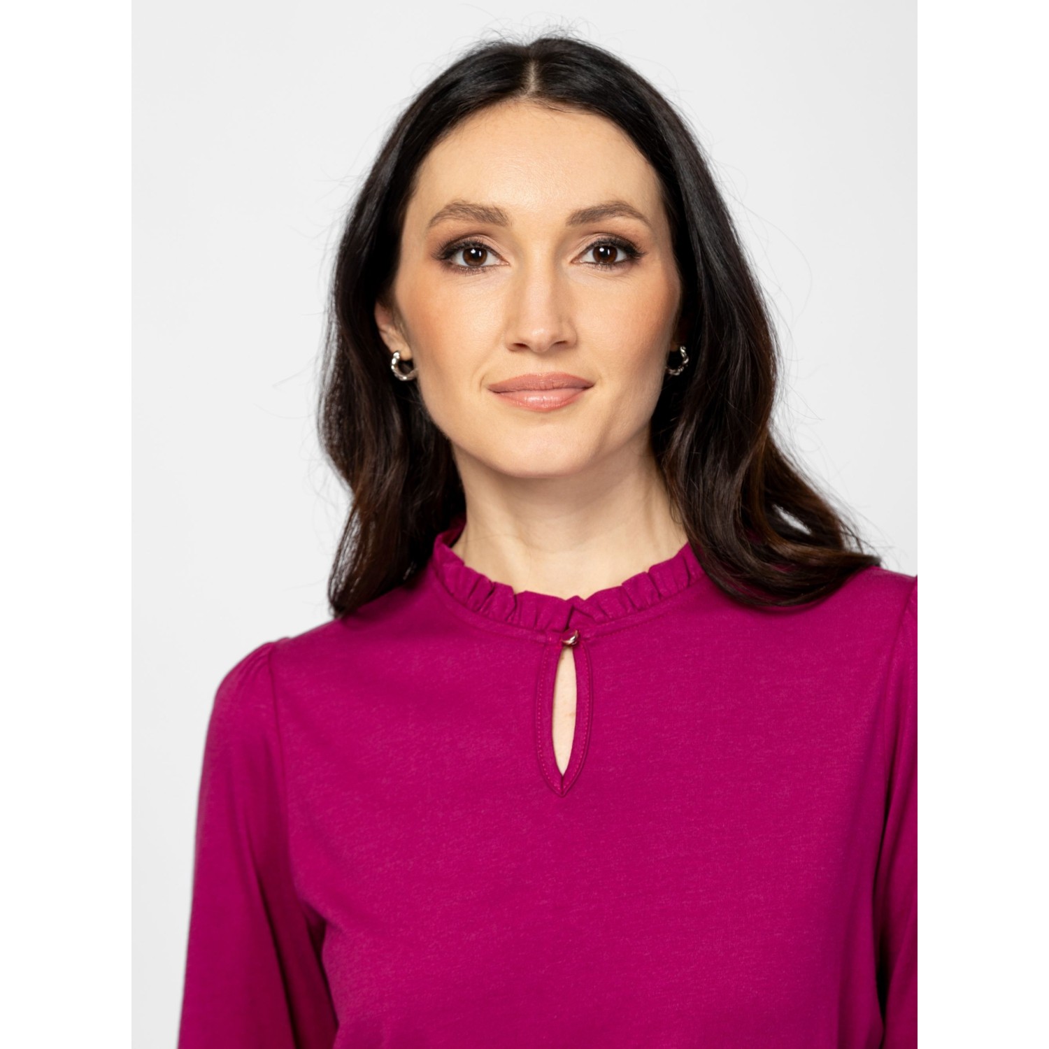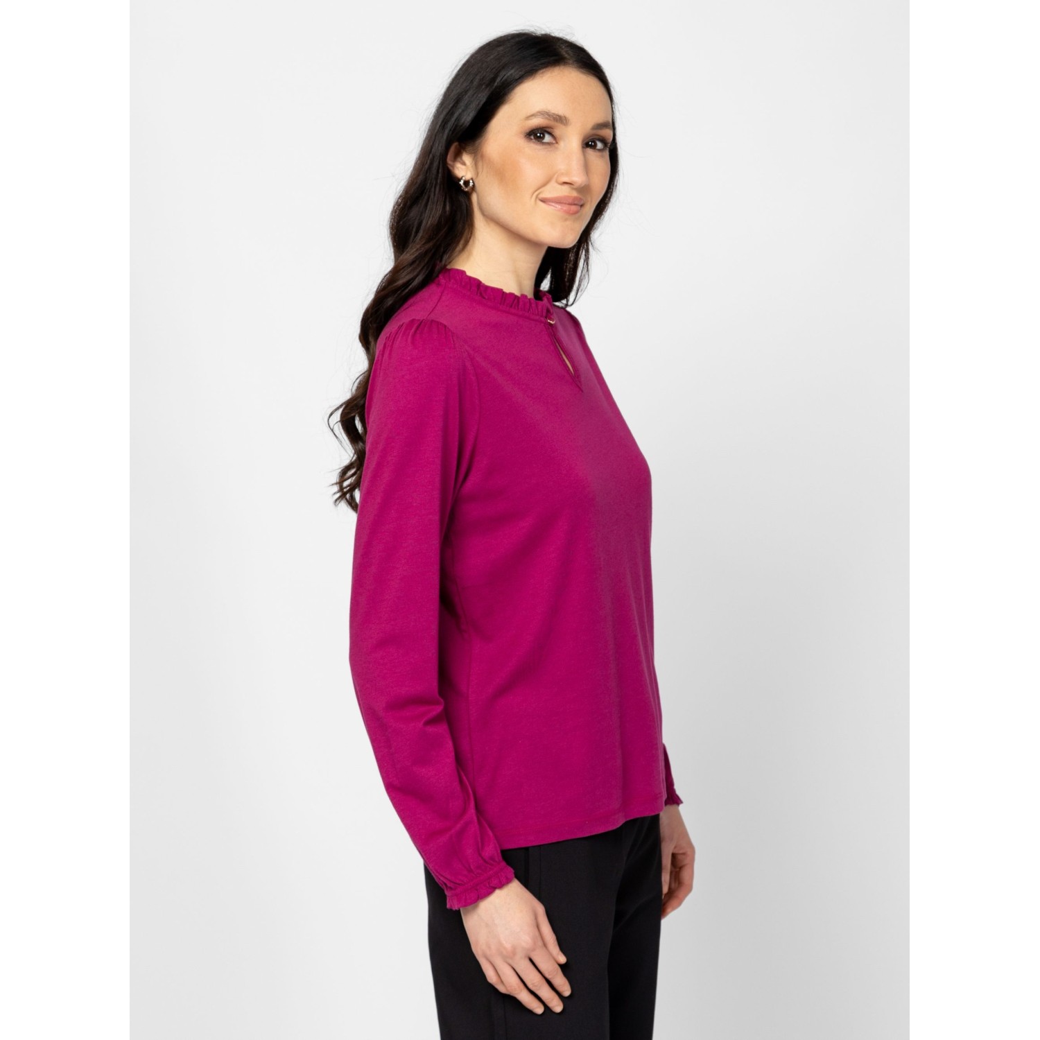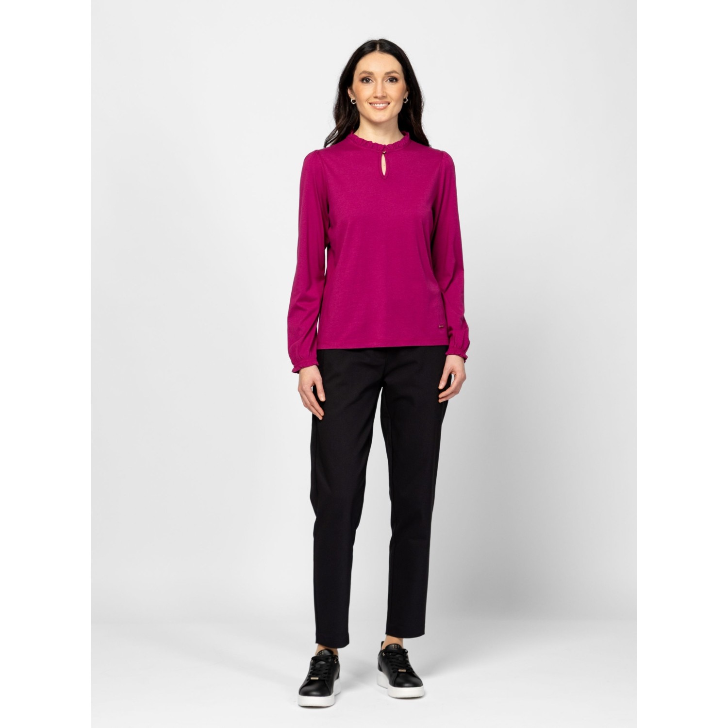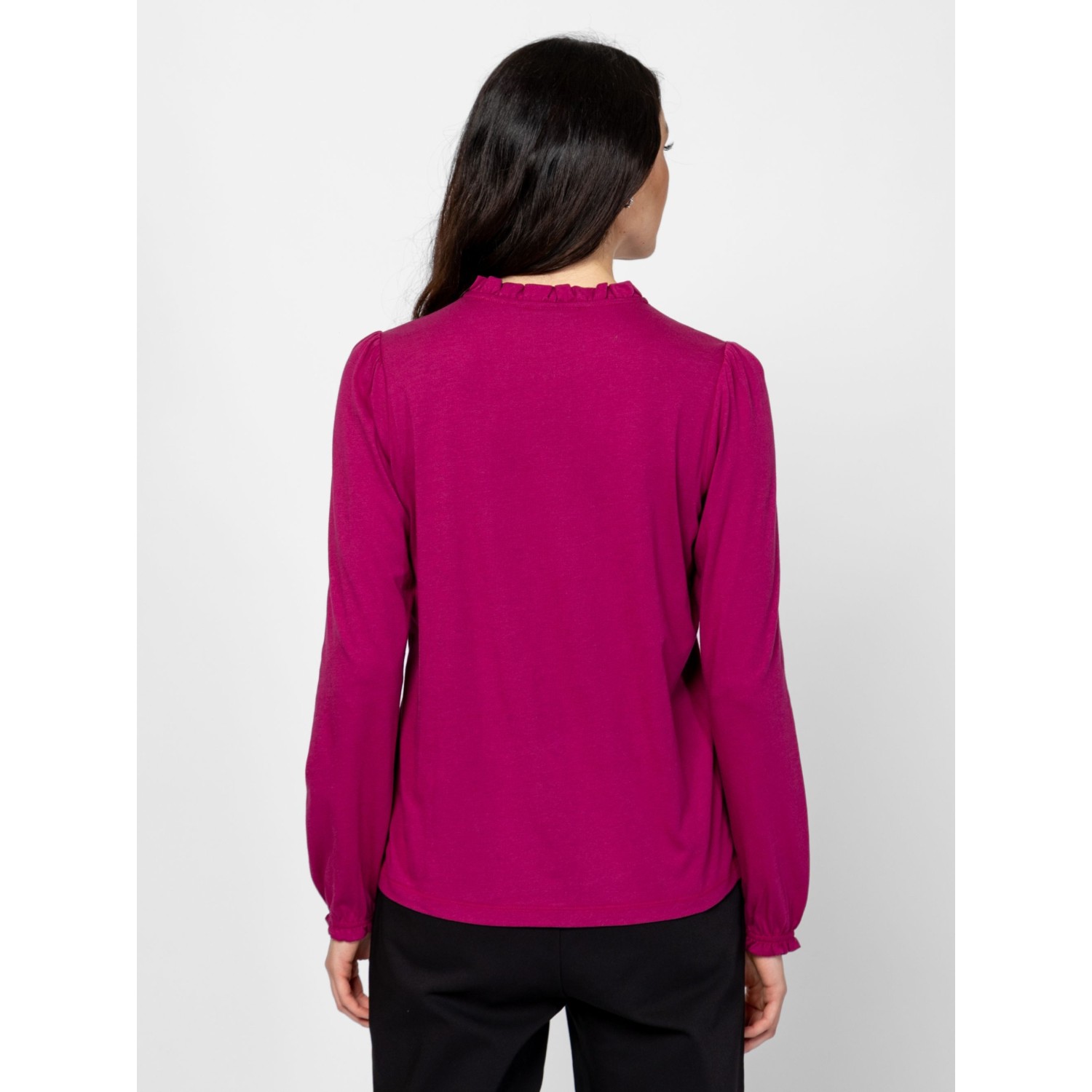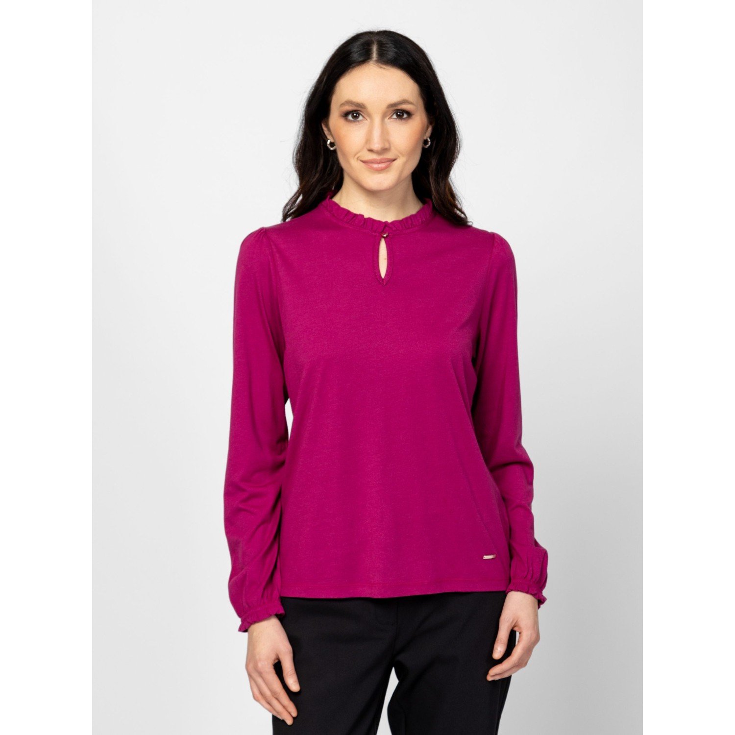 Női hosszú ujjú póló, fodros nyakkal, puffos ujjal, gumírozott, fodros ujja aljjal, izgalmas színekben, kis fém márkajelzéssel az elején. Anyaga: 50% pamut, 50% modal, single jersey. A modell 175 cm magas és S-es méretet visel.