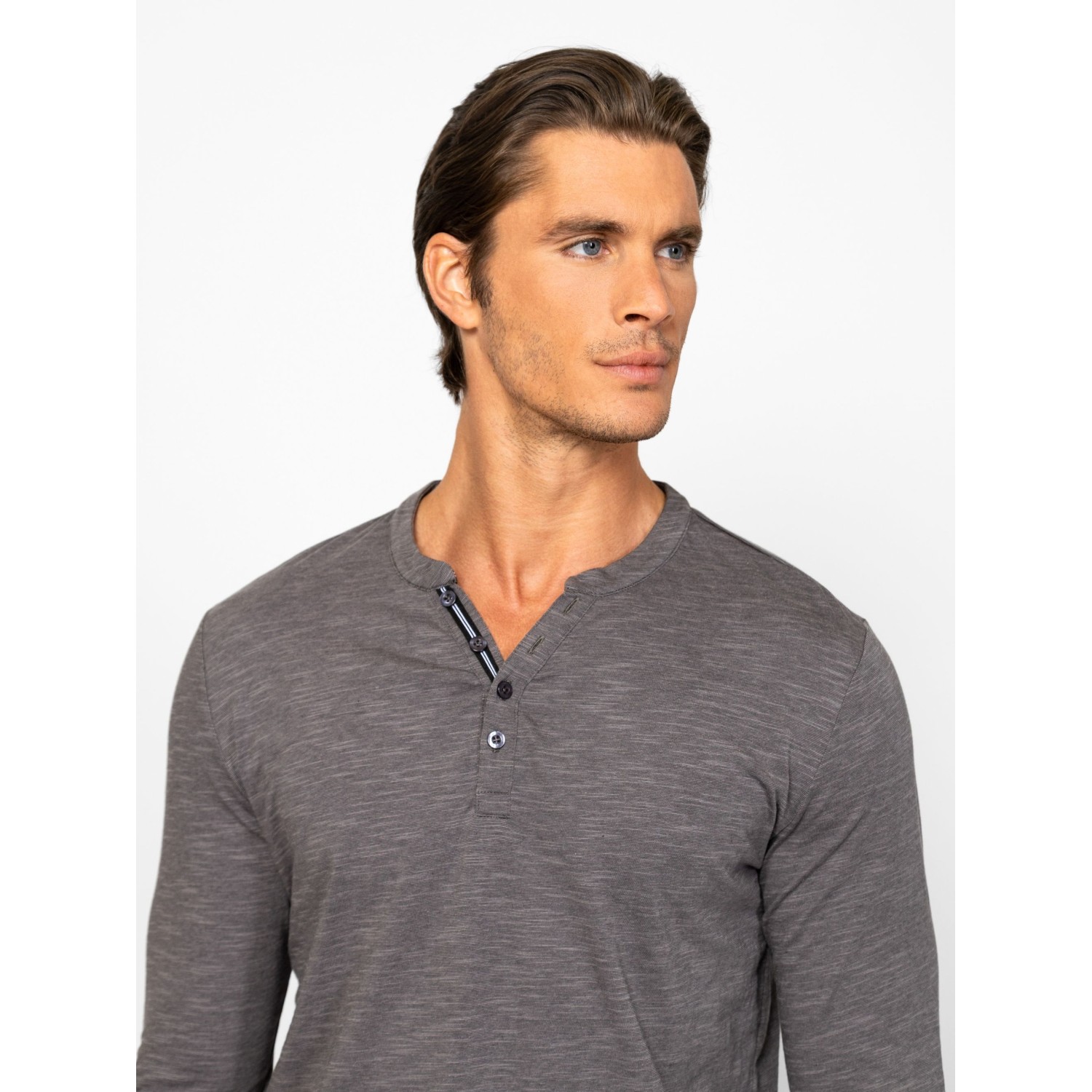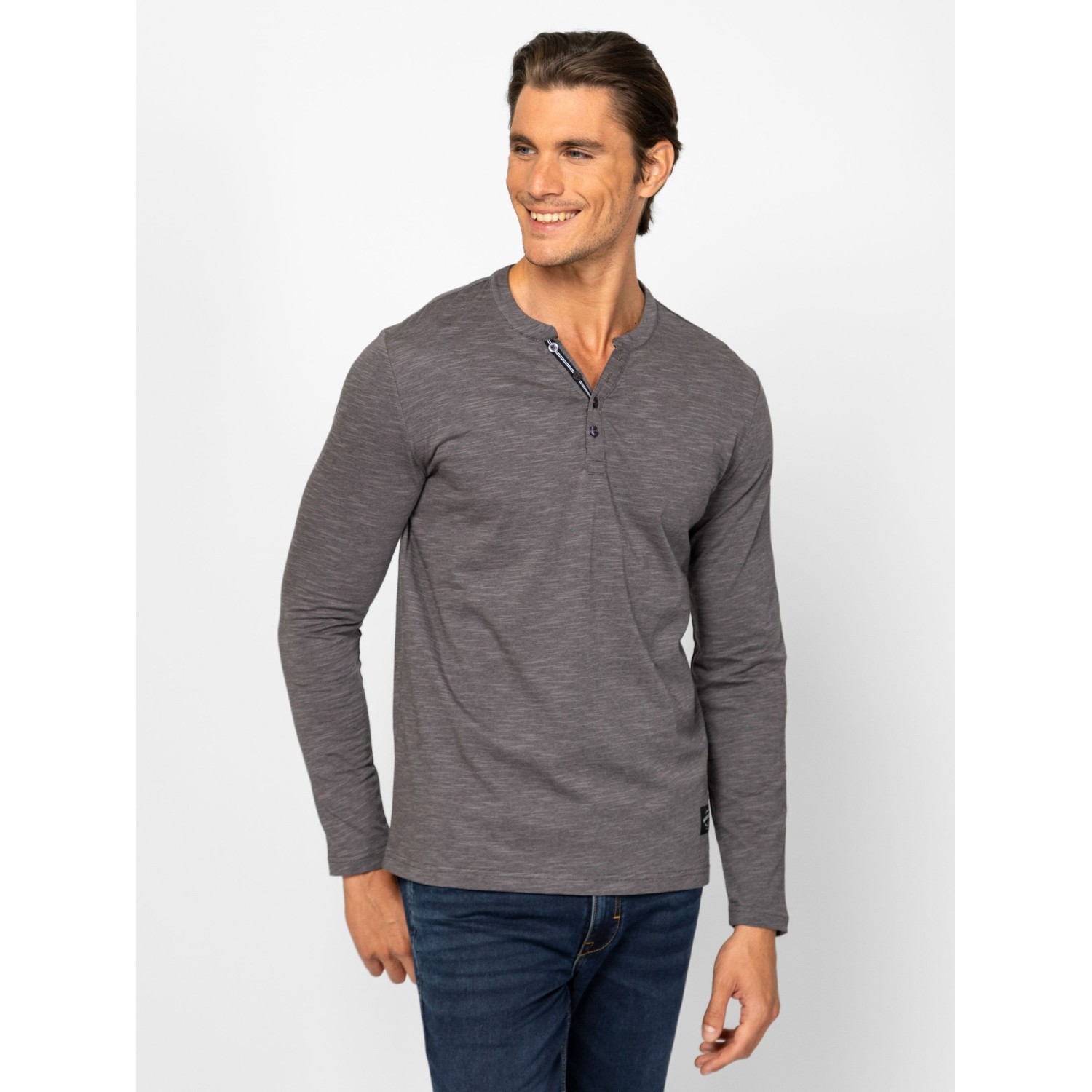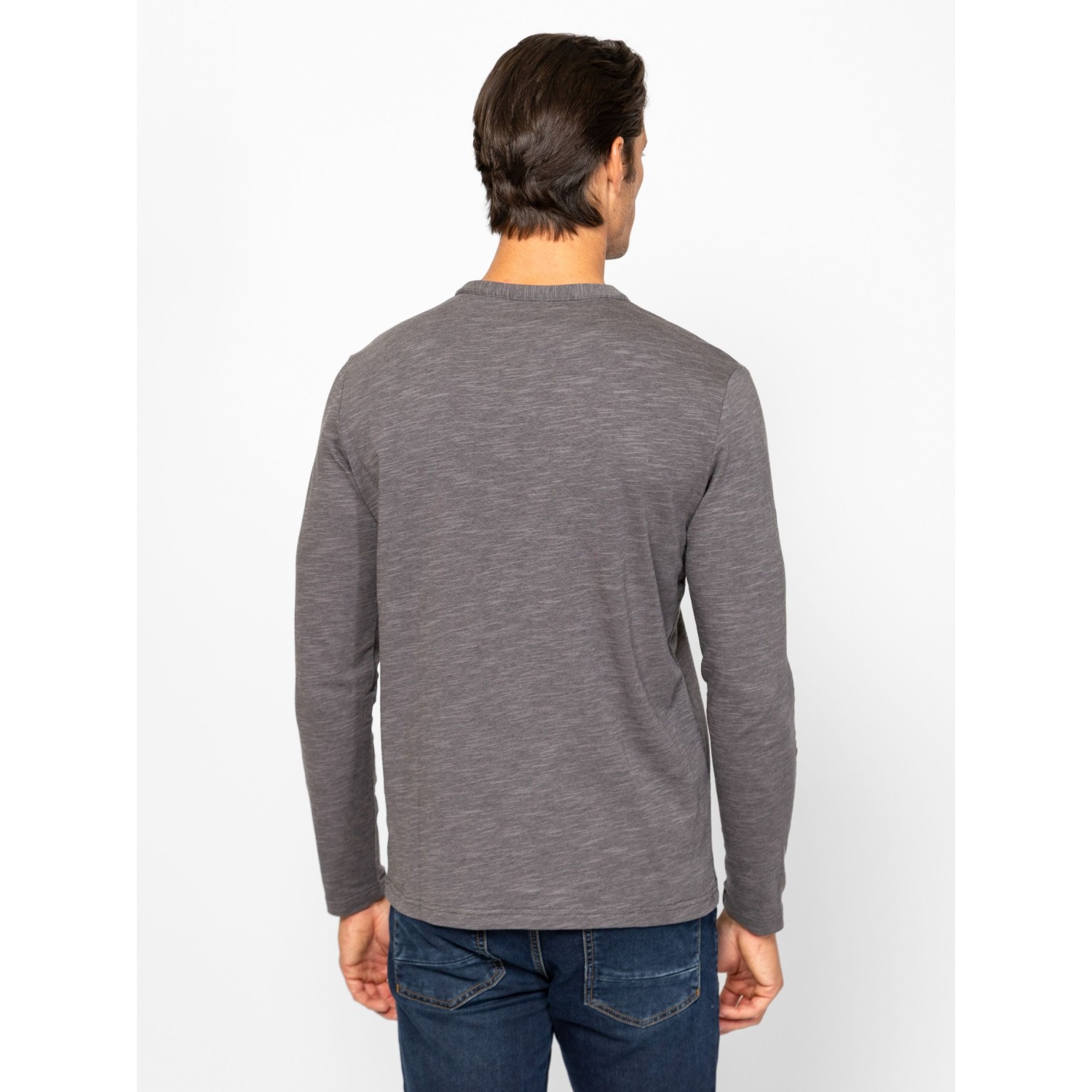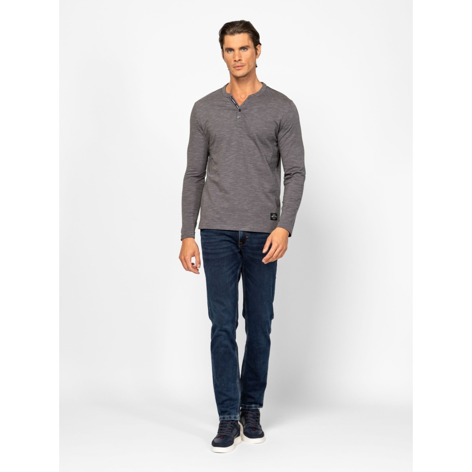 Férfi hosszú ujjú henley póló, állógalléros-gombos nyakmegoldással, melírozott, tiszta pamut anyagból, kis szövött márkajelzéssel az elején. Anyaga: 100% pamut, single jersey. A modell 188 cm magas és L-es méretet visel.