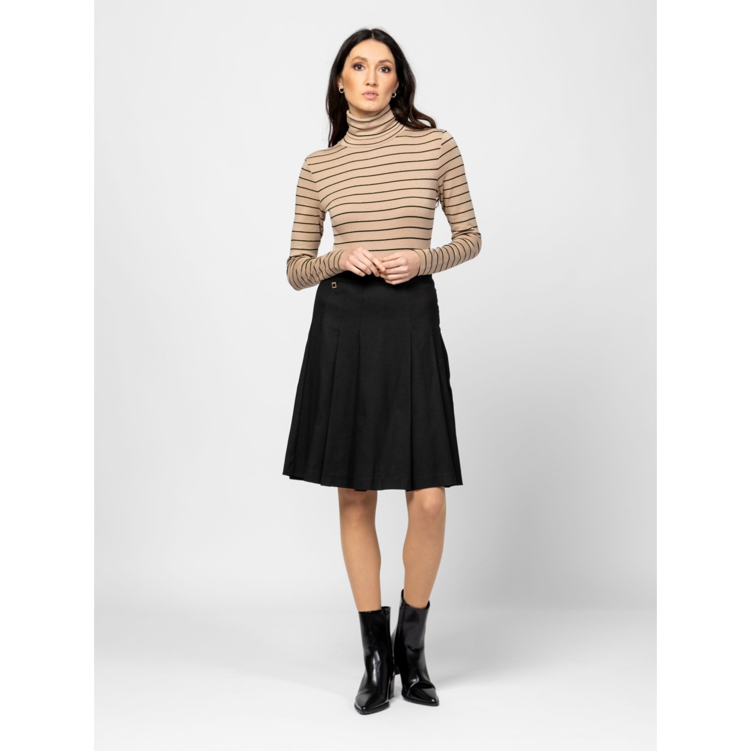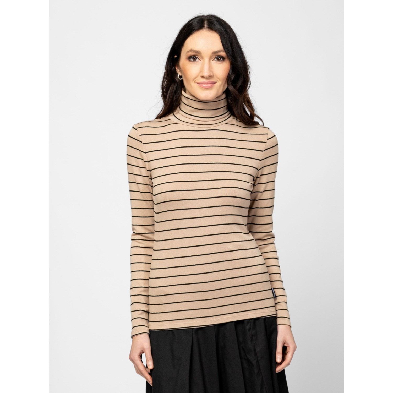 Női hosszú ujjú garbó, enyhén karcsúsított szabással, csíkozásba beleszövött lurex szállal, elasztánnal és modállal kevert pamut anyagból, hátán kis nyomott márkajelzéssel, oldalában szövött címkével. Anyaga: 57% pamut, 38% modál, 3% elasztán, 2% fémszál. A modell 175 cm magas és S-es méretet visel.