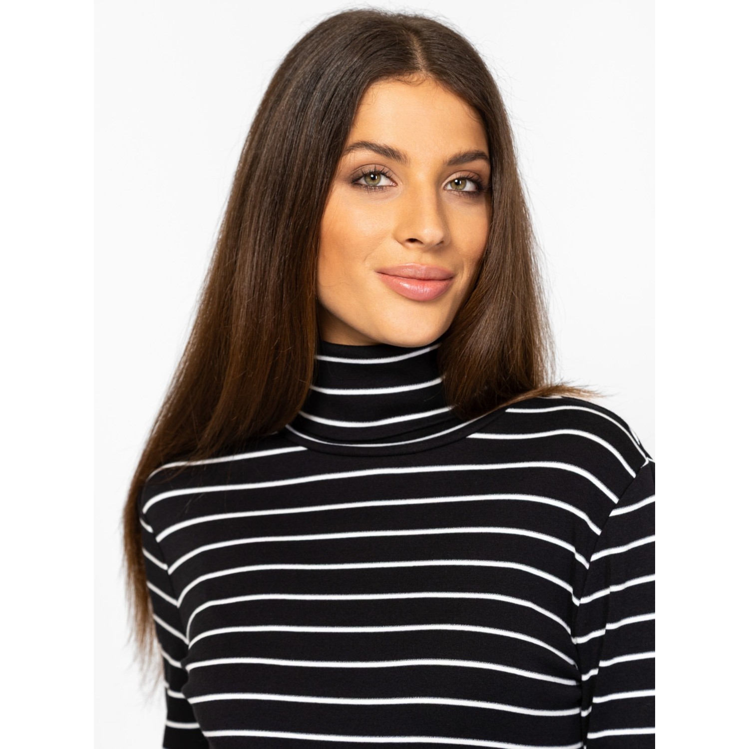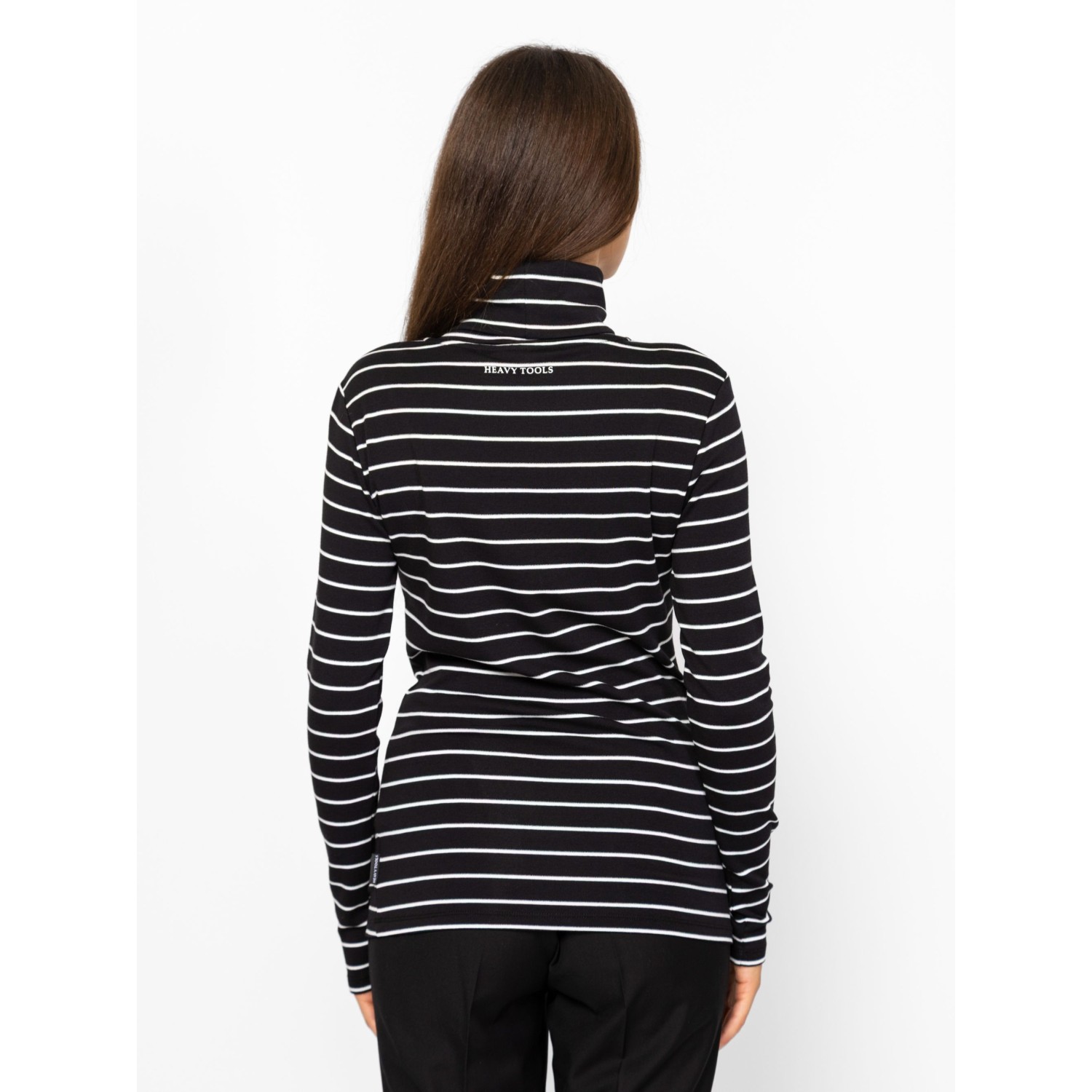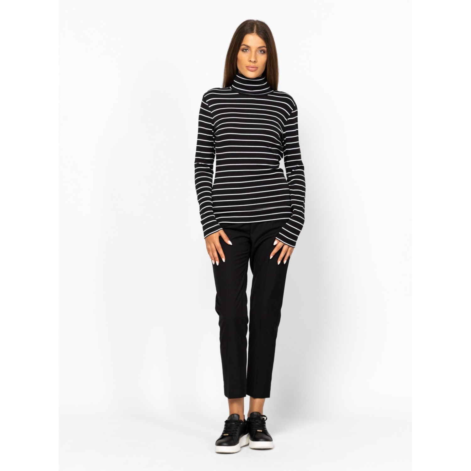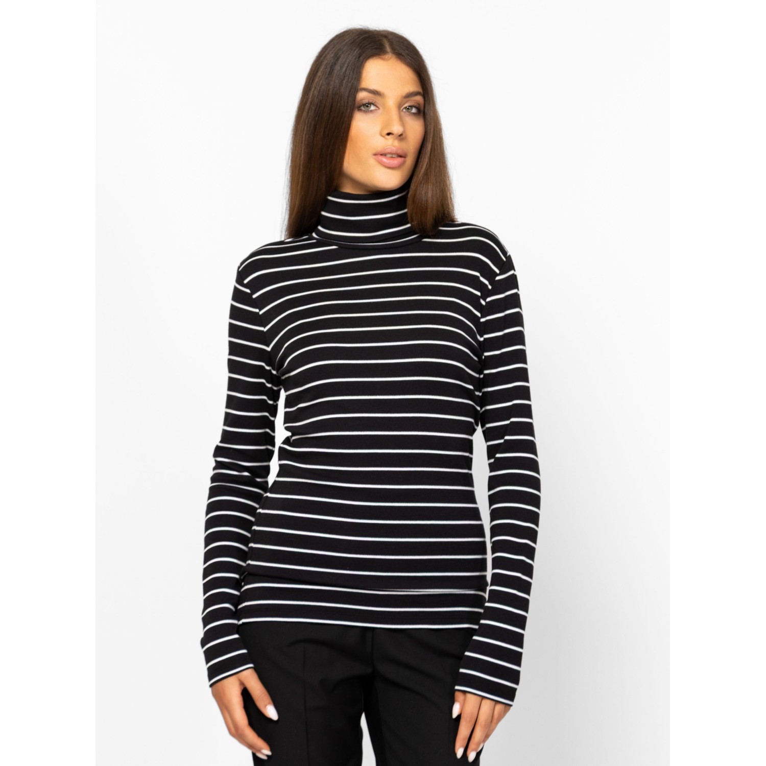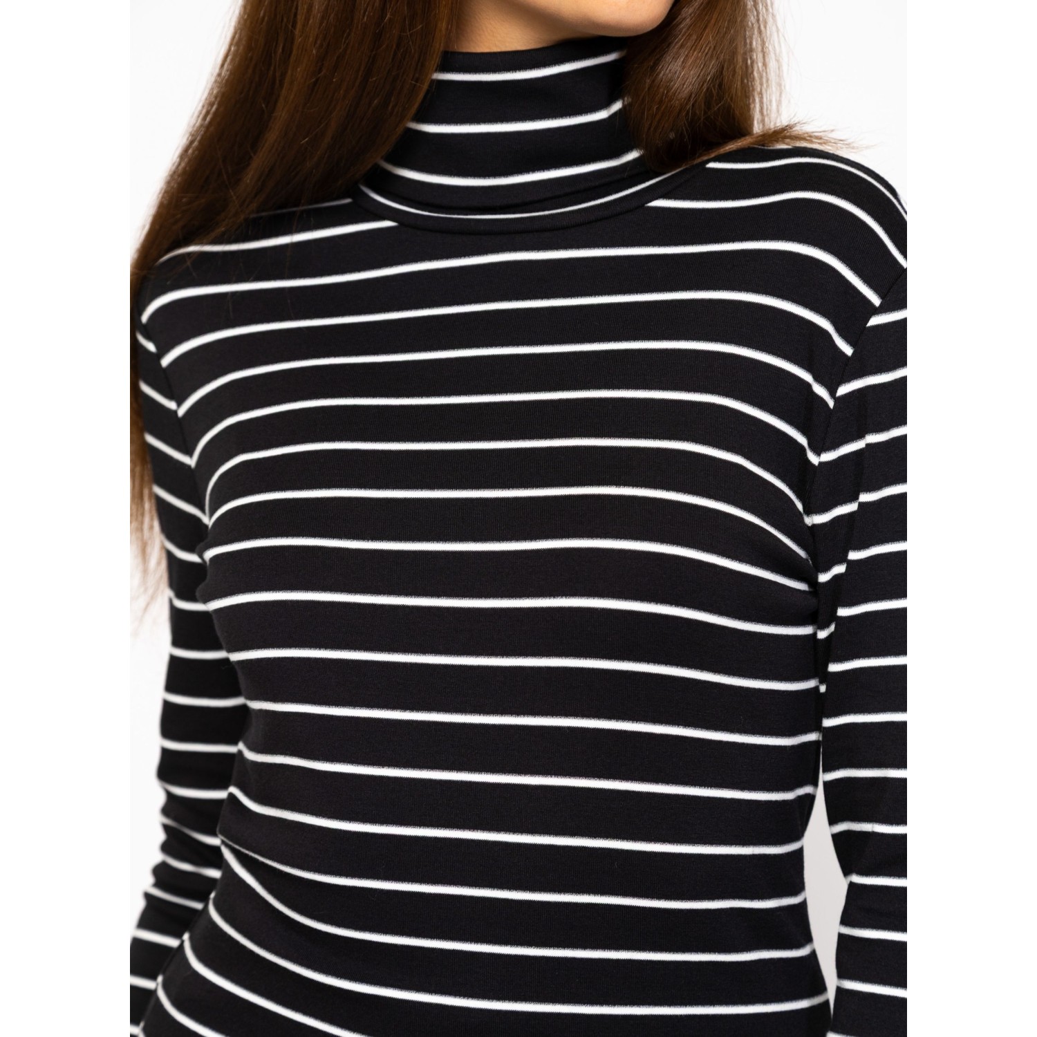 Női hosszú ujjú garbó, enyhén karcsúsított szabással, csíkozásba beleszövött lurex szállal, elasztánnal és modállal kevert pamut anyagból, hátán kis nyomott márkajelzéssel, oldalában szövött címkével. Anyaga: 57% pamut, 38% modál, 3% elasztán, 2% fémszál. A modell 175 cm magas és S-es méretet visel.