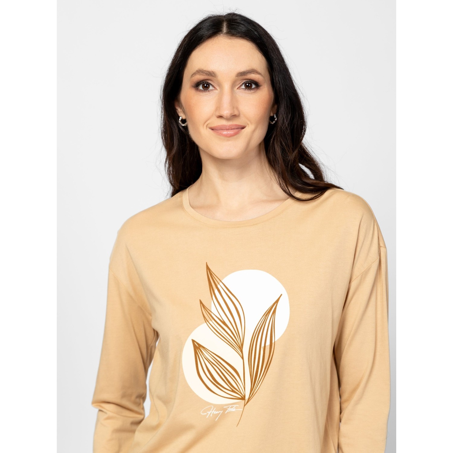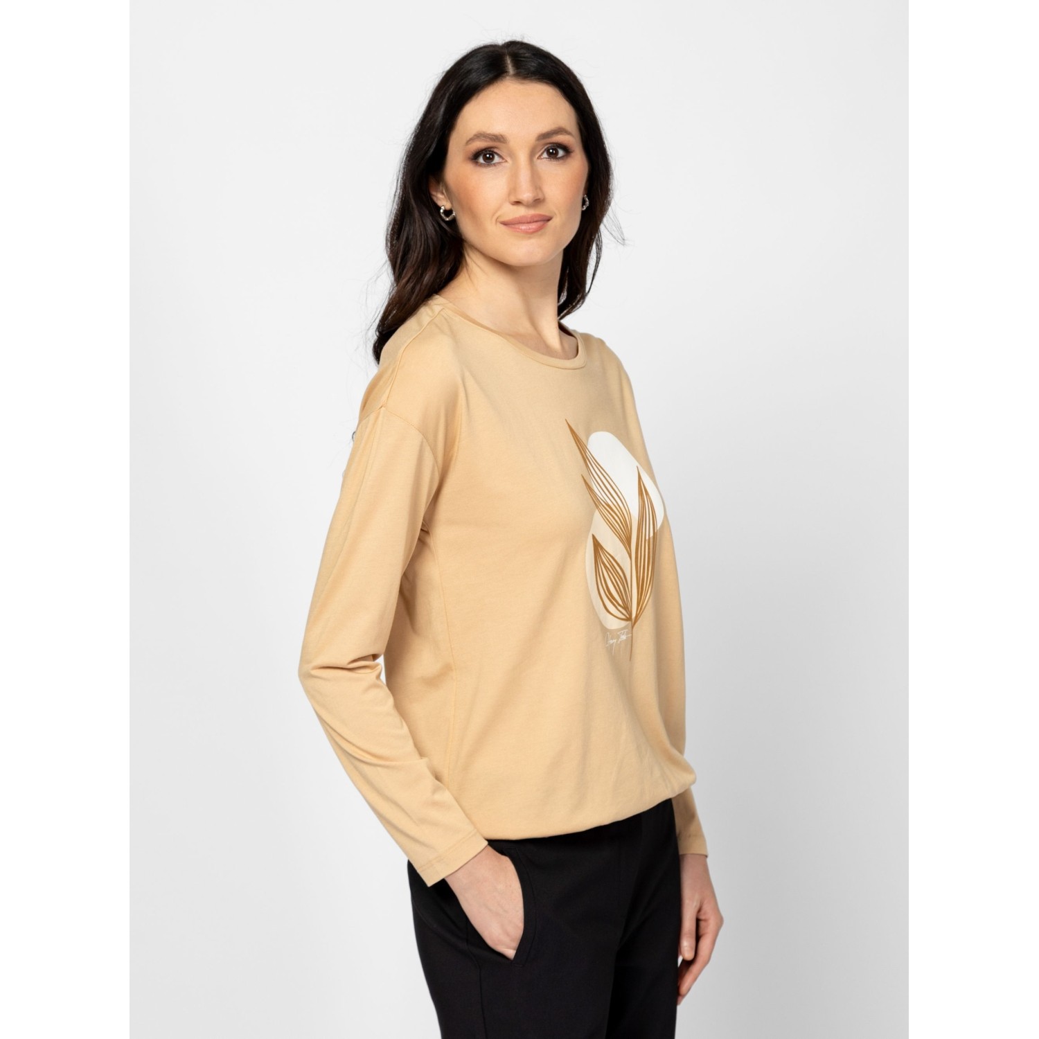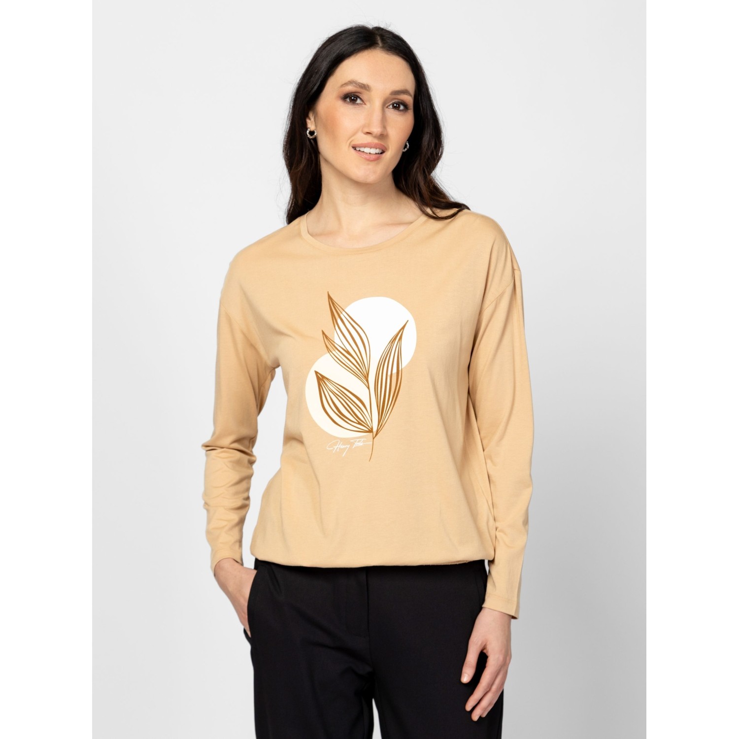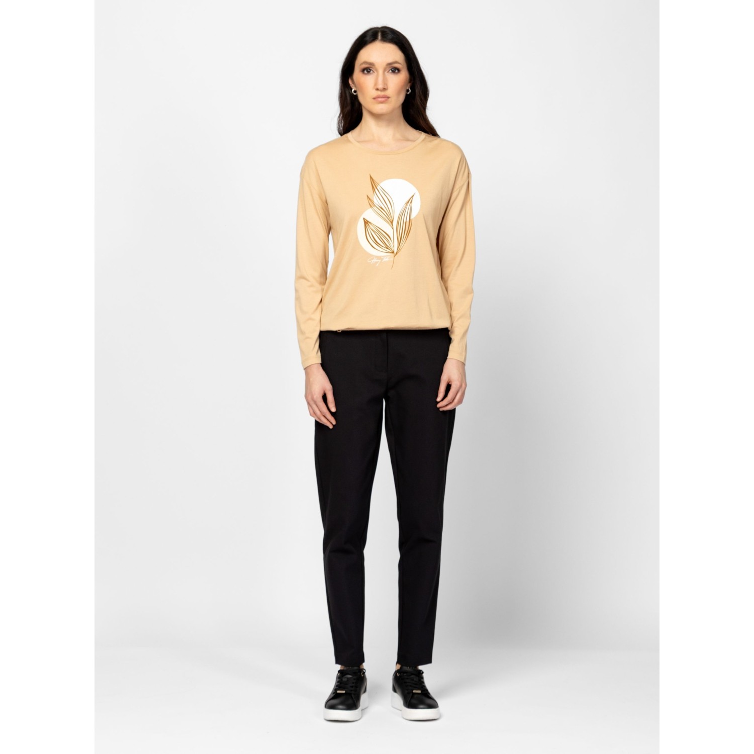Női hosszú ujjú póló, bővebb szabással, ejtett vállal, kerek nyakkal, gumírozott aljjal, modállal kevert pamut anyagból, elején nyomott és bársonyos dekrációval, hátán kis fém márkajelzéssel. Anyaga: 50% pamut, 50% modál single jersey. A modell 175 cm magas és S-es méretet visel.