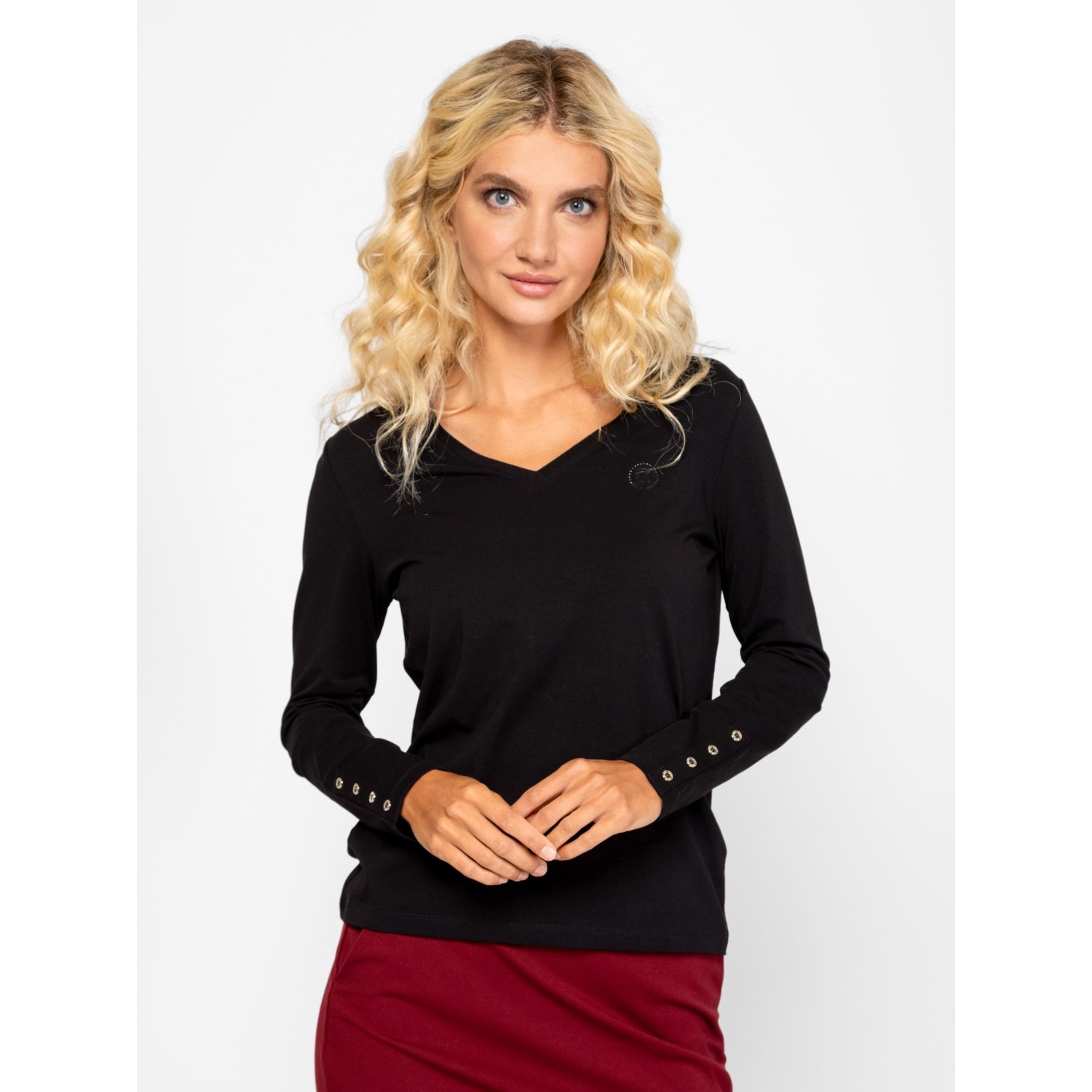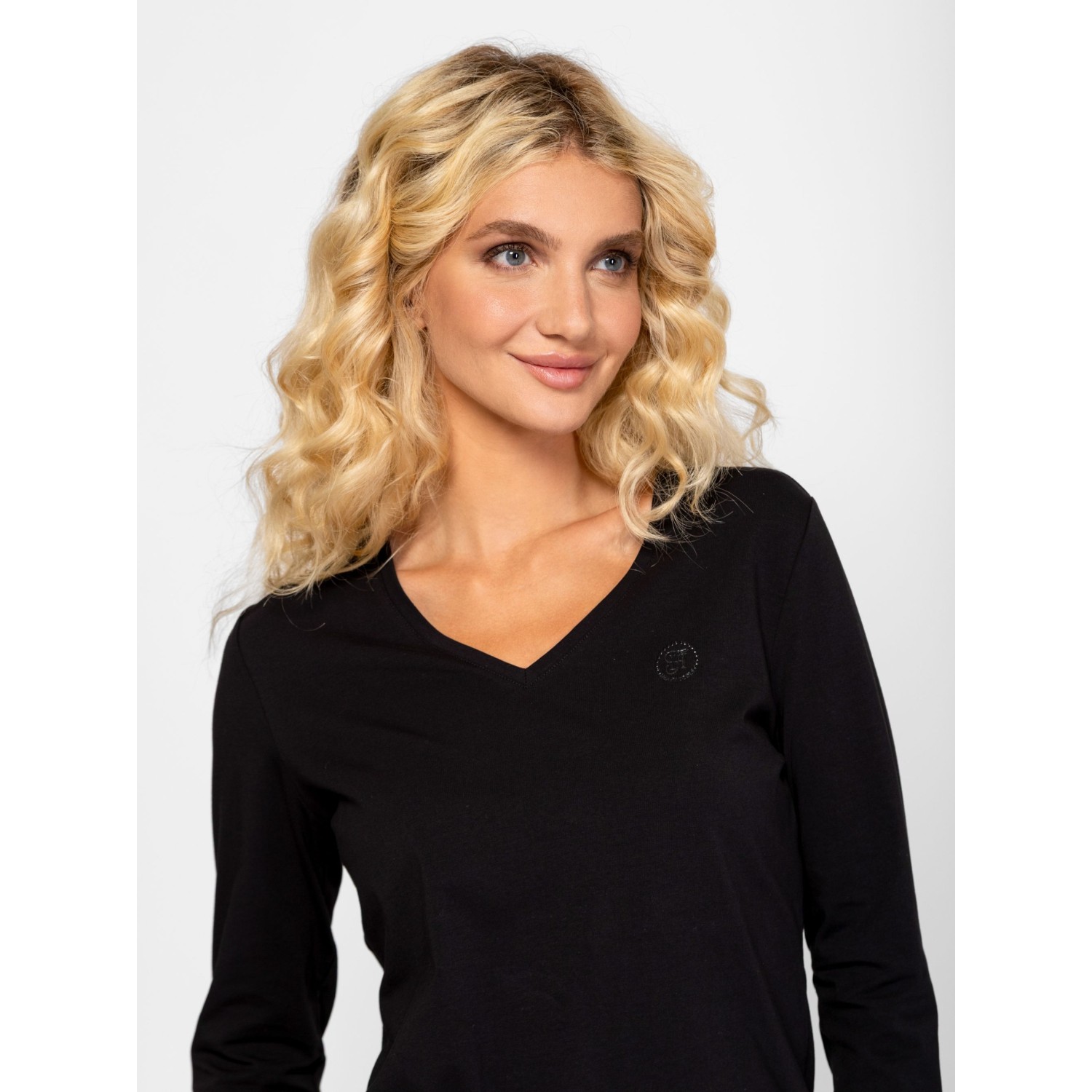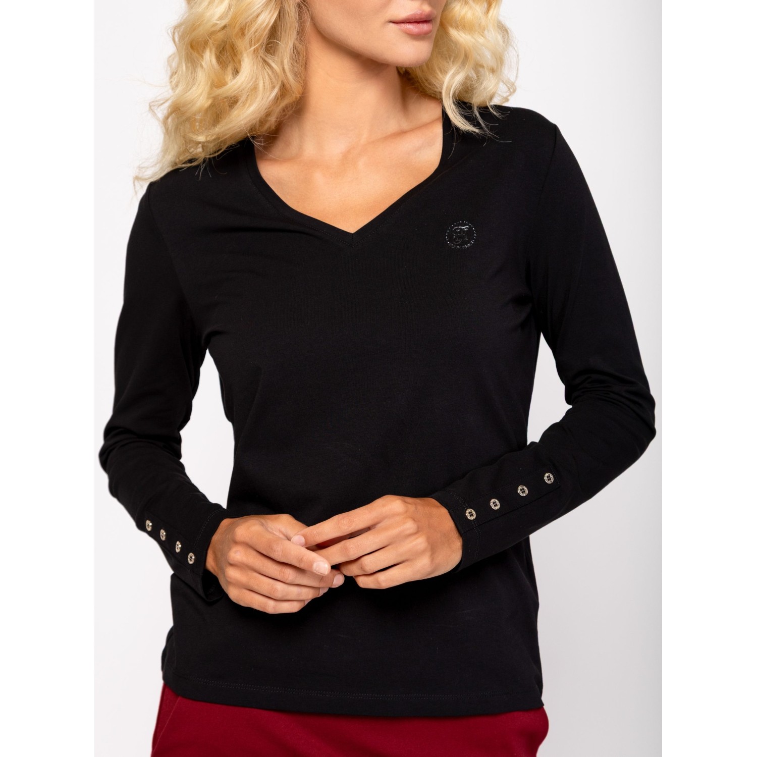 Női hosszú ujjú póló, enyhén karcsúsított szabással, v-nyakkal, elasztánnal kevert pamut anyagból, elején kis, nyomott és kövekből kirakott márkajelzéssel, ujja alján díszgombokkal. Anyaga: 95% pamut és 5% elasztán single jersey. A modell 175 cm magas és S-es méretet visel.