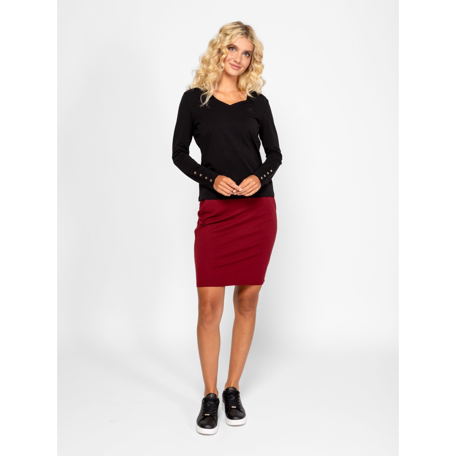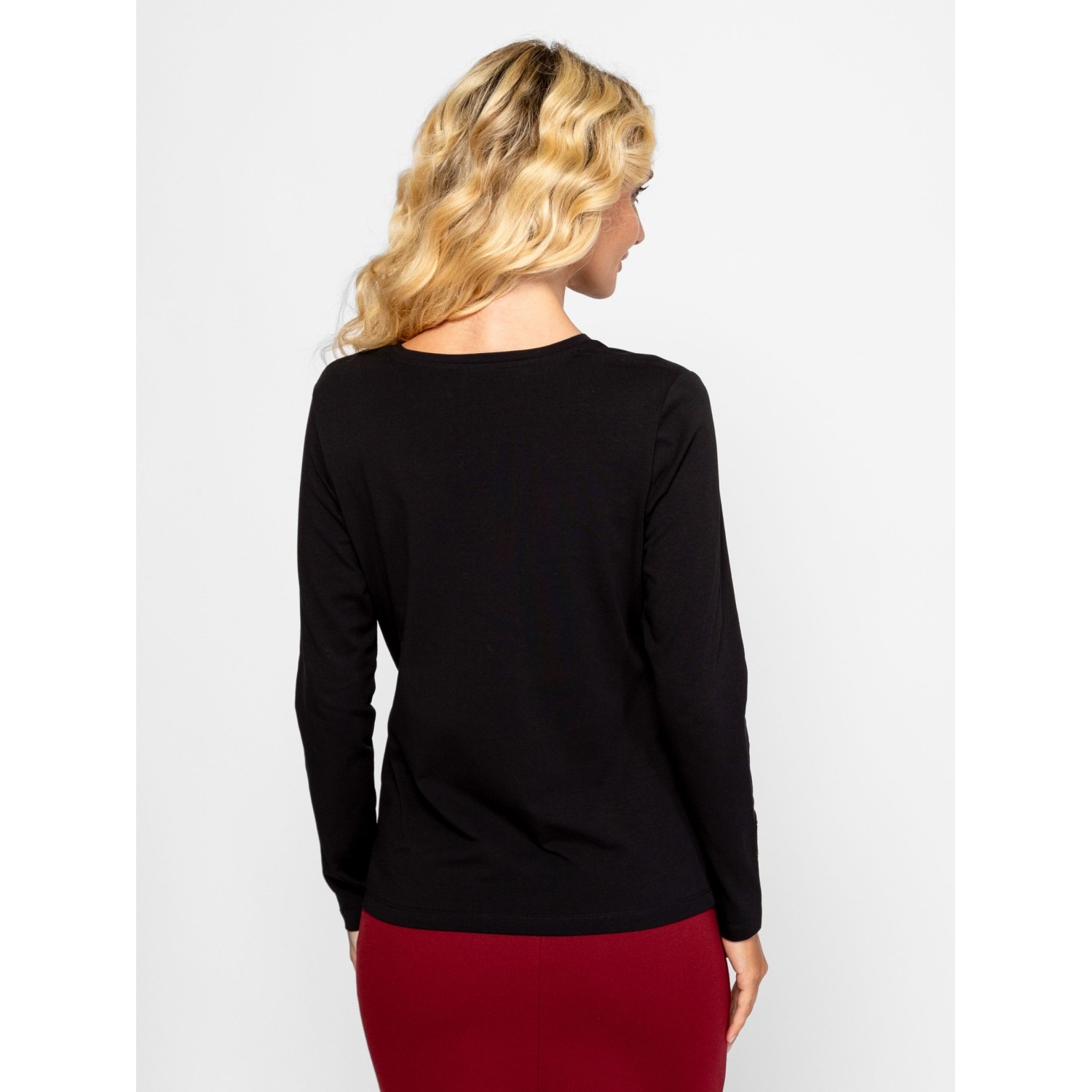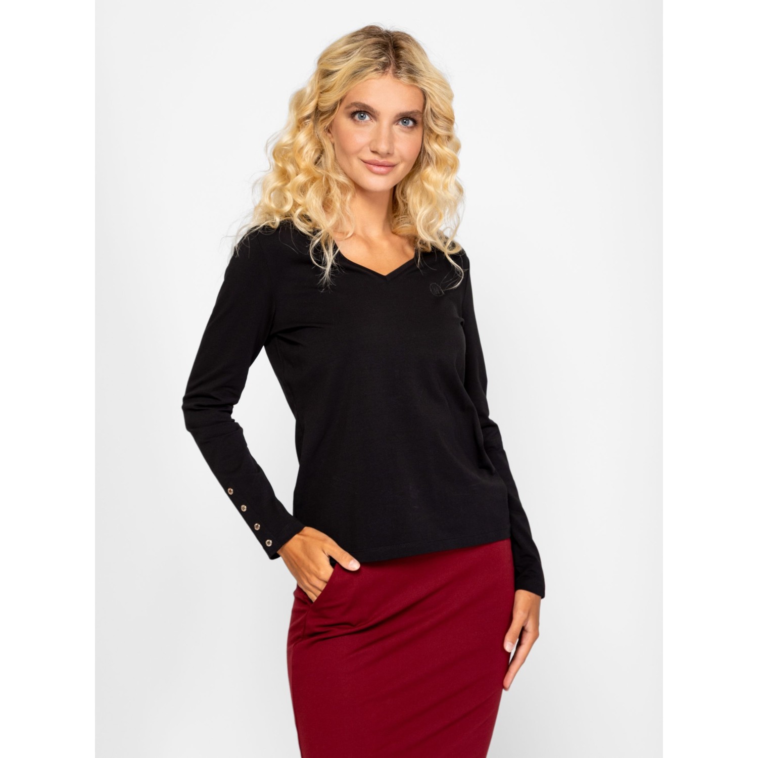 Női hosszú ujjú póló, enyhén karcsúsított szabással, v-nyakkal, elasztánnal kevert pamut anyagból, elején kis, nyomott és kövekből kirakott márkajelzéssel, ujja alján díszgombokkal. Anyaga: 95% pamut és 5% elasztán single jersey. A modell 175 cm magas és S-es méretet visel.