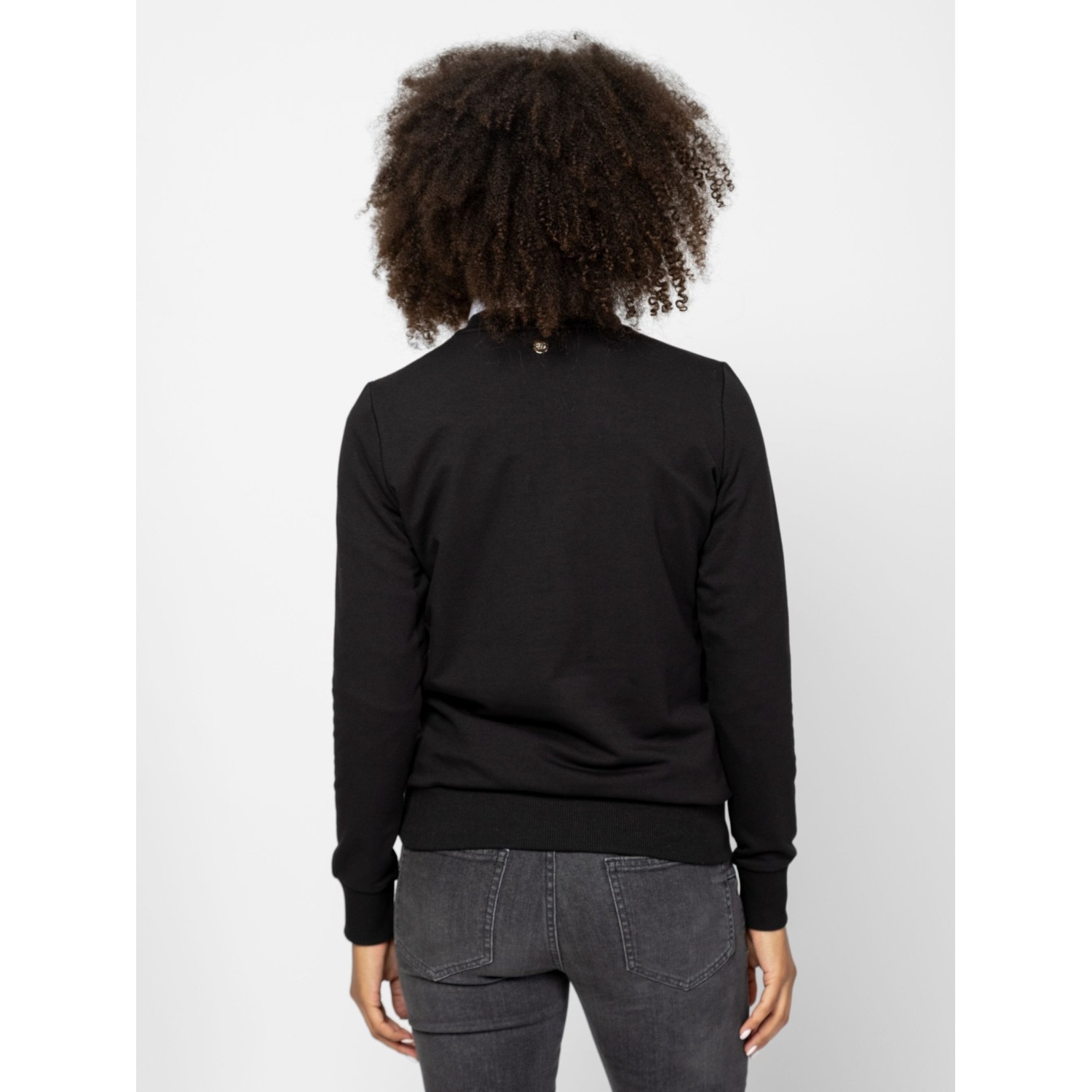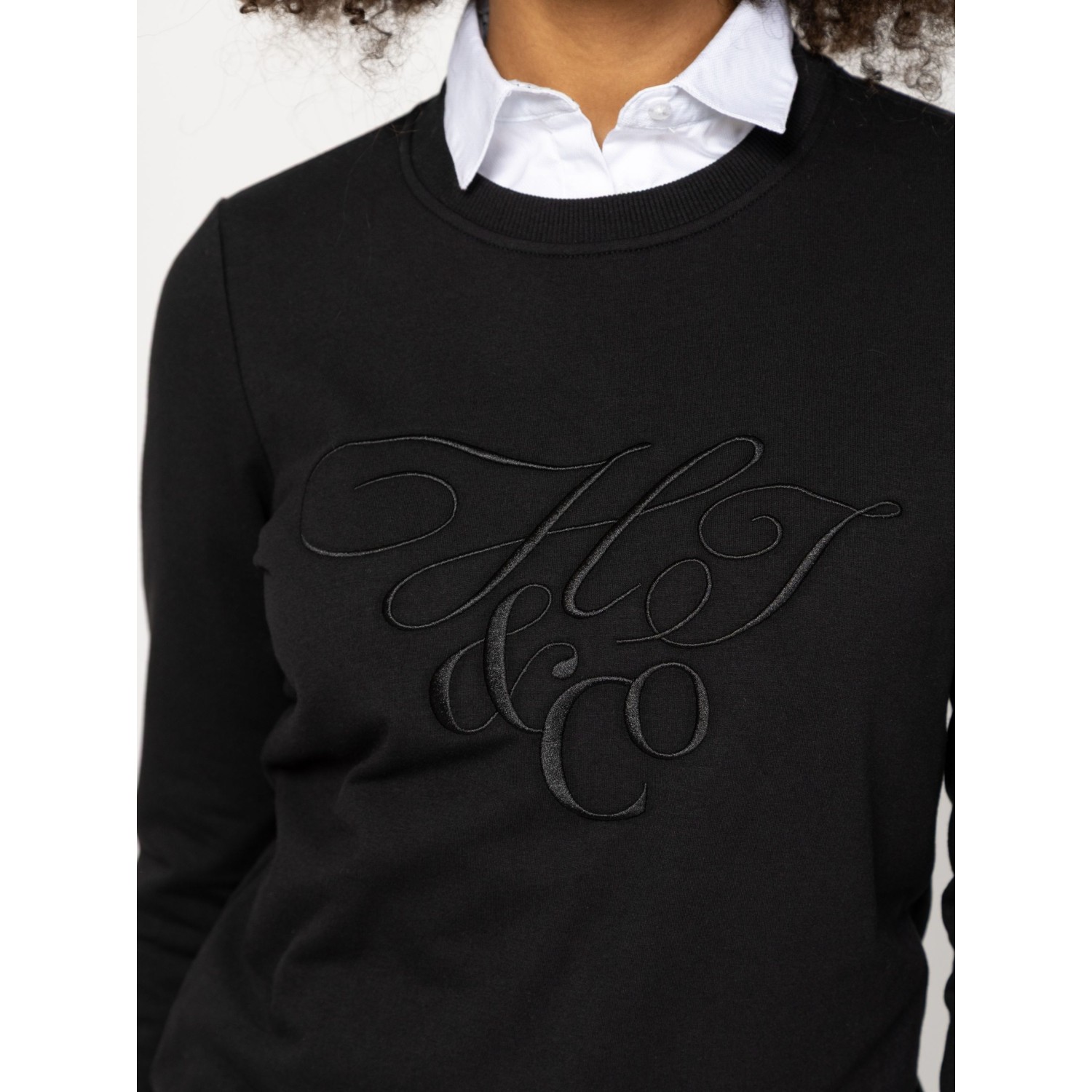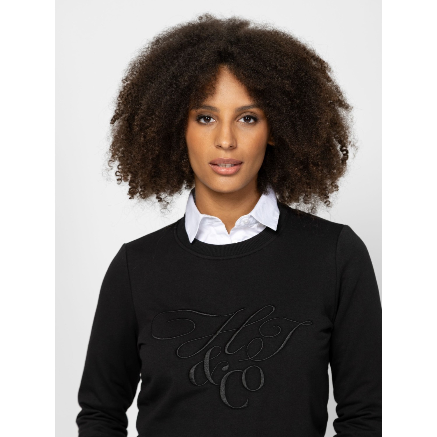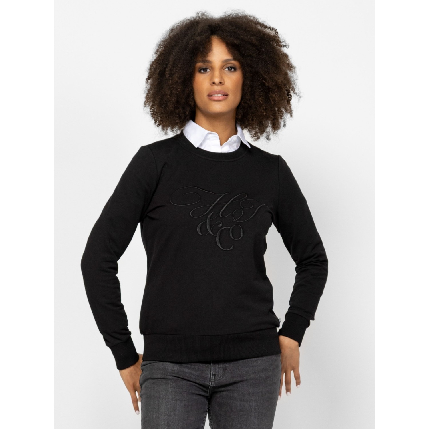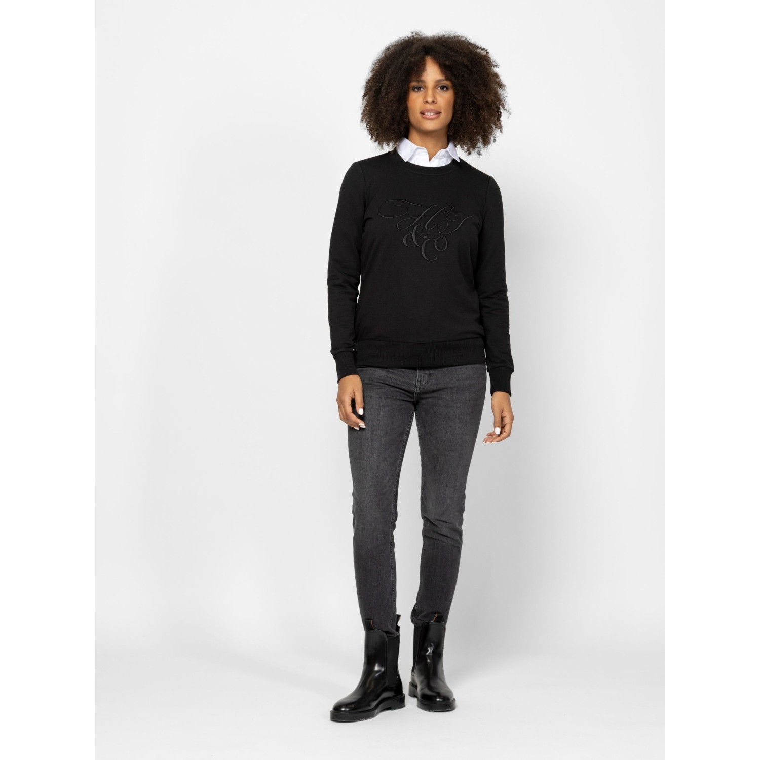 Női pulóver, klasszikus vonalvezetéssel, kerek nyakkal, bordás passzés aljjal és kézelővel, magas pamut tartalmú anyagból, elején hímzett márkajelzéssel, hátán kis fém márkajelzéssel. Anyaga: 58% pamut, 38% poliészter, 4% elasztán, belül enyhén bolyhozott fleece. A modell 175 cm magas és S-es méretet visel.