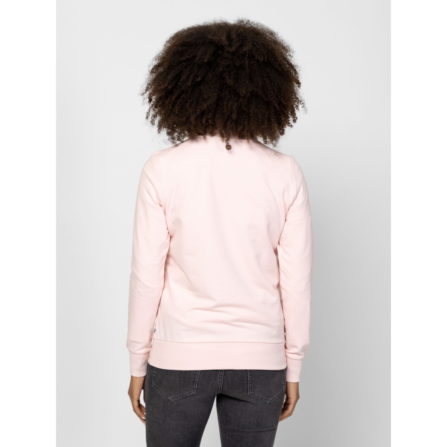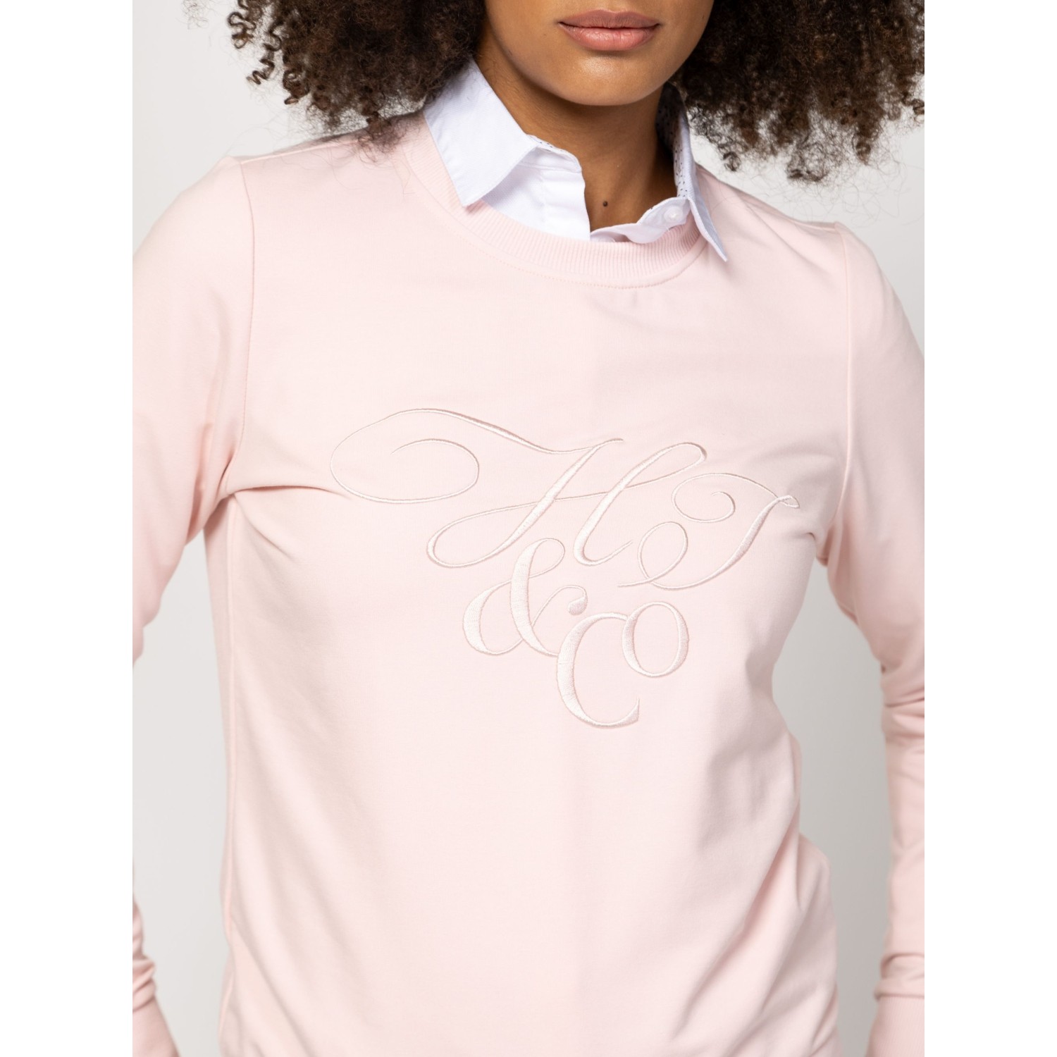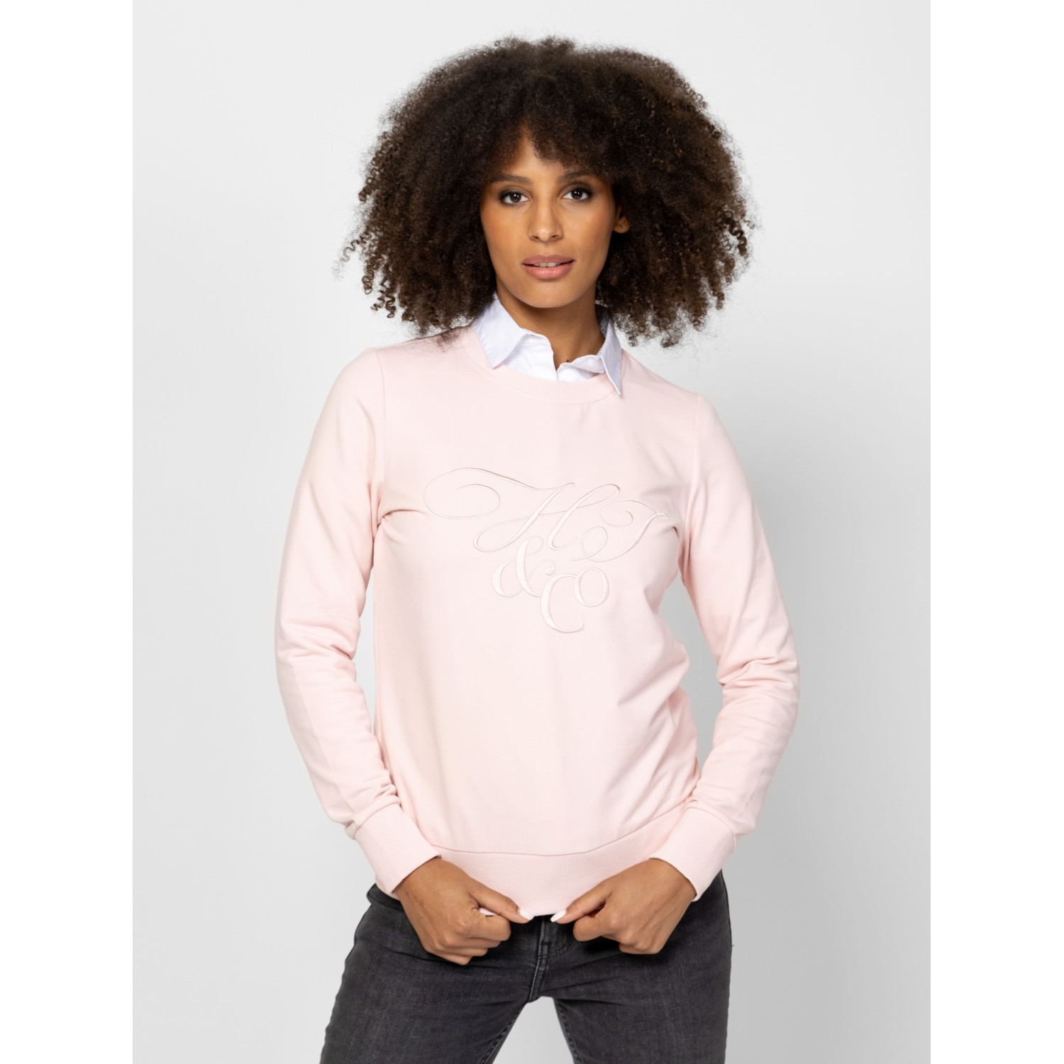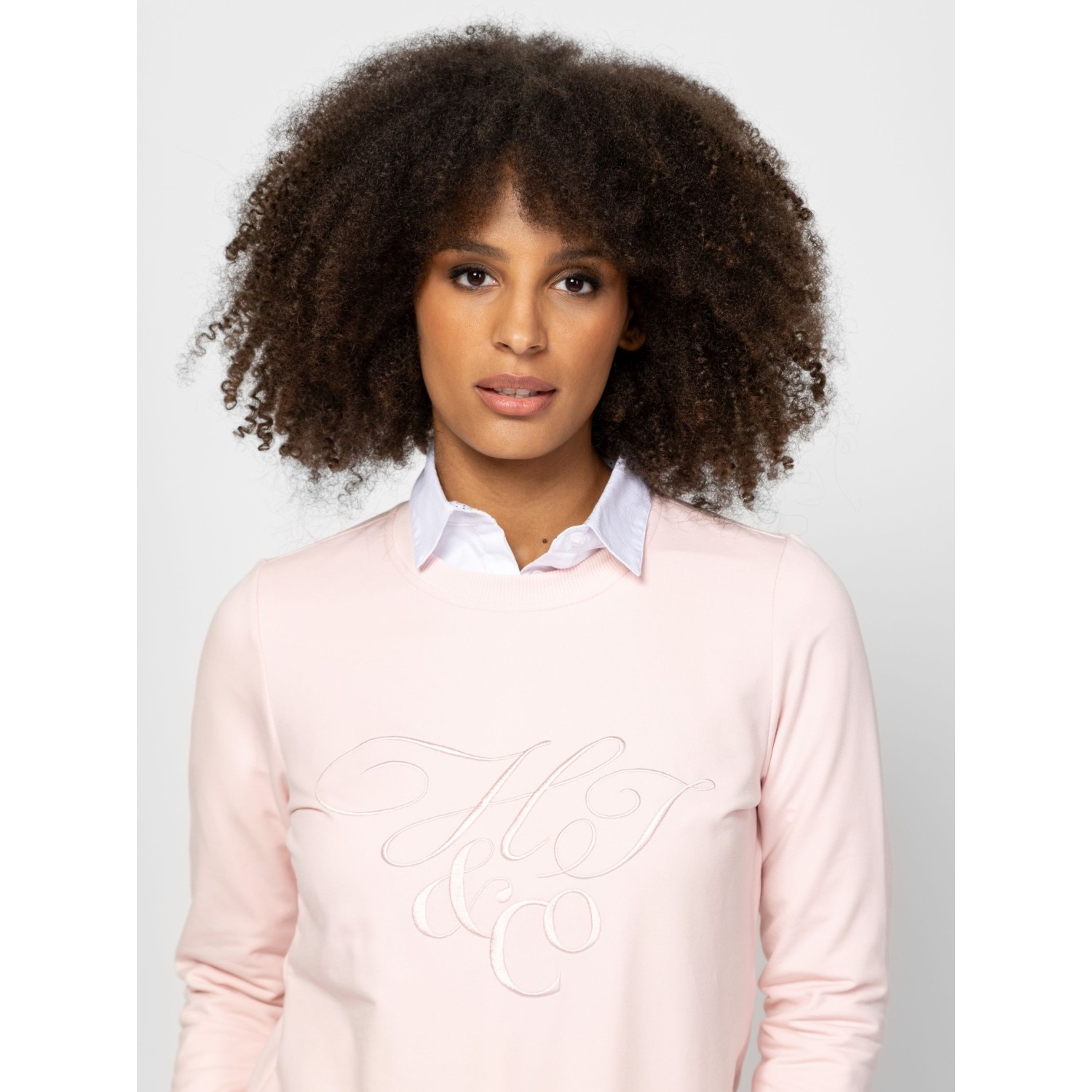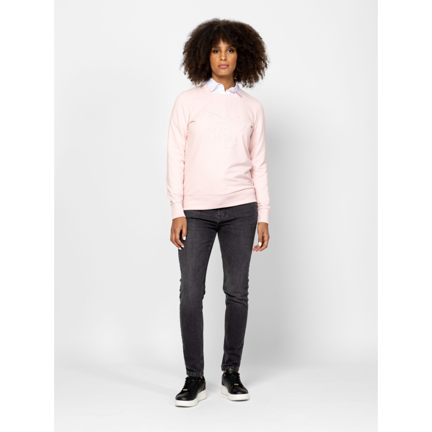 Női pulóver, klasszikus vonalvezetéssel, kerek nyakkal, bordás passzés aljjal és kézelővel, magas pamut tartalmú anyagból, elején hímzett márkajelzéssel, hátán kis fém márkajelzéssel. Anyaga: 58% pamut, 38% poliészter, 4% elasztán, belül enyhén bolyhozott fleece. A modell 175 cm magas és S-es méretet visel.