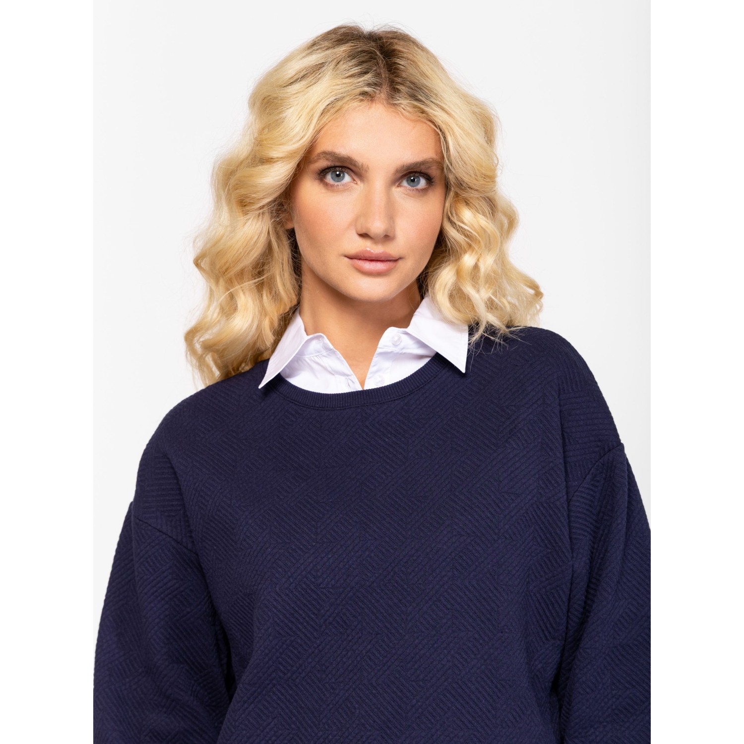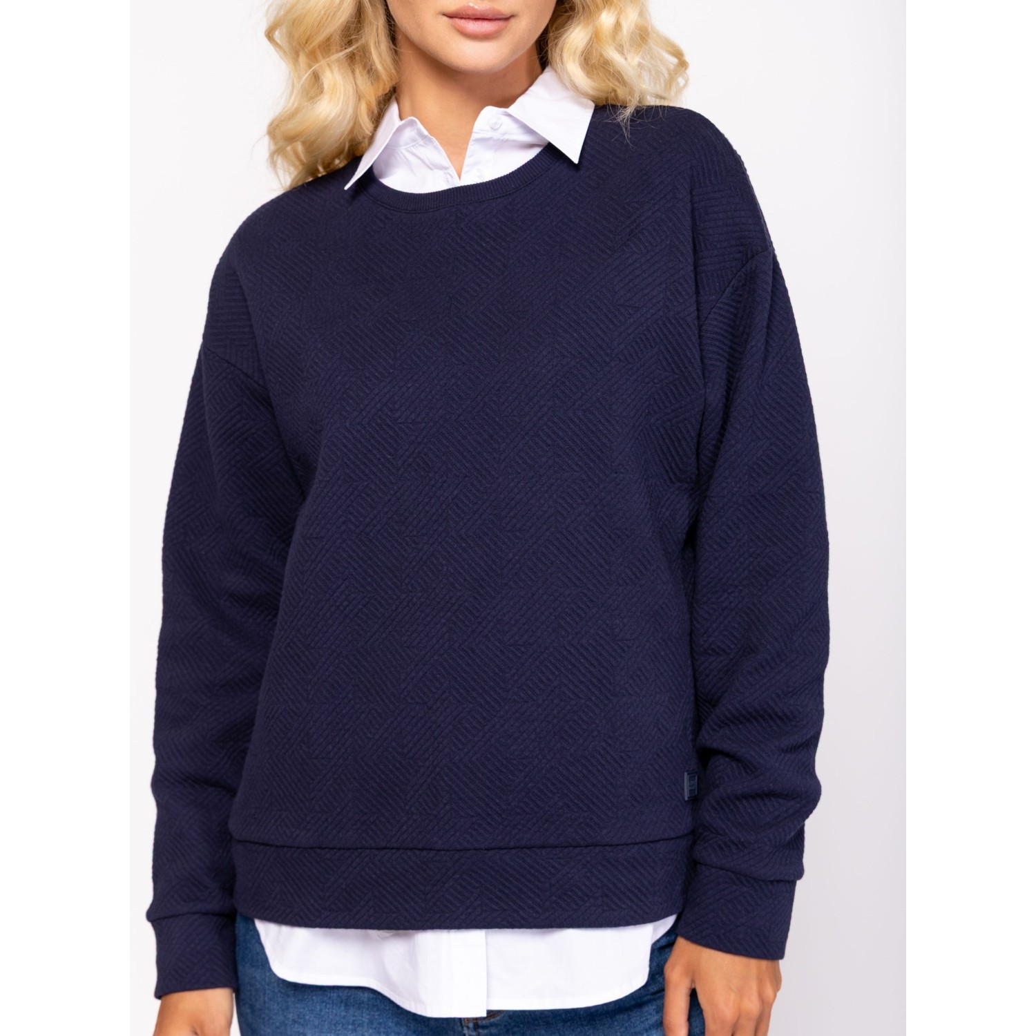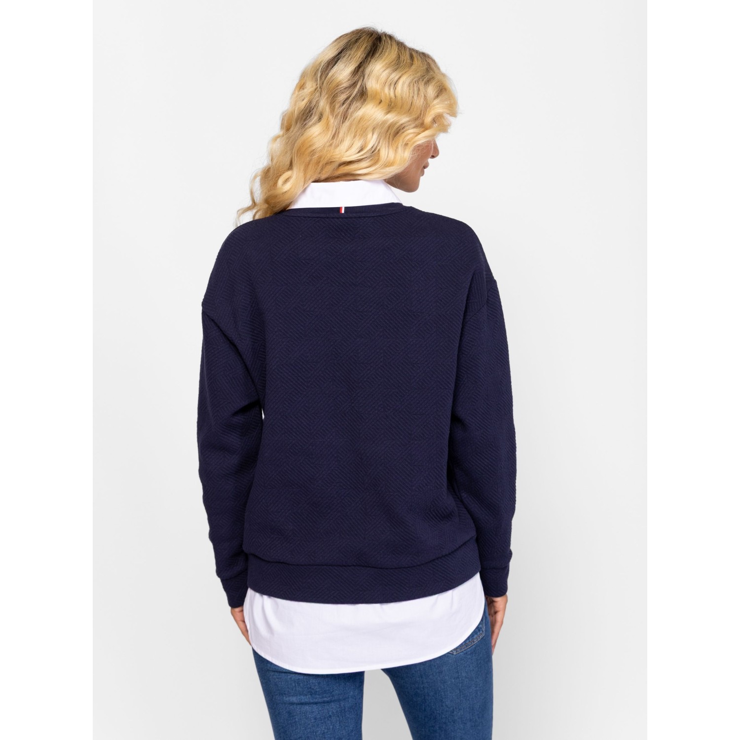 Női pulóver, bővebb szabással, kerek nyakkal, ejtett vállal, klasszikus brand színekben, geometrikus mintával, kis márkajelzéssel az eleje alján. Anyaga: 50% pamut, 50% poliészter, jacquard kötésű anyag. A modell 175 cm magas és S-es méretet visel.