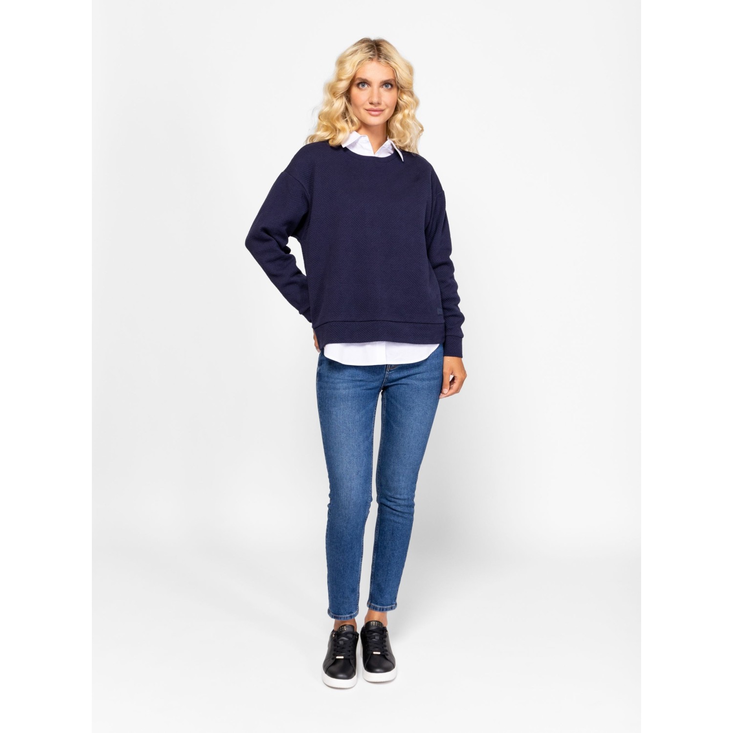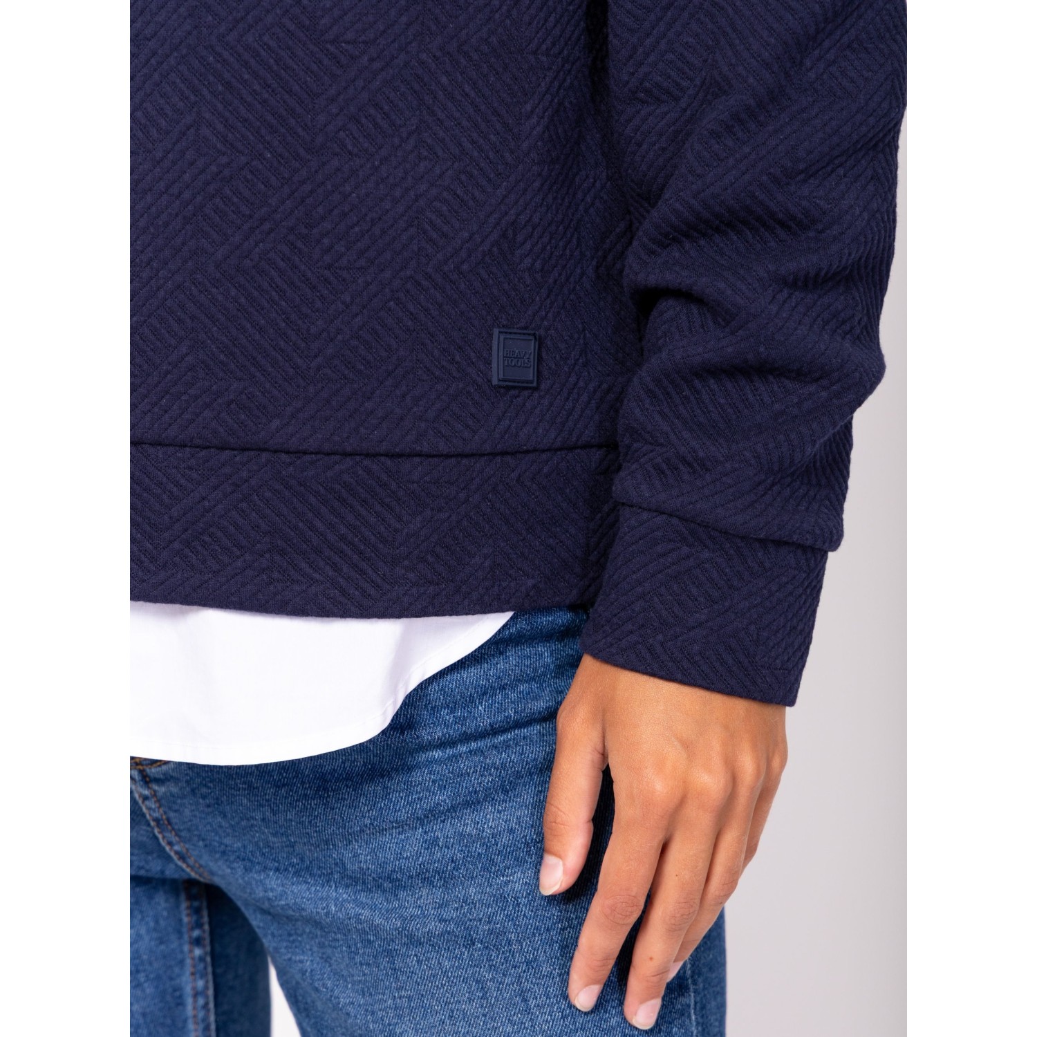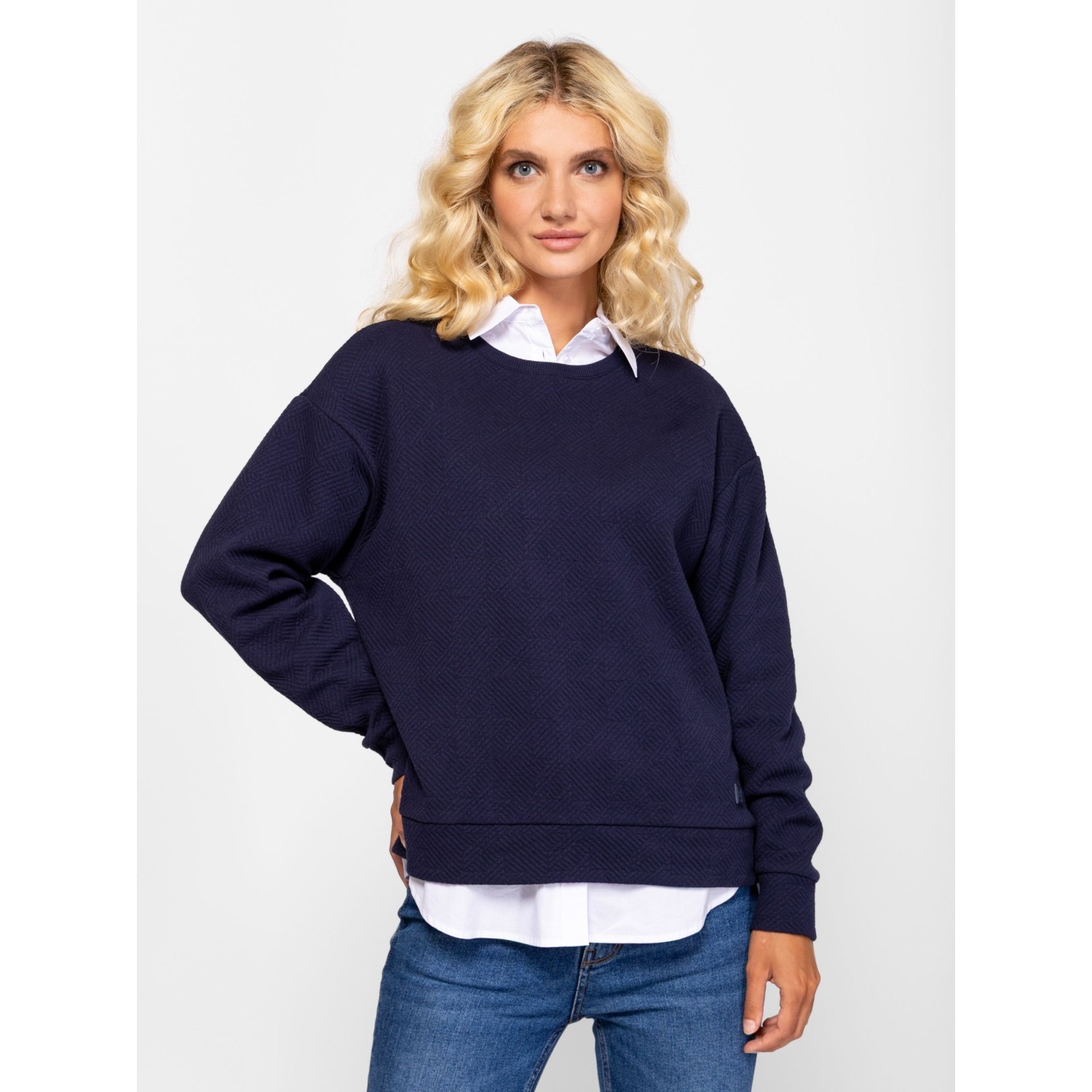 Női pulóver, bővebb szabással, kerek nyakkal, ejtett vállal, klasszikus brand színekben, geometrikus mintával, kis márkajelzéssel az eleje alján. Anyaga: 50% pamut, 50% poliészter, jacquard kötésű anyag. A modell 175 cm magas és S-es méretet visel.