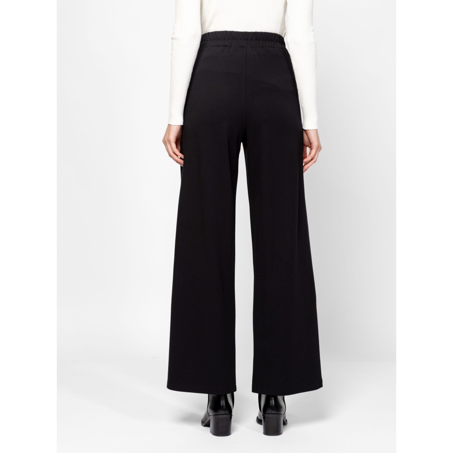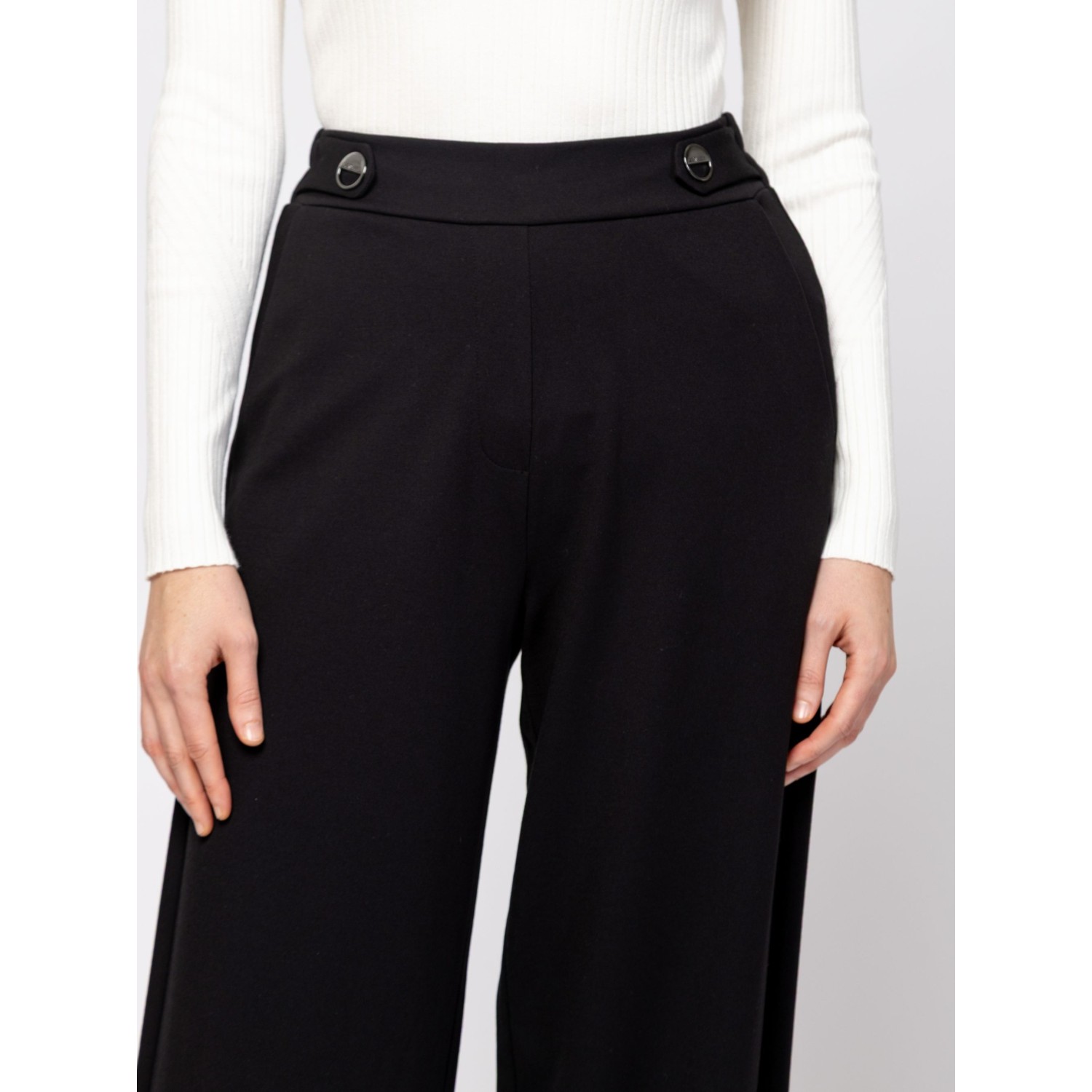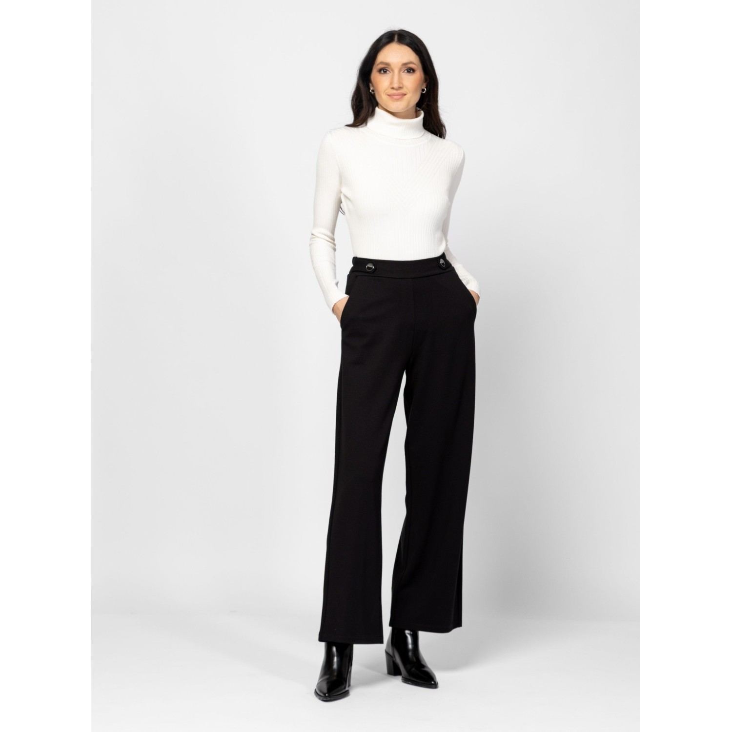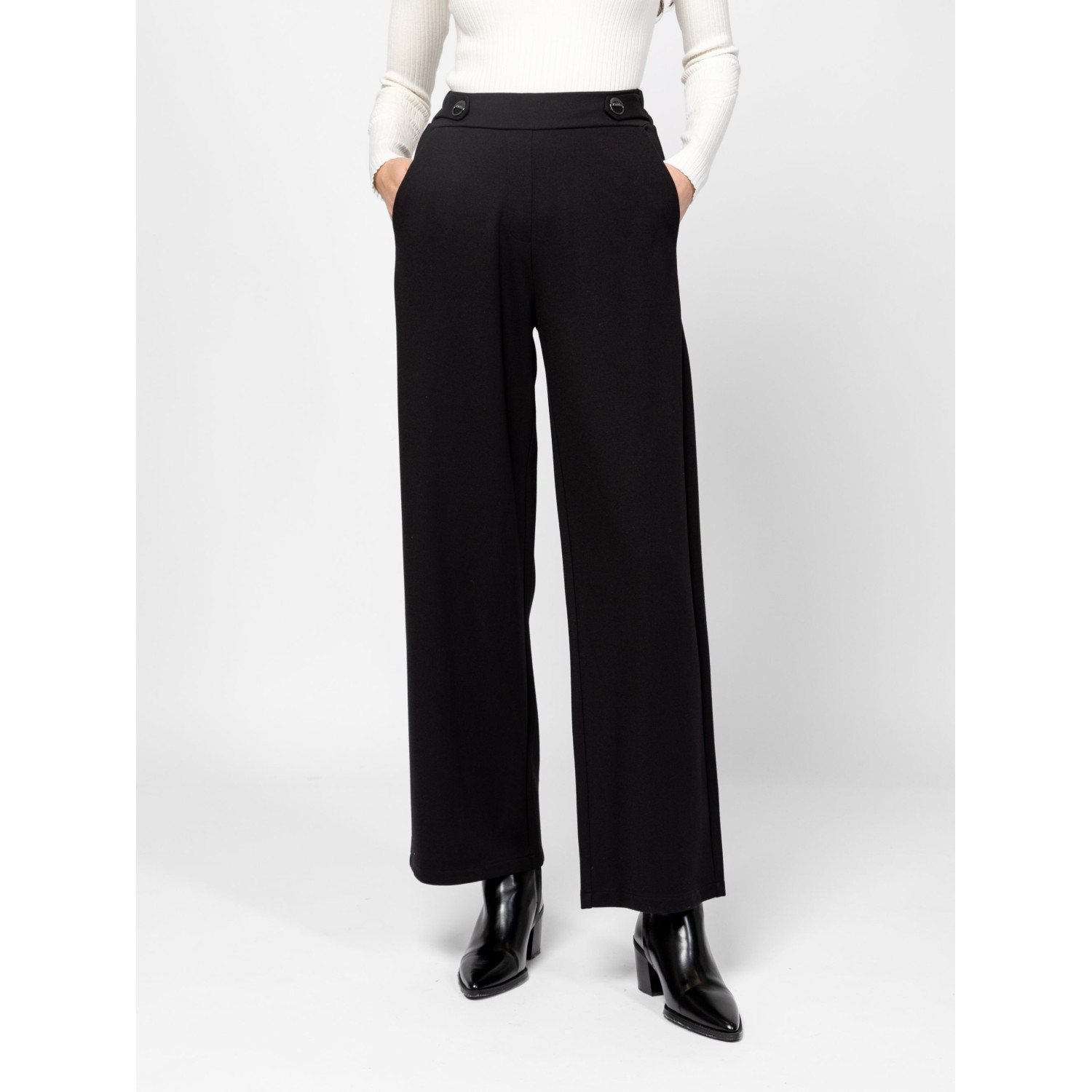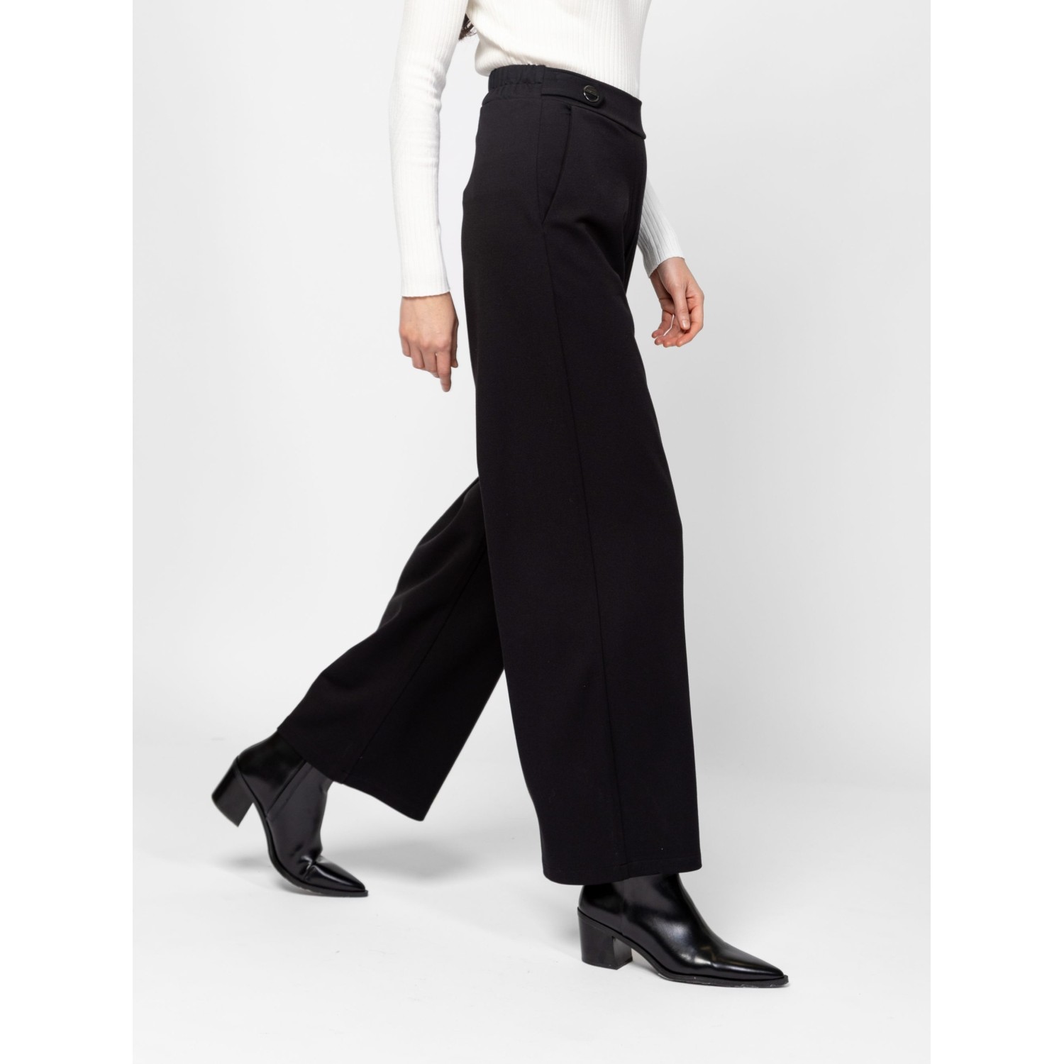 Női nadrág, kényelmes, lefelé bővülő szárral, gumírozott derékkal, egyenes zsebekkel, derekán logózott gombokkal, elasztikus anyagból. Anyaga: 63% viszkóz, 32% nylon, 5% elasztán. A modell 175 cm magas és S-es méretet visel.