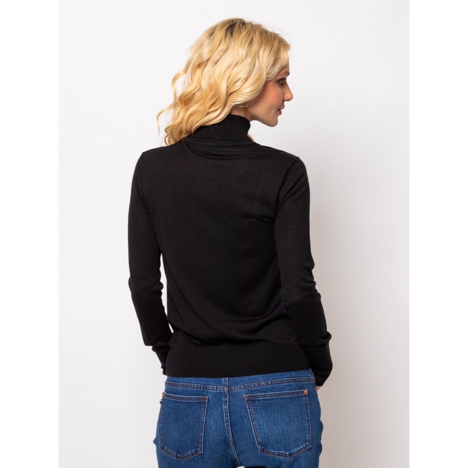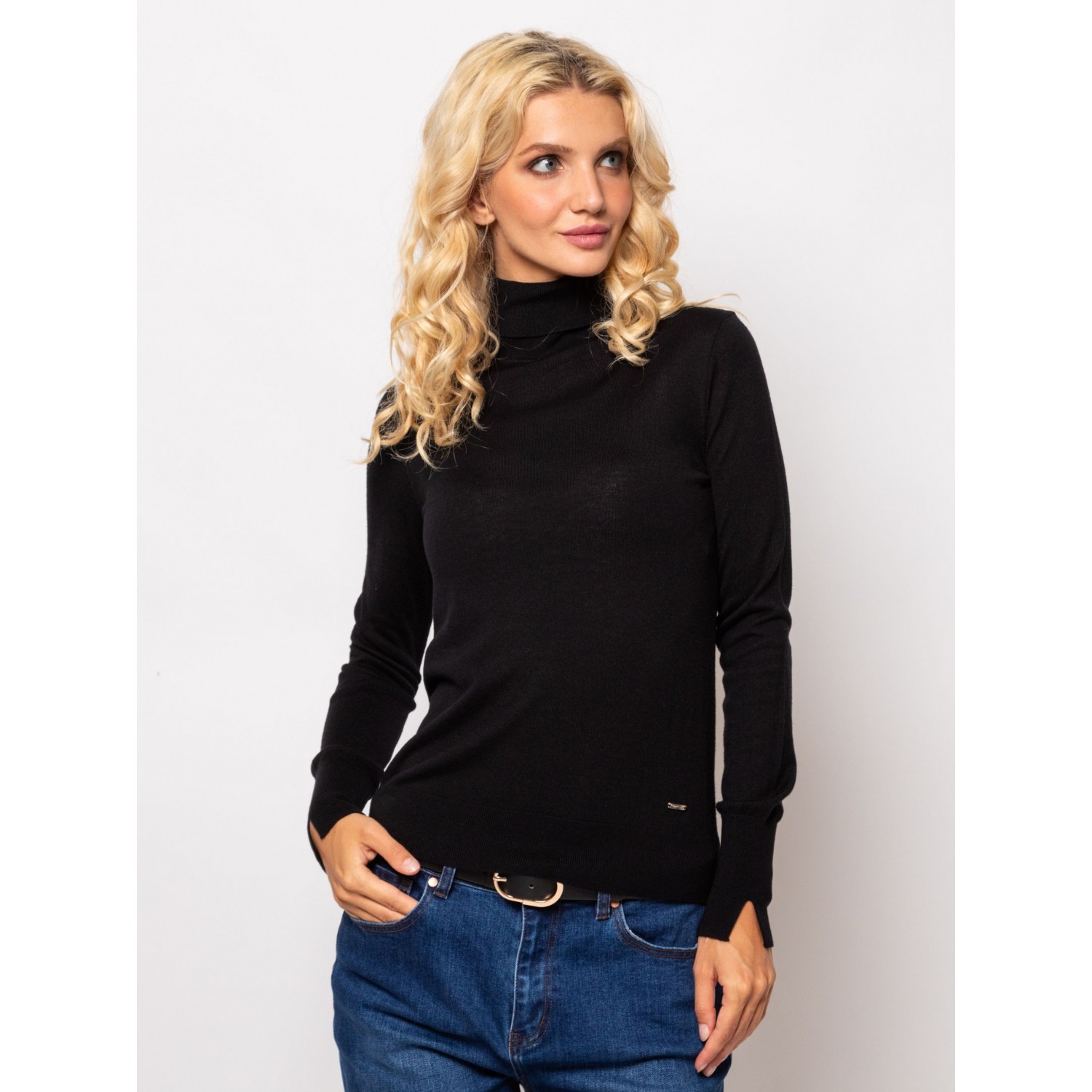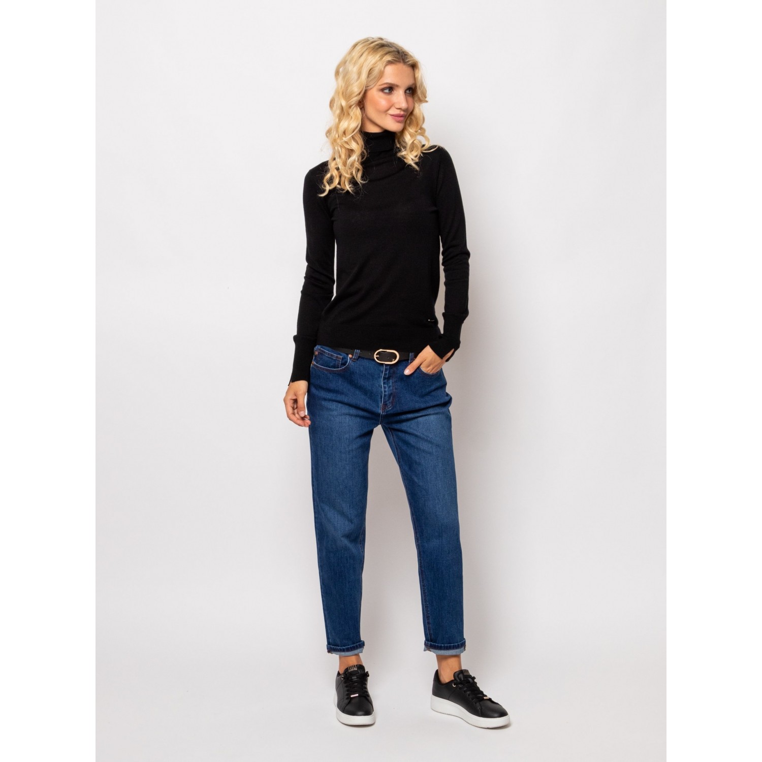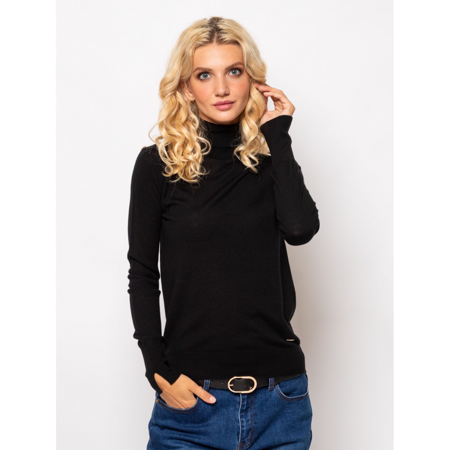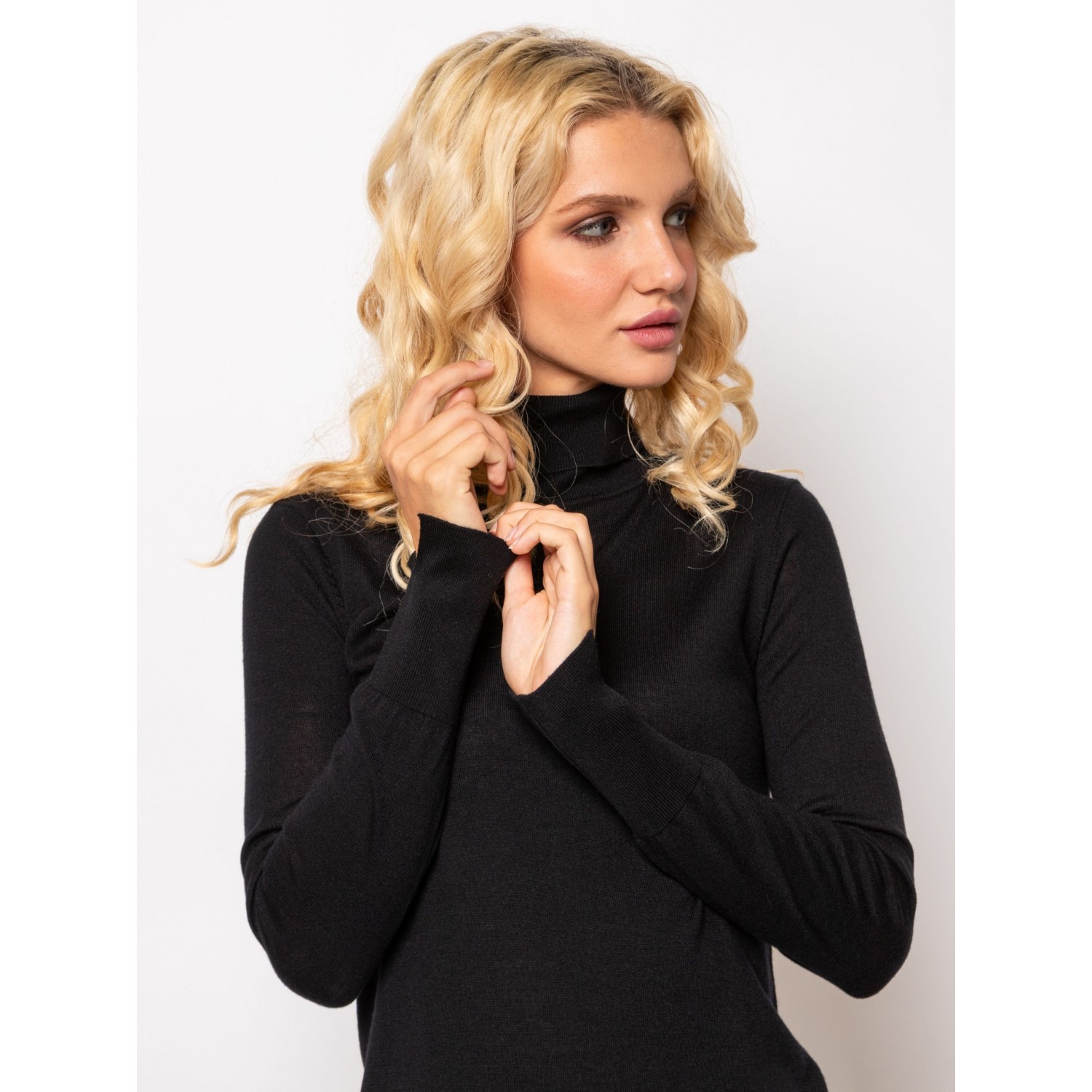 Női finom kötött garbó, egyenes fazonnal, garbó nyakkal, klasszikus őszi színekben, kis fém márkajelzéssel az eleje alján. Anyaga: 65% akril, 20% lyocell, 10% gyapjú, 5% selyem. A modell 175 cm magas és S-es méretet visel.