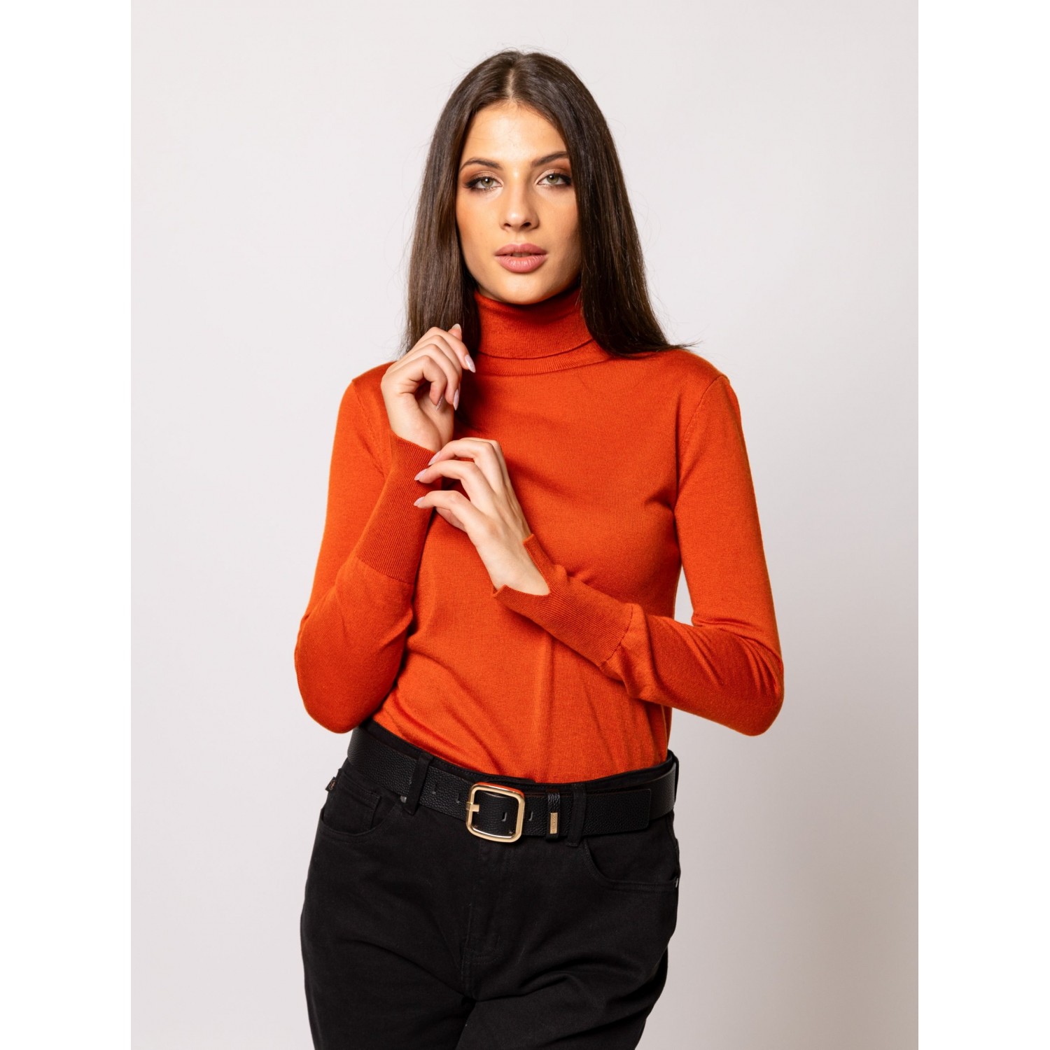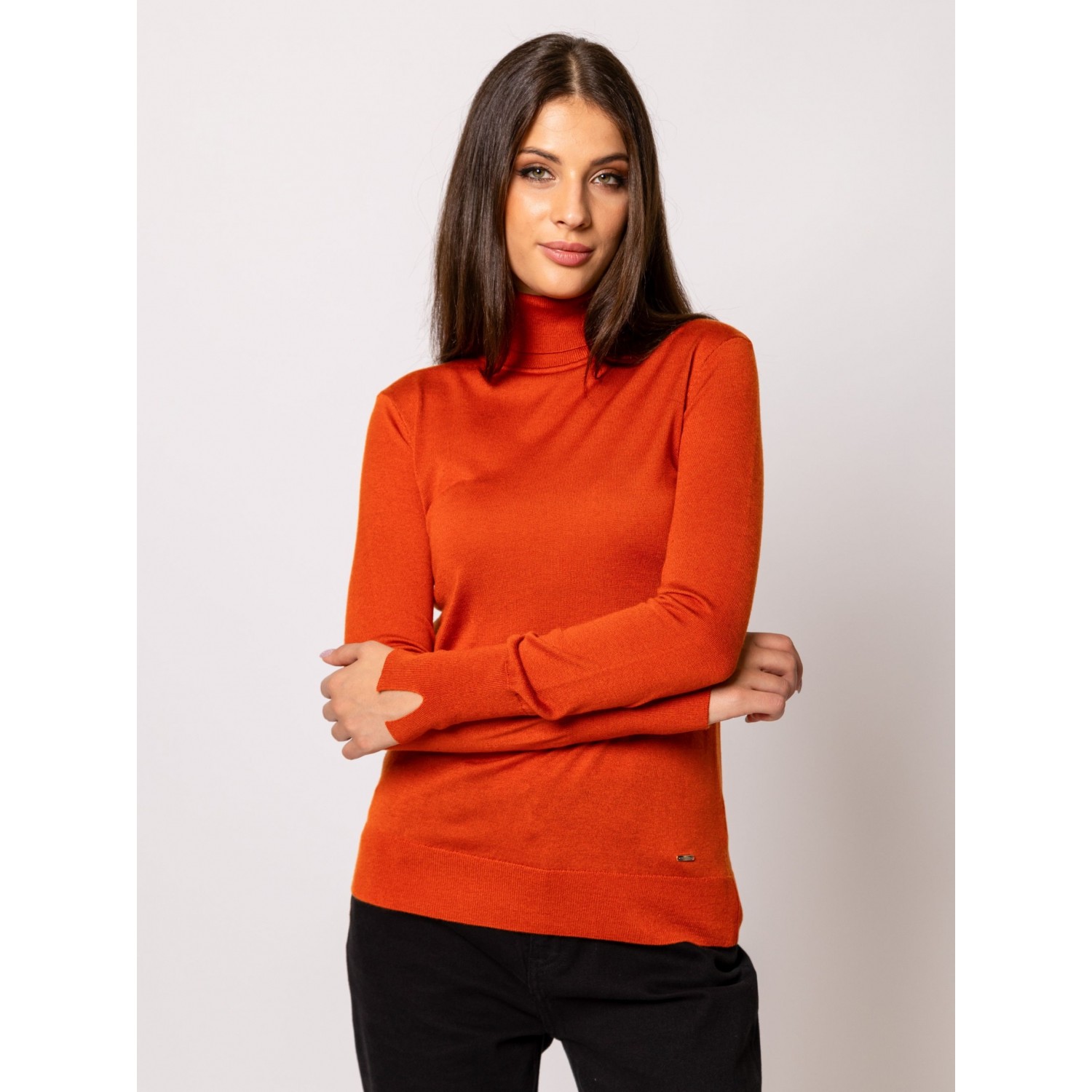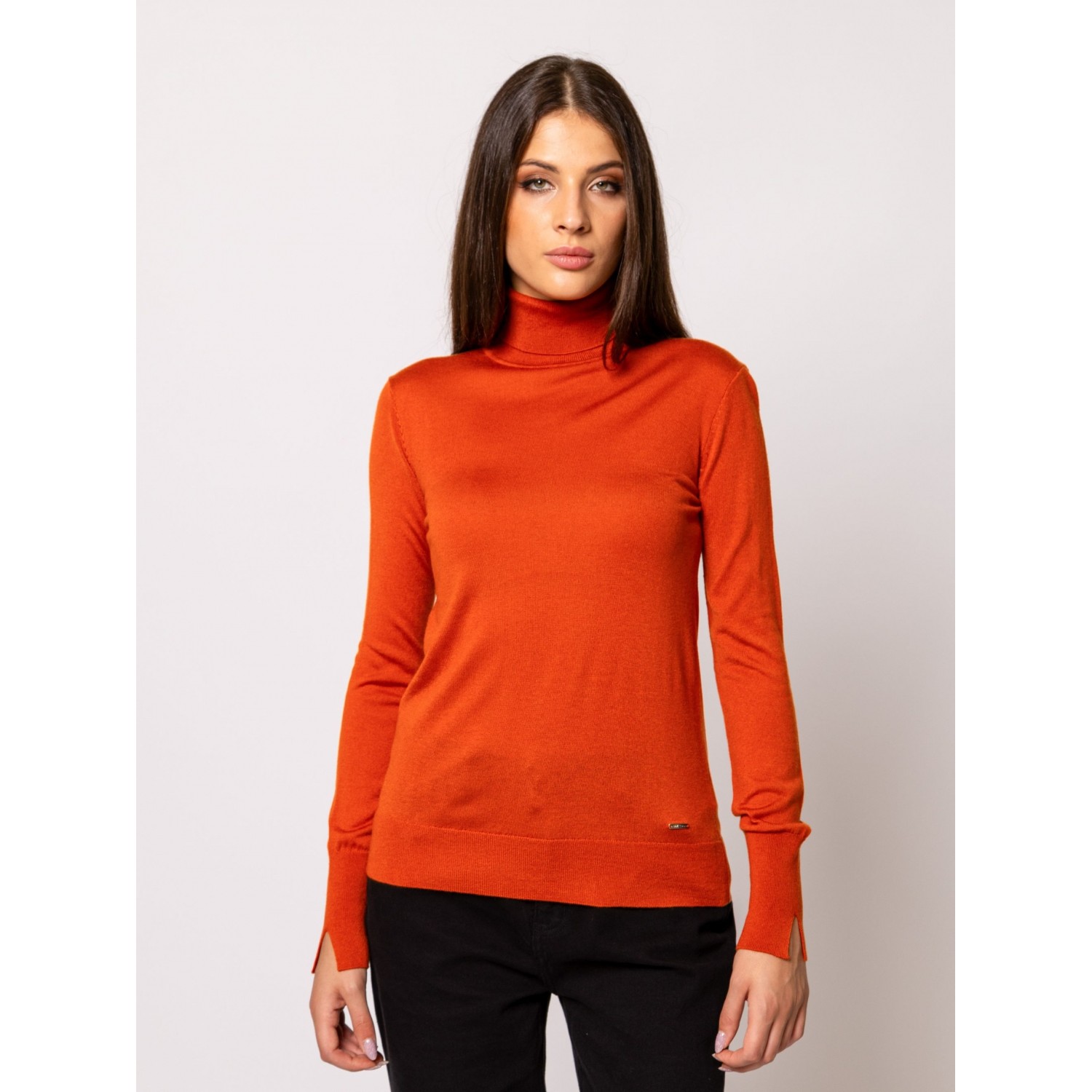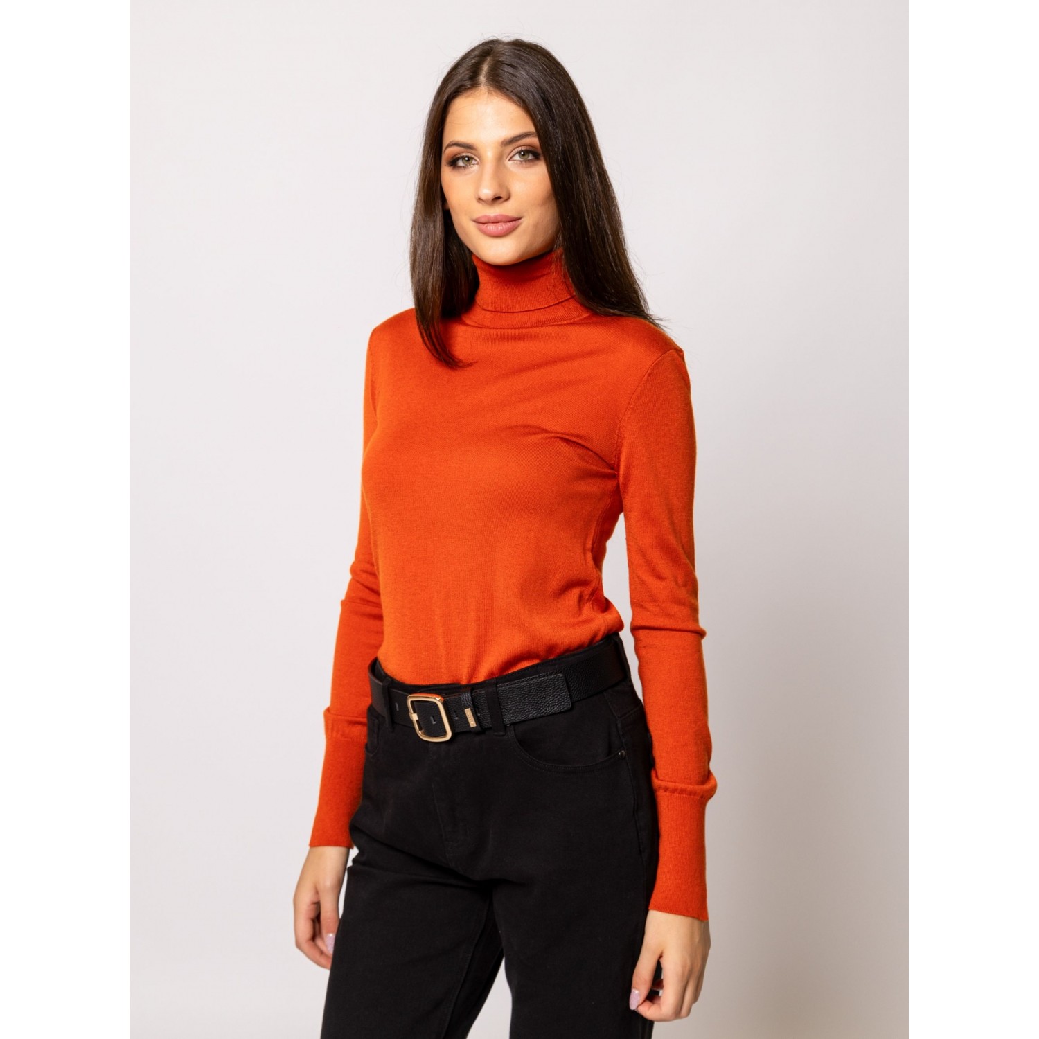 Női finom kötött garbó, egyenes fazonnal, garbó nyakkal, klasszikus őszi színekben, kis fém márkajelzéssel az eleje alján. Anyaga: 65% akril, 20% lyocell, 10% gyapjú, 5% selyem. A modell 175 cm magas és S-es méretet visel.