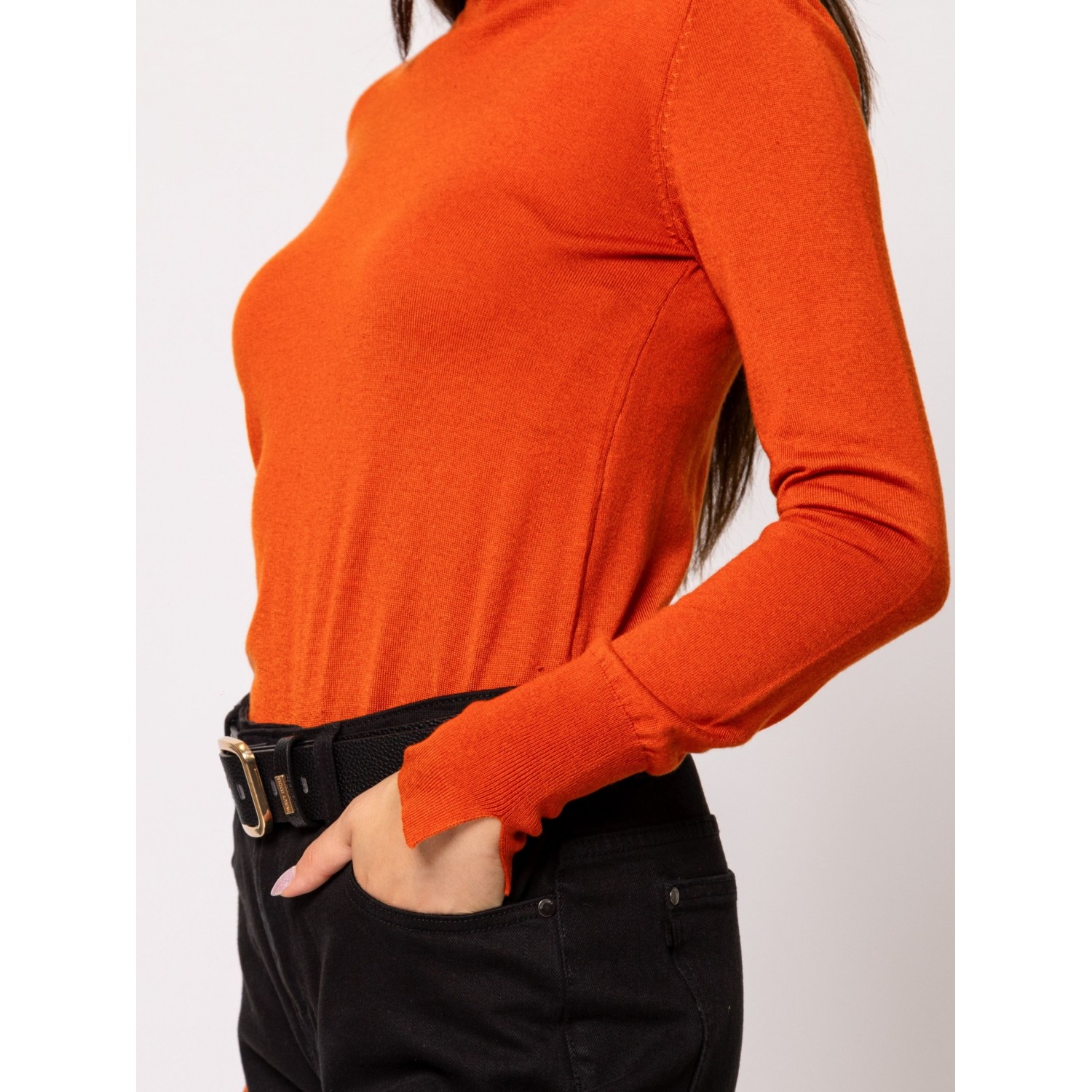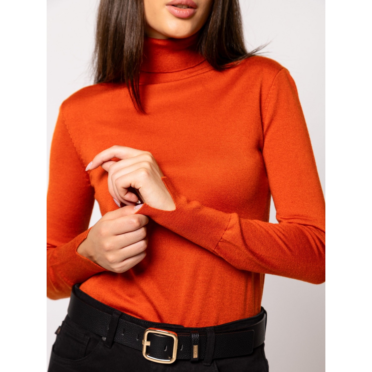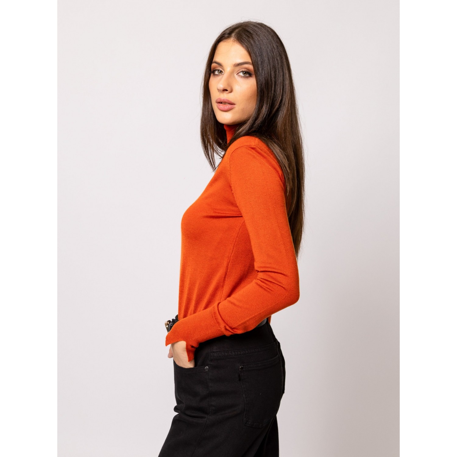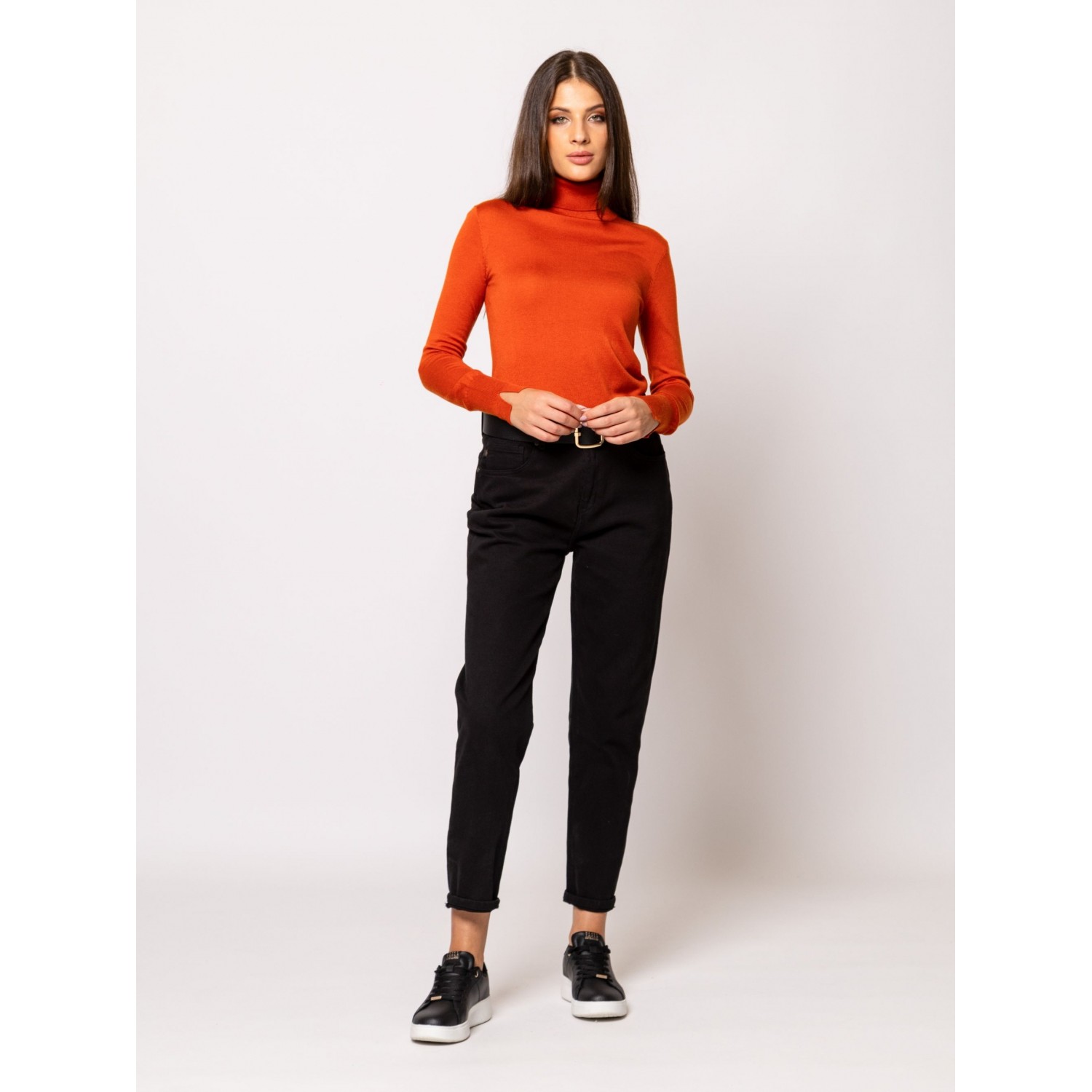 Női finom kötött garbó, egyenes fazonnal, garbó nyakkal, klasszikus őszi színekben, kis fém márkajelzéssel az eleje alján. Anyaga: 65% akril, 20% lyocell, 10% gyapjú, 5% selyem. A modell 175 cm magas és S-es méretet visel.
