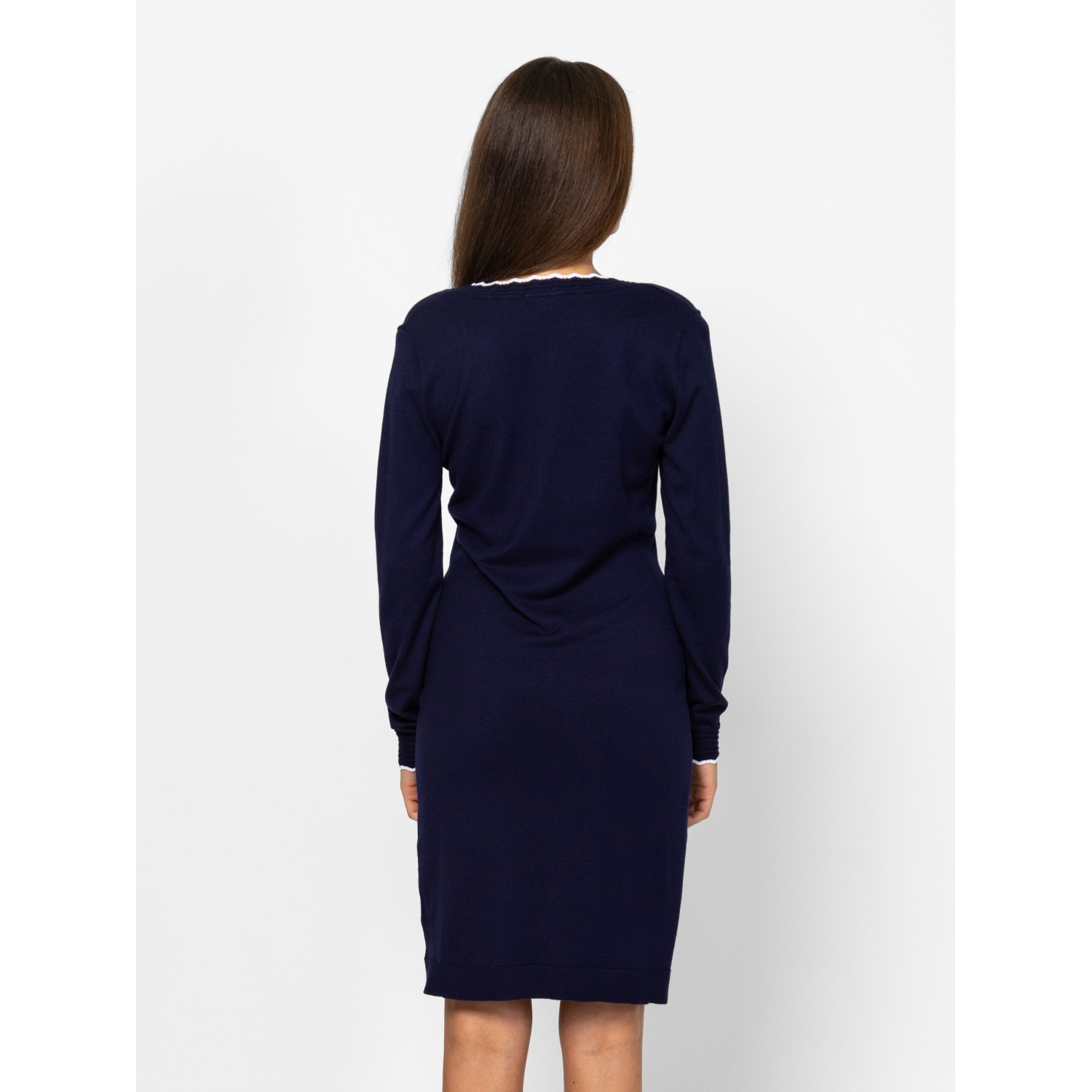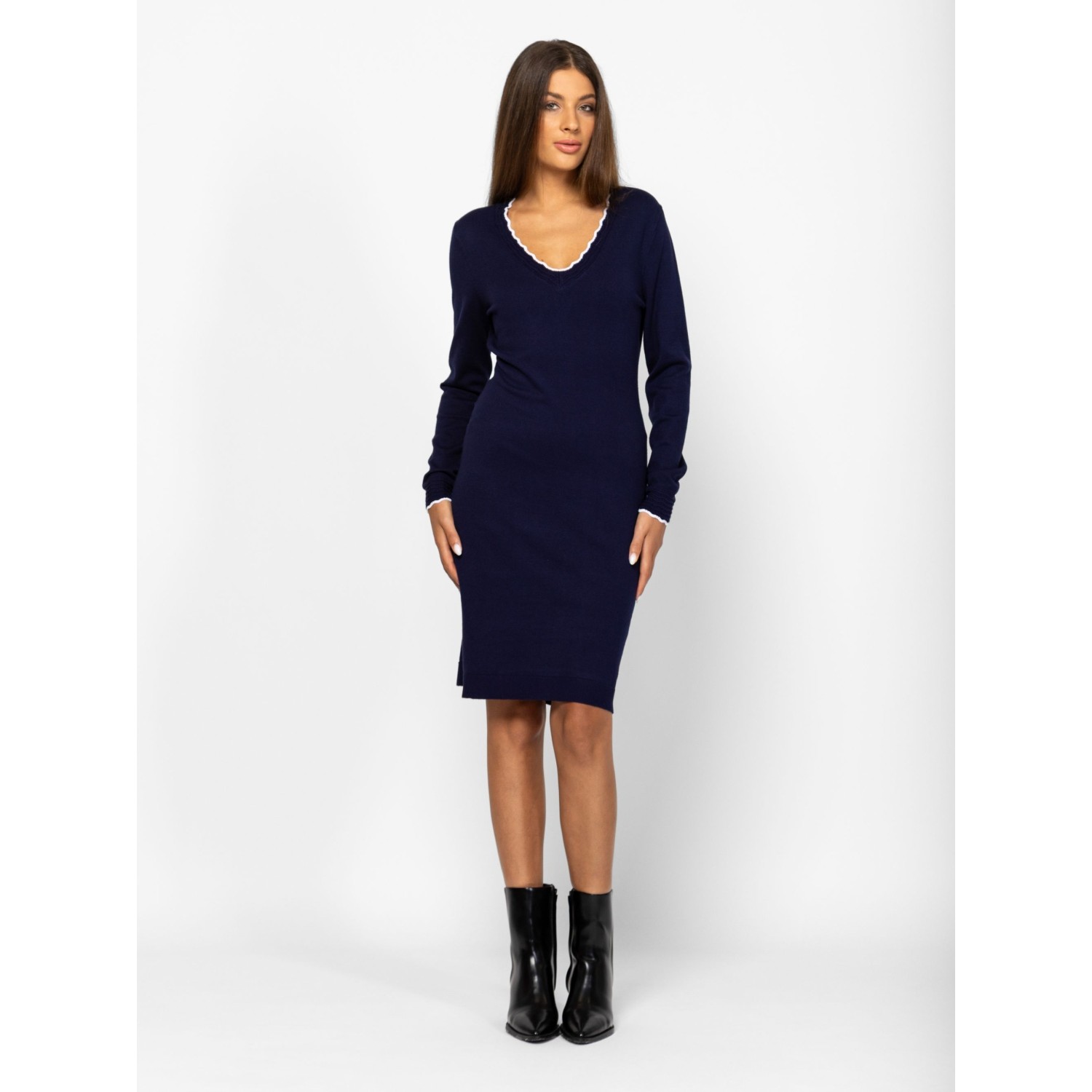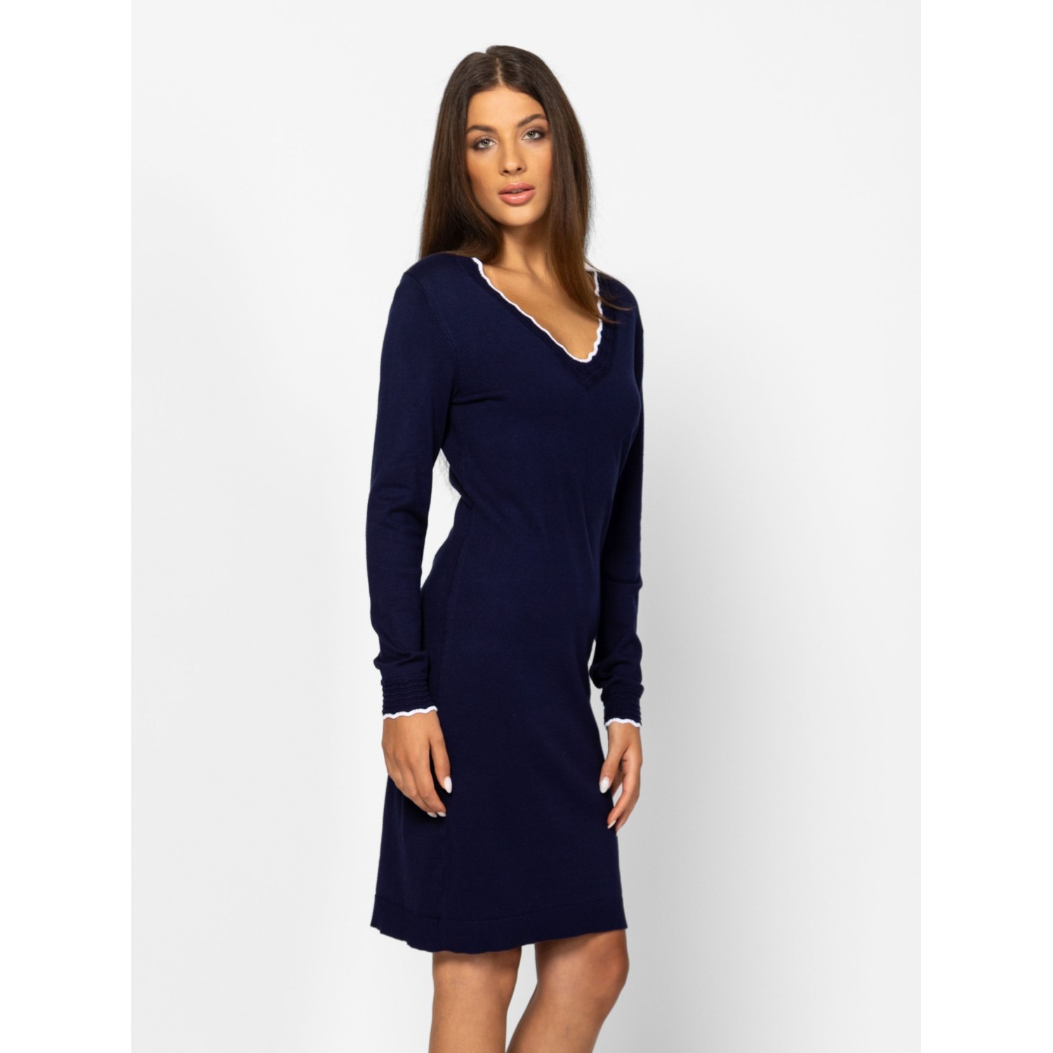 Női finom kötött ruha, nőies vonalvezetéssel, térd fölött érő hosszal, v-nyakkivágással, bordás fodros nyakkal és kézelővel, kis fém márkajelzéssel az eleje alján. Anyaga: 75% viszkóz, 25% nylon, kötött anyag. A modell 175 cm magas és S-es méretet visel.