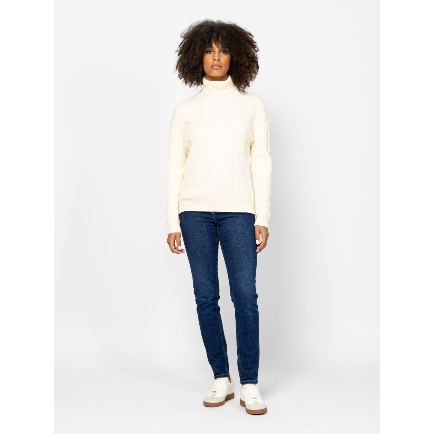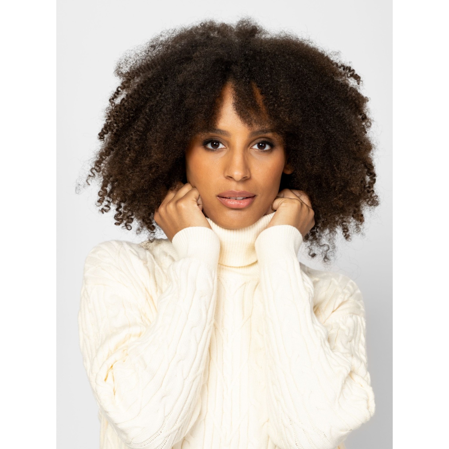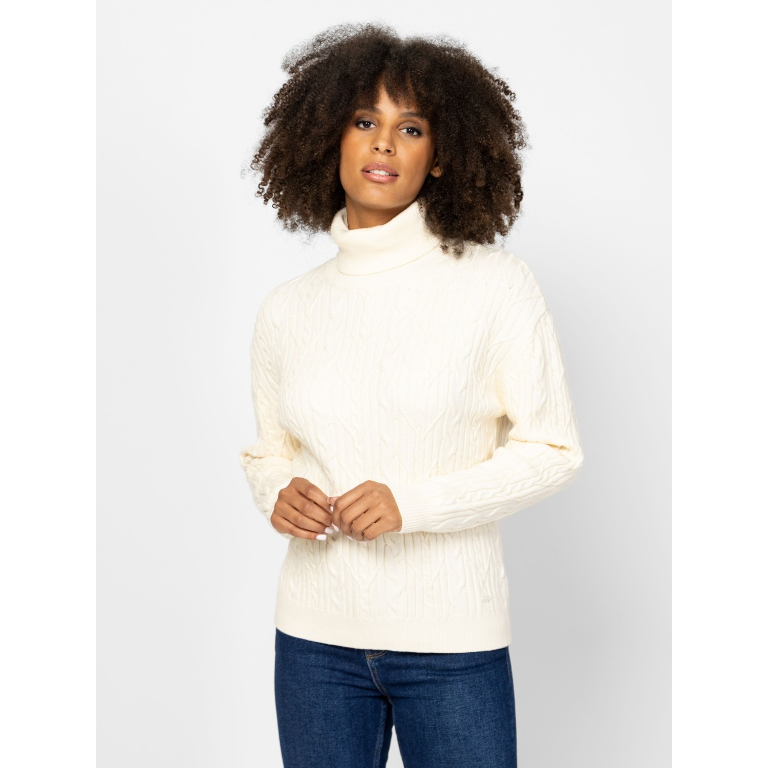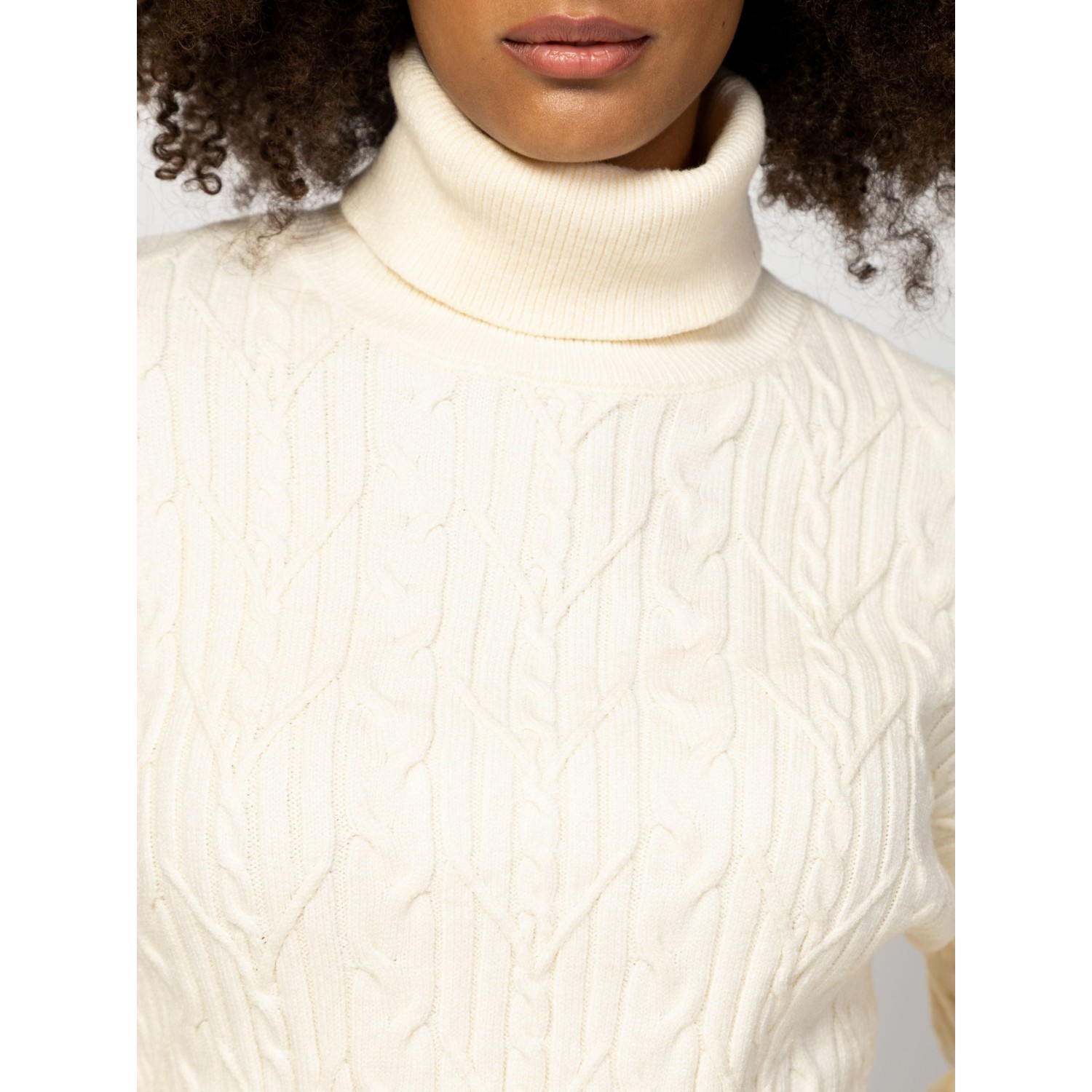 Női kötött, garbó nyakú pulóver, bővebb szabással, ejtett vállal, elején és ujján csavart mintával, kis műanyag márkajelzéssel az eleje alján. Anyaga: 49% viszkóz, 28% poliészter, 23% nylon, kötött anyag. A modell 175 cm magas és S-es méretet visel.