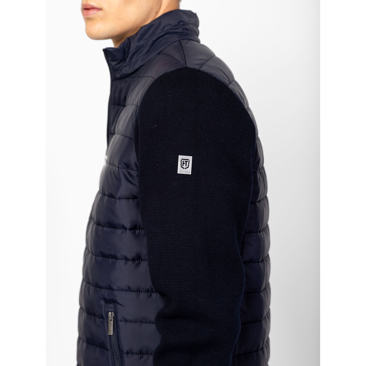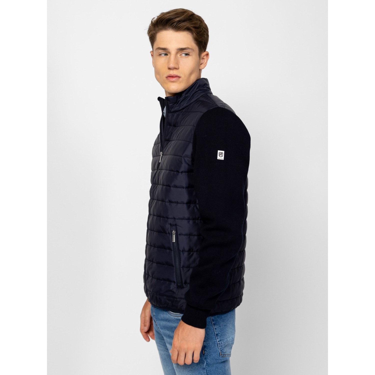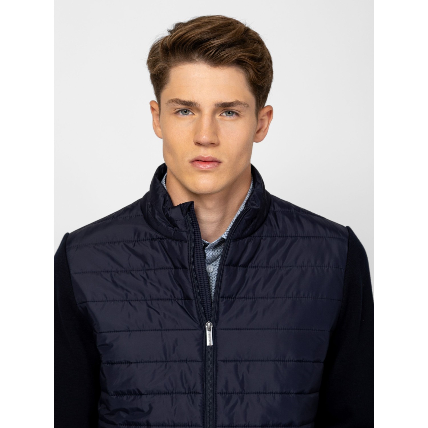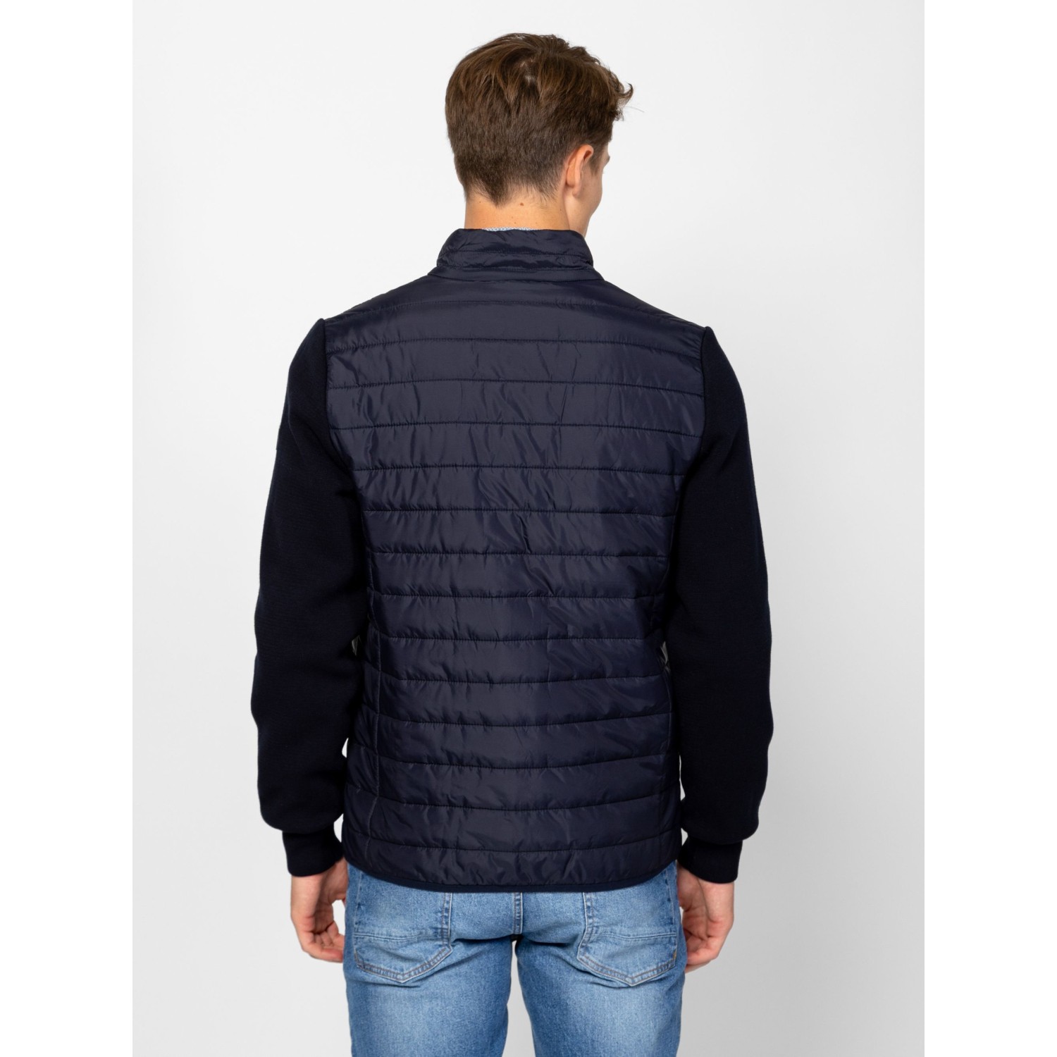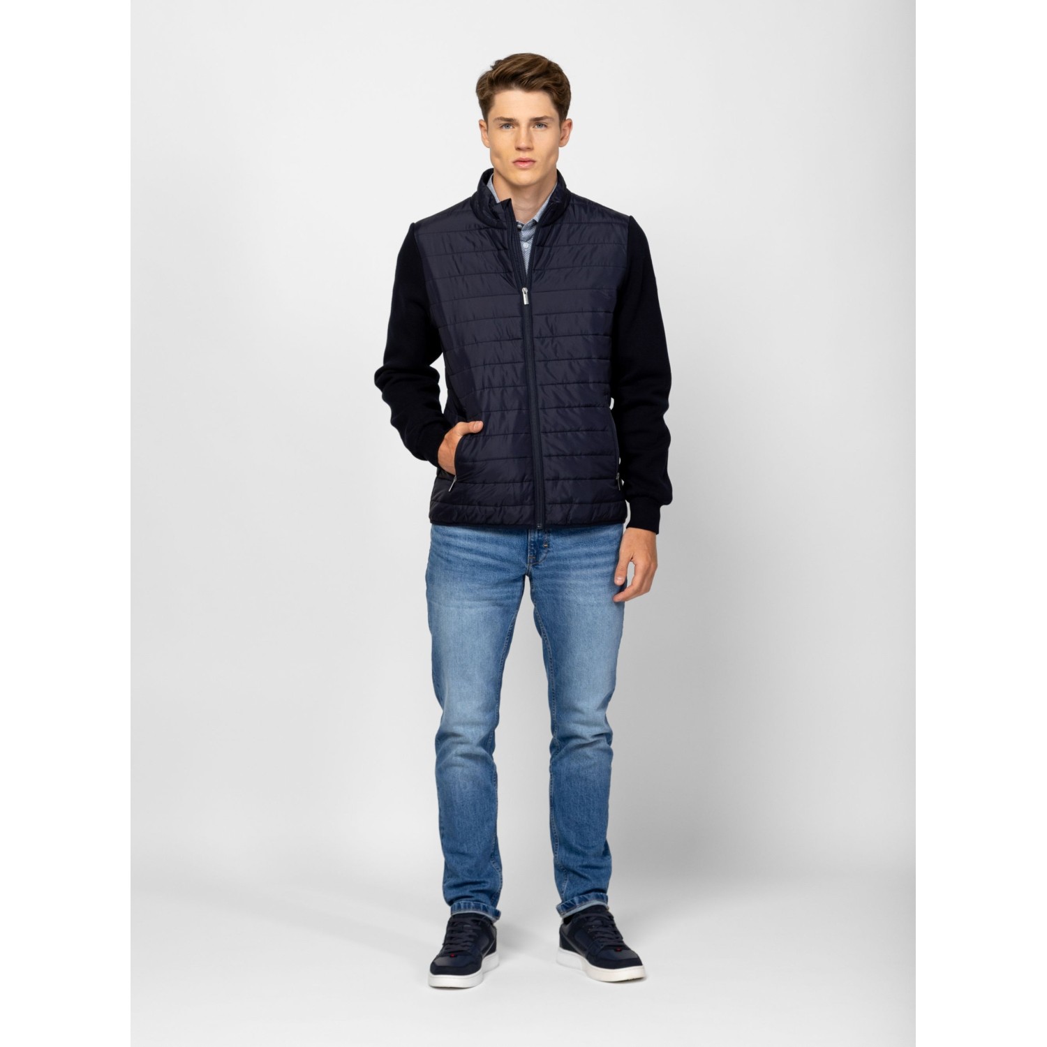 Férfi cipzáros kardigán, kötött és steppelt részletekkel, kényelmes szabással, steppelt gallérral, elejével és háttal, cipzáros zsebekkel, kis fém márkajelzéssel az ujján. Anyaga: eleje, háta, gallér: 100% nylon, tömés: 100% poliészter, lightweight, ujjak: 100% pamut, kötött anyag. A modell 188 cm magas és L-es méretet visel.