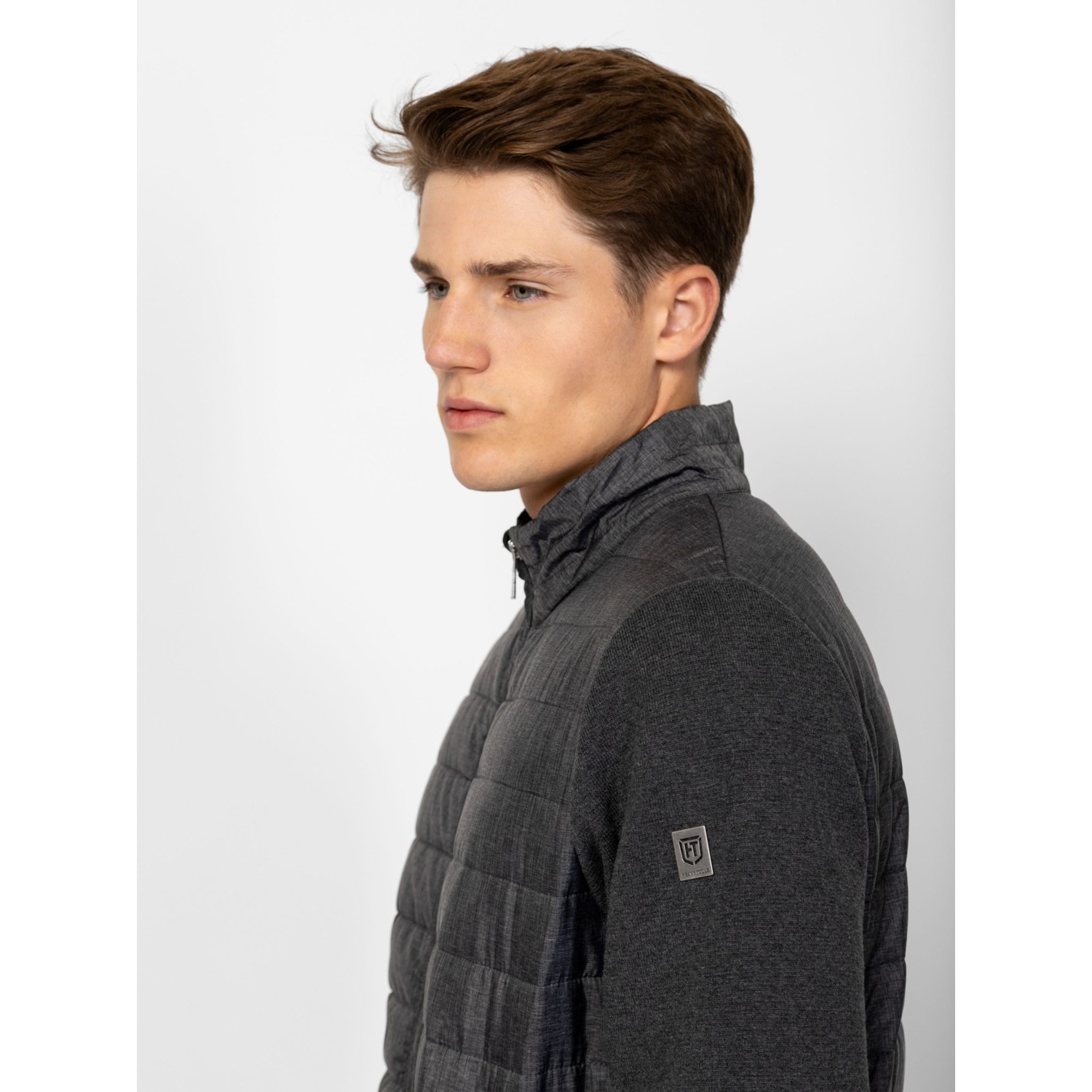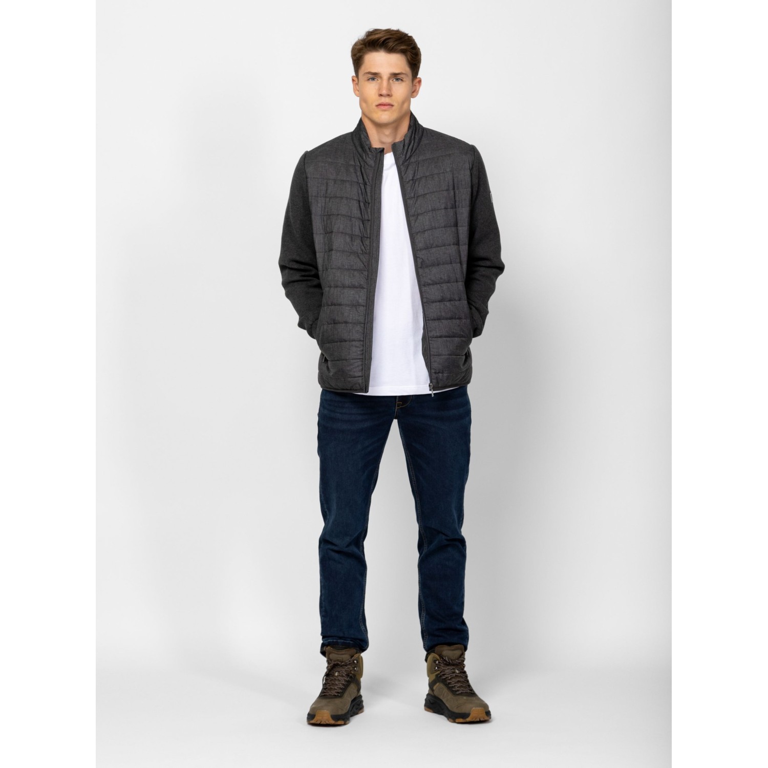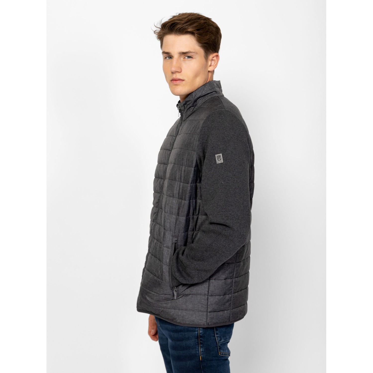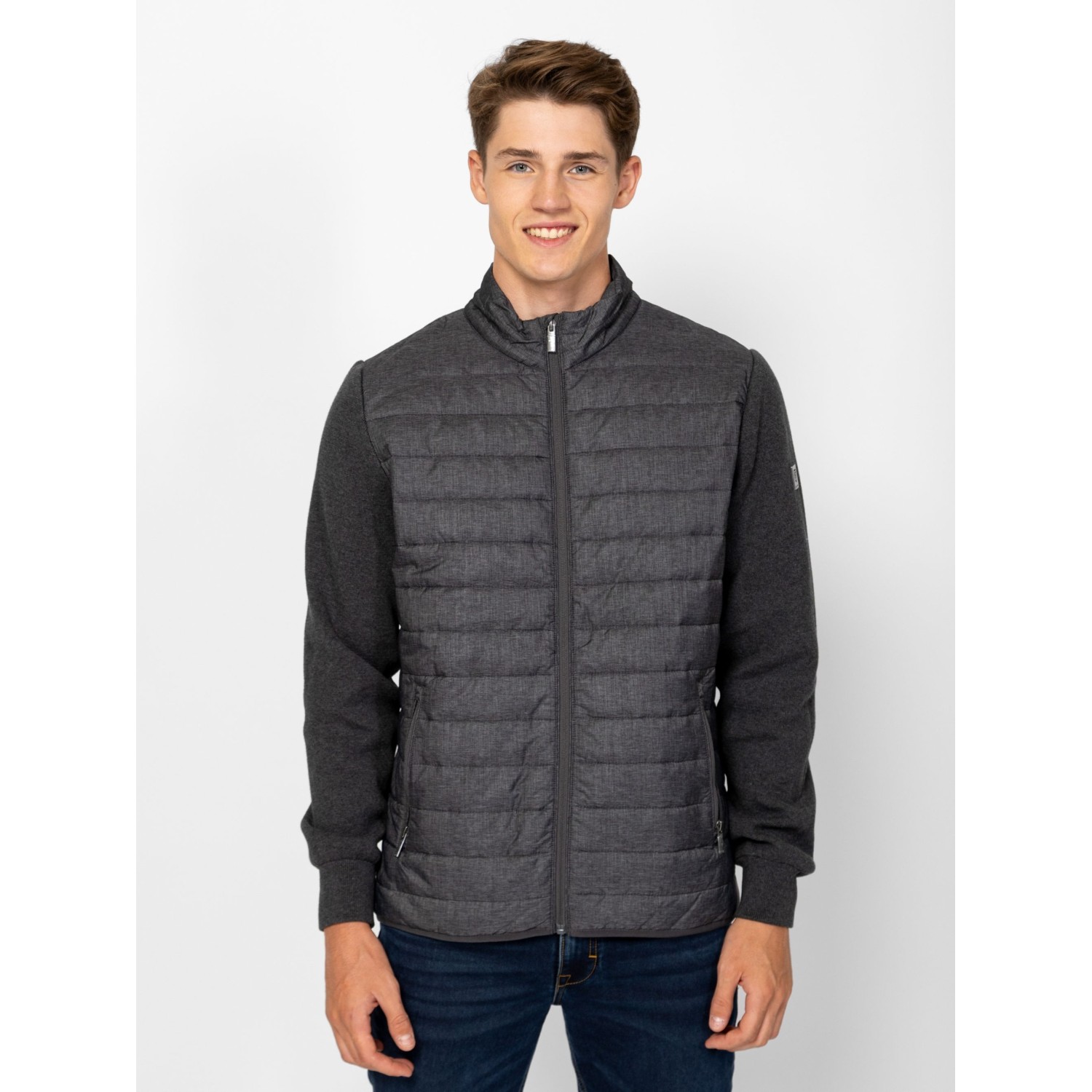 Férfi cipzáros kardigán, kötött és steppelt részletekkel, kényelmes szabással, steppelt gallérral, elejével és háttal, cipzáros zsebekkel, kis fém márkajelzéssel az ujján. Anyaga: eleje, háta, gallér: 100% nylon, tömés: 100% poliészter, lightweight, ujjak: 100% pamut, kötött anyag. A modell 188 cm magas és L-es méretet visel.