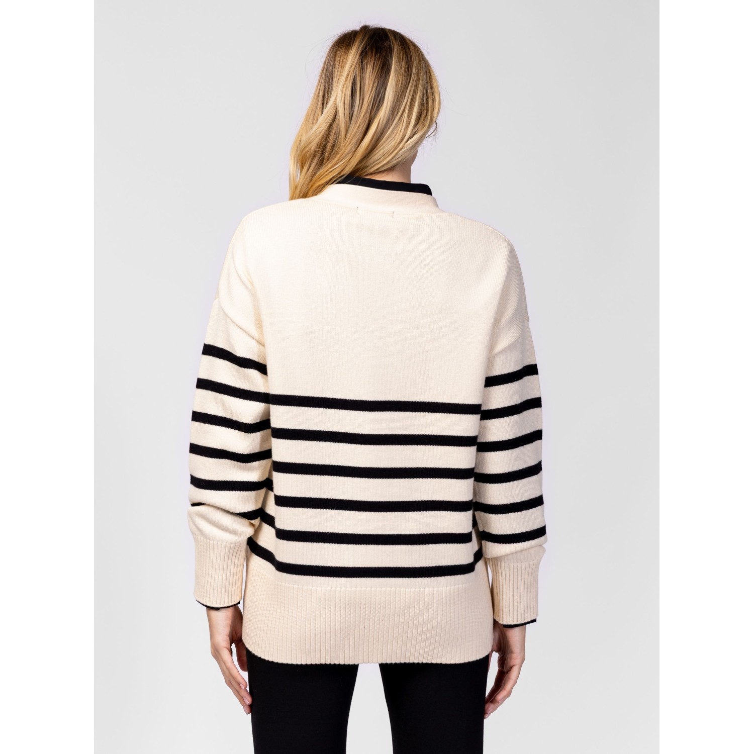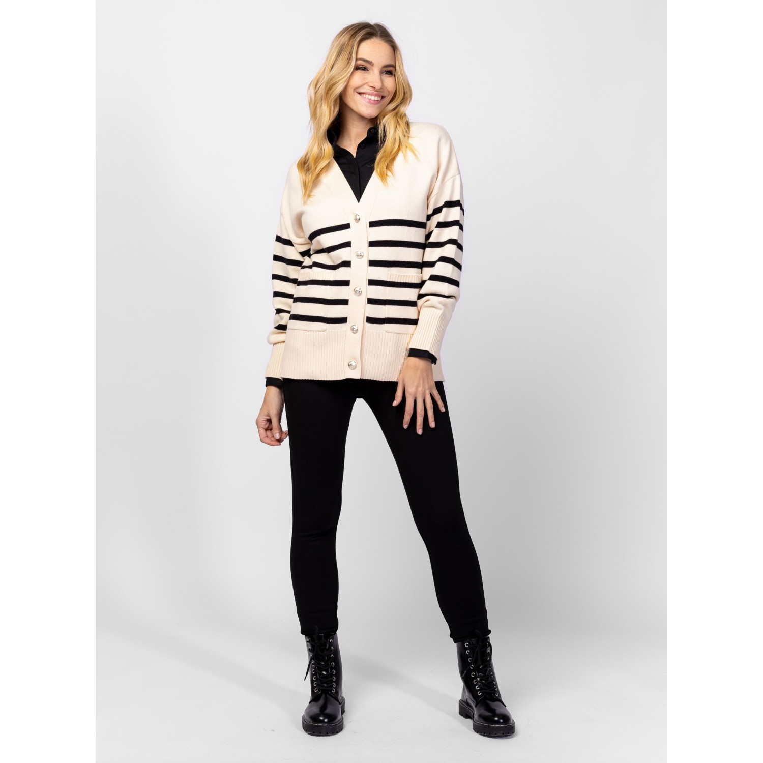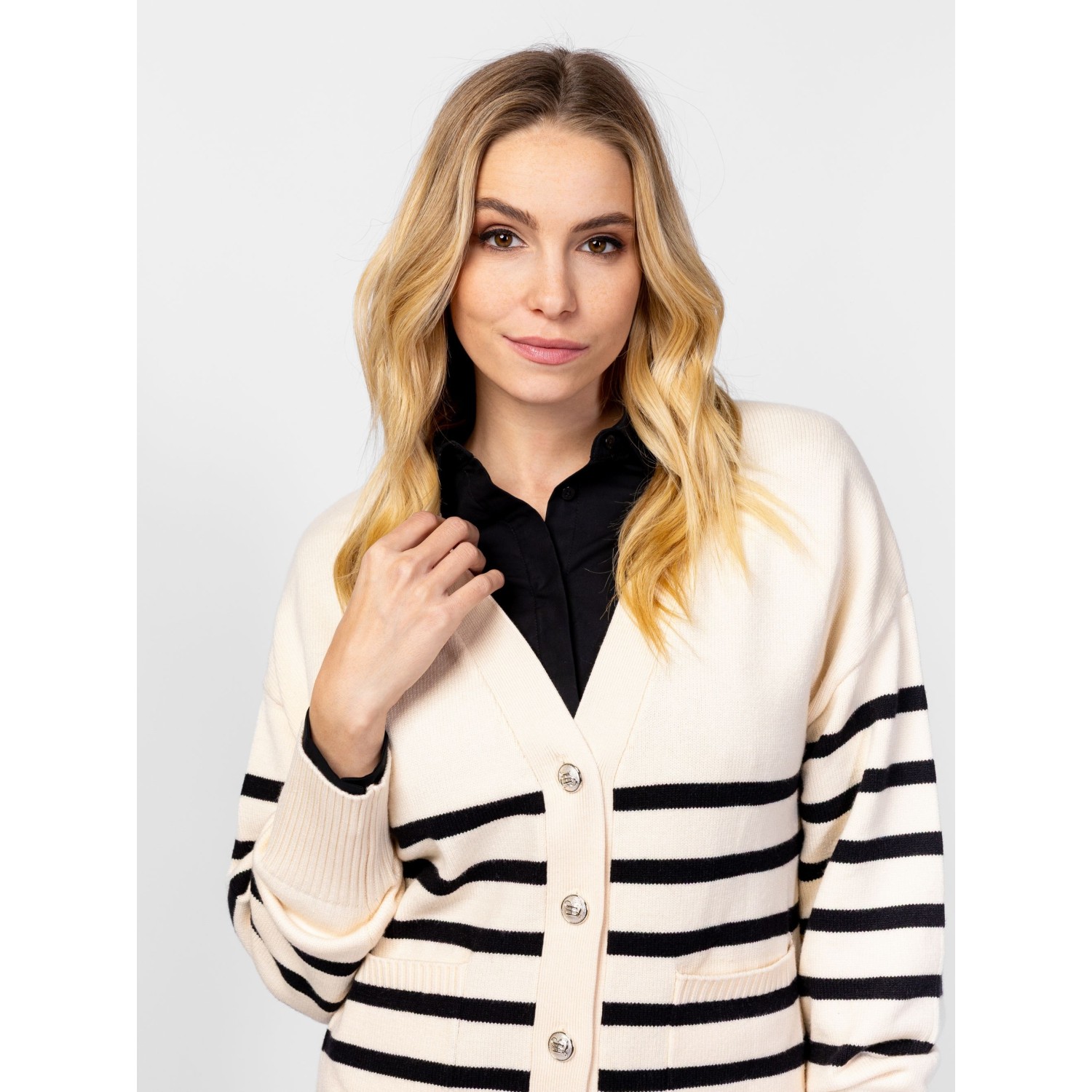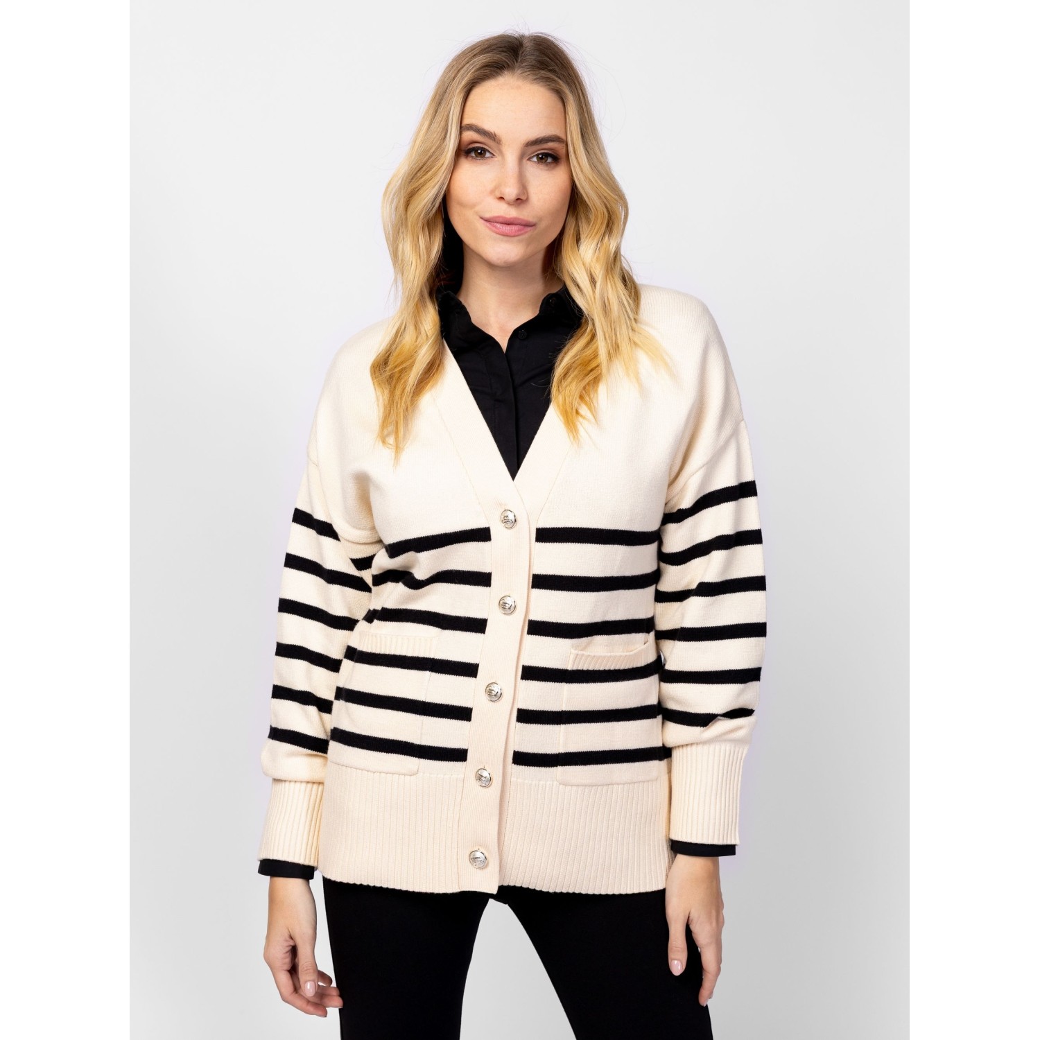 Női finom kötött kardigán, bővebb fazonnal, ejtett vállal, elegáns csíkozással, v-nyakkal, elején zsebekkel, dekoratív, logózott gombokkal. Anyaga: 49% viszkóz, 28% poliészter, 23% nylon, kötött anyag. A modell 175 cm magas és S-es méretet visel.