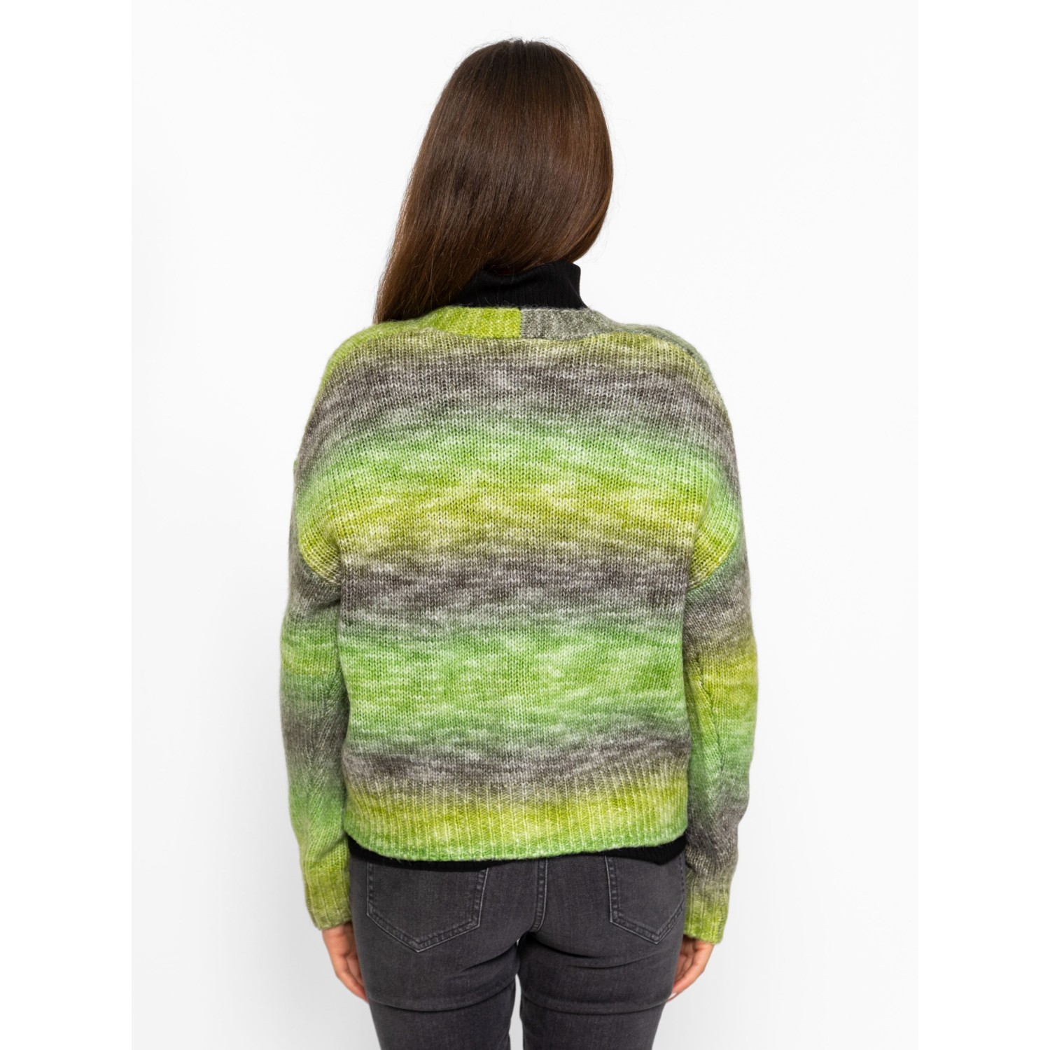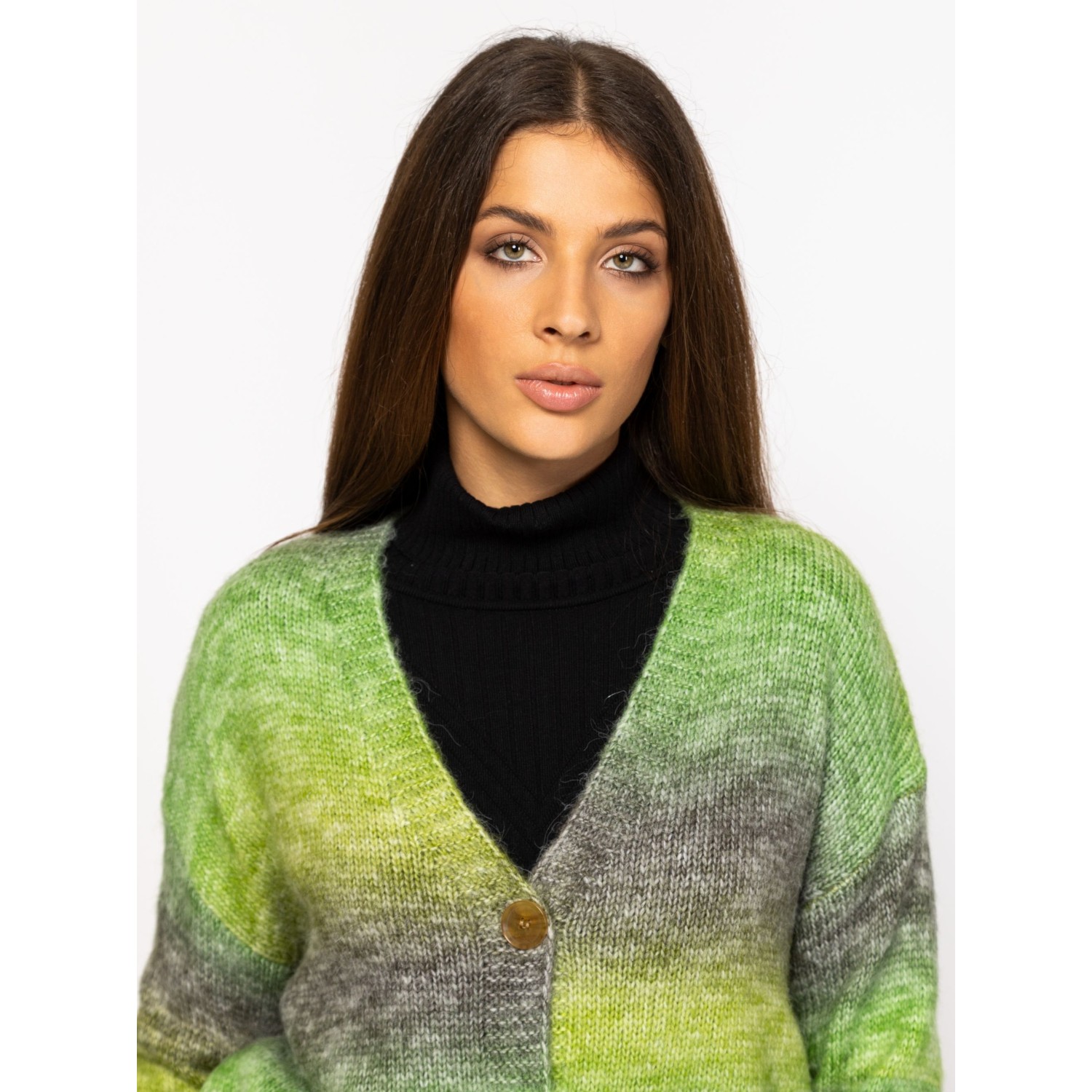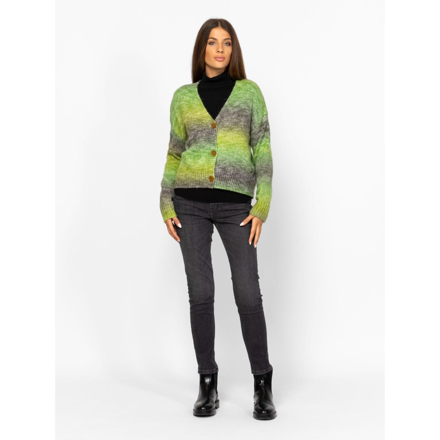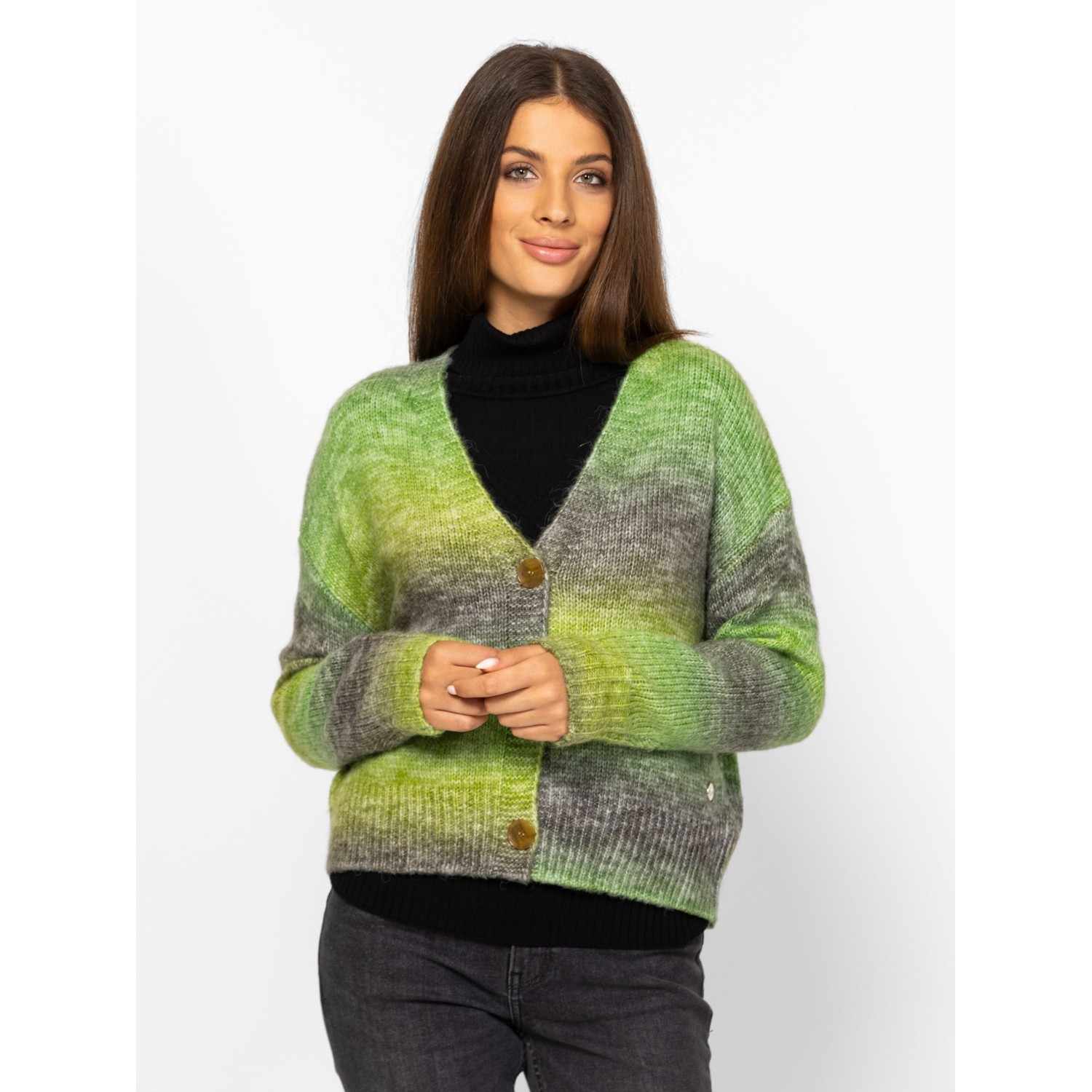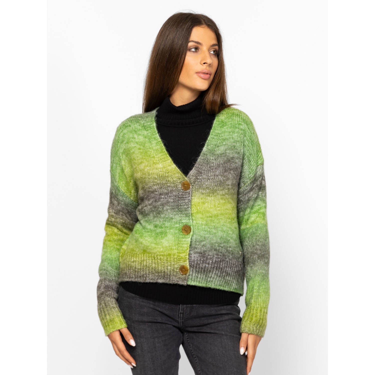 Női kötött kardigán bővebb, gombos fazonnal, ejtett vállal, színátmenetes kötéssel, v-nyakkal, kis fém márkajelzéssel az eleje alján. Anyaga: 58% akril, 29% poliészter, 9% nylon, 4% gyapjú, kötött anyag. A modell 175 cm magas és S-es méretet visel.