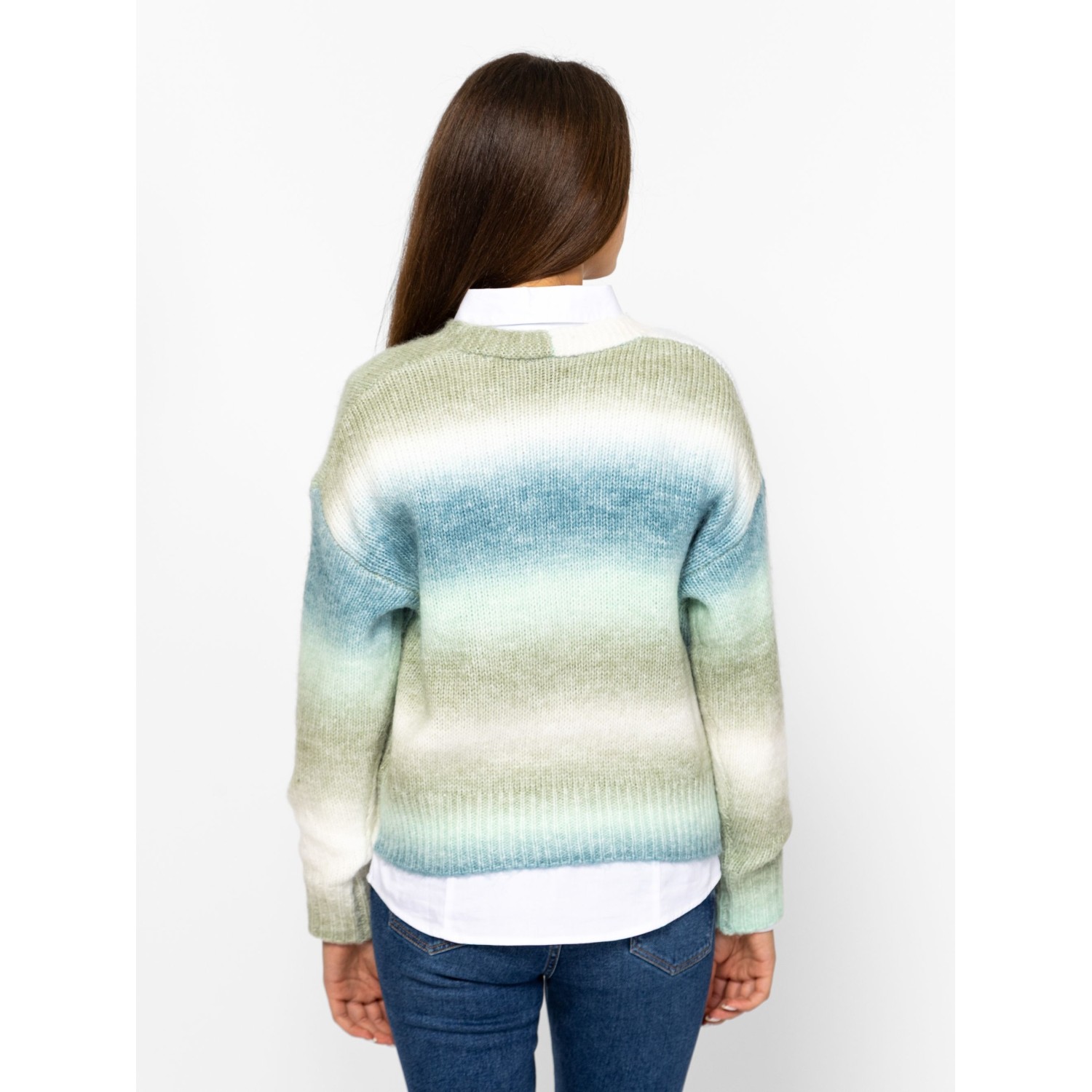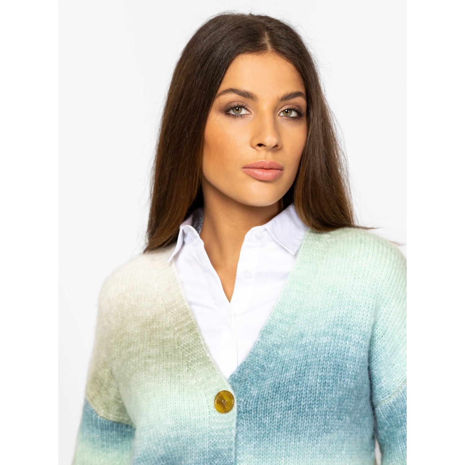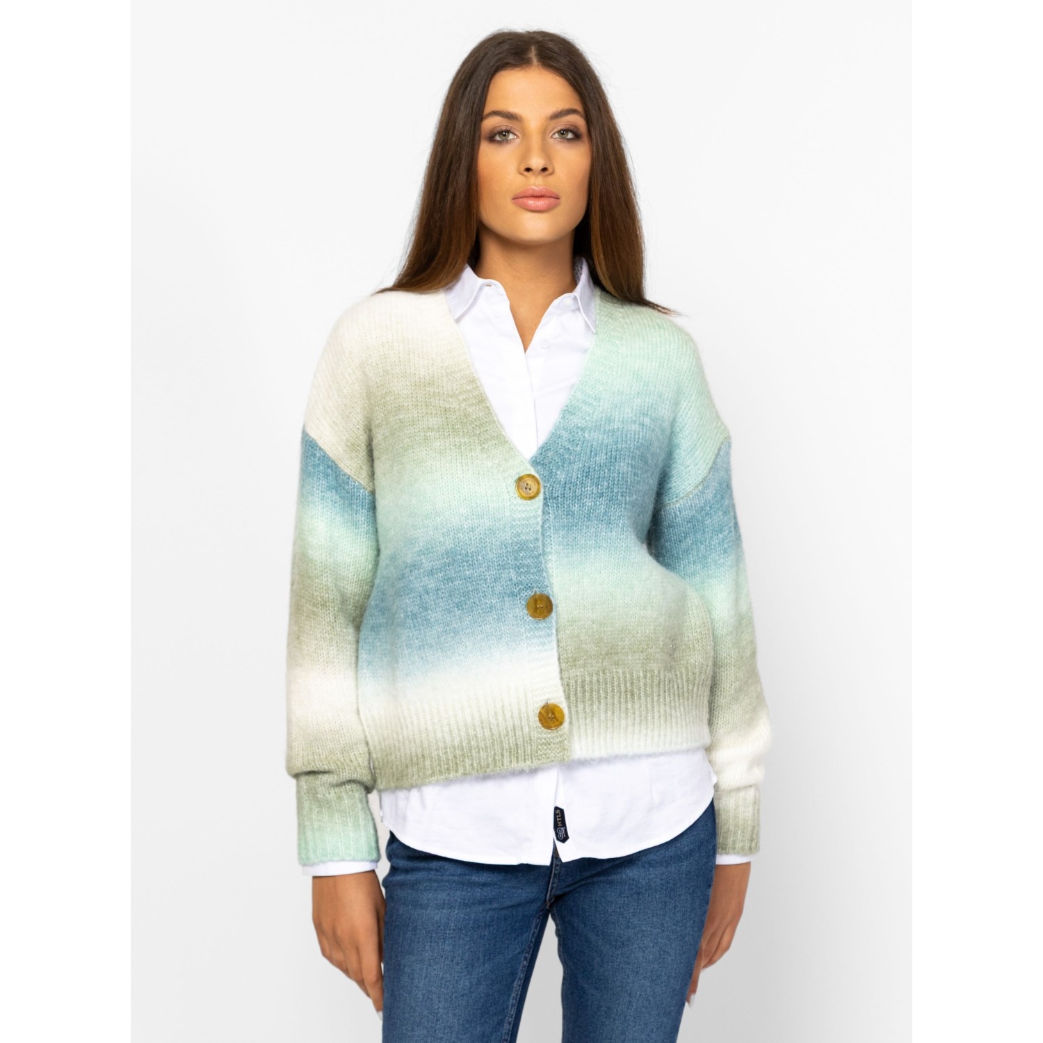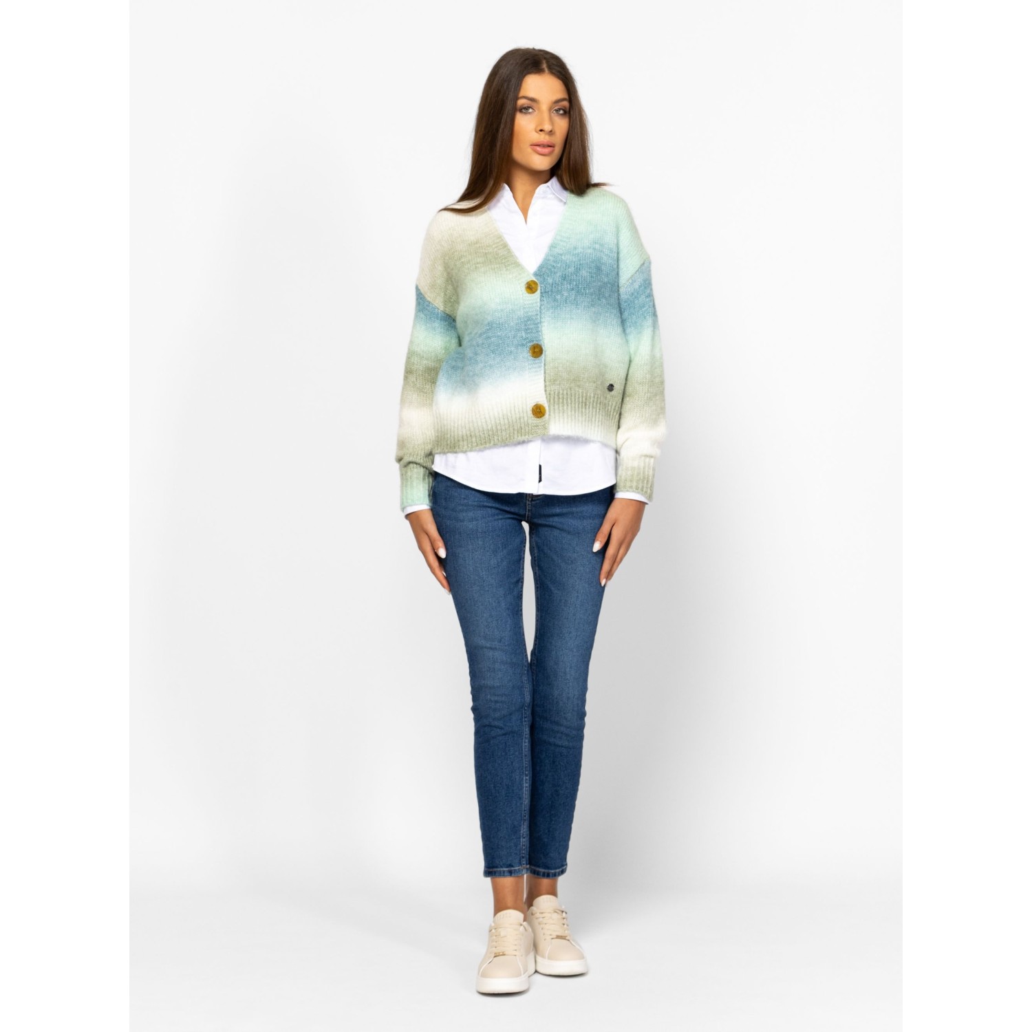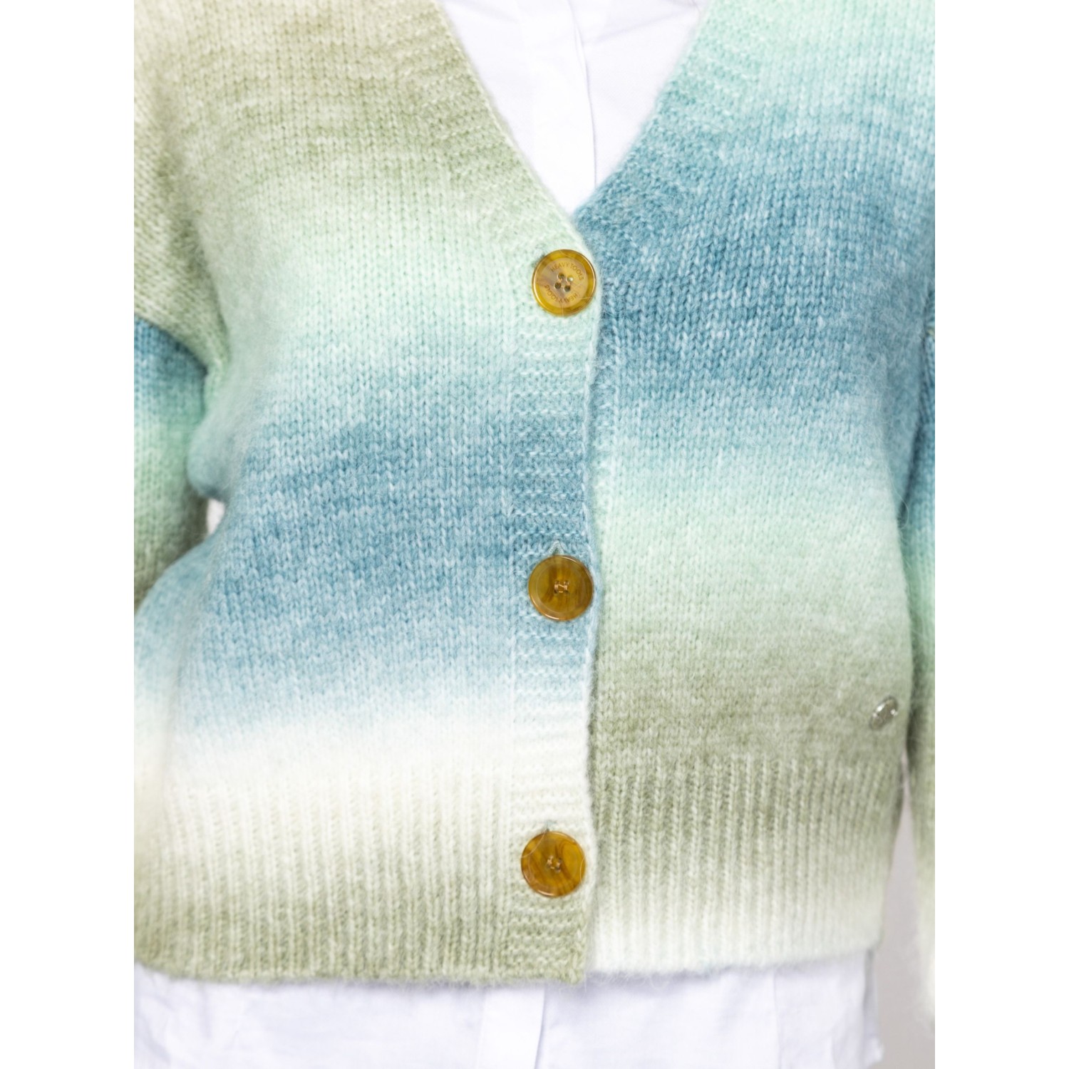 Női kötött kardigán bővebb, gombos fazonnal, ejtett vállal, színátmenetes kötéssel, v-nyakkal, kis fém márkajelzéssel az eleje alján. Anyaga: 58% akril, 29% poliészter, 9% nylon, 4% gyapjú, kötött anyag. A modell 175 cm magas és S-es méretet visel.