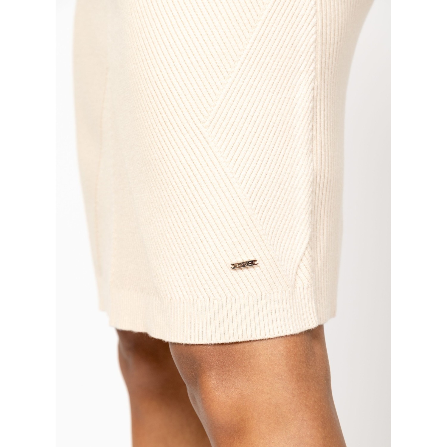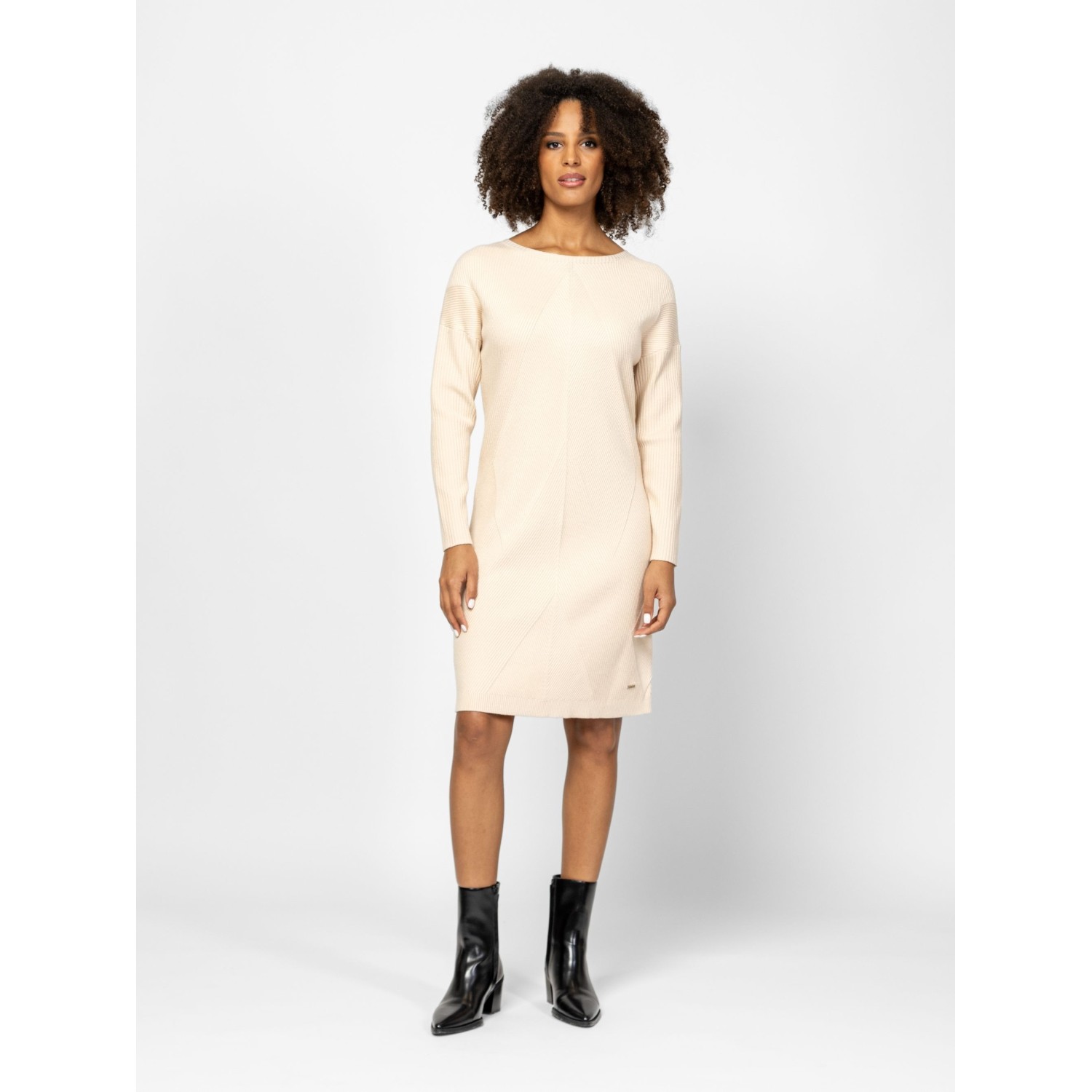 Női bordás kötött ruha, izgalmas mintázattal, egyenes szabással, ejtett vállal, térdig érő hosszal, kerek nyakkal, eleje alján kis fém márkajelzéssel. Anyaga: 49% viszkóz, 28% poliészter, 23% nylon, kötött anyag. A modell 175 cm magas és S-es méretet visel.