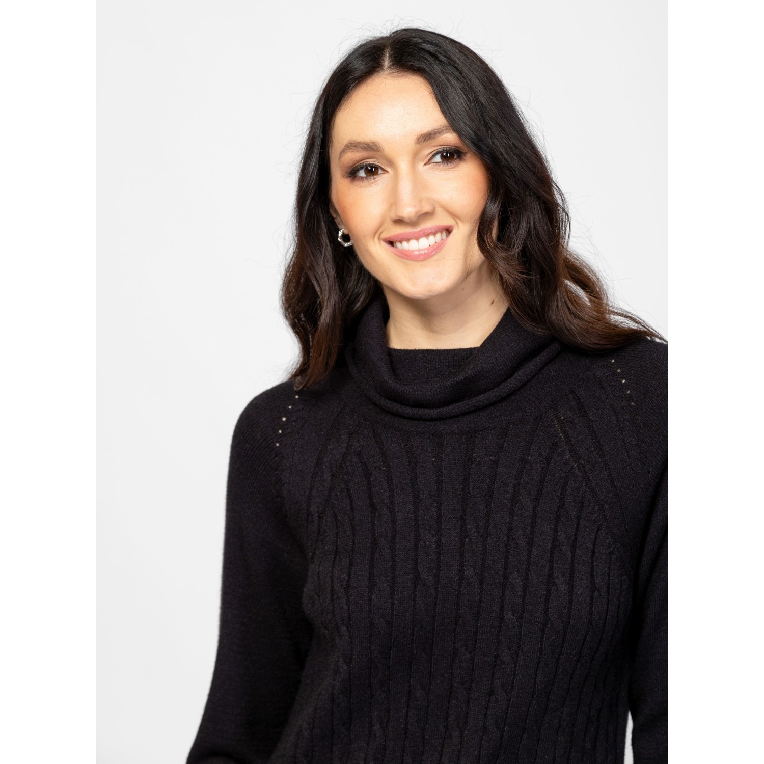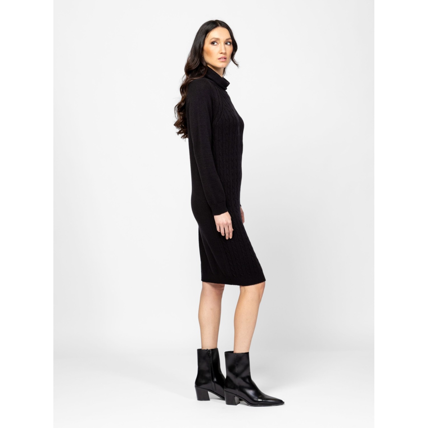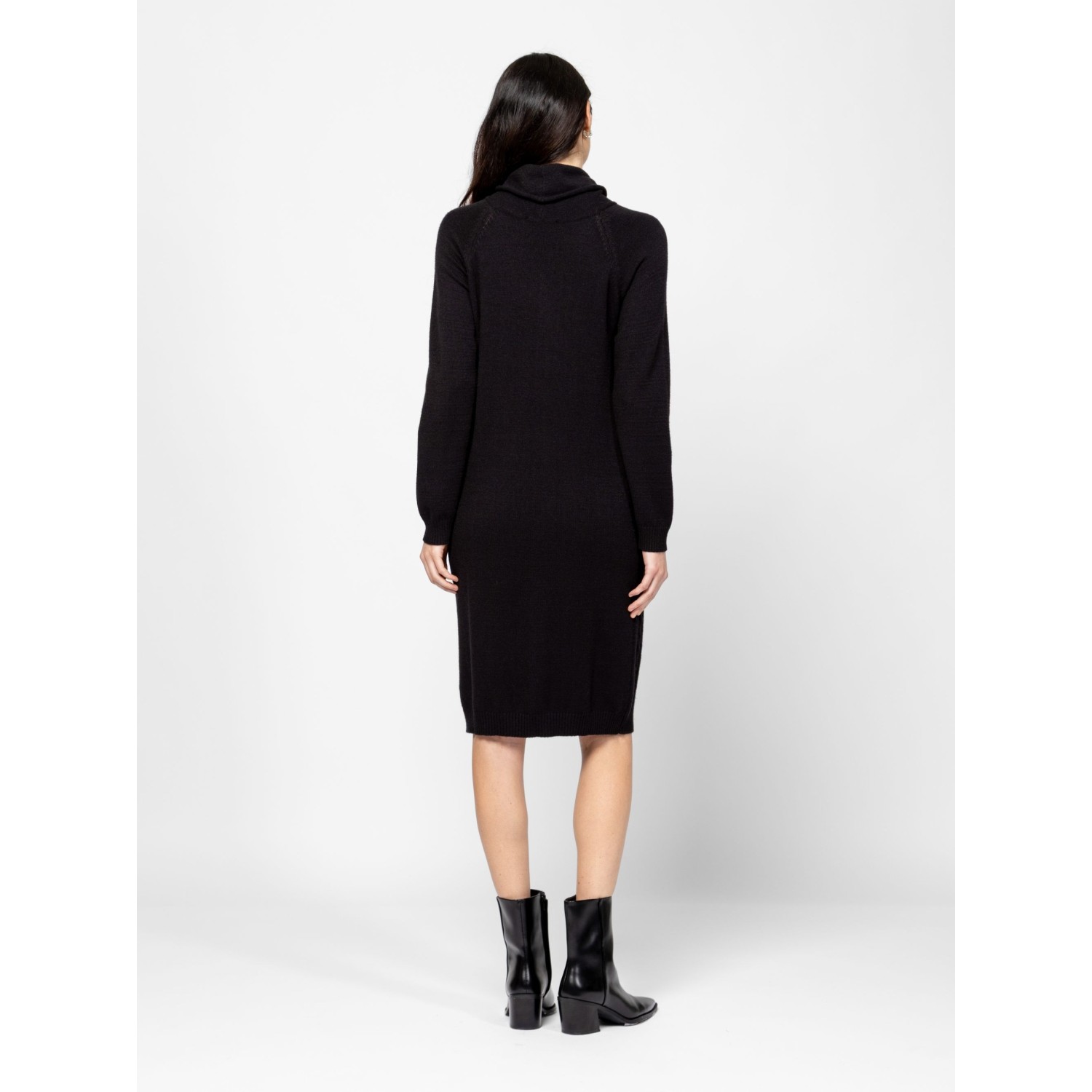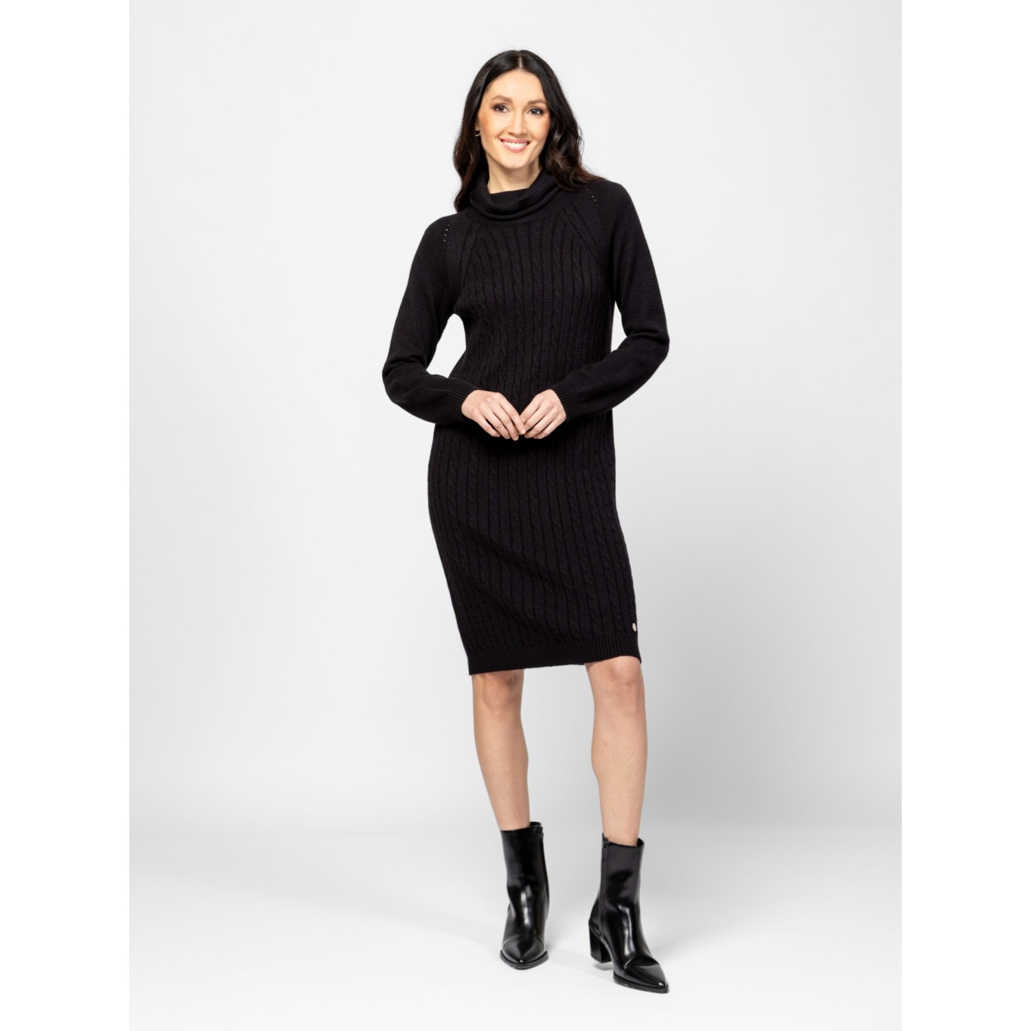 Női kötött ruha, nőies vonalvezetéssel, elején csavart mintával, térdig érő hosszal, raglán ujjal, garbó nyakkal, kis fém márkajelzéssel az alján. Anyaga: 49% viszkóz, 28% poliészter, 23% nylon, kötött anyag. A modell 175 cm magas és S-es méretet visel.