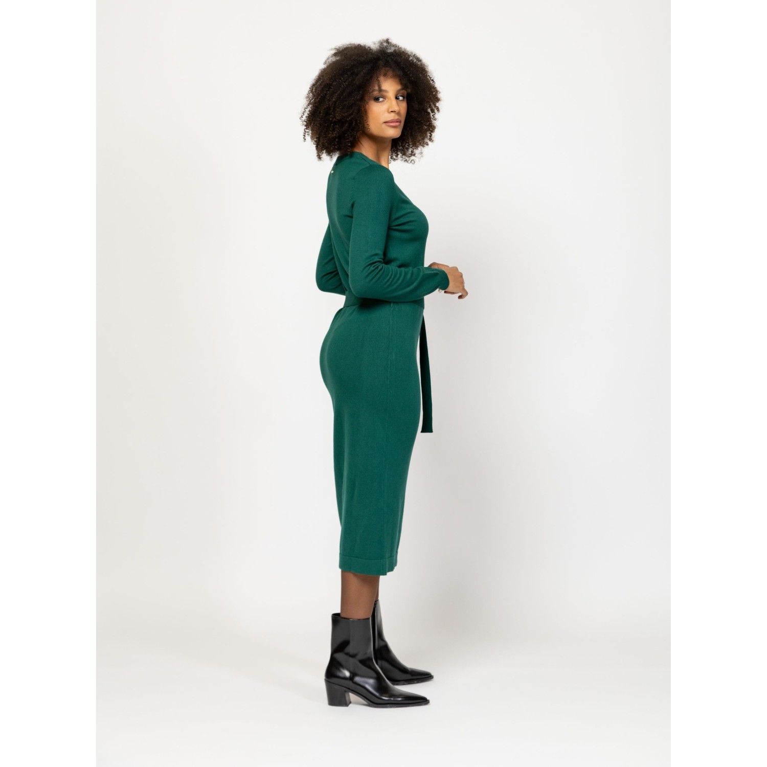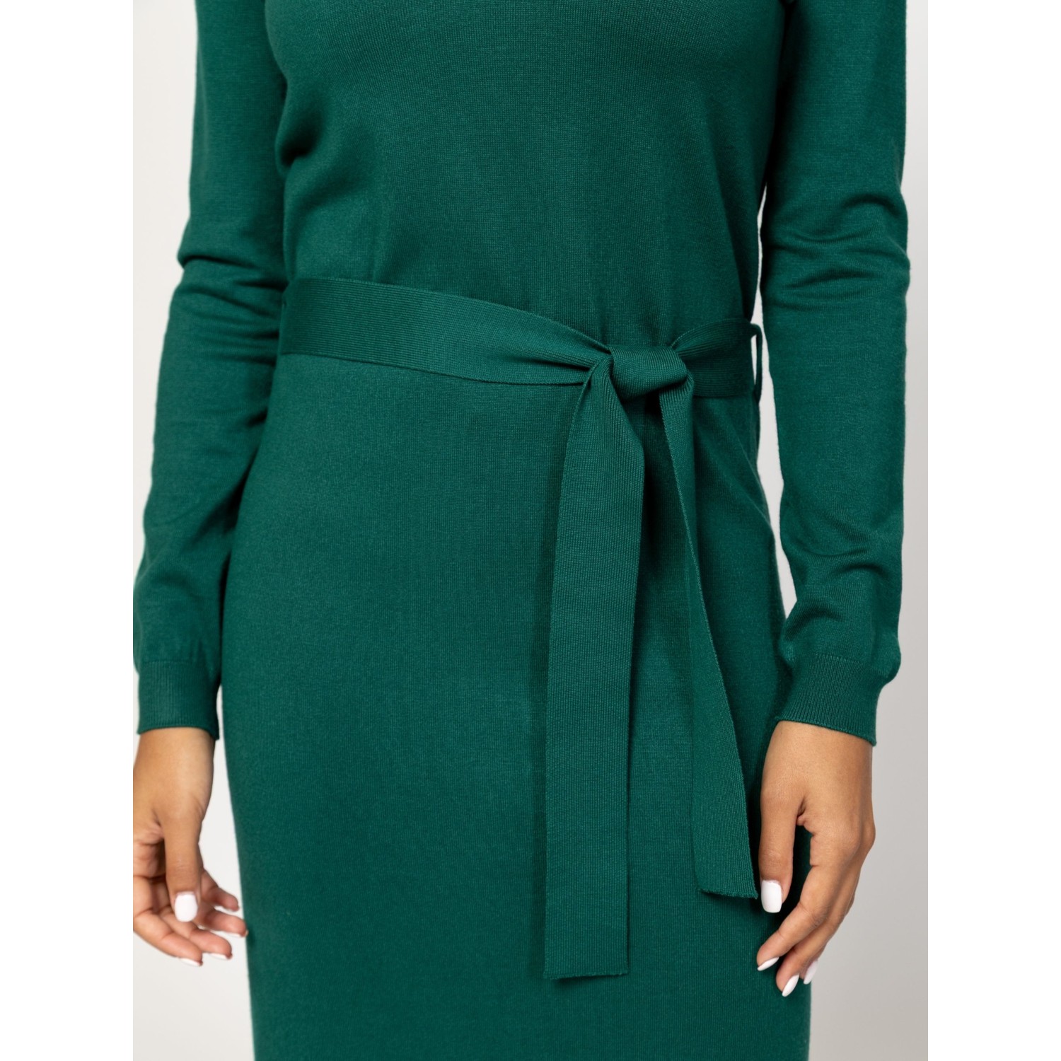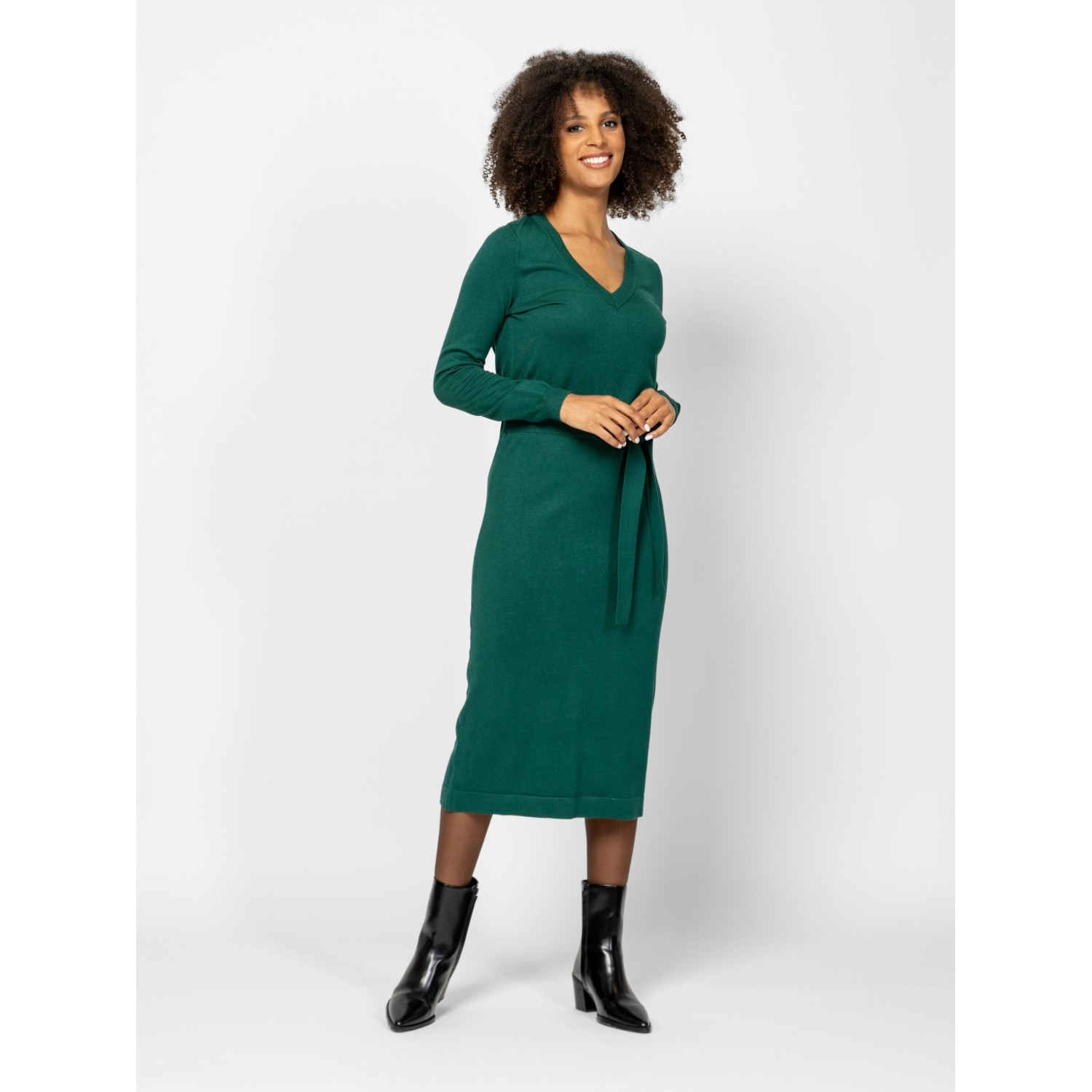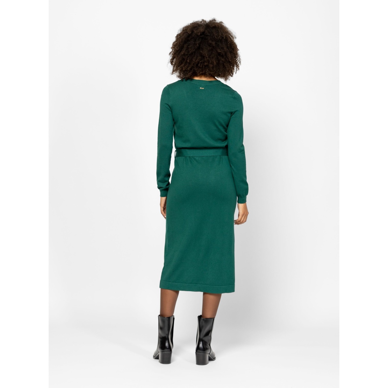 Női finom kötött ruha, nőies vonalvezetéssel, térd alatti hosszal, v-nyakkal, derekán övvel, kis fém márkajelzéssel a hátán. Anyaga: 75% viszkóz, 25% nylon, kötött anyag. A modell 175 cm magas és S-es méretet visel.