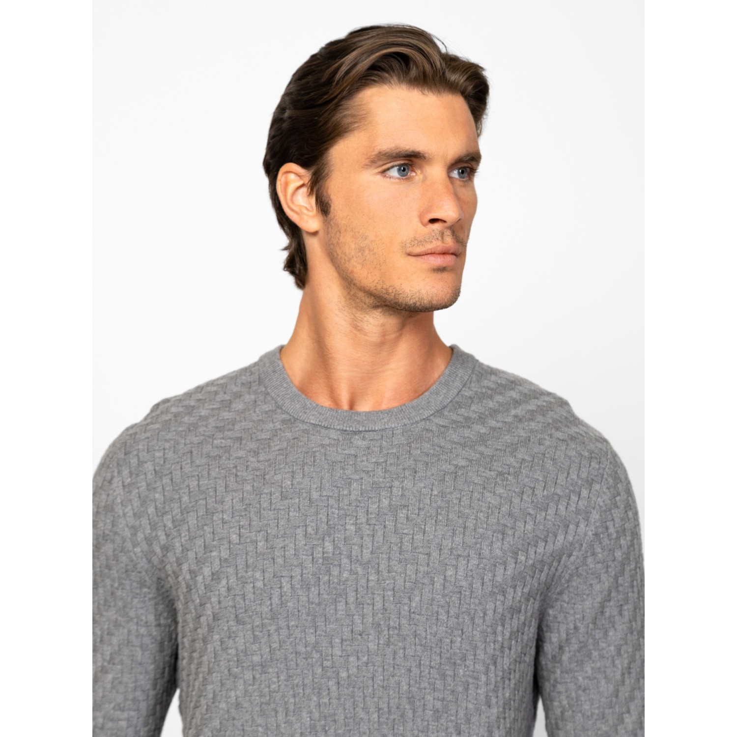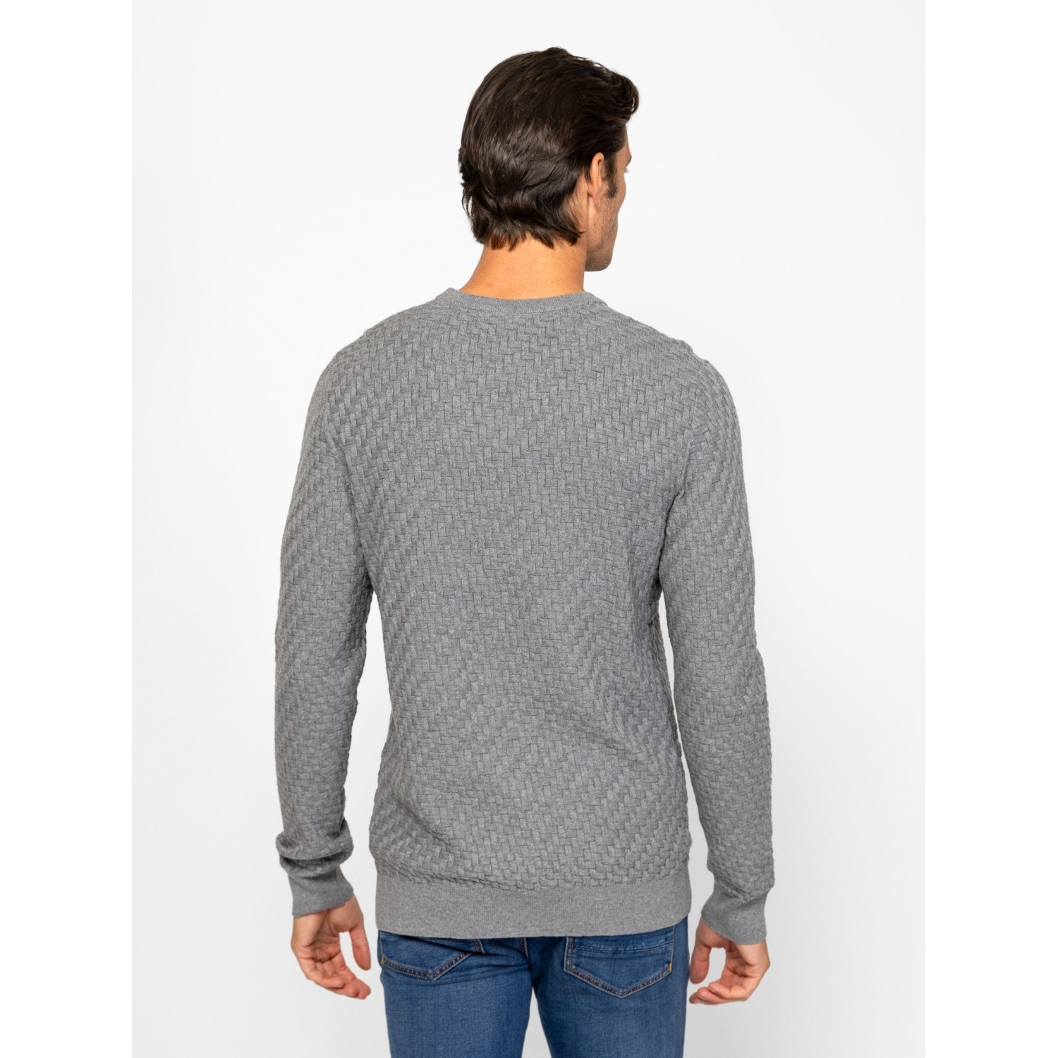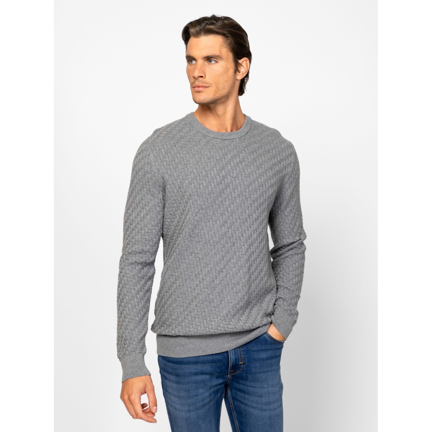 Férfi finom kötött pulóver, klasszikus szabással, stílusos kötésmintával, kerek nyakkal, bordás kötött kézelővel, nyakkal és aljjal, kis bőr márkajelzéssel az eleje alján. Anyaga: 100% pamut, kötött anyag. A modell 188 cm magas és L-es méretet visel.