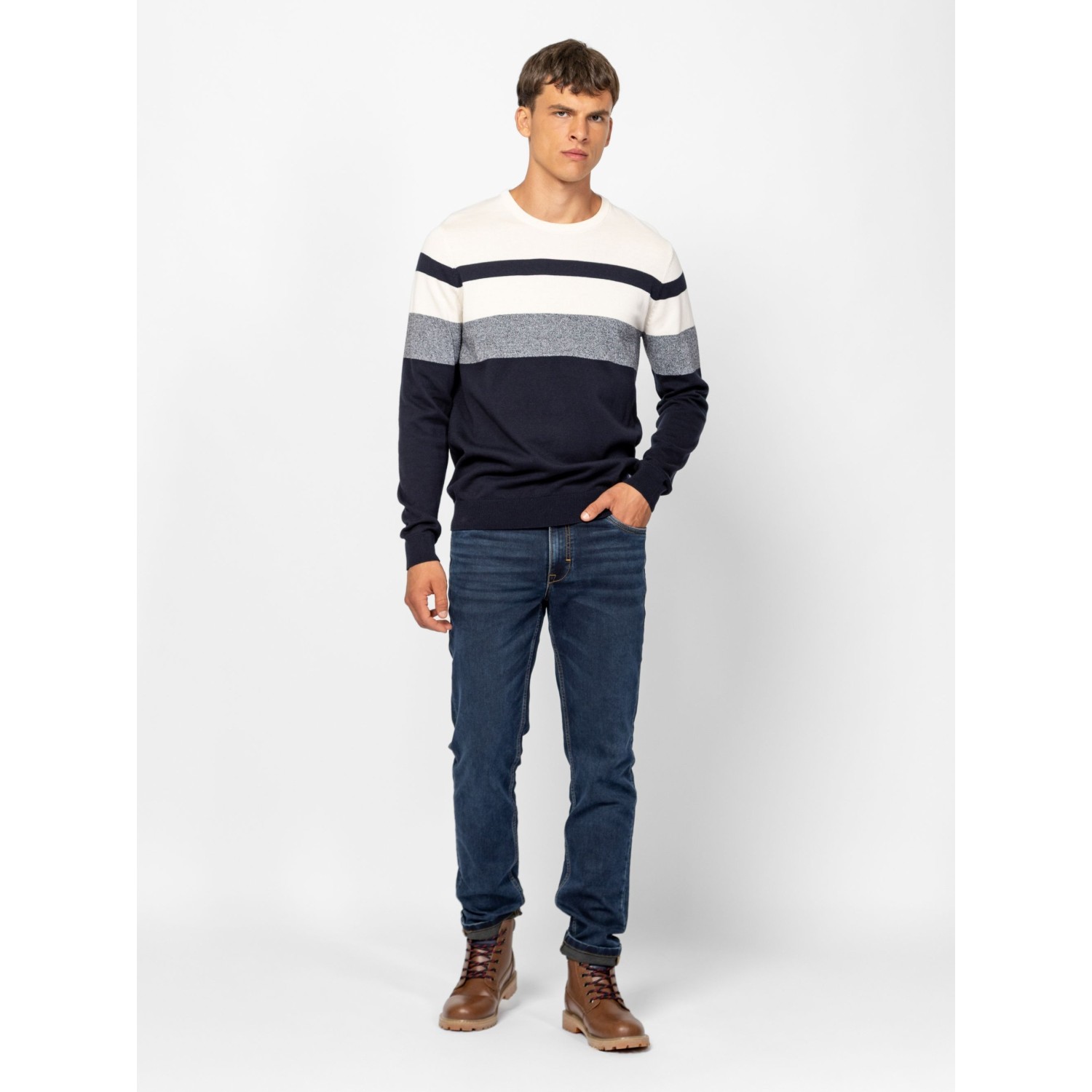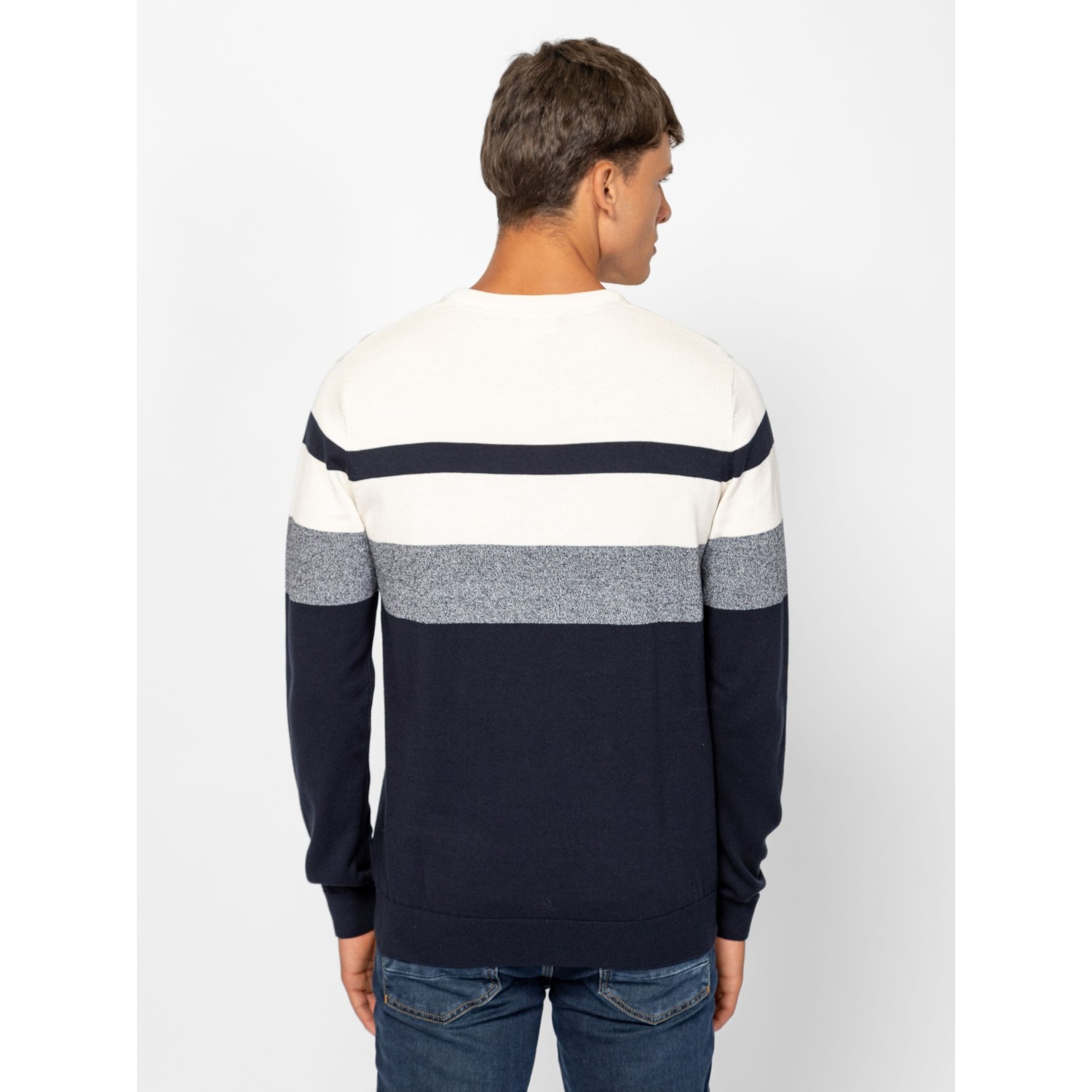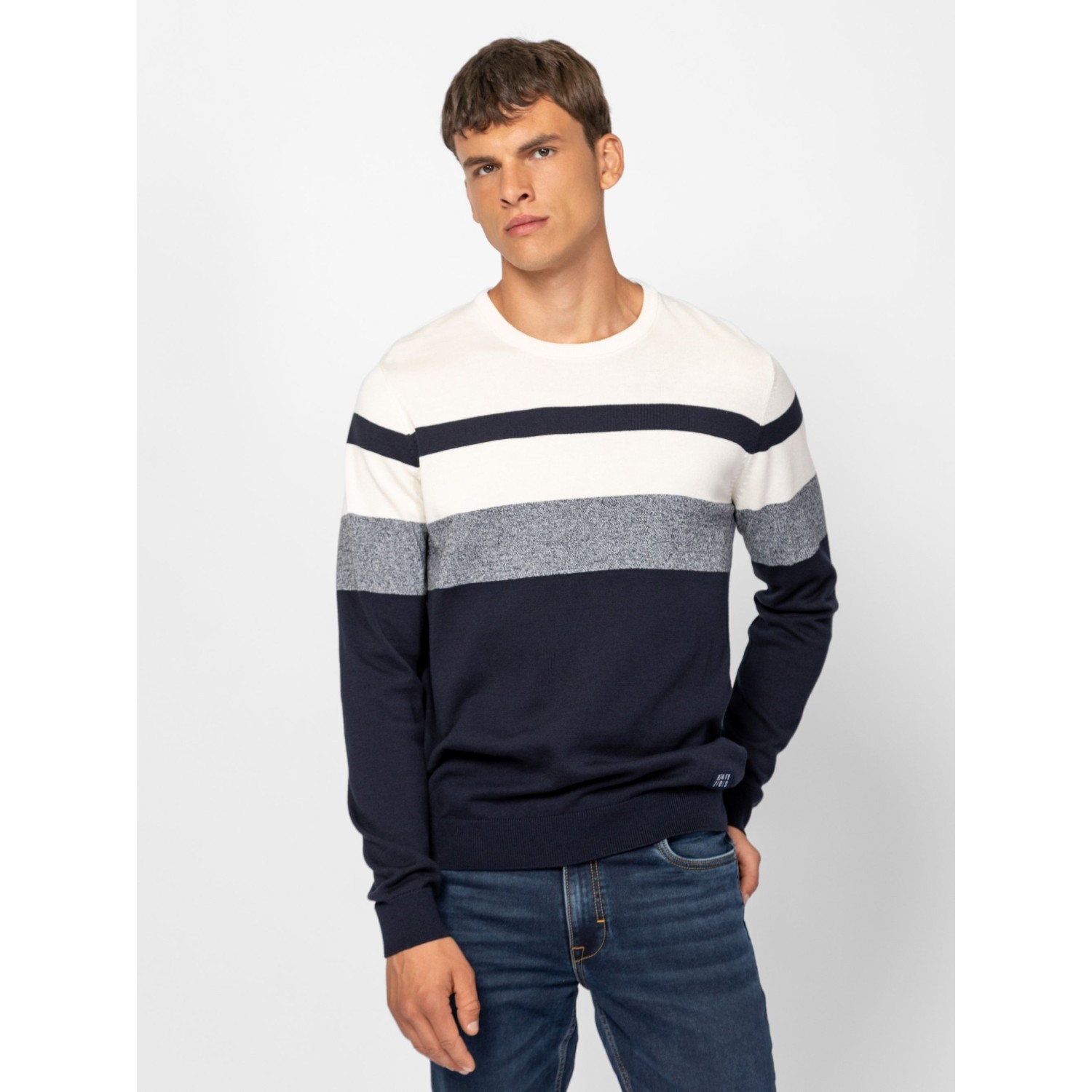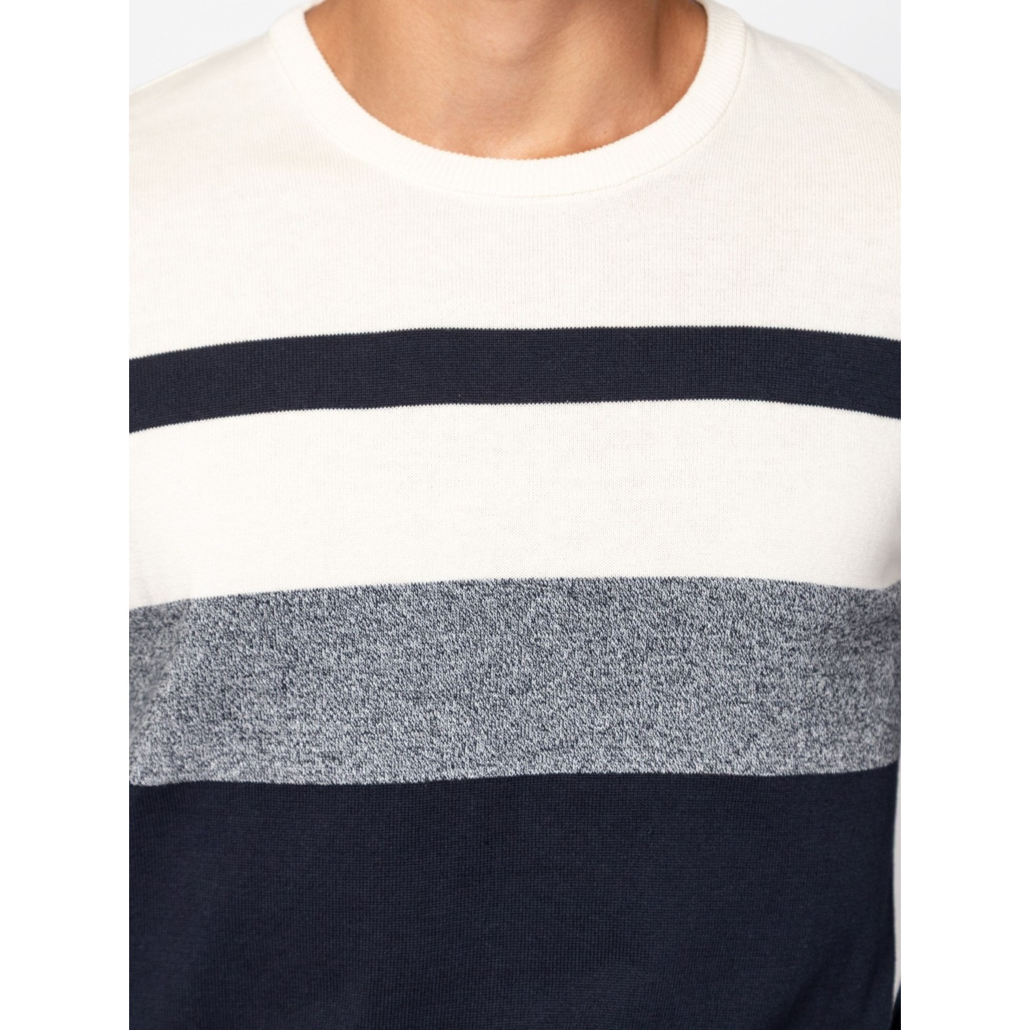Férfi finom kötött pulóver, klasszikus szabással, váll részen széles csíkozással, kerek nyakkal, bordás kötött kézelővel, nyakkal és aljjal, kis szövött márkajelzéssel az eleje alján. Anyaga: 100% pamut, kötött anyag. A modell 188 cm magas és L-es méretet visel.