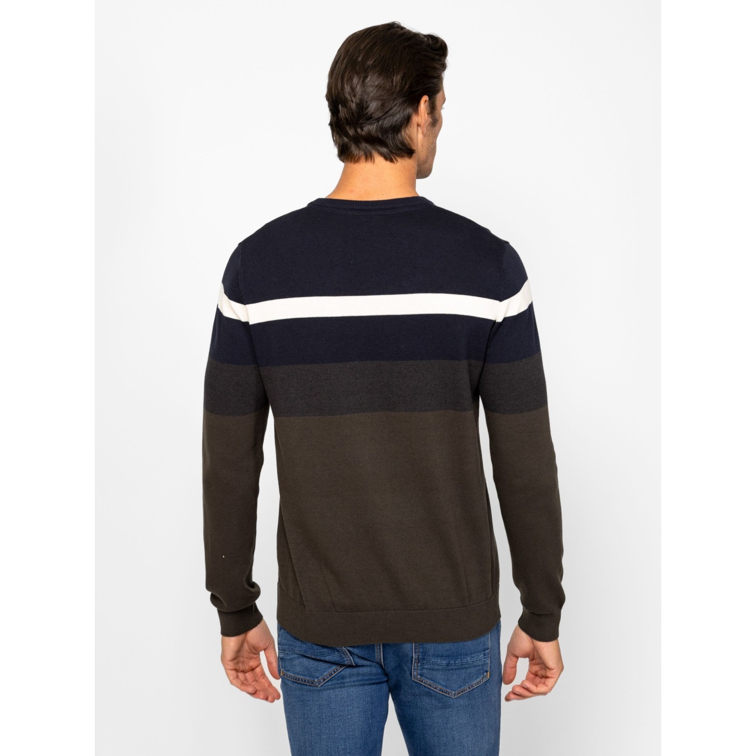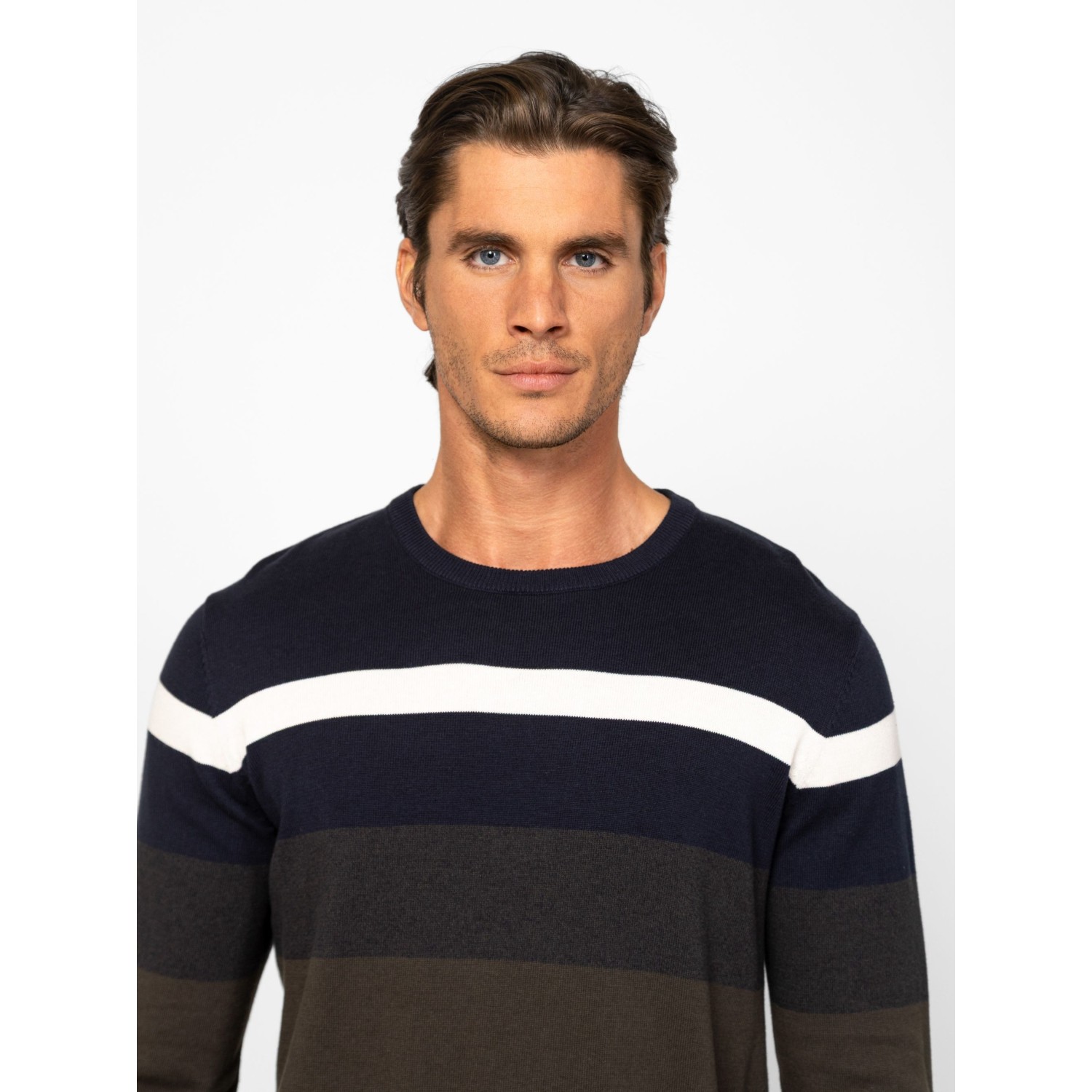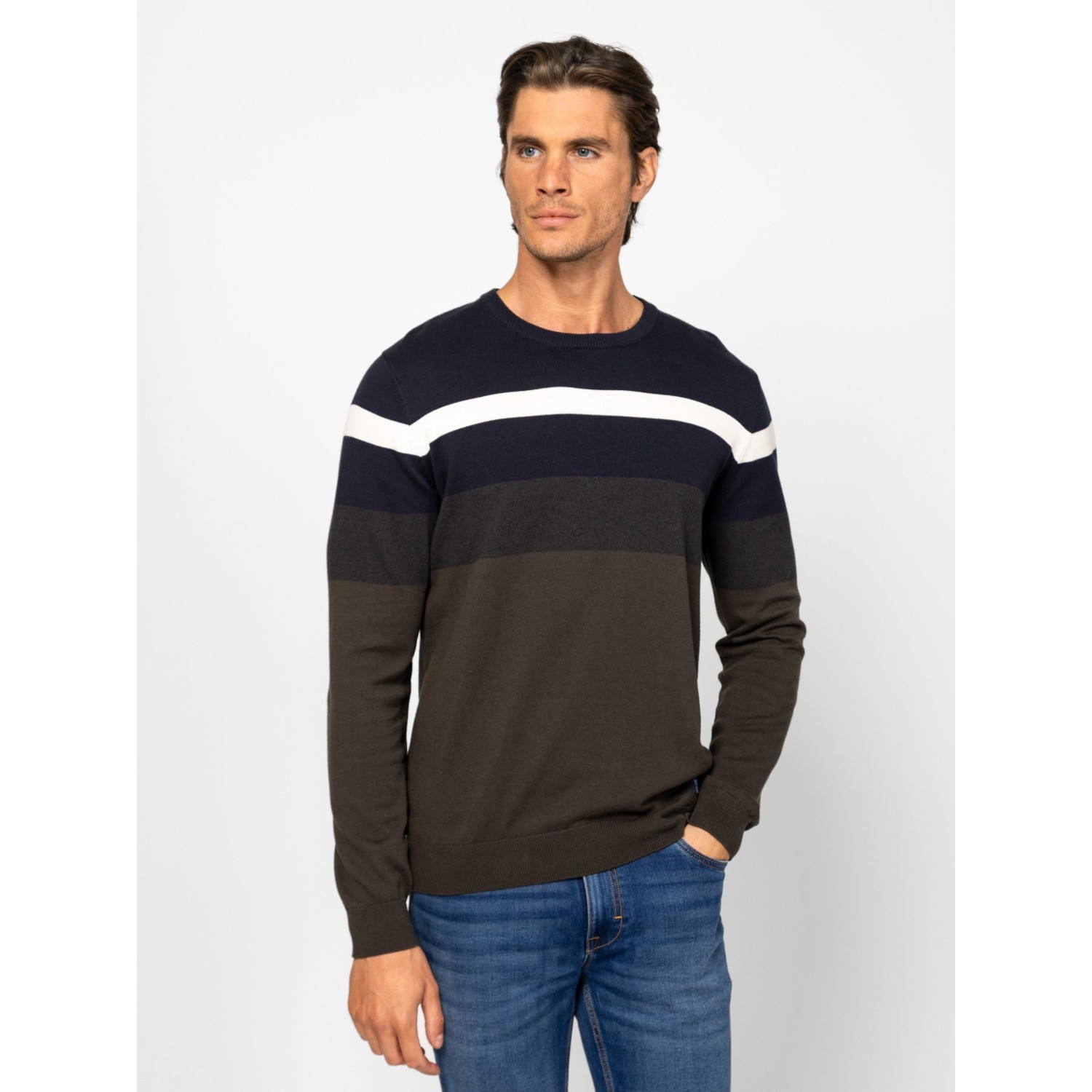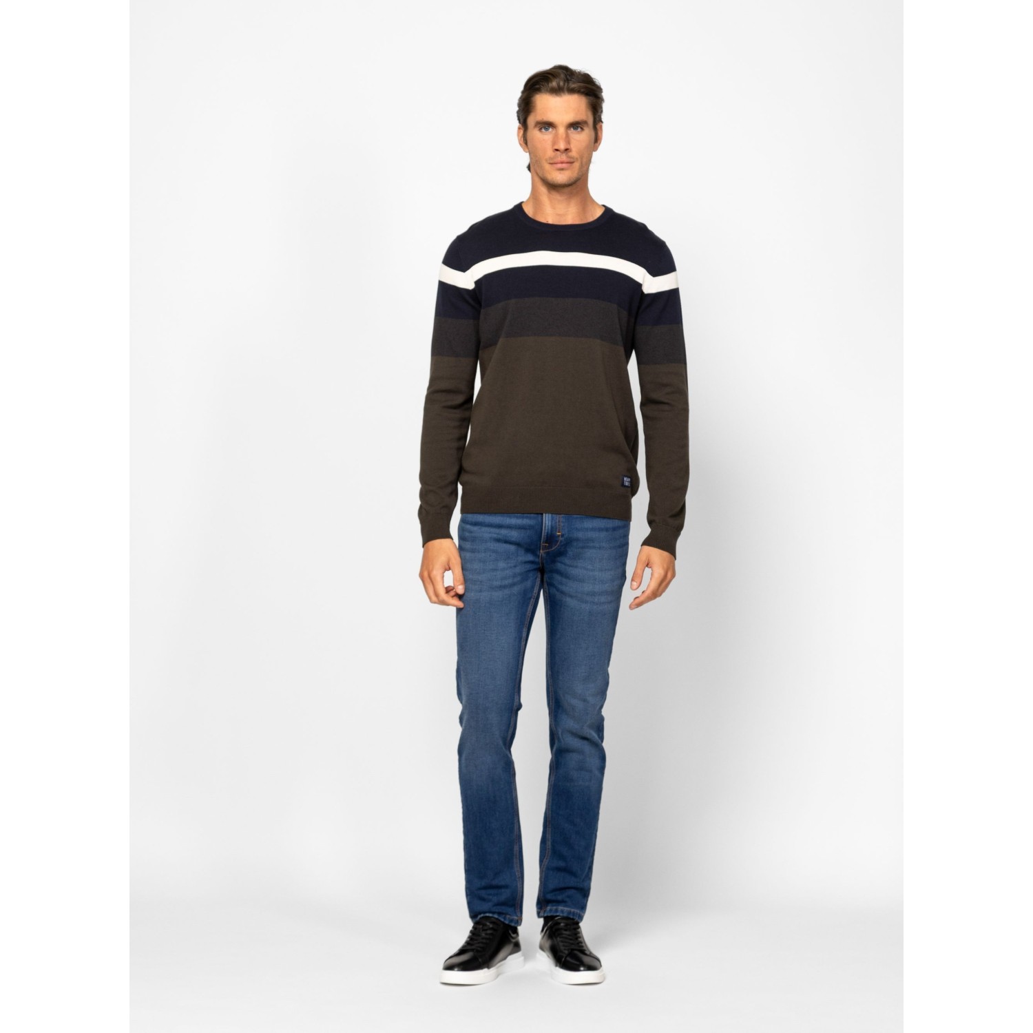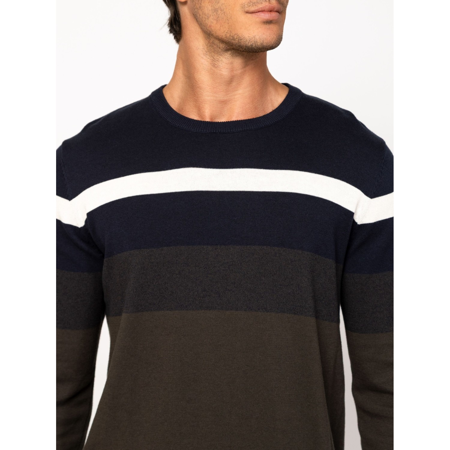 Férfi finom kötött pulóver, klasszikus szabással, váll részen széles csíkozással, kerek nyakkal, bordás kötött kézelővel, nyakkal és aljjal, kis szövött márkajelzéssel az eleje alján. Anyaga: 100% pamut, kötött anyag. A modell 188 cm magas és L-es méretet visel.