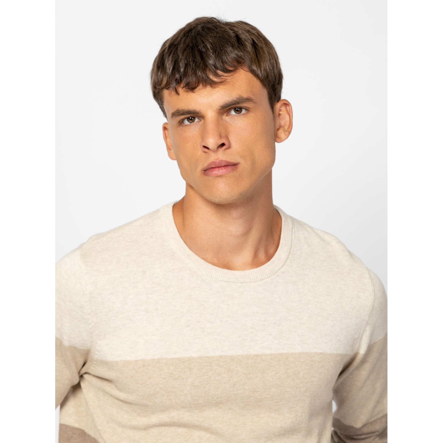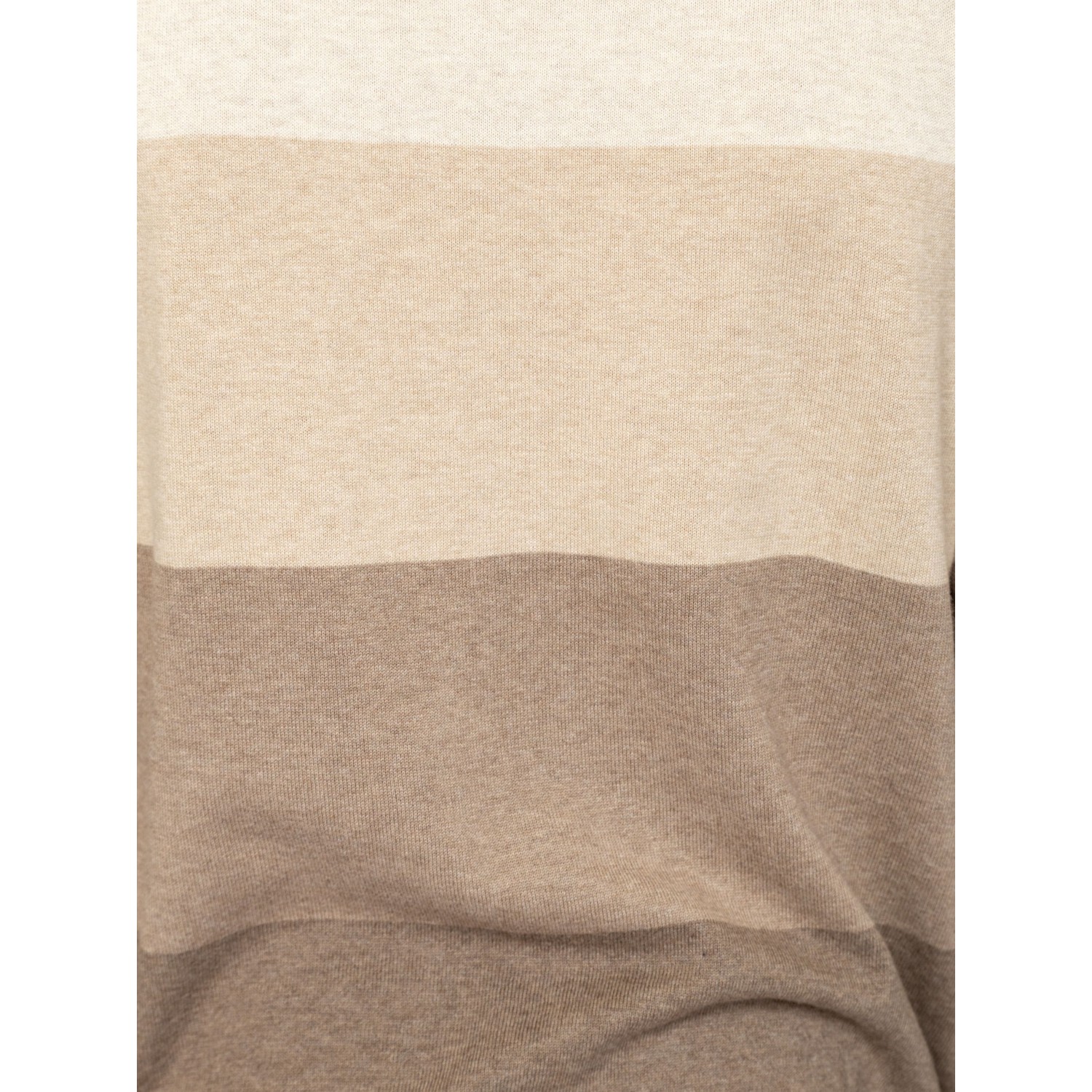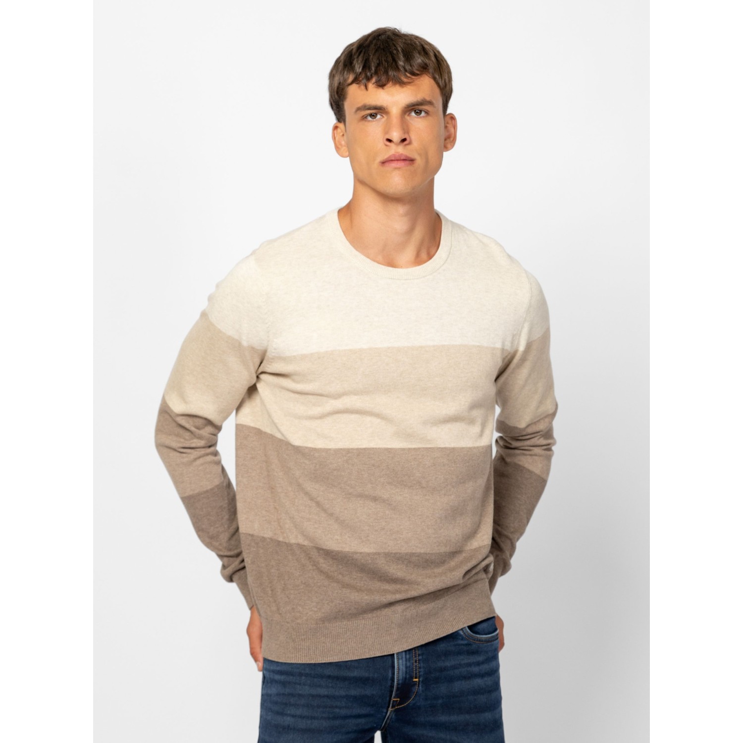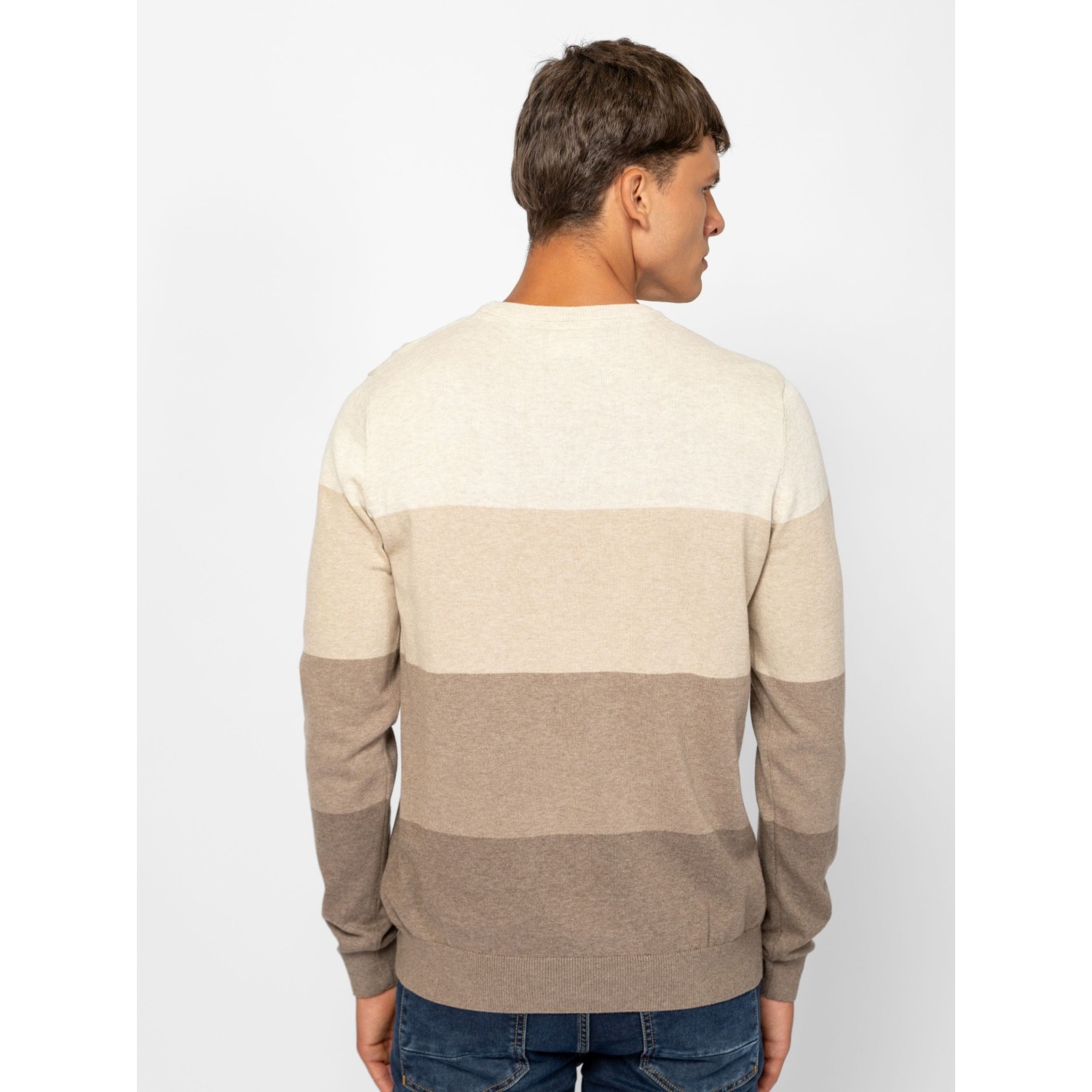 Férfi finom kötött pulóver, klasszikus szabással, széles csíkozással, kerek nyakkal, bordás kötött kézelővel, nyakkal és aljjal, kis szövött márkajelzéssel az eleje alján. Anyaga: 100% pamut, kötött anyag. A modell 188 cm magas és L-es méretet visel.