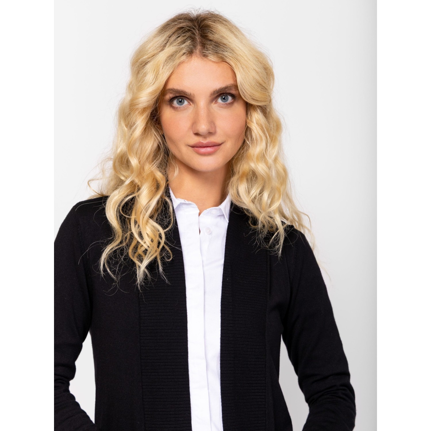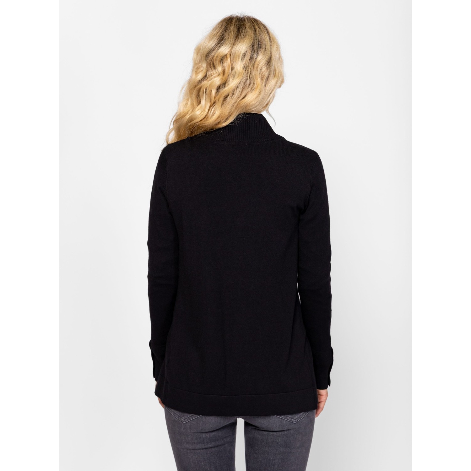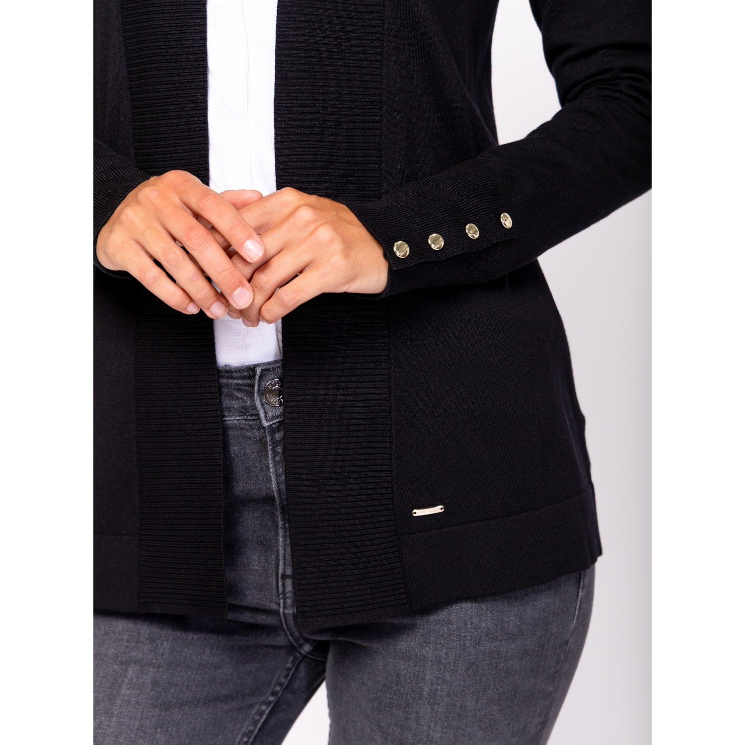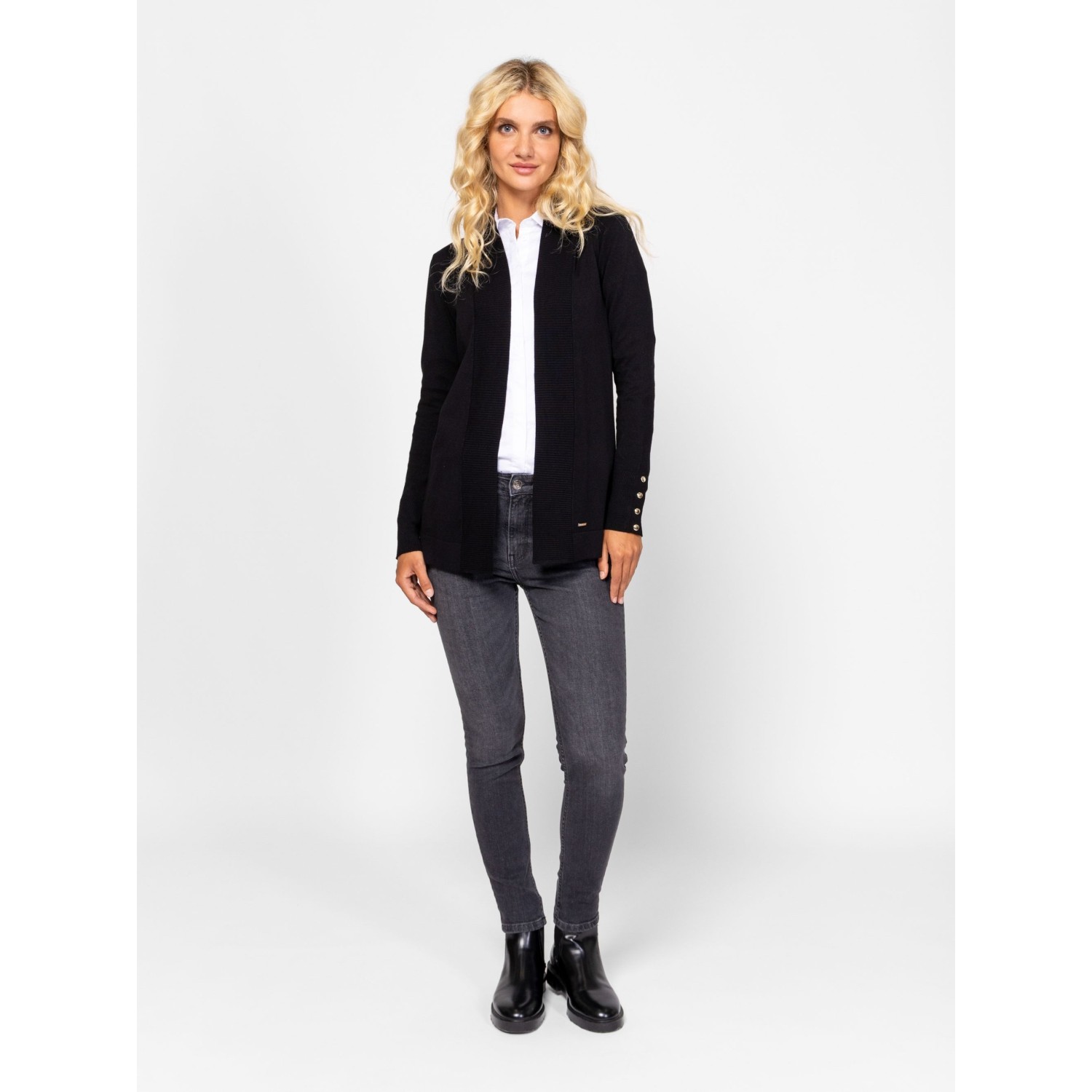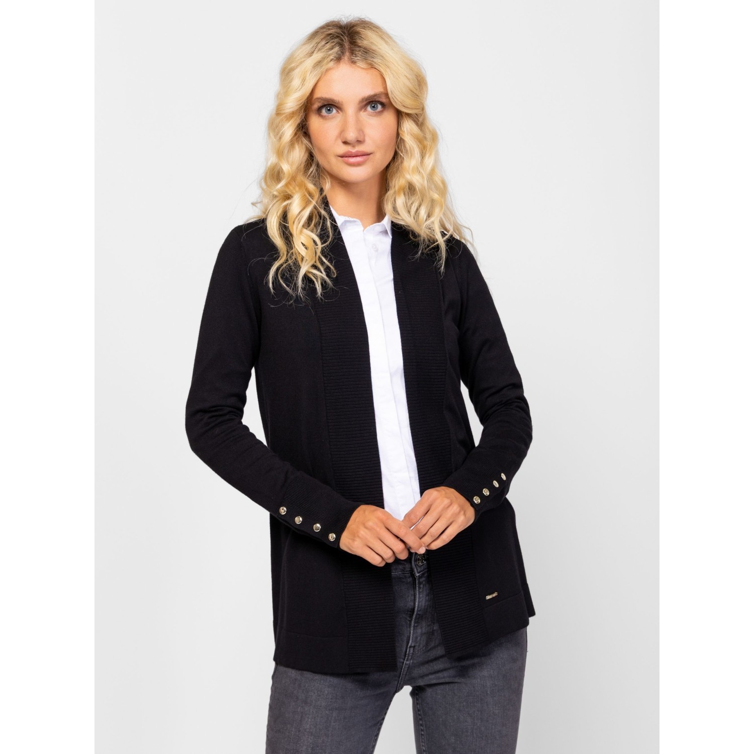 Női finom kötött kardigán, elegáns, sálgalléros nyakkal, díszgombos kézelővel, alján kis fém márkajelzéssel. Anyaga: 83% viszkóz, 17% nylon, kötött anyag. A modell 175 cm magas és S-es méretet visel.
