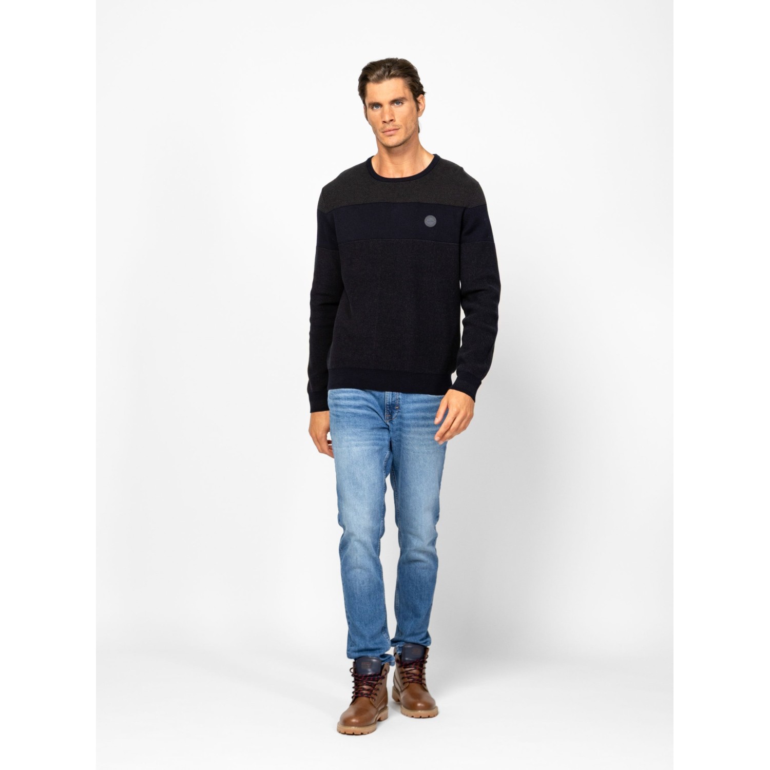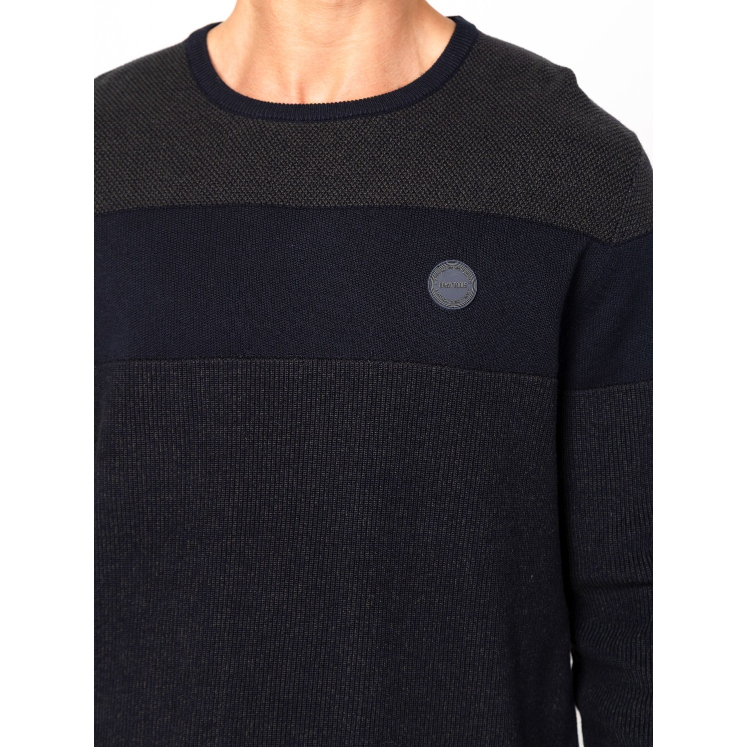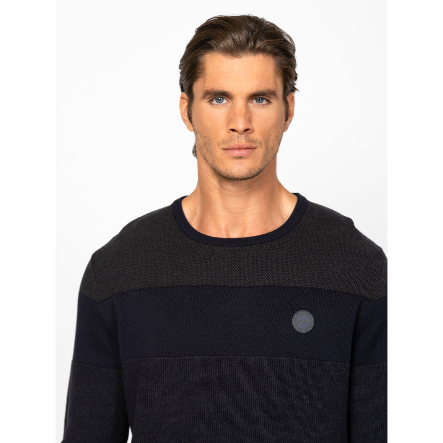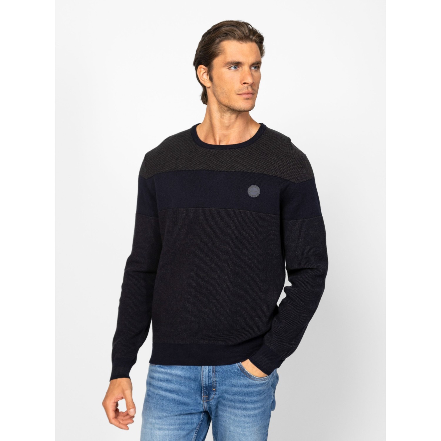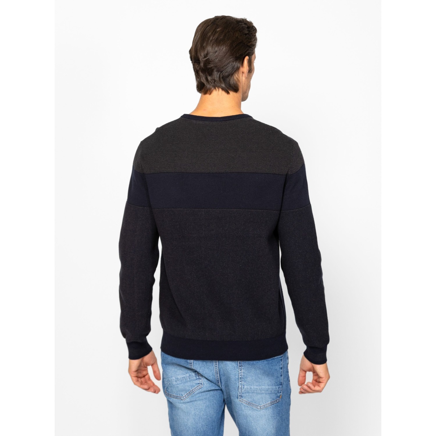 Férfi kötött pulóver, klasszikus szabással, izgalmas kötés mintákkal és csíkozással, kerek nyakkal, bordás kötött kézelővel, nyakkal és aljjal, kis márkajelzéssel az elején. Anyaga: 100% pamut, kötött anyag. A modell 188 cm magas és L-es méretet visel.