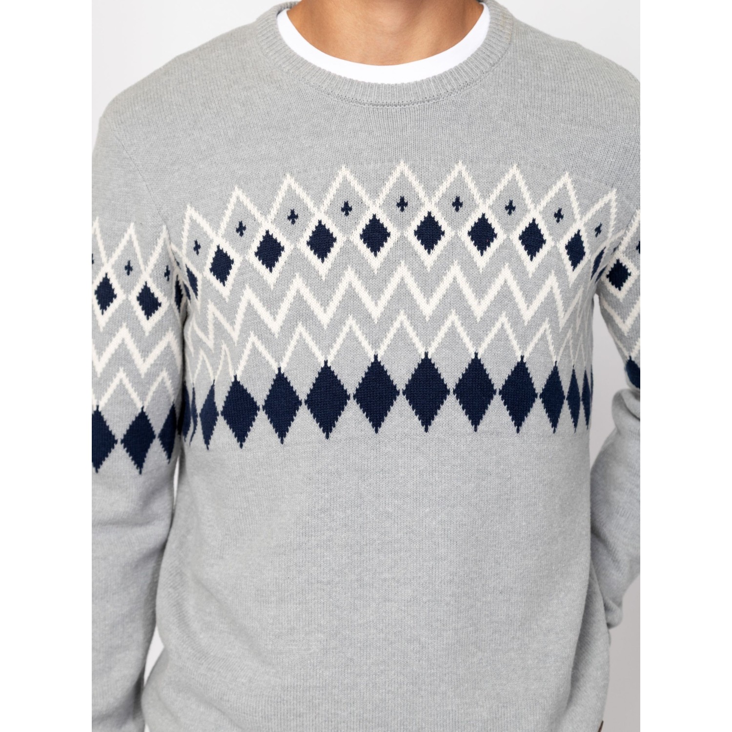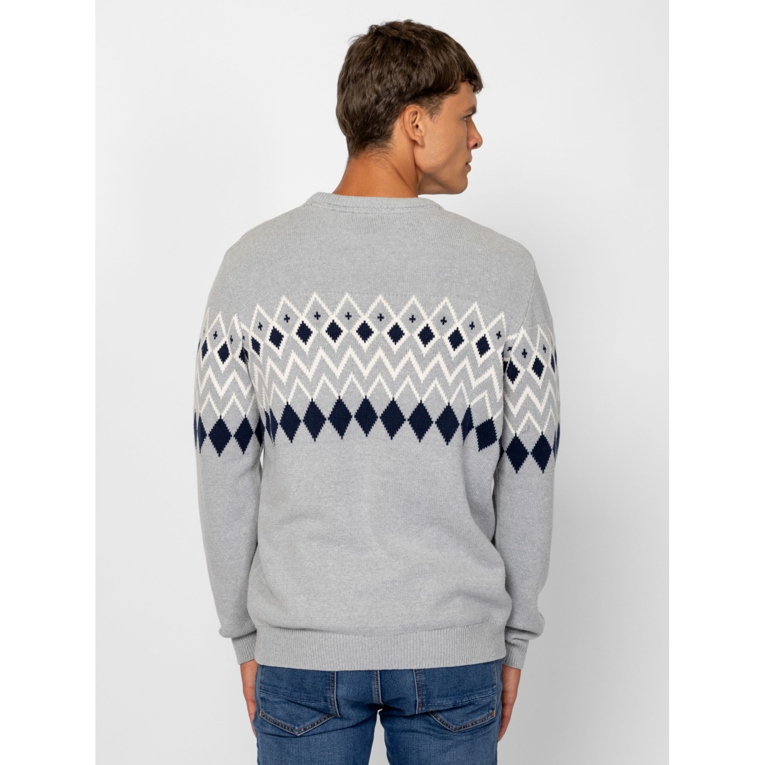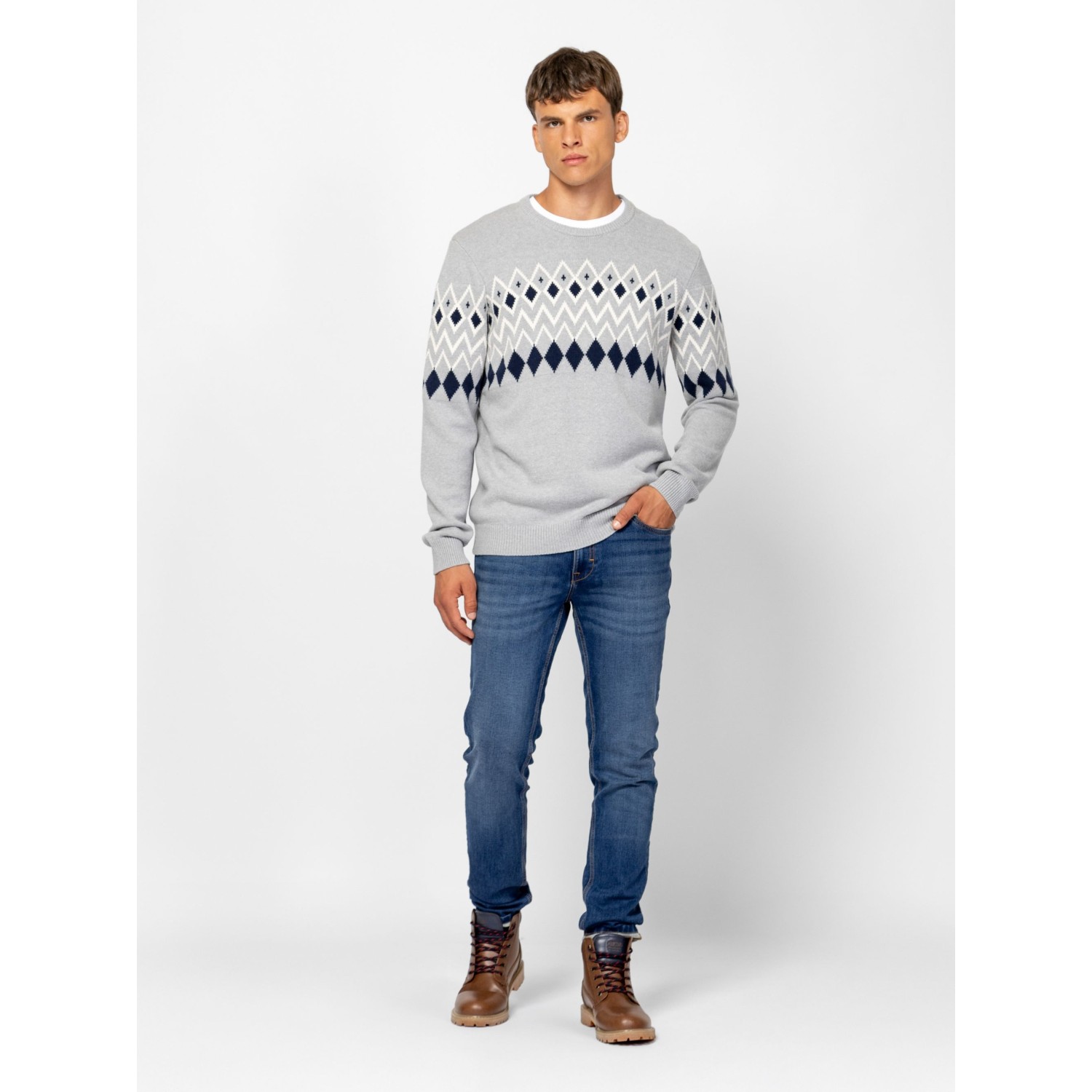 Férfi kötött pulóver, vastagabb, melírozott fonalból, mellén és ujján klasszikus norvég mintát idéző motívummal, egyenes szabással, kerek nyakkal, bordás kötött kézelővel, nyakkal és aljjal, kis bőr márkajelzéssel az eleje alján. Anyaga: 60% pamut, 40% akril, kötött anyag. A modell 188 cm magas és L-es méretet visel.