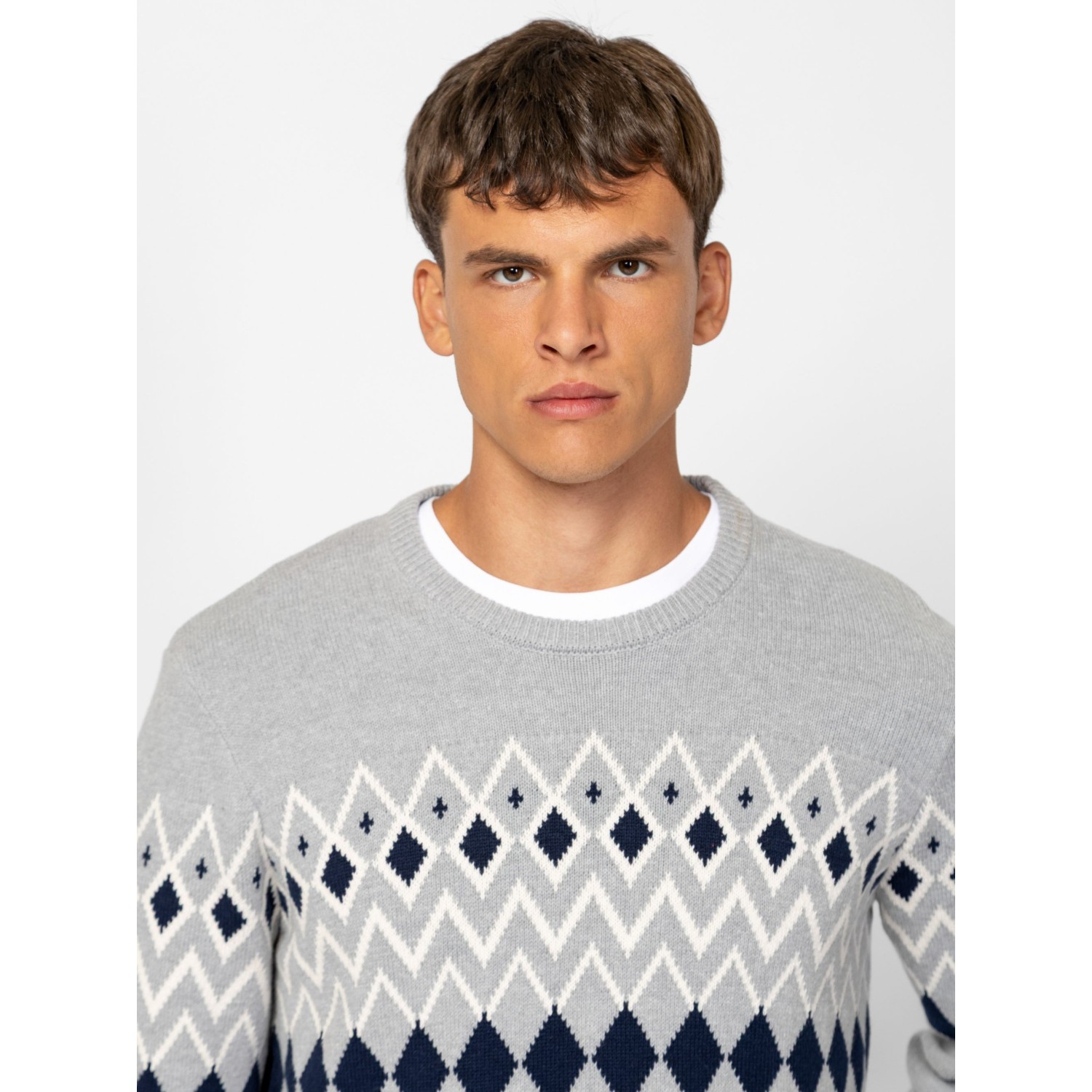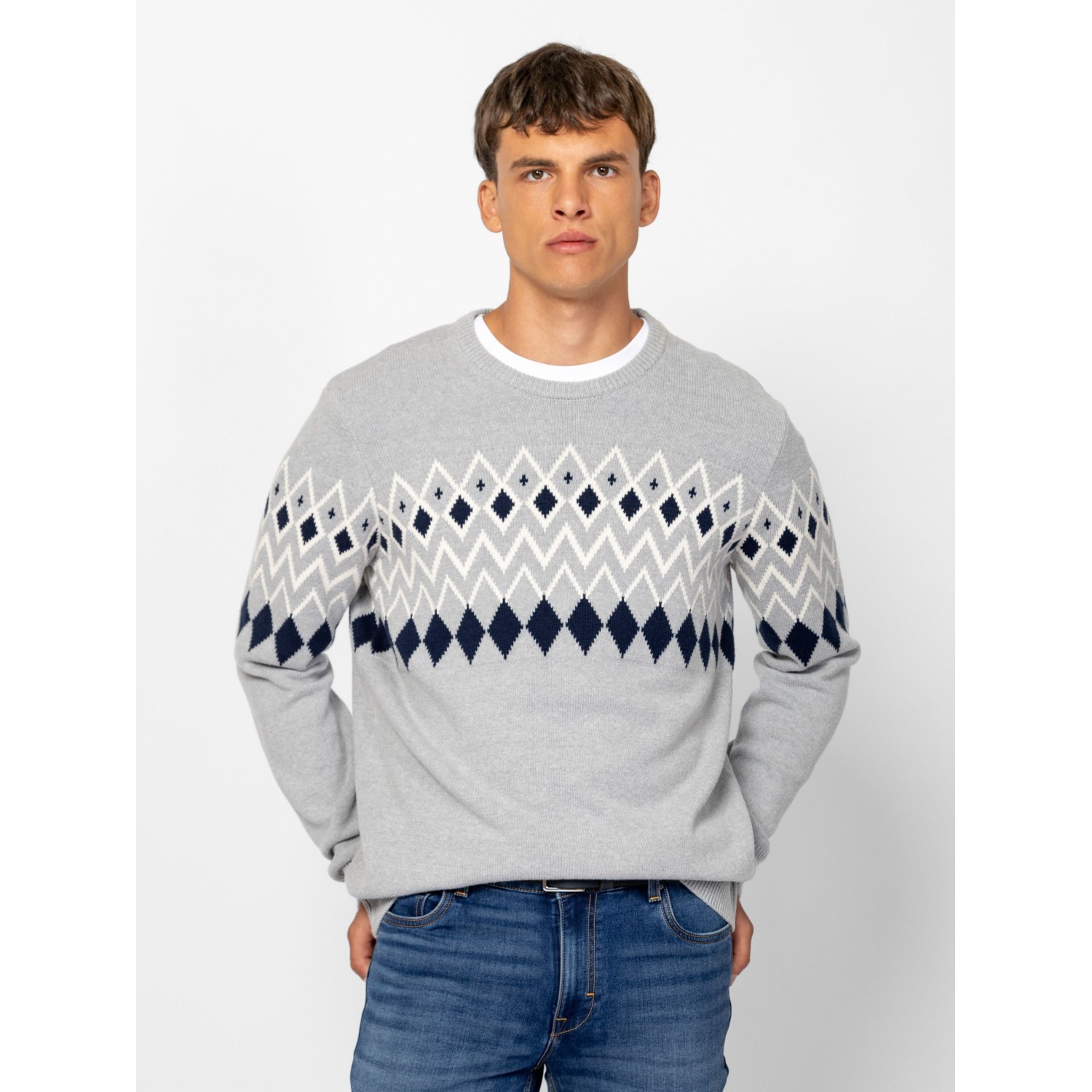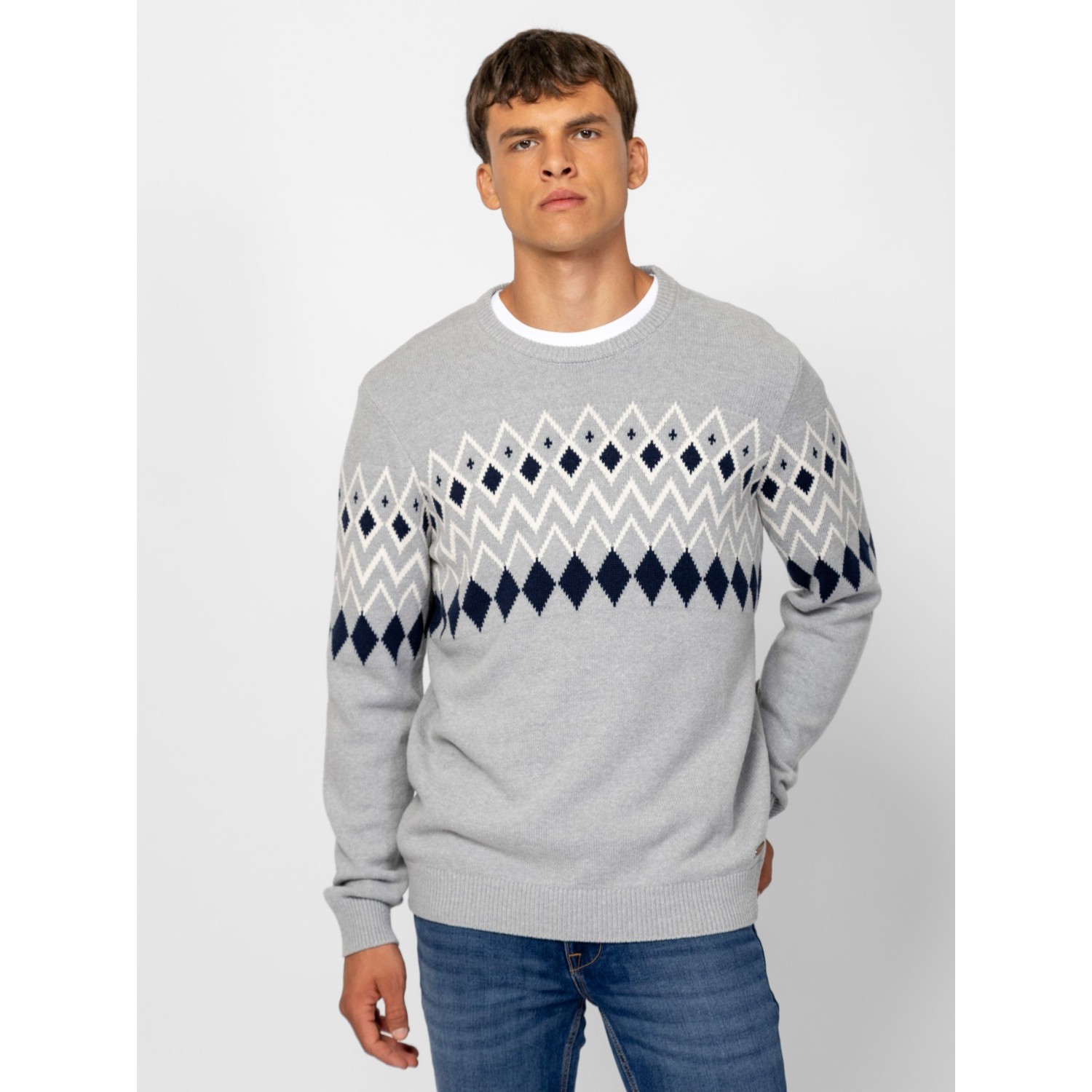 Férfi kötött pulóver, vastagabb, melírozott fonalból, mellén és ujján klasszikus norvég mintát idéző motívummal, egyenes szabással, kerek nyakkal, bordás kötött kézelővel, nyakkal és aljjal, kis bőr márkajelzéssel az eleje alján. Anyaga: 60% pamut, 40% akril, kötött anyag. A modell 188 cm magas és L-es méretet visel.