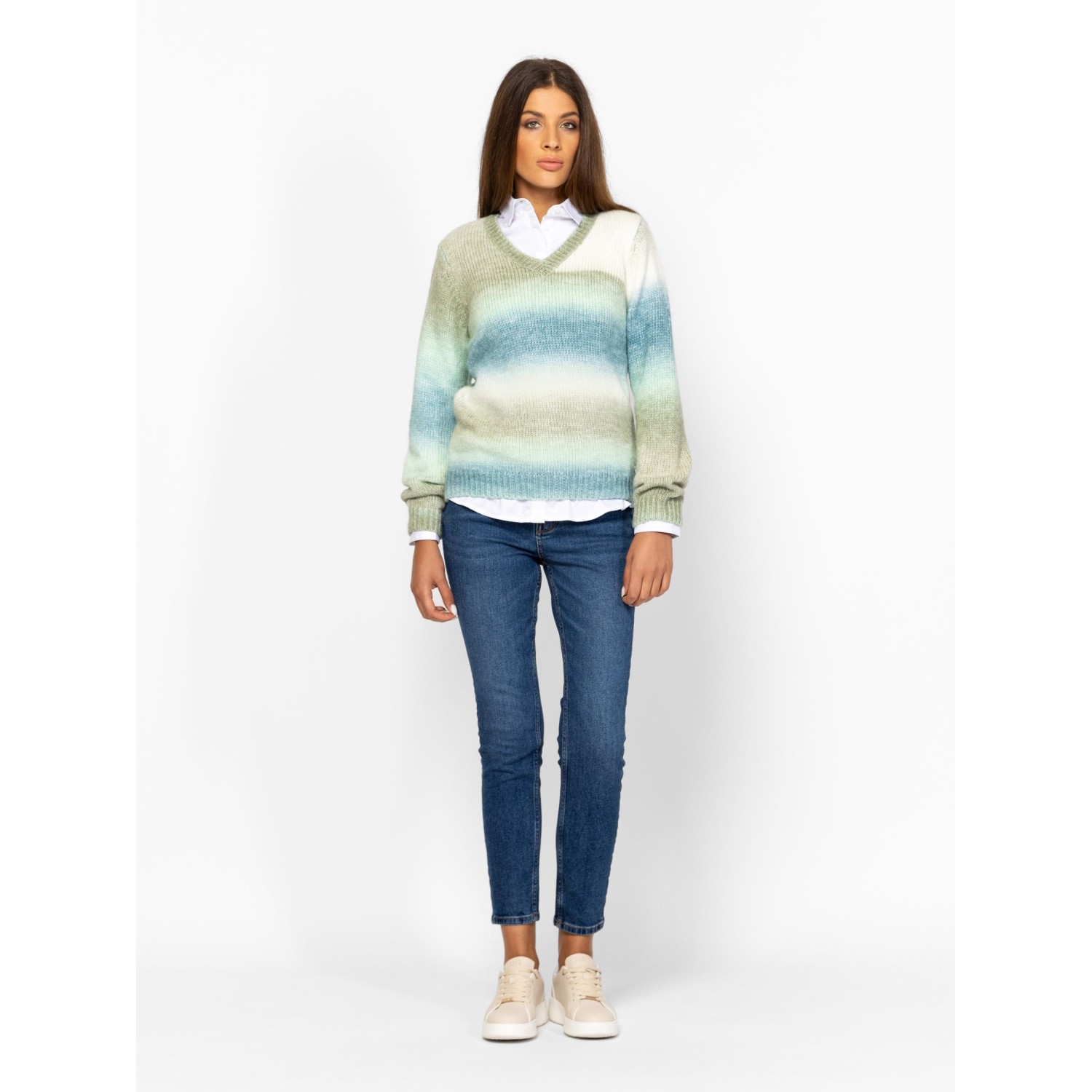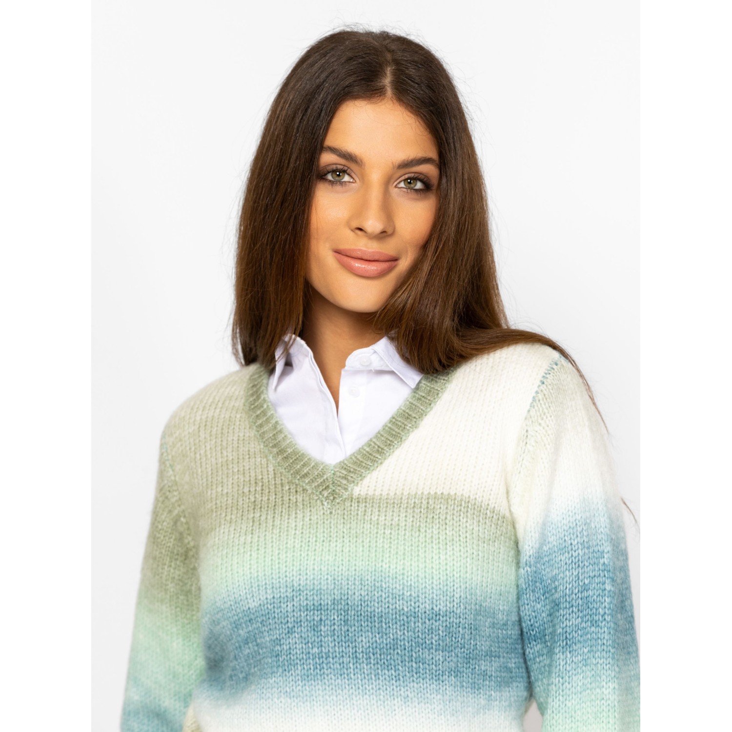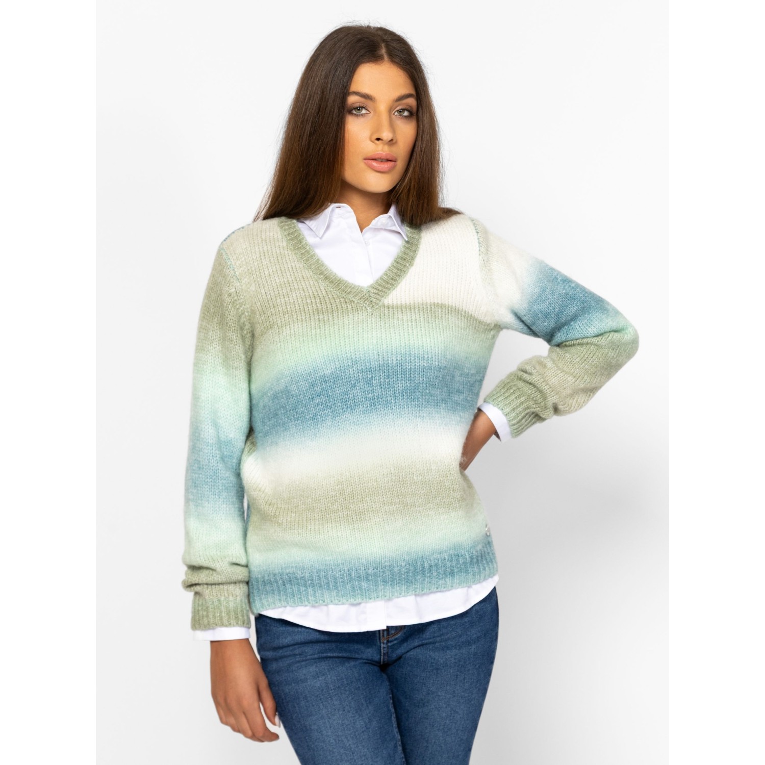 Női kötött pulóver, egyenes szabással, v-nyakkal, színátmenetes kötéssel, kis fém márkajelzéssel az eleje alján. Anyaga: 58% akril, 29% poliészter, 9% nylon, 4% gyapjú, kötött anyag. A modell 175 cm magas és S-es méretet visel.