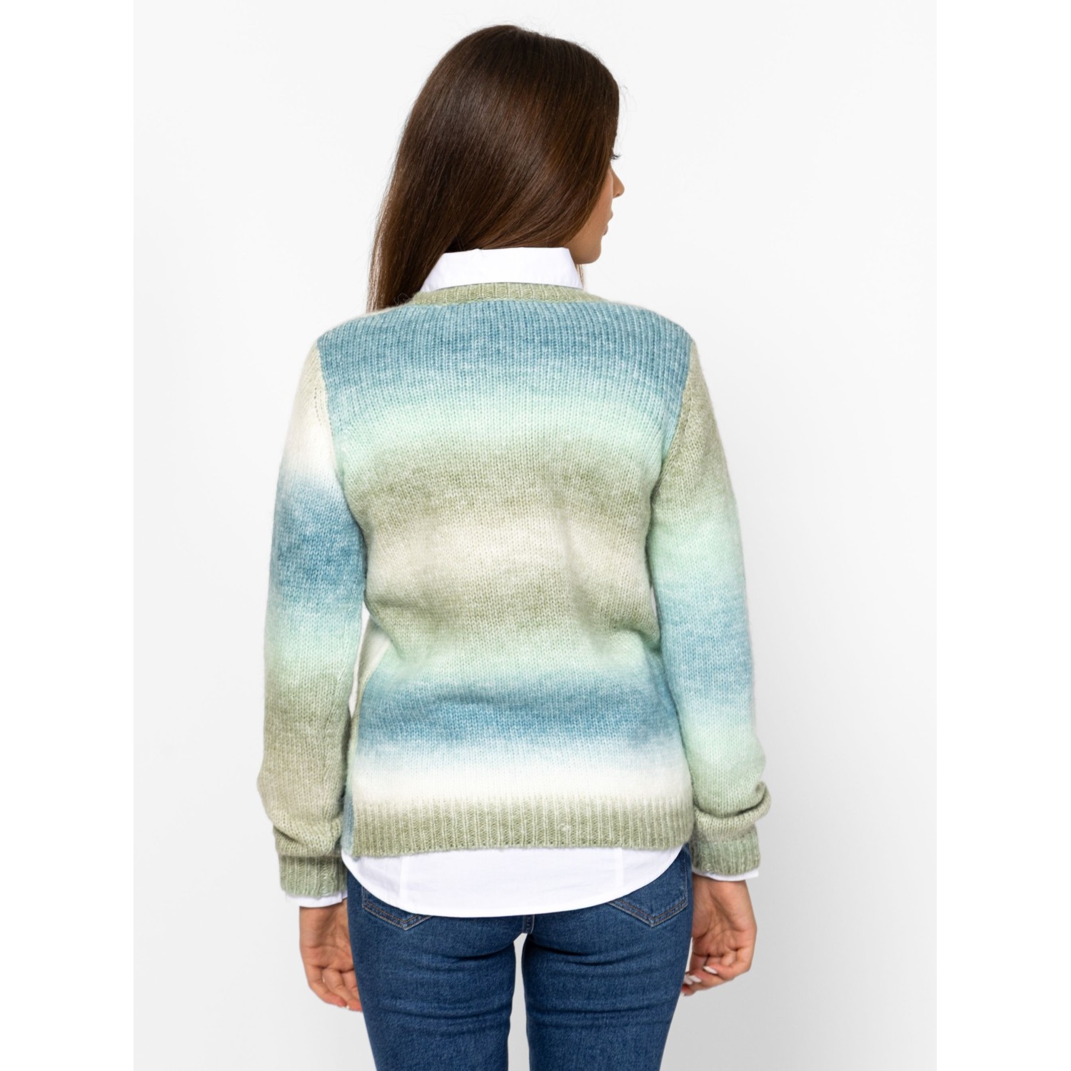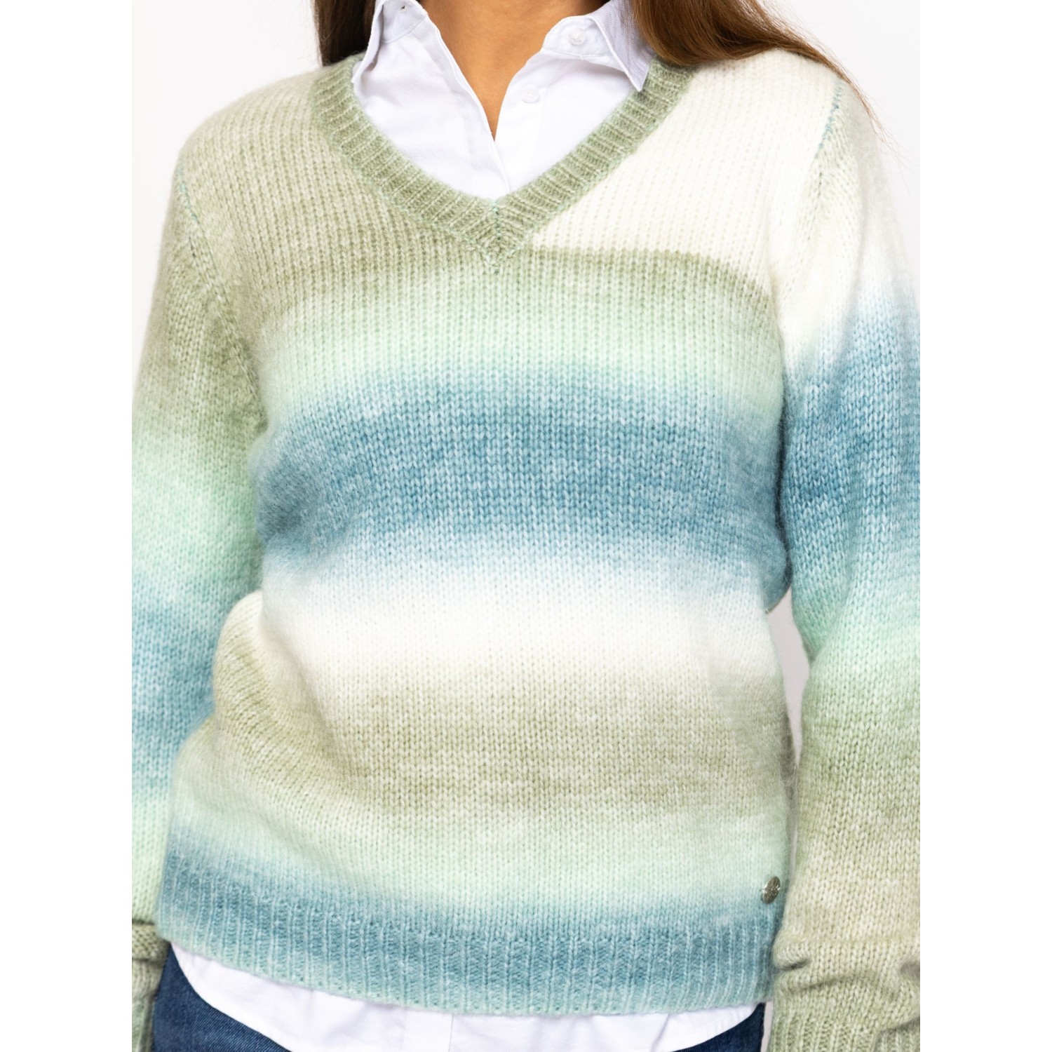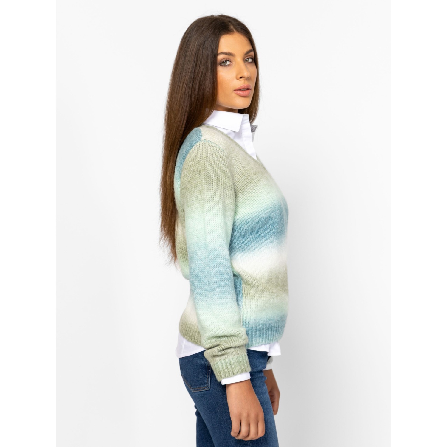 Női kötött pulóver, egyenes szabással, v-nyakkal, színátmenetes kötéssel, kis fém márkajelzéssel az eleje alján. Anyaga: 58% akril, 29% poliészter, 9% nylon, 4% gyapjú, kötött anyag. A modell 175 cm magas és S-es méretet visel.