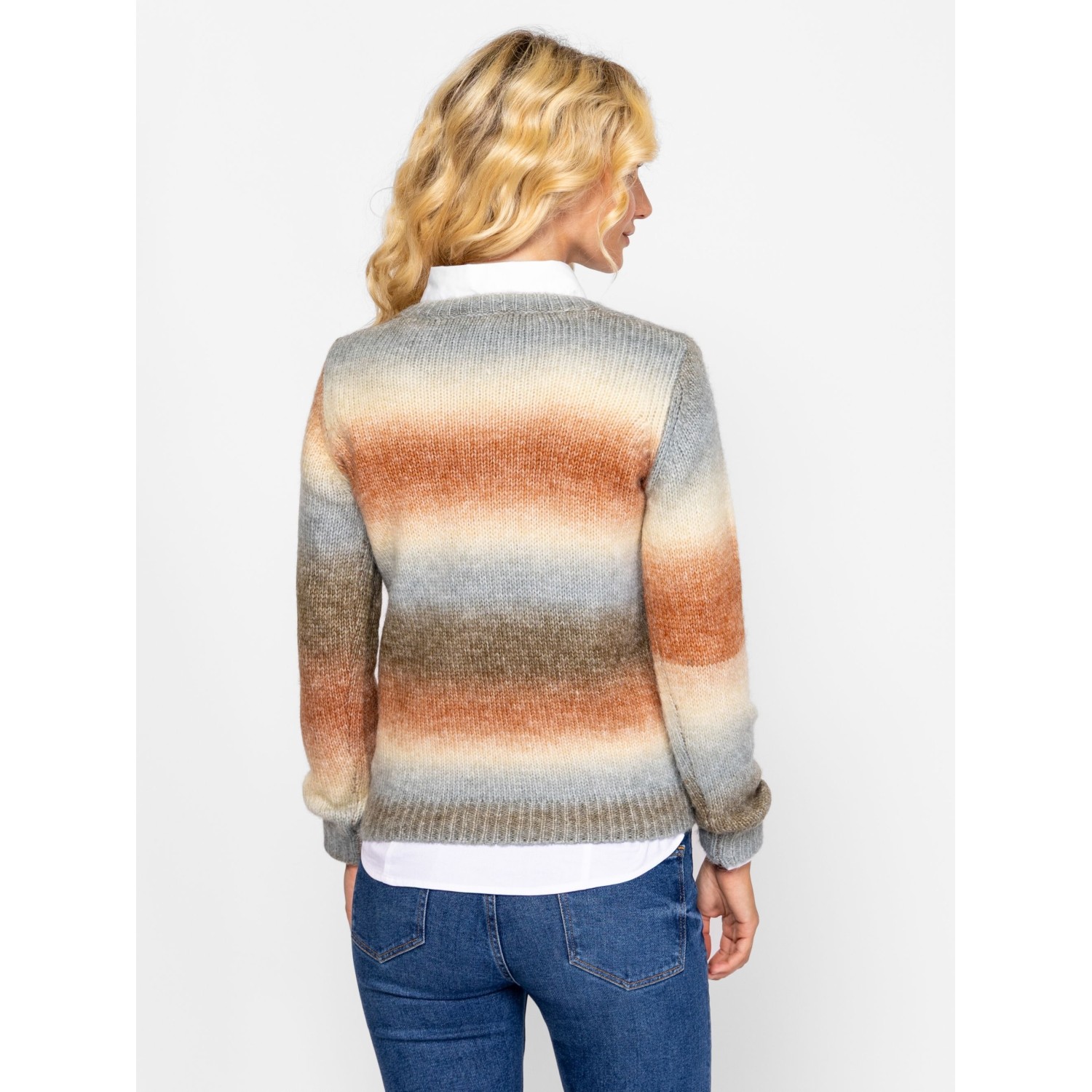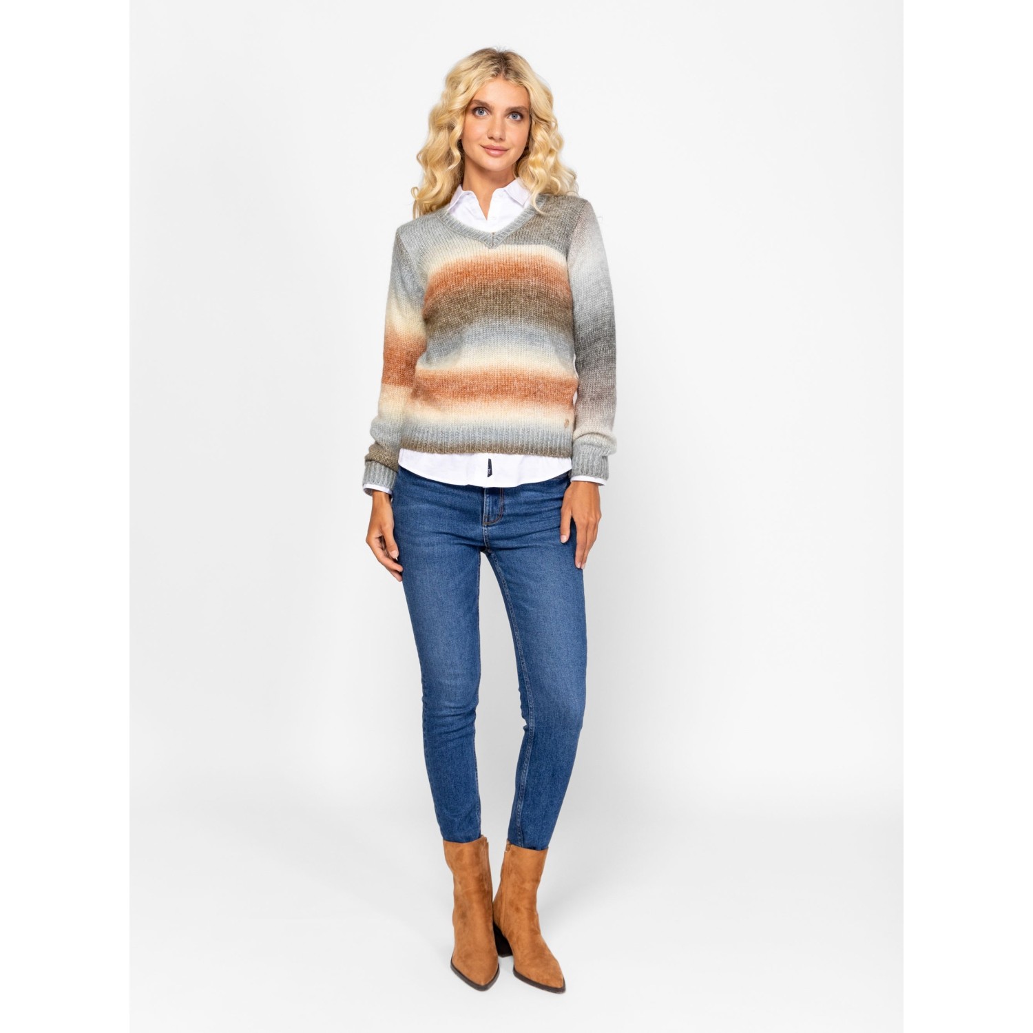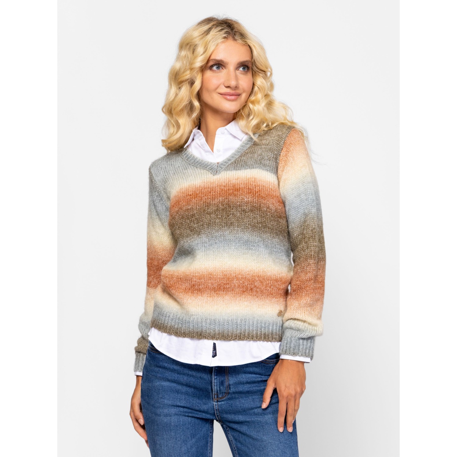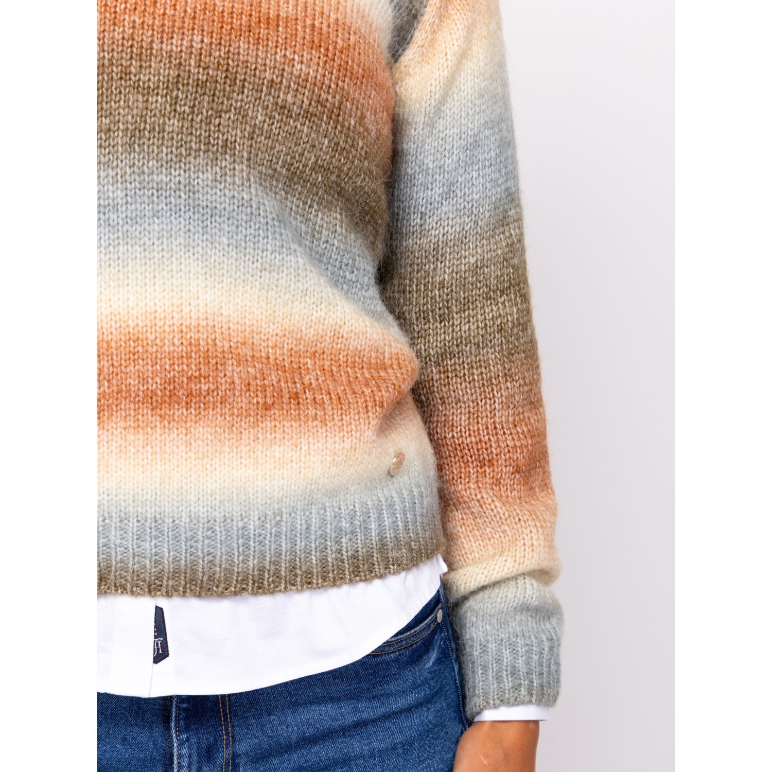 Női kötött pulóver, egyenes szabással, v-nyakkal, színátmenetes kötéssel, kis fém márkajelzéssel az eleje alján. Anyaga: 58% akril, 29% poliészter, 9% nylon, 4% gyapjú, kötött anyag. A modell 175 cm magas és S-es méretet visel.