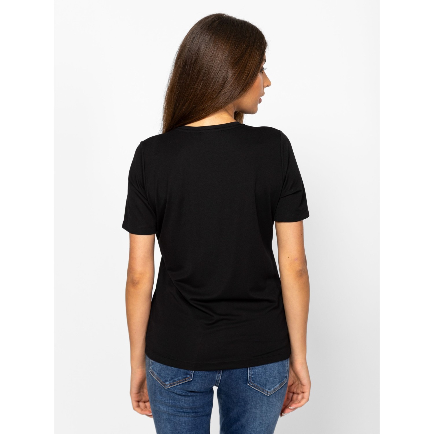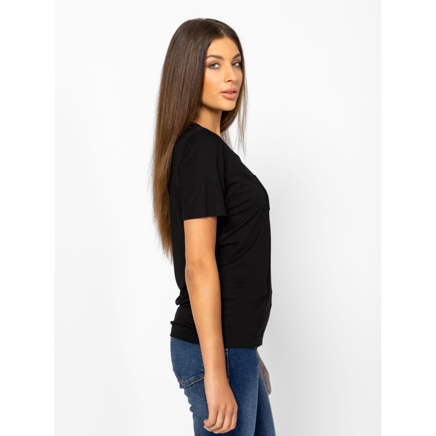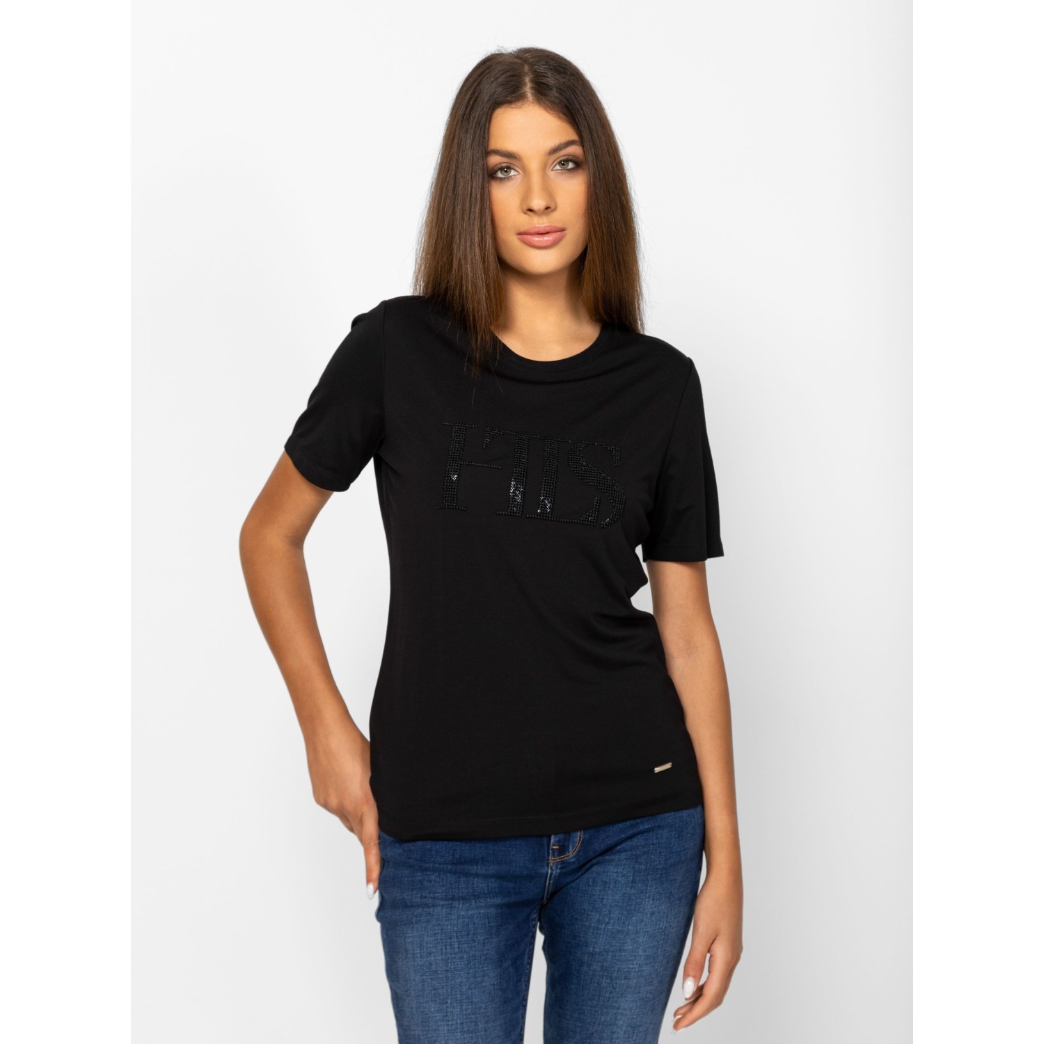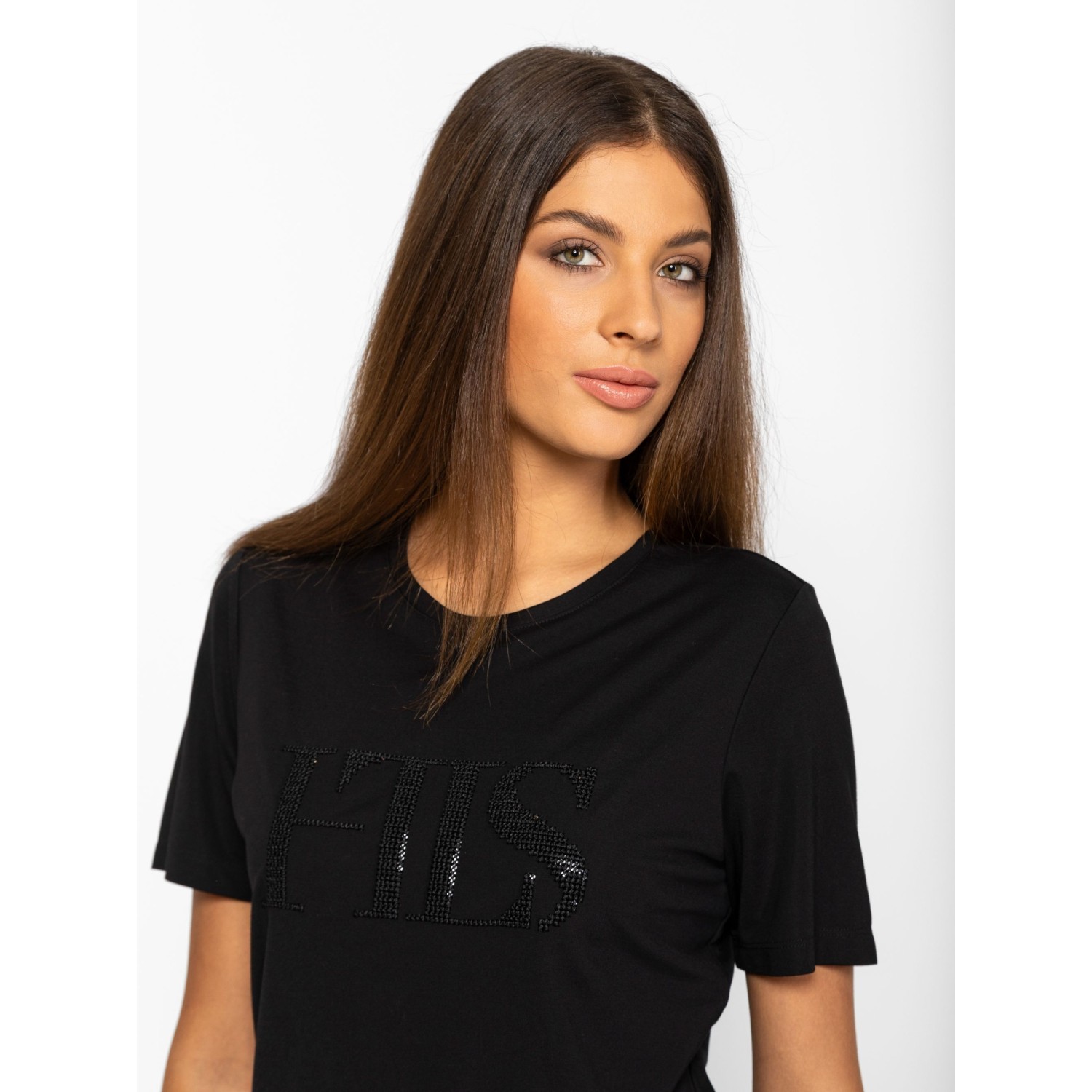 Női rövid ujjú póló, enyhén karcsúsított szabással, kerek nyakkal, elején hímzett, flitteres márkajelzéssel, eleje alján kis fém márkajelzéssel, elasztikus anyagból. Anyaga: 60% viszkóz, 35% nylon, 5% elasztán, jersey. A modell 175 cm magas és S-es méretet visel.