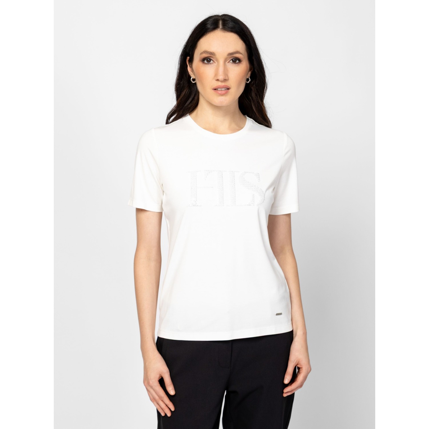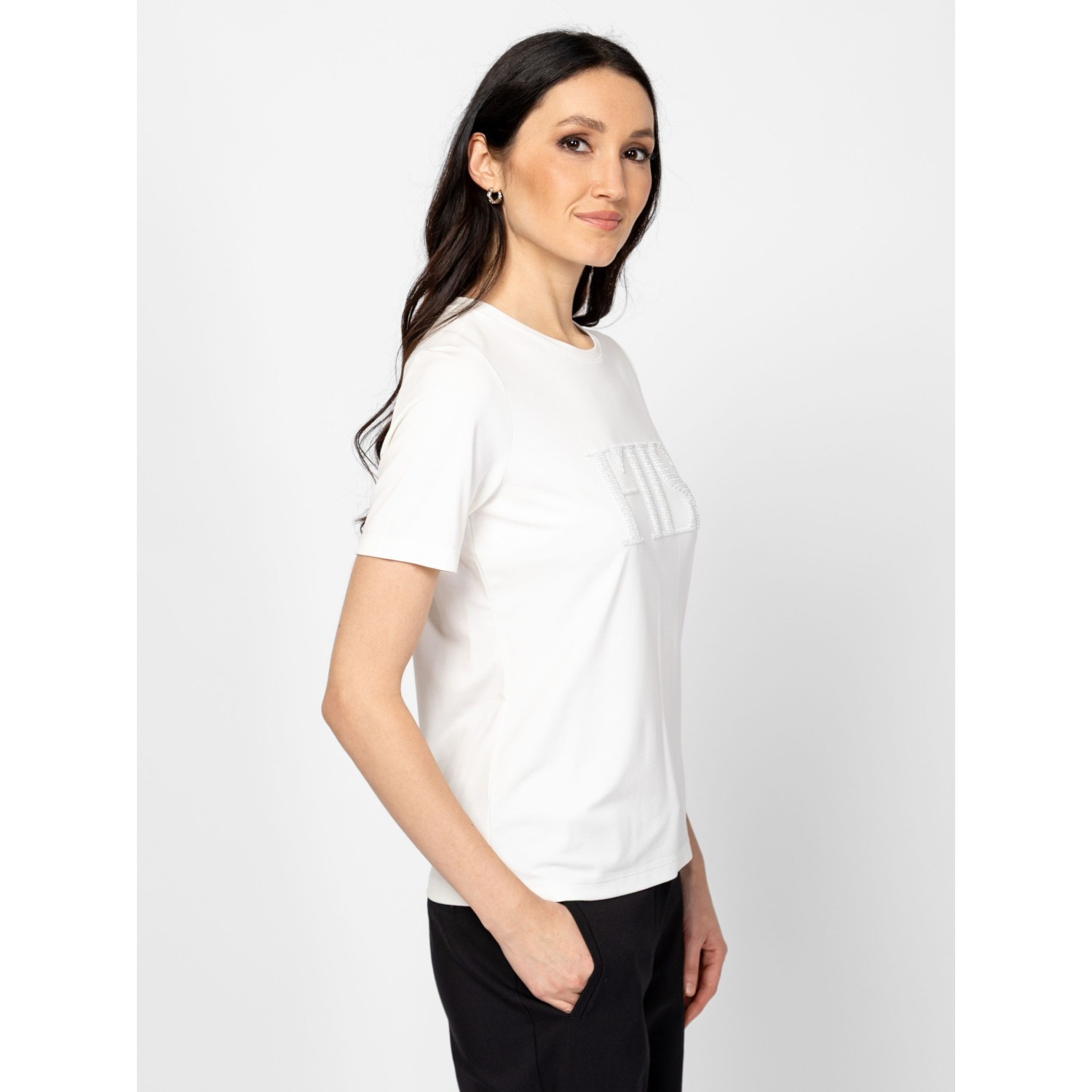 Női rövid ujjú póló, enyhén karcsúsított szabással, kerek nyakkal, elején hímzett, flitteres márkajelzéssel, eleje alján kis fém márkajelzéssel, elasztikus anyagból. Anyaga: 60% viszkóz, 35% nylon, 5% elasztán, jersey. A modell 175 cm magas és S-es méretet visel.