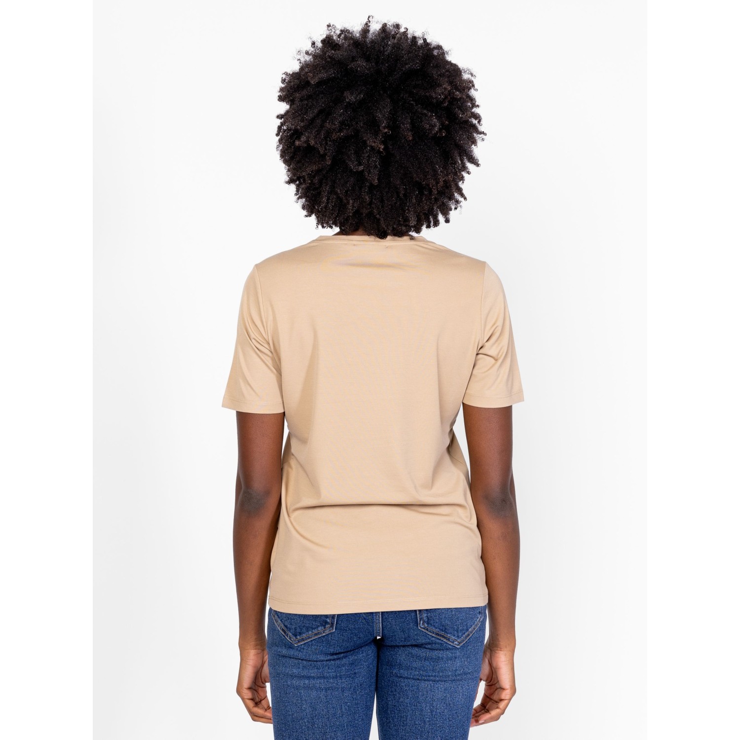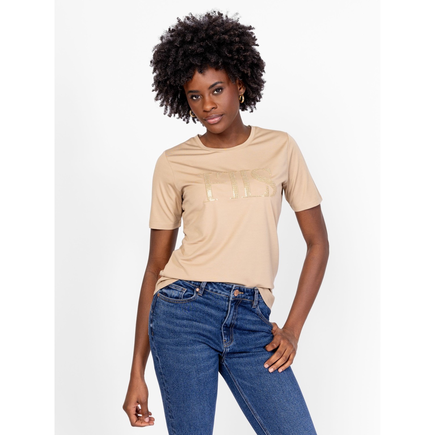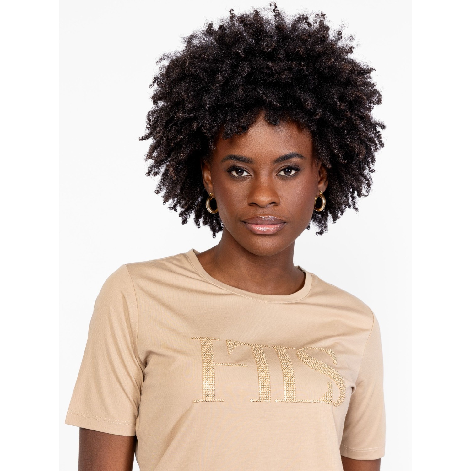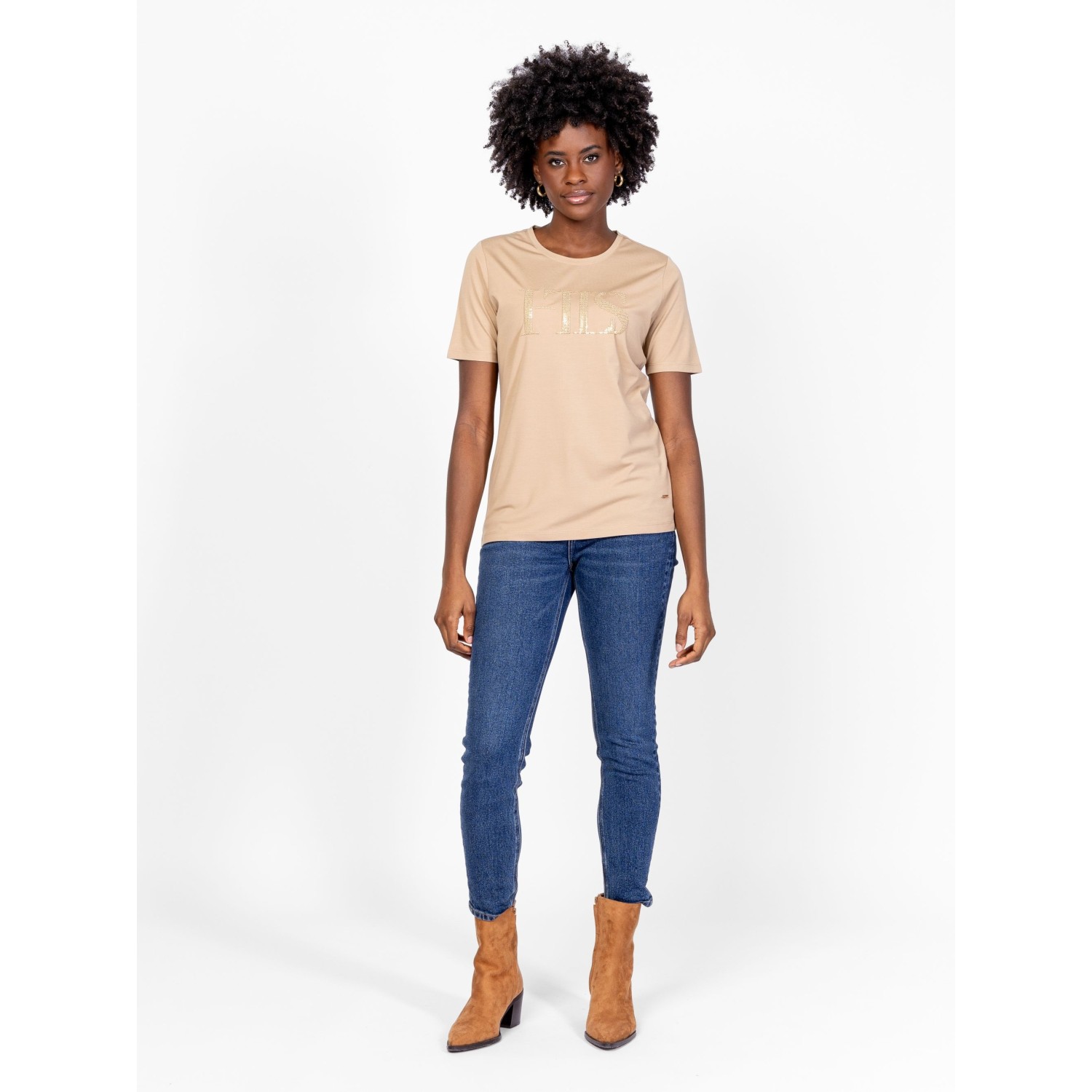 Női rövid ujjú póló, enyhén karcsúsított szabással, kerek nyakkal, elején hímzett, flitteres márkajelzéssel, eleje alján kis fém márkajelzéssel, elasztikus anyagból. Anyaga: 60% viszkóz, 35% nylon, 5% elasztán, jersey. A modell 175 cm magas és S-es méretet visel.