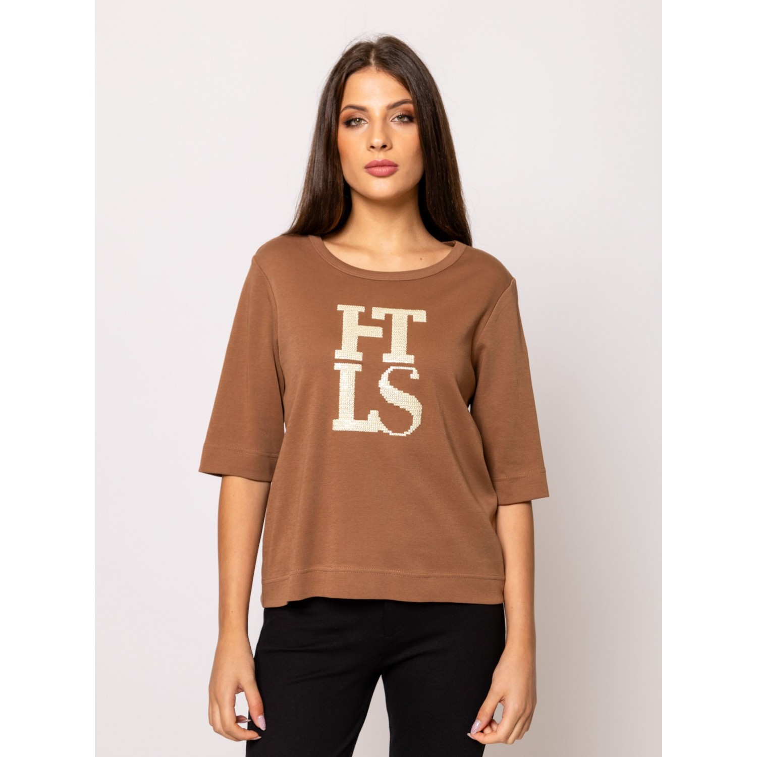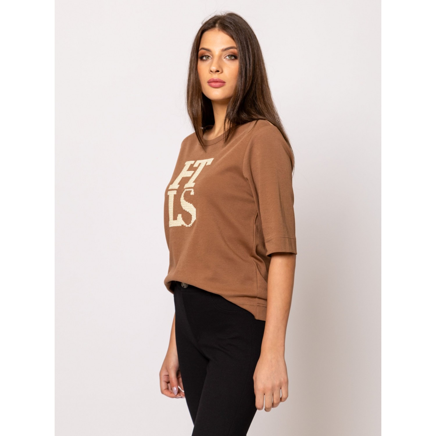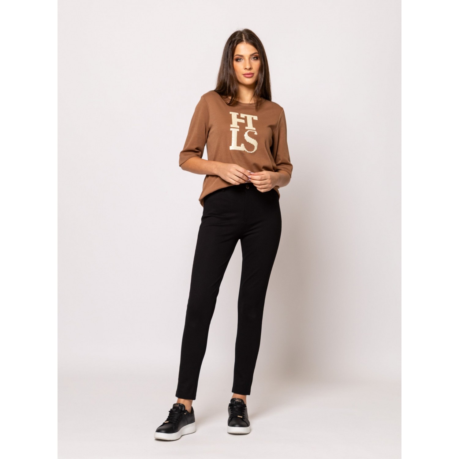 Női rövid ujjú póló, egyenes szabással, rövidebb test hosszal, kerek nyakkal, tiszta pamut anyagból, elején nagy, hímzett, flitteres márkajelzéssel, hátán kis fém márkajelzéssel. Prémium pamut fonalból készült, mely puha tapintású, kellemes, lágy fényű, tartós anyagot eredményez. Anyaga: 100% pamut, interlock jersey. A modell 175 cm magas és S-es méretet visel.