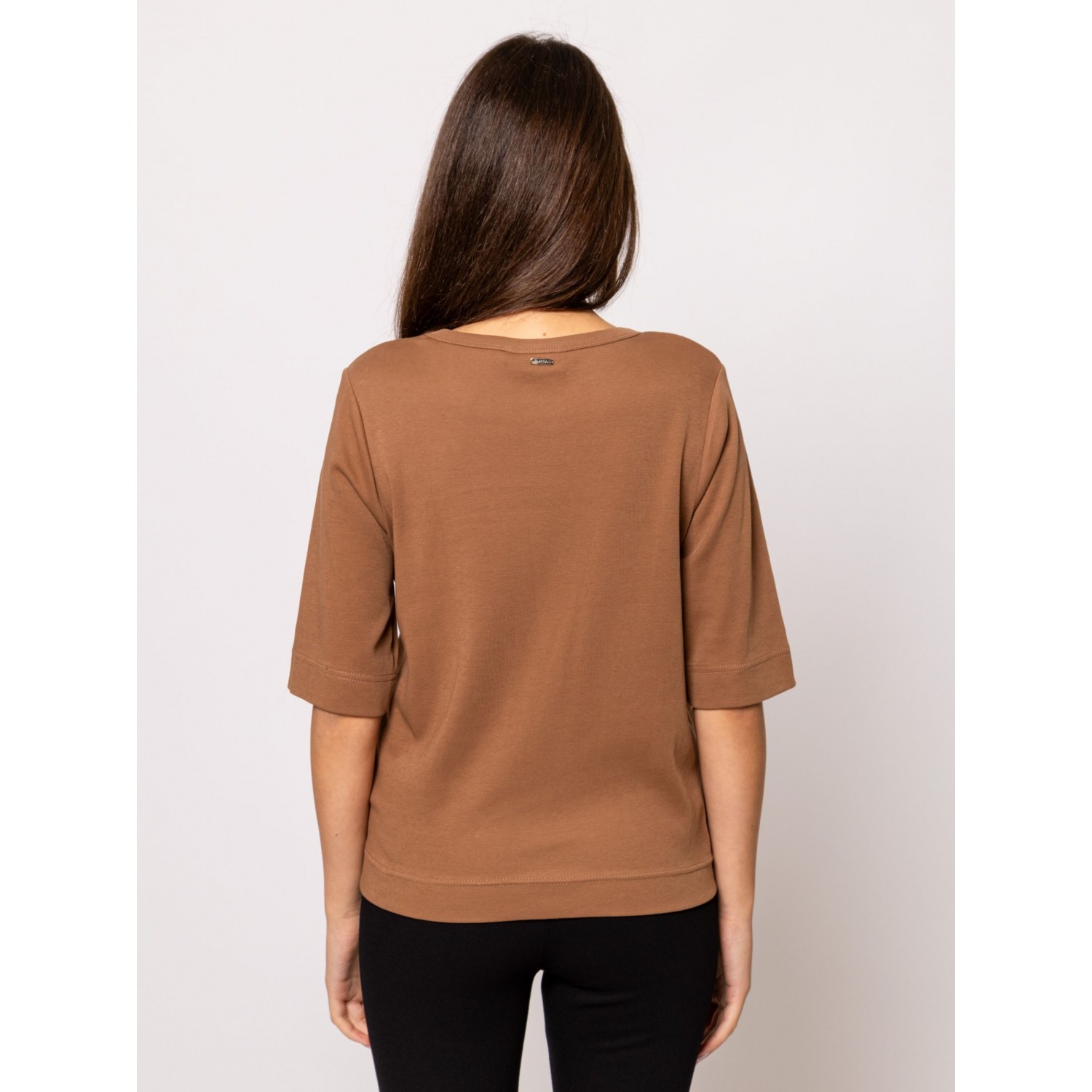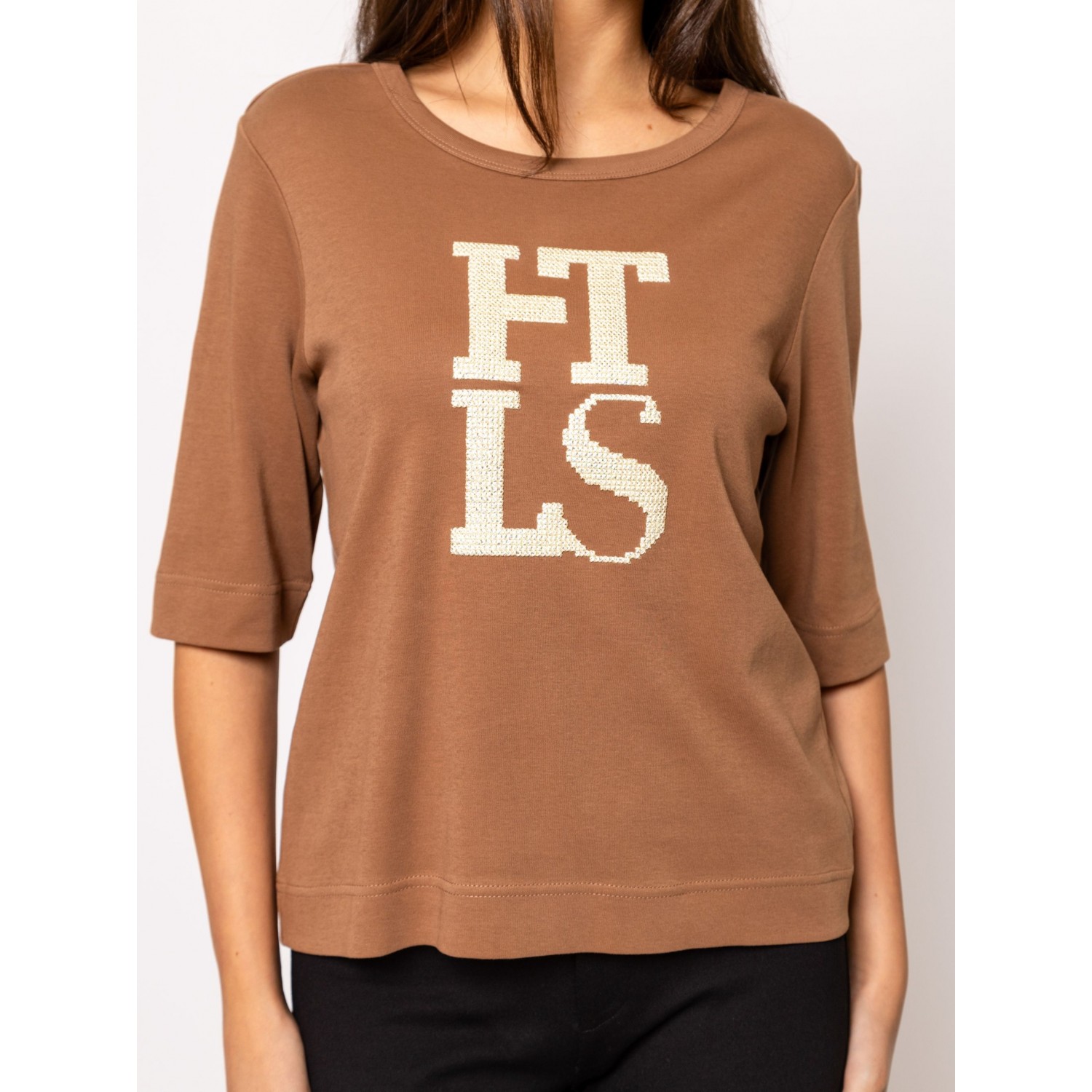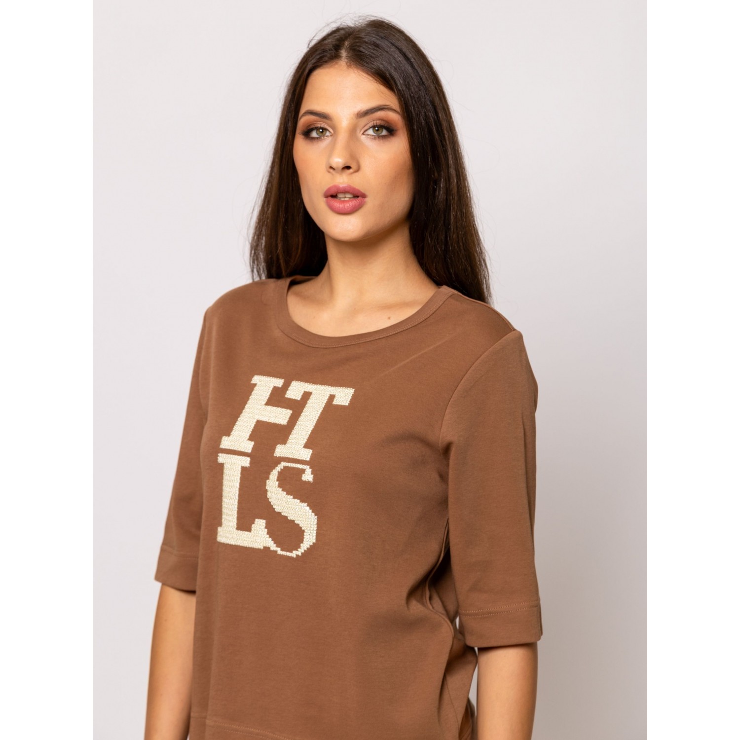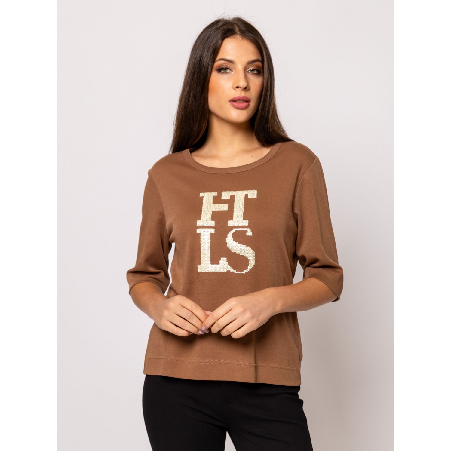 Női rövid ujjú póló, egyenes szabással, rövidebb test hosszal, kerek nyakkal, tiszta pamut anyagból, elején nagy, hímzett, flitteres márkajelzéssel, hátán kis fém márkajelzéssel. Prémium pamut fonalból készült, mely puha tapintású, kellemes, lágy fényű, tartós anyagot eredményez. Anyaga: 100% pamut, interlock jersey. A modell 175 cm magas és S-es méretet visel.