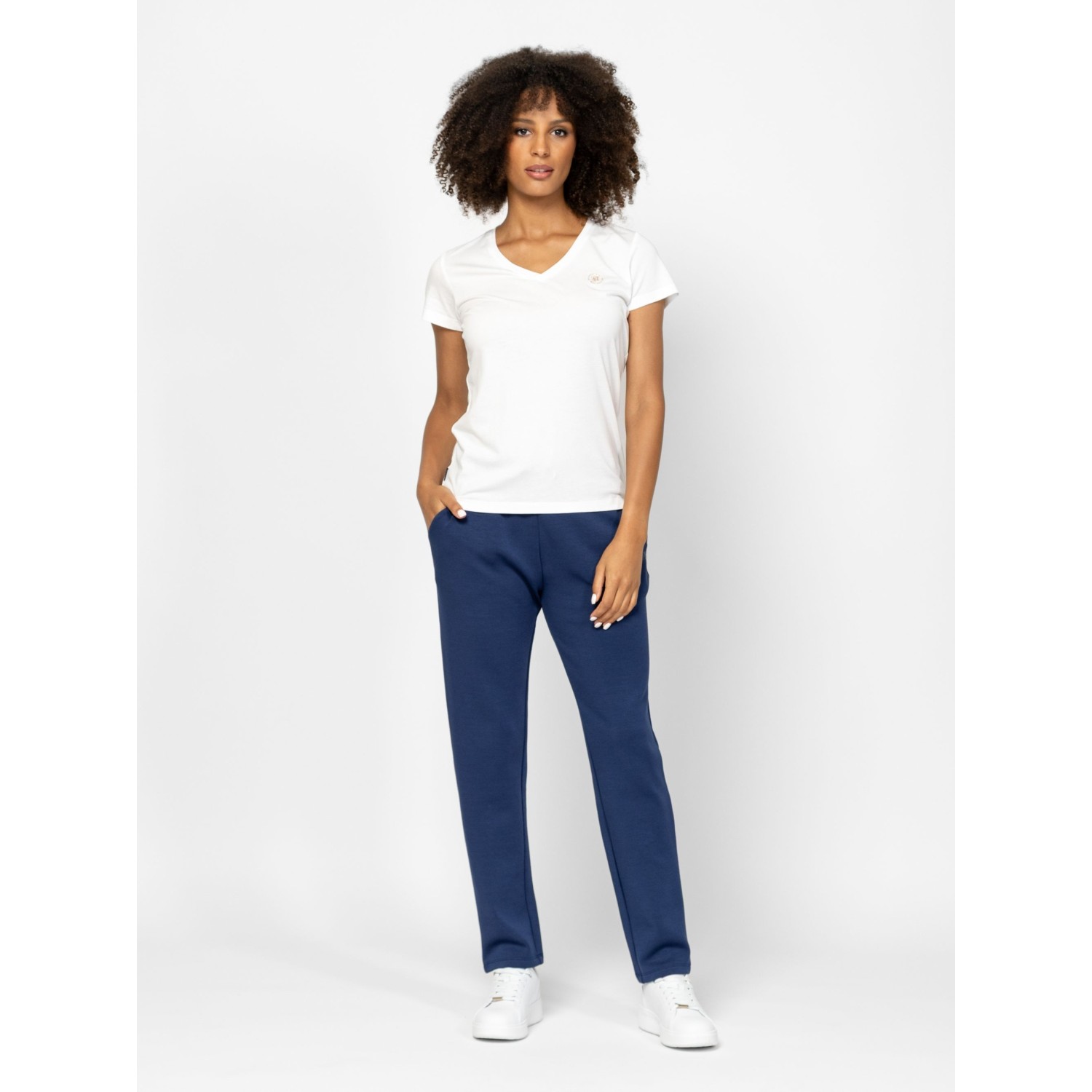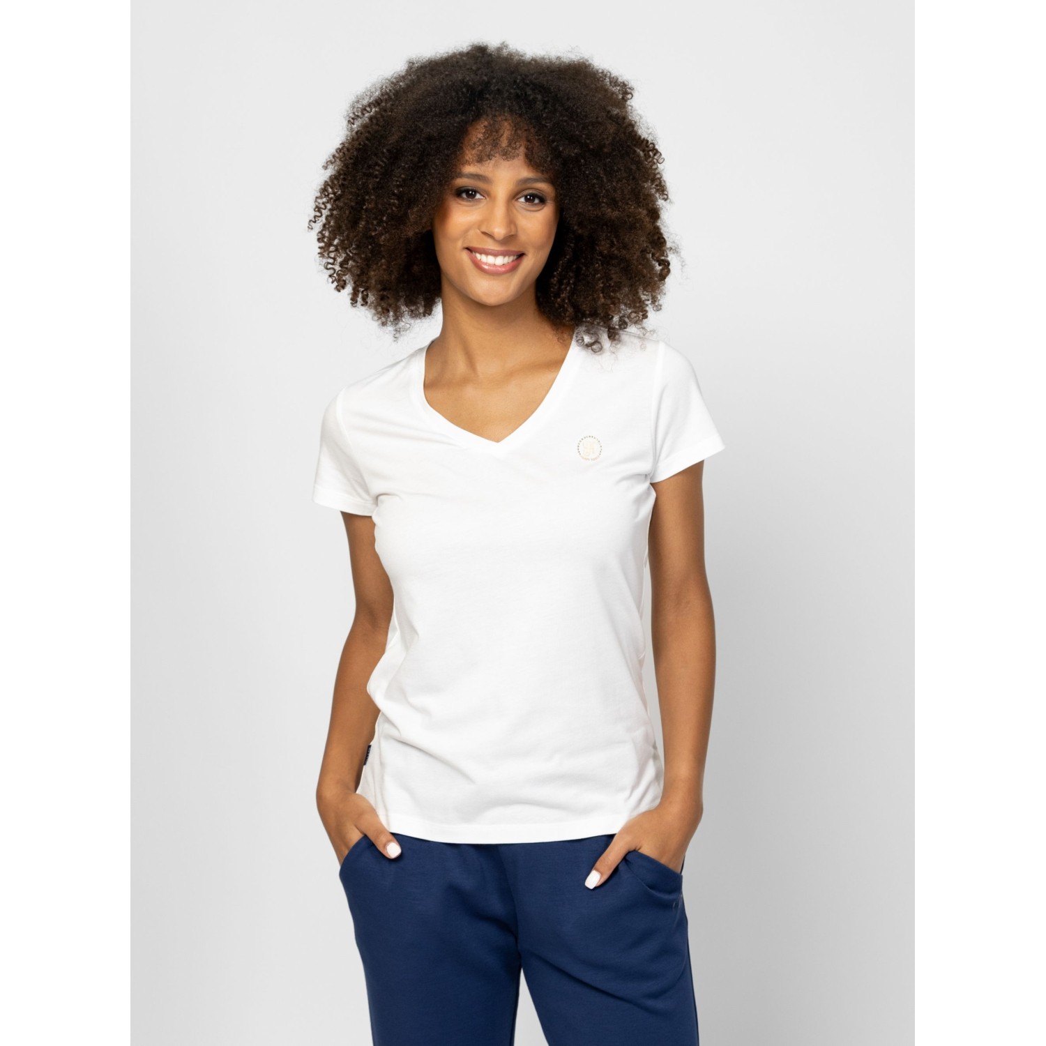 Női rövid ujjú póló, enyhén karcsúsított szabással, v-nyakkal, modállal kevert pamut anyagból, elején kis, nyomott és kövekből kirakott márkajelzéssel, oldalában szövött címkével. Anyaga: 50% pamut, 50% modal, single jersey. A modell 175 cm magas és S-es méretet visel.
