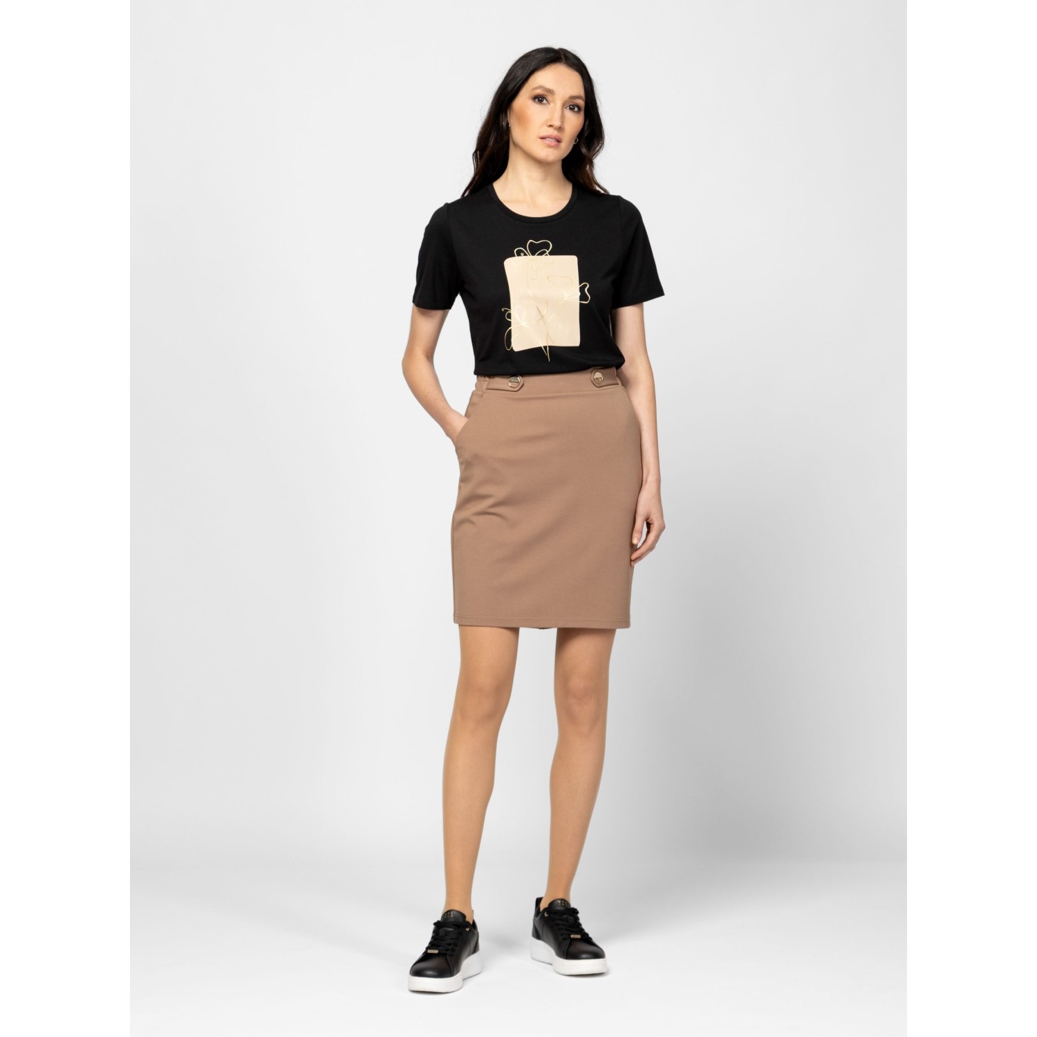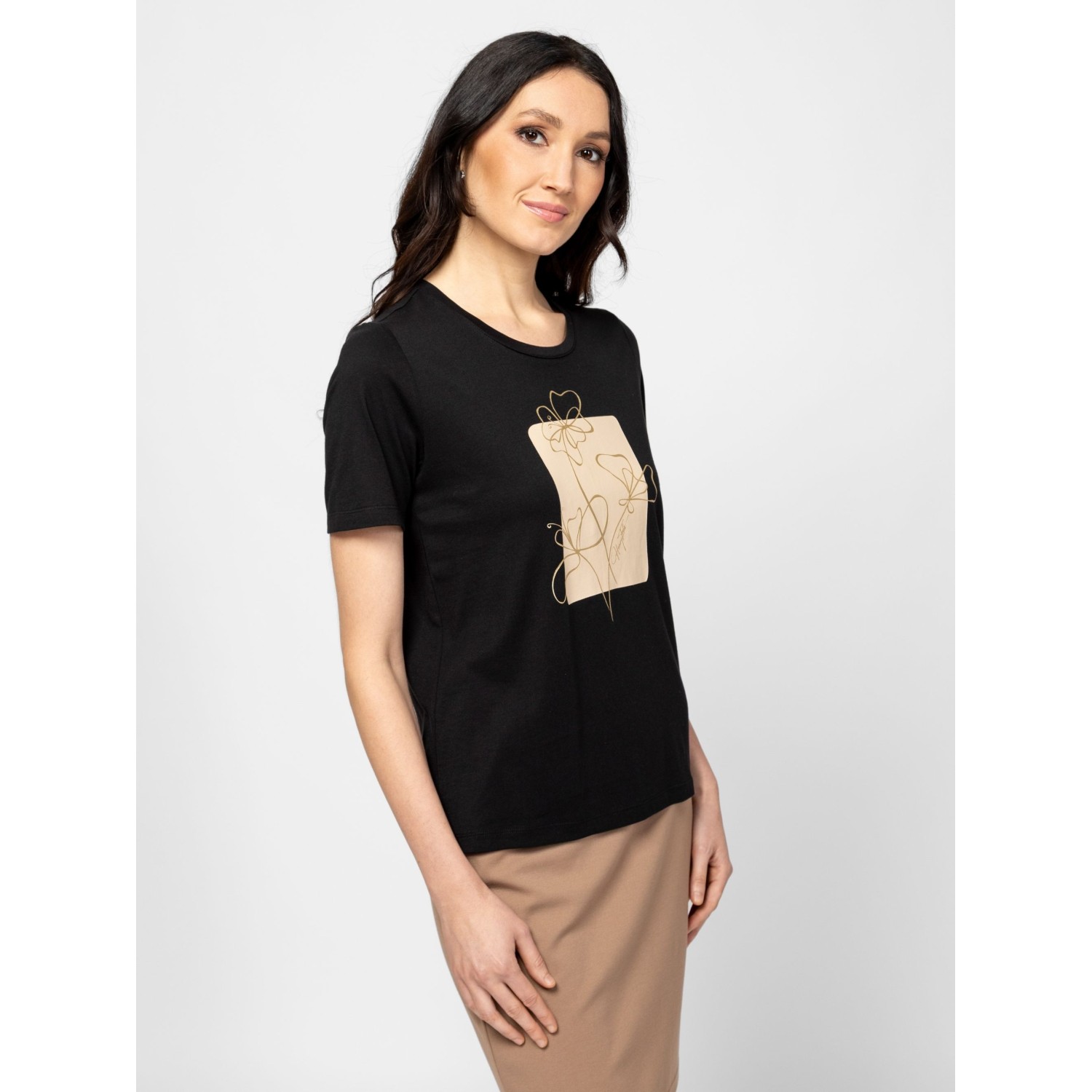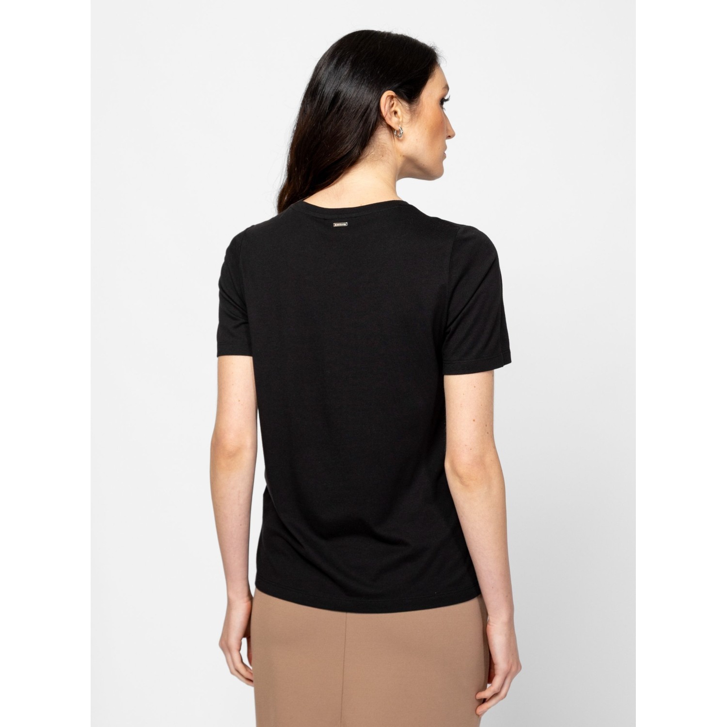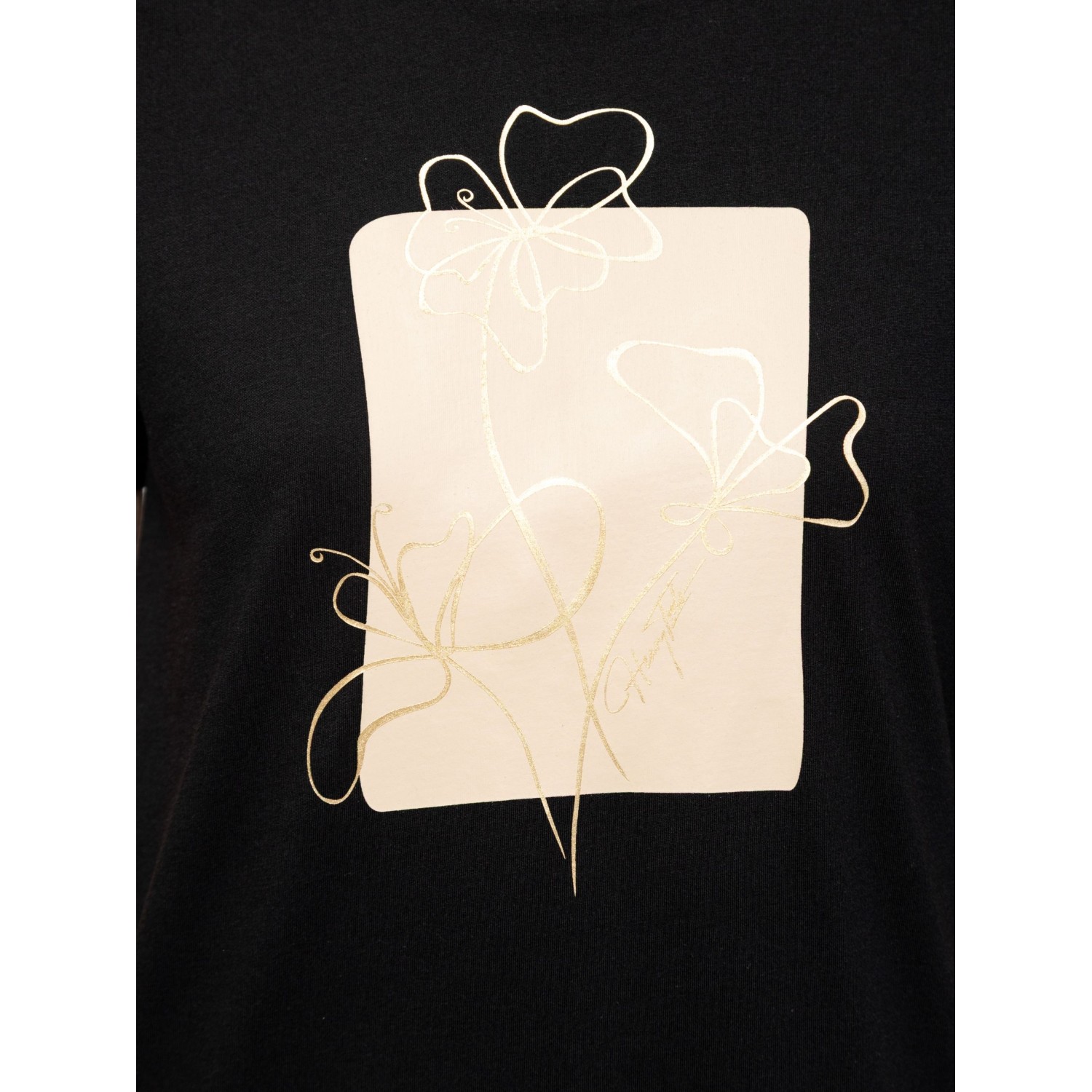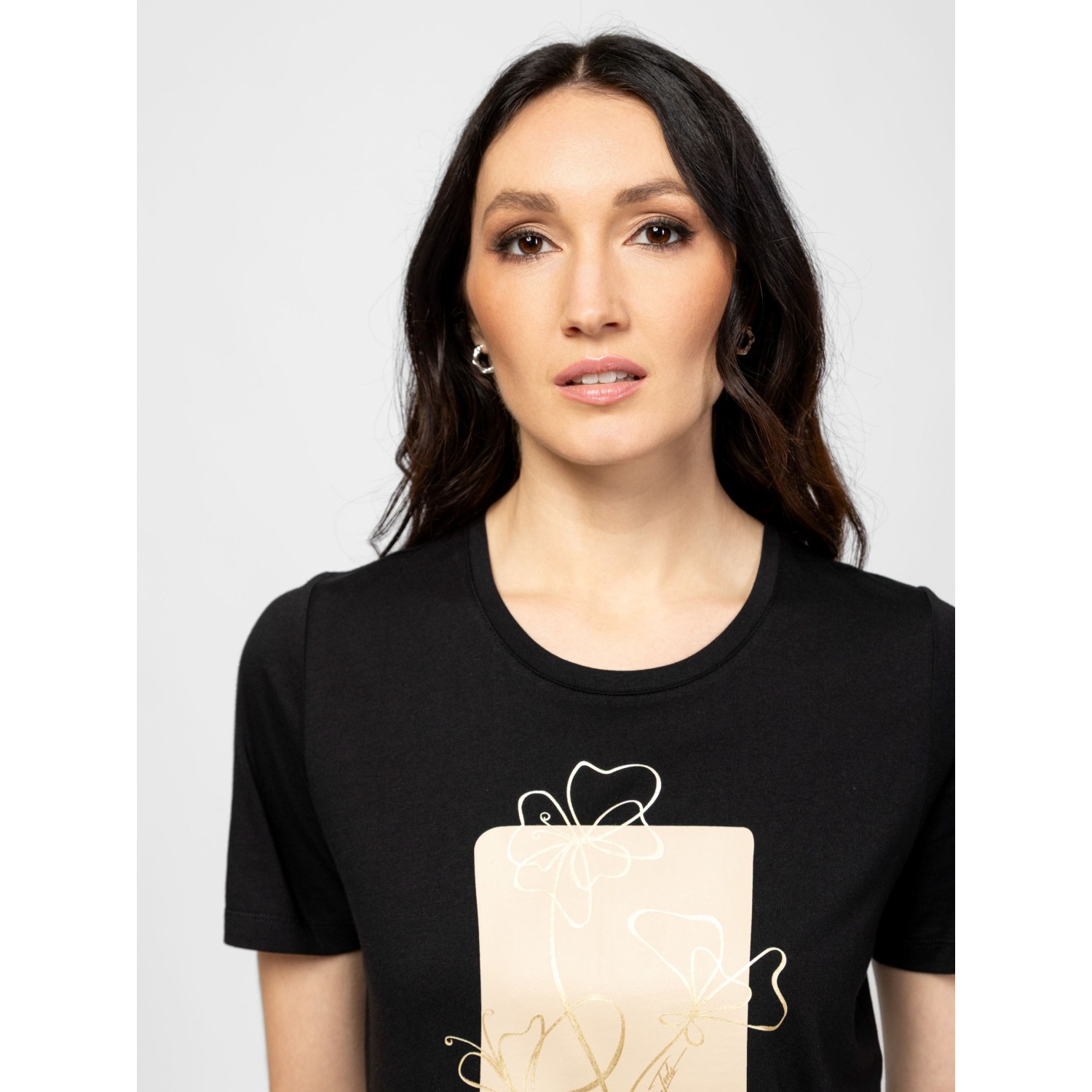 Női rövid ujjú póló egyenes szabással, kerek nyakkivágással, elején nagy nyomott dekorációval, hátán kis fém márkajelzéssel. Anyaga: 50% pamut, 50% modal, single jersey. A modell 175 cm magas és S-es méretet visel.
