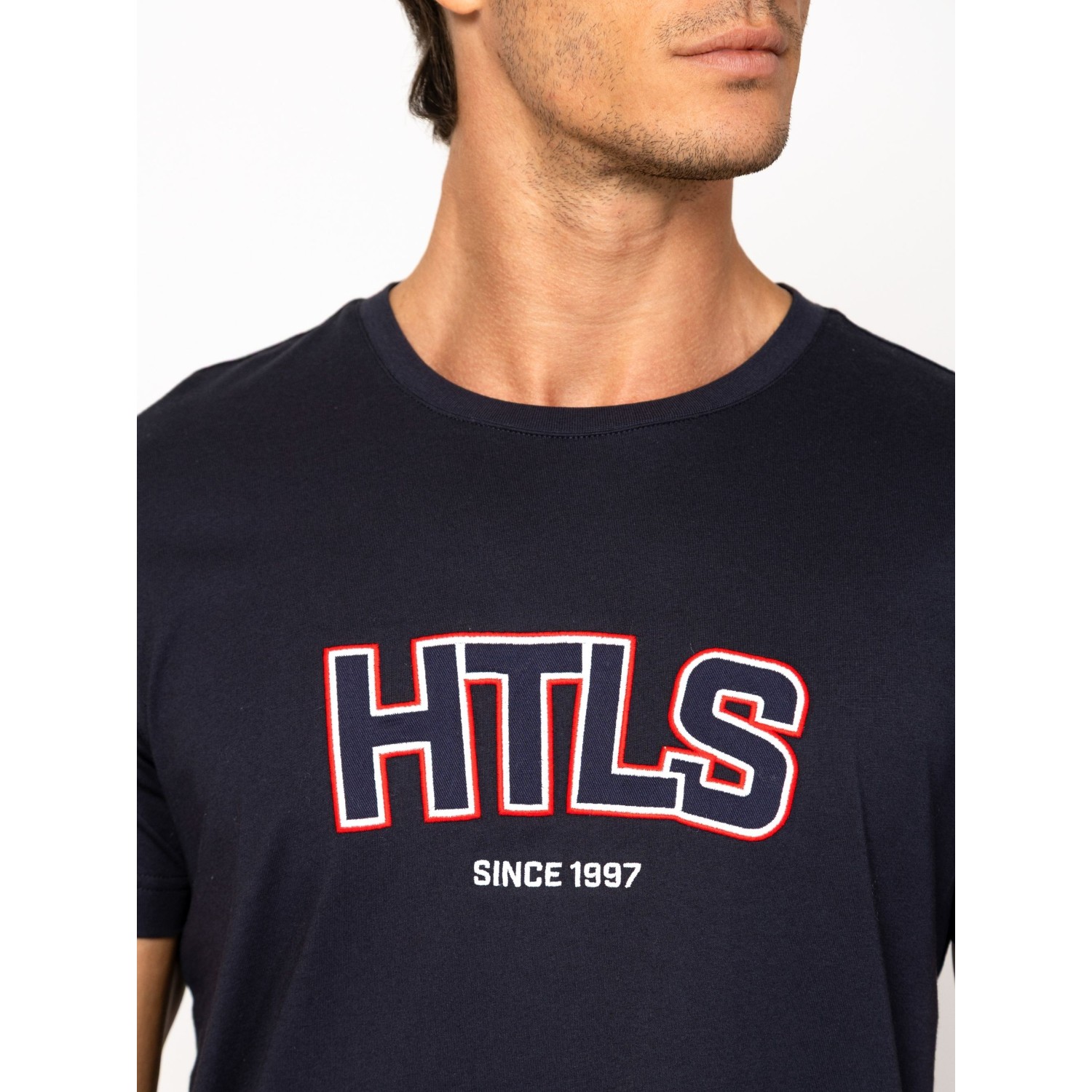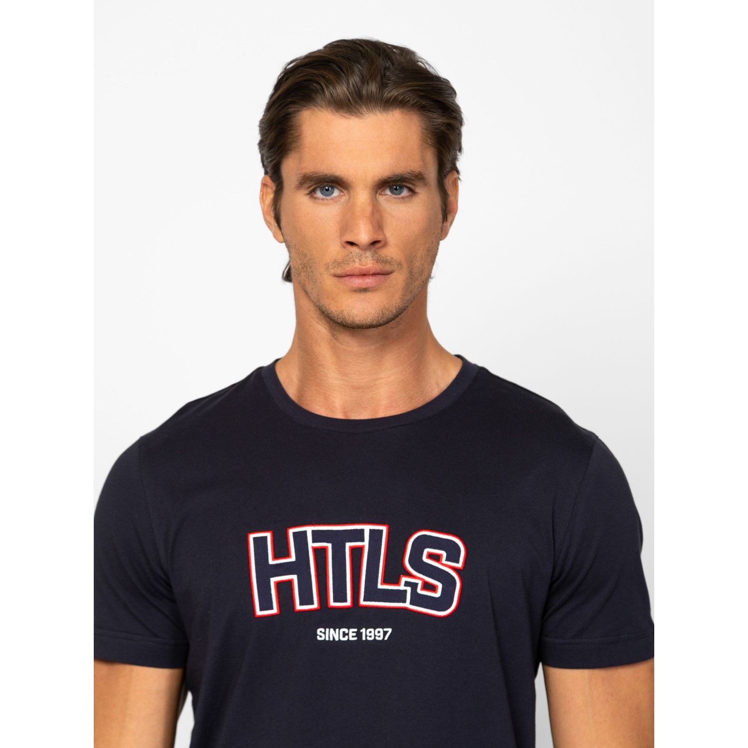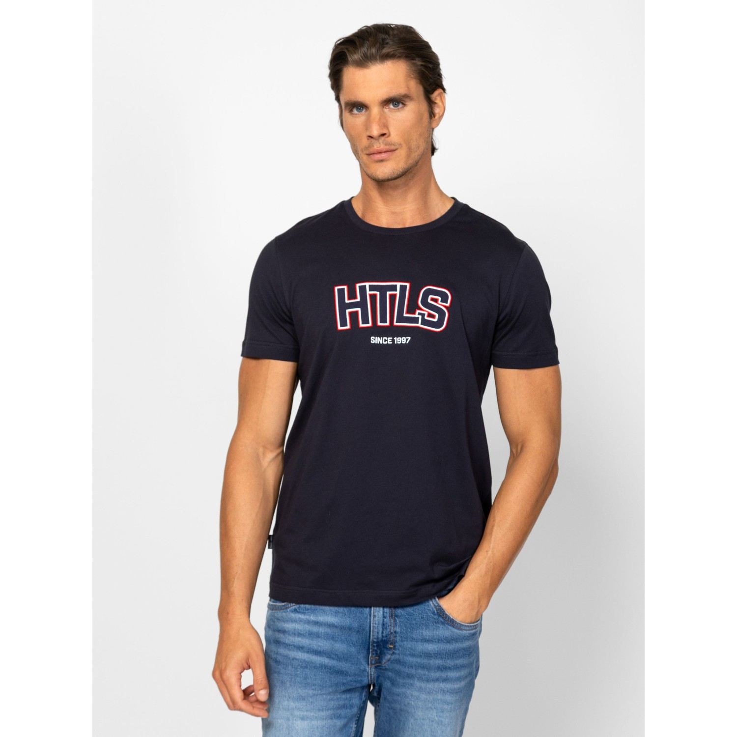 Férfi rövid ujjú póló, egyenes szabással, kerek nyakkal, elején nagy nyomott márkajelzéssel, oldalában szövött címkével. Anyaga: 100% pamut, single jersey. A modell 188 cm magas és L-es méretet visel.