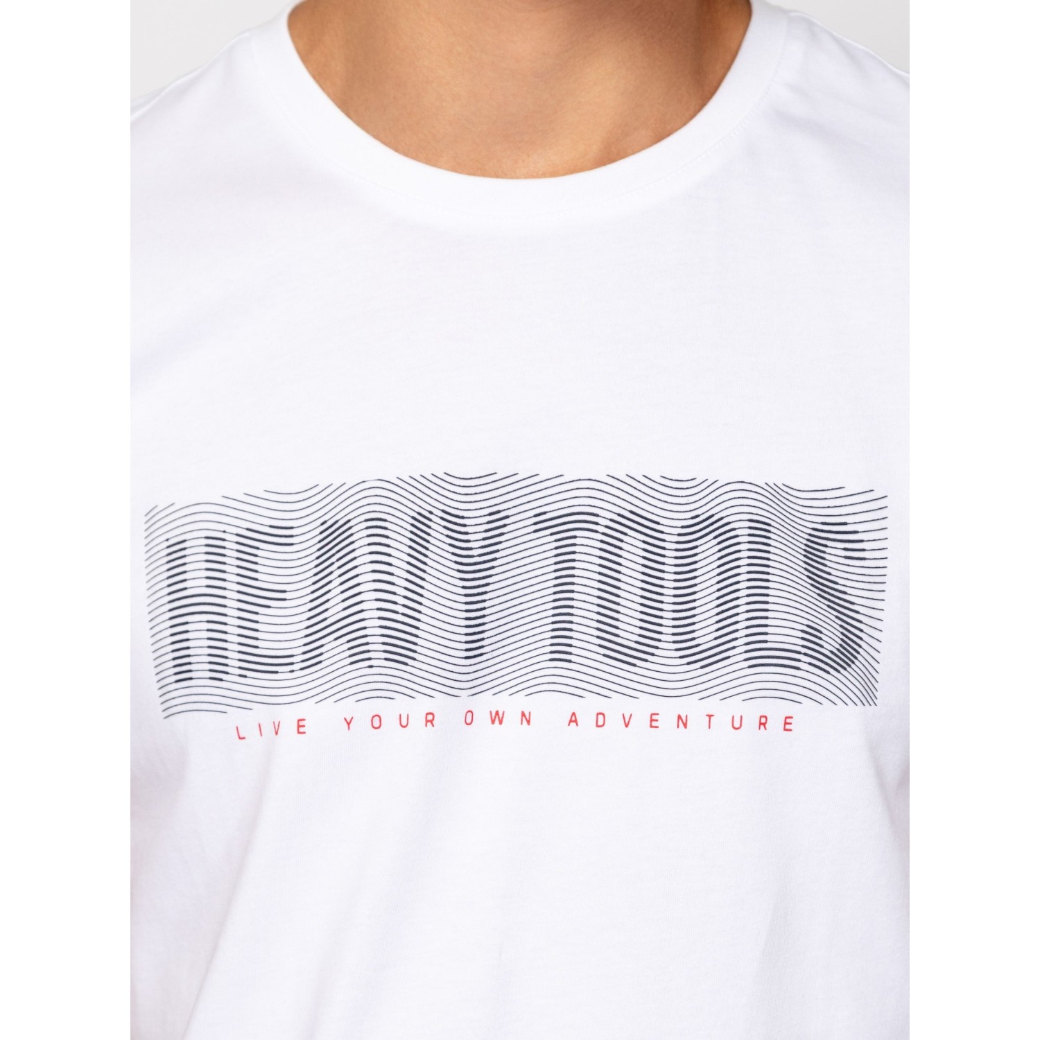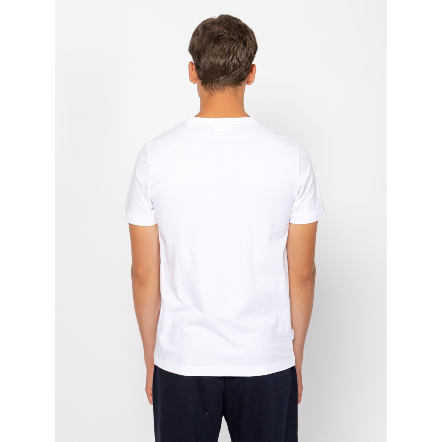 Férfi rövid ujjú póló, egyenes szabással, kerek nyakkal, elején nagy nyomott márkajelzéssel, oldalában szövött címkével. Anyaga: 100% pamut, single jersey. A modell 188 cm magas és L-es méretet visel.