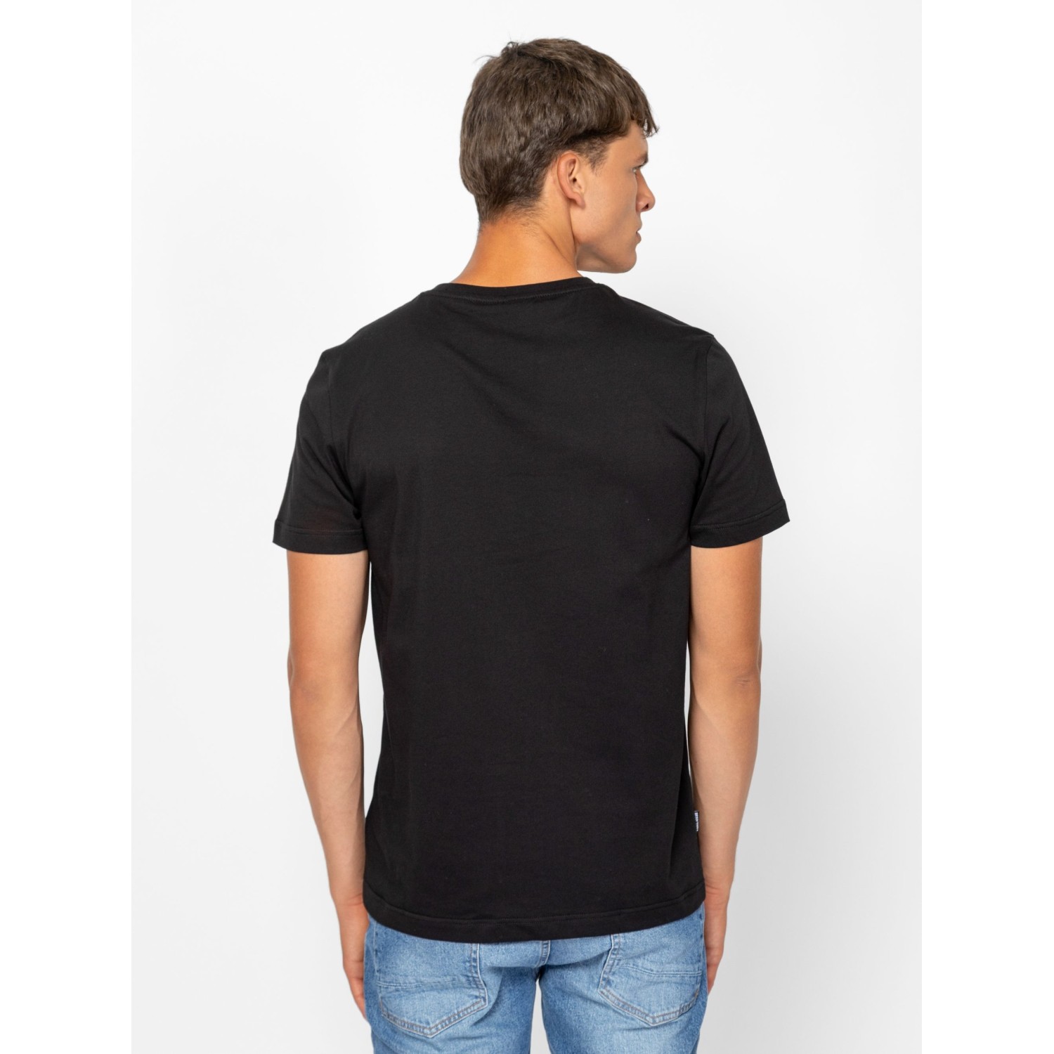 Férfi rövid ujjú póló, egyenes szabással, kerek nyakkal, elején nyomott márkajelzéssel, oldalában szövött címkével. Anyaga: 100% pamut, single jersey. A modell 188 cm magas és L-es méretet visel.
