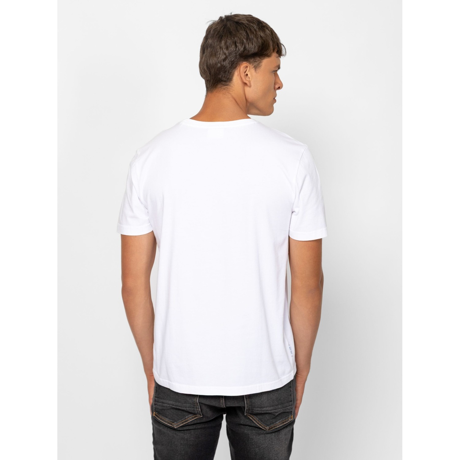 Férfi rövid ujjú póló, egyenes szabással, kerek nyakkal, elején nagy nyomott dekorációval és márkajelzéssel, oldalában szövött címkével. Anyaga: 100% pamut, single jersey. A modell 188 cm magas és L-es méretet visel.